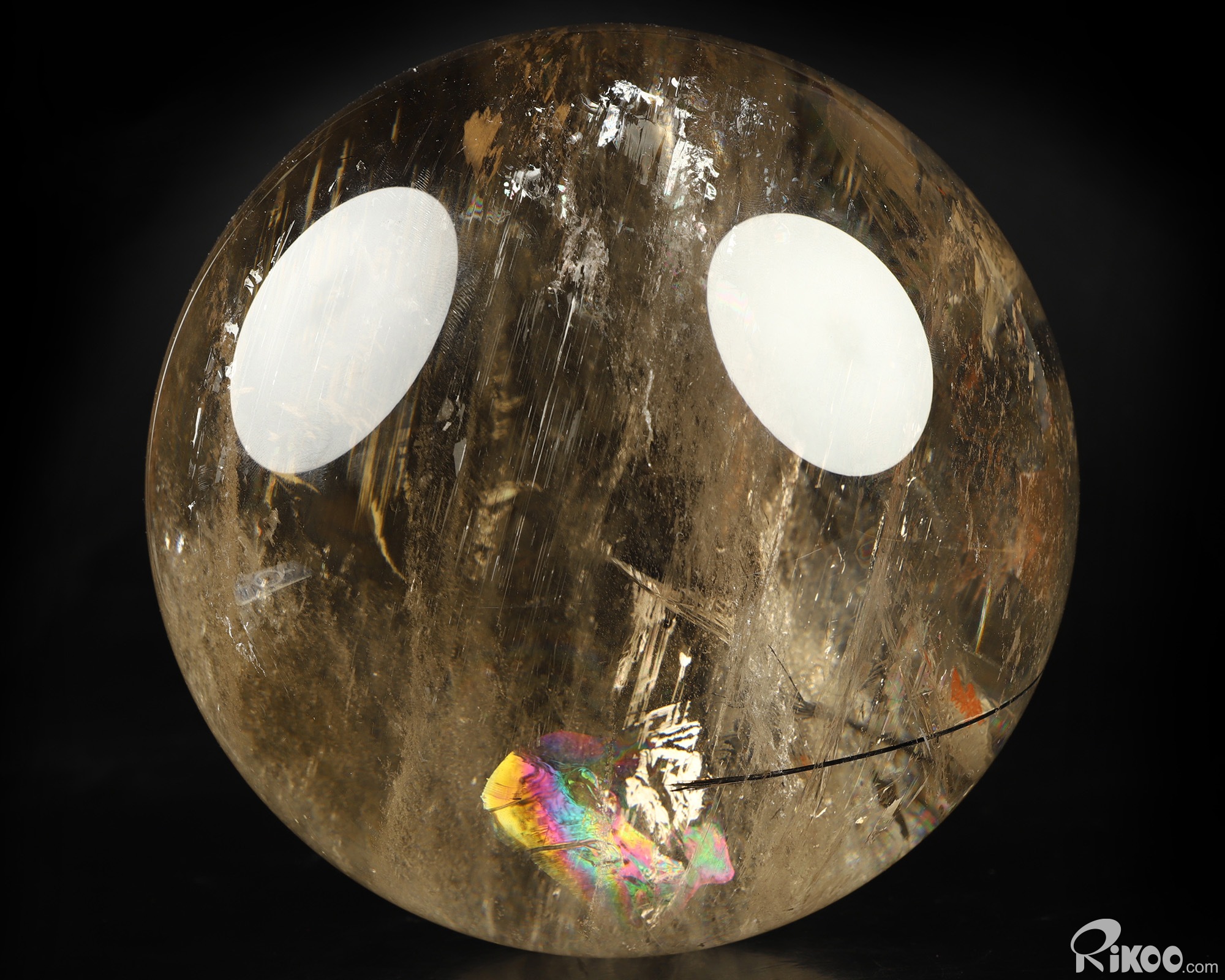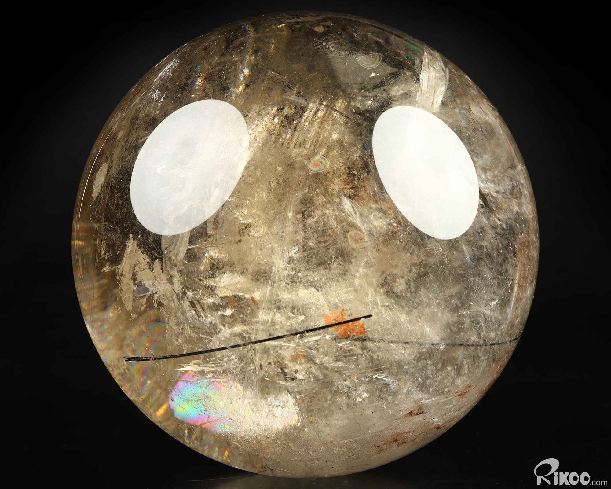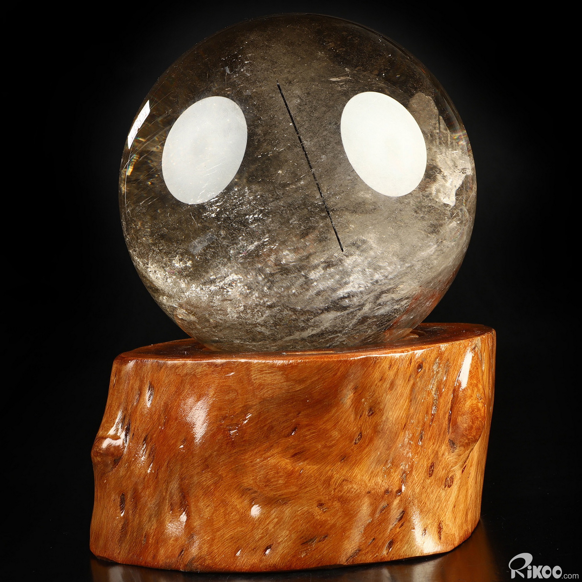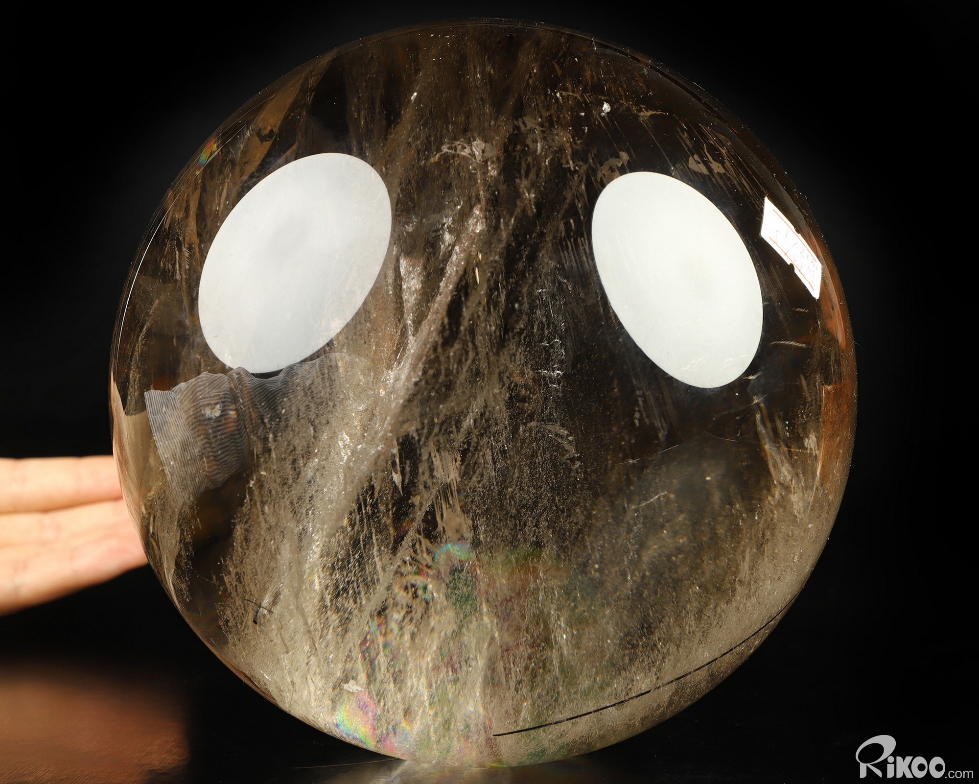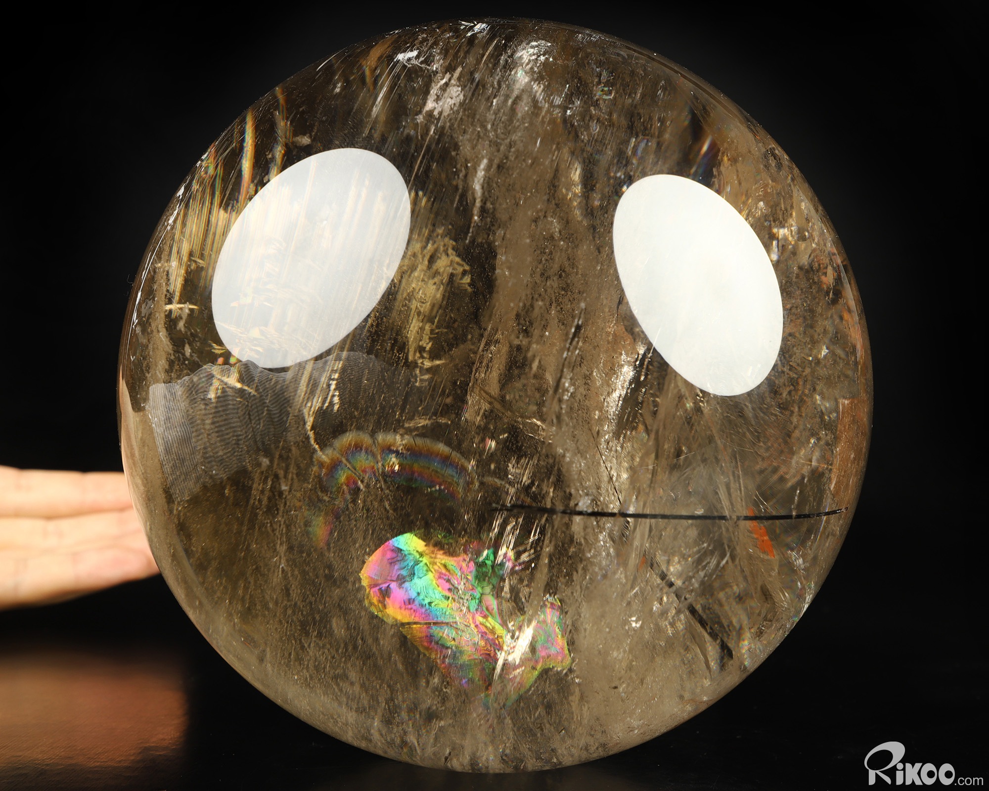 You are looking at a Smoky Quartz Rock Crystal sphere. The sphere is 6.8 inches long from front to back.
