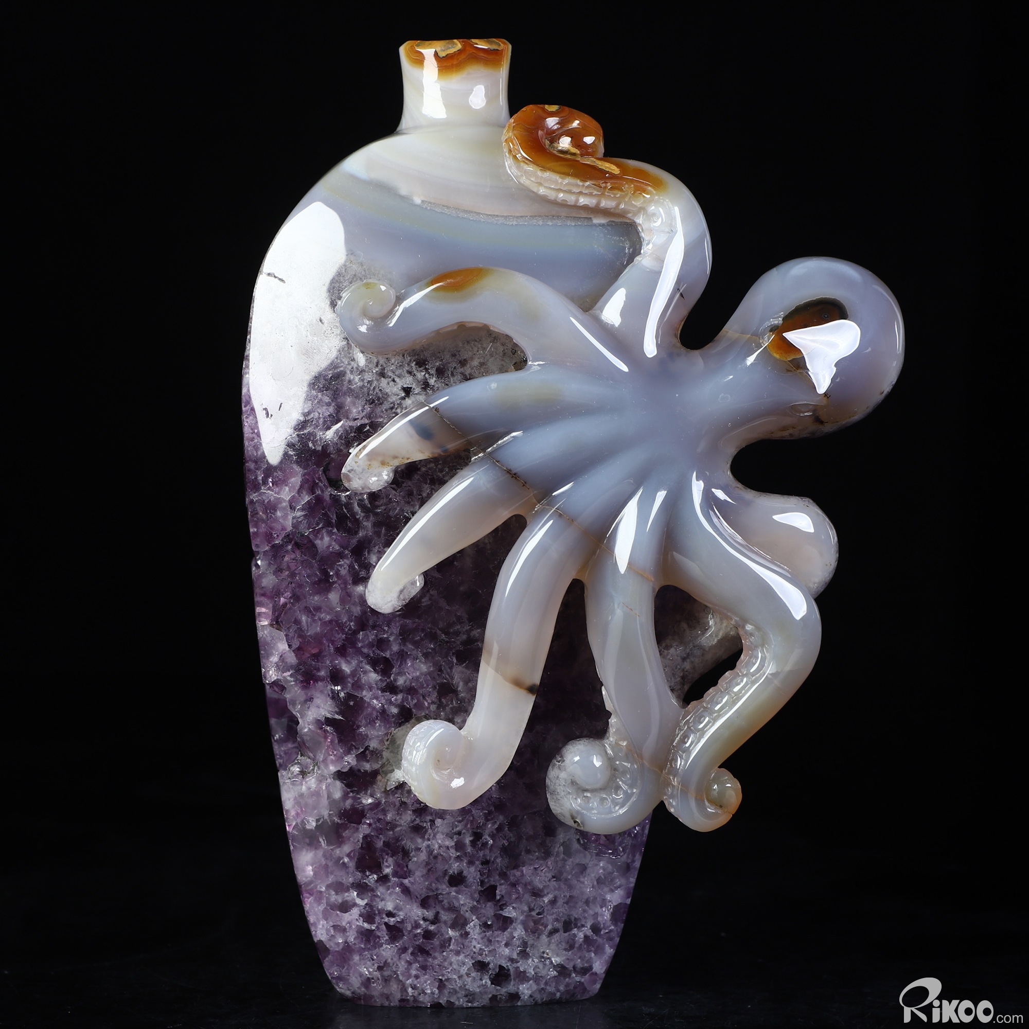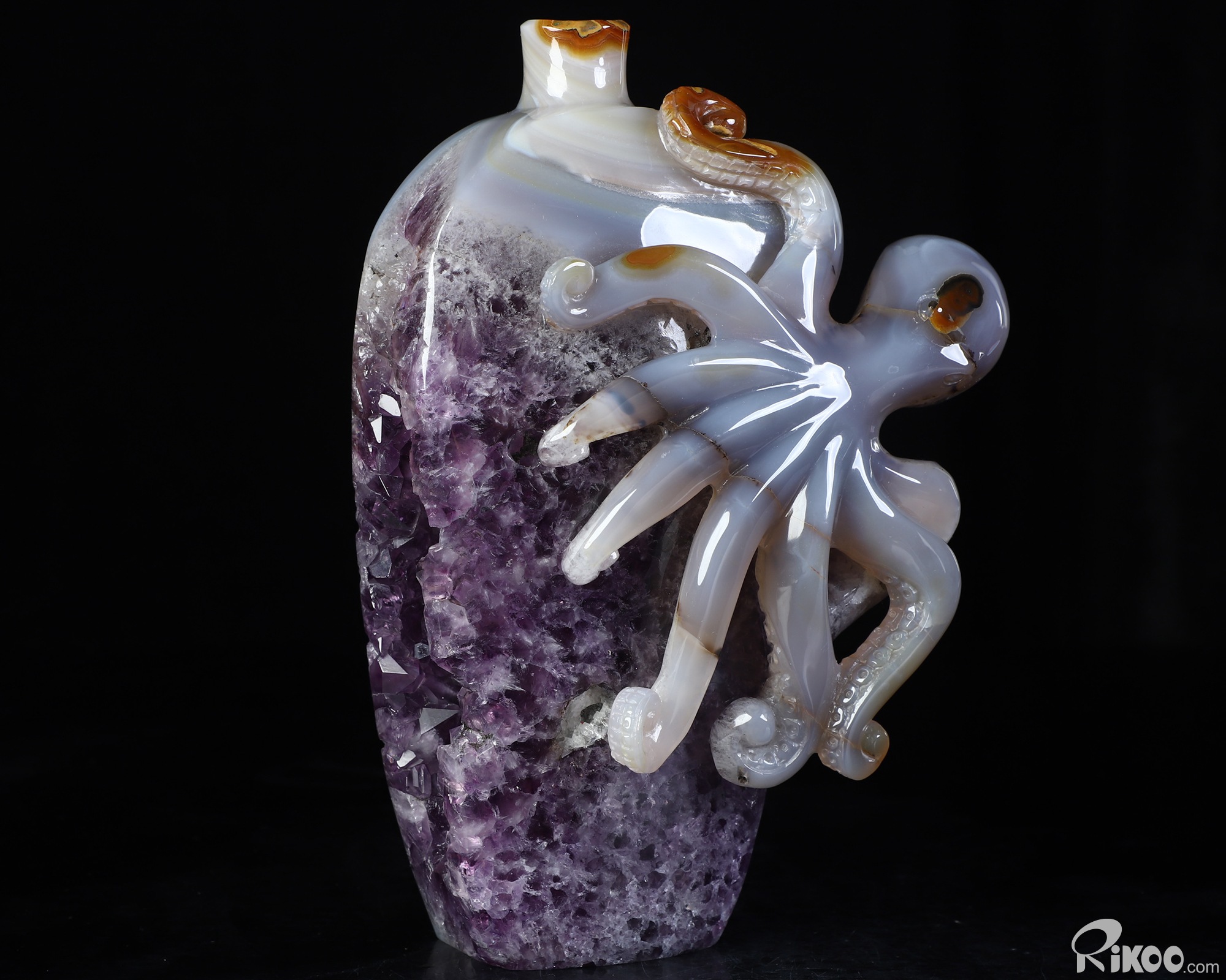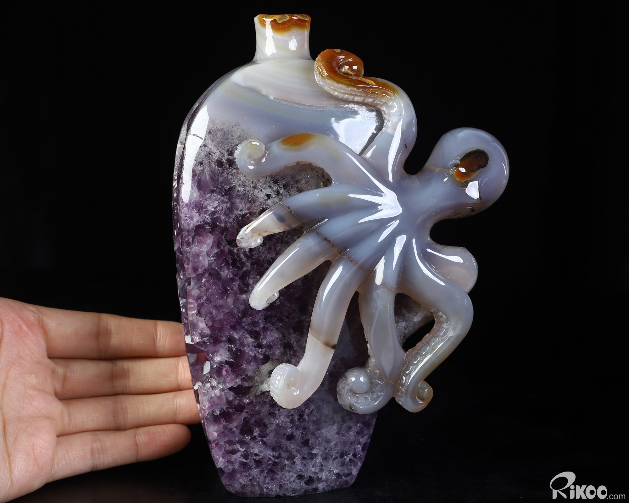 6.9" Agate Geode Hand Carved Crystal Octopus Vase Sculpture, Crystal Healing