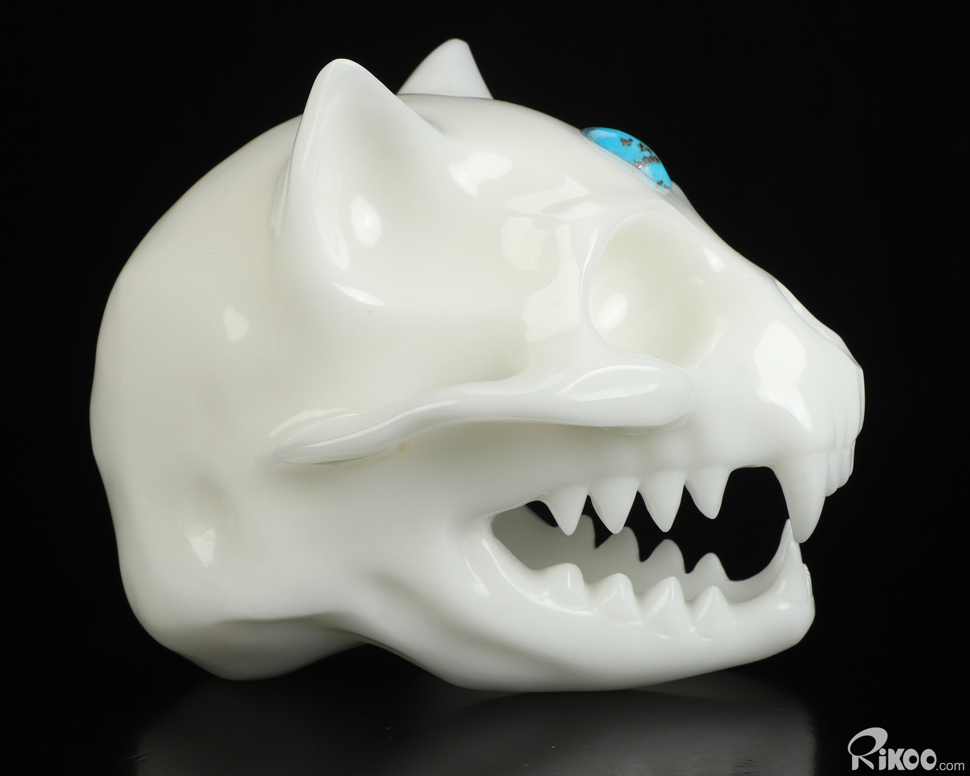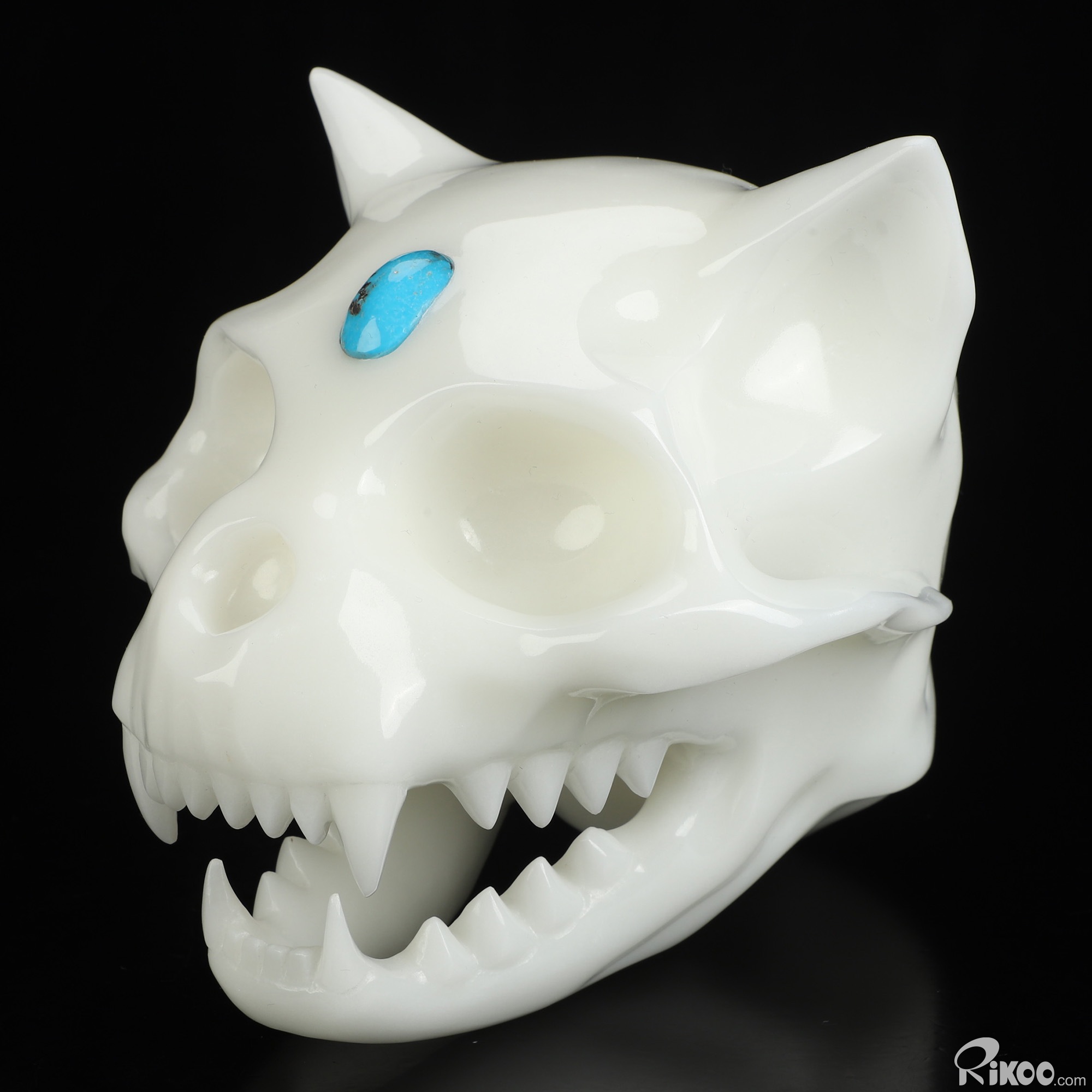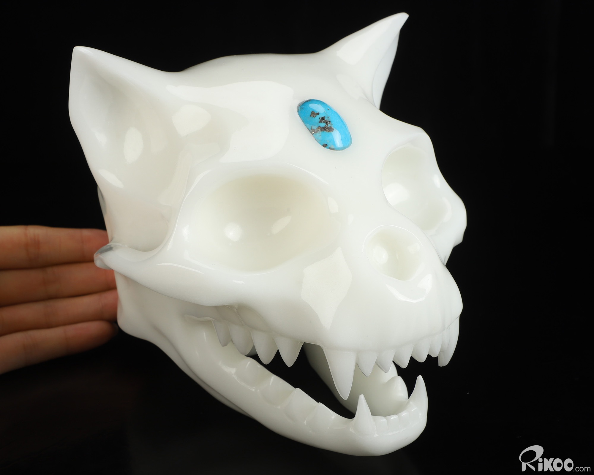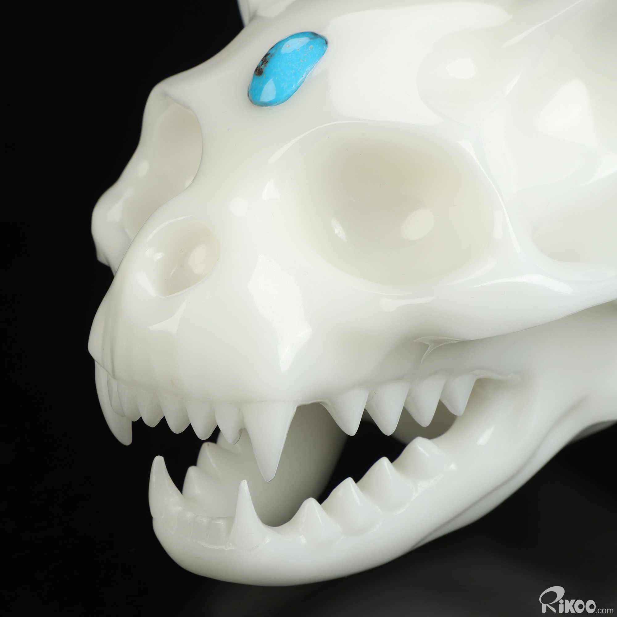 6.9" White Jade Hand Carved Crystal Wolf with Turquoise Heaven Eye Sculpture, Crystal Healing
