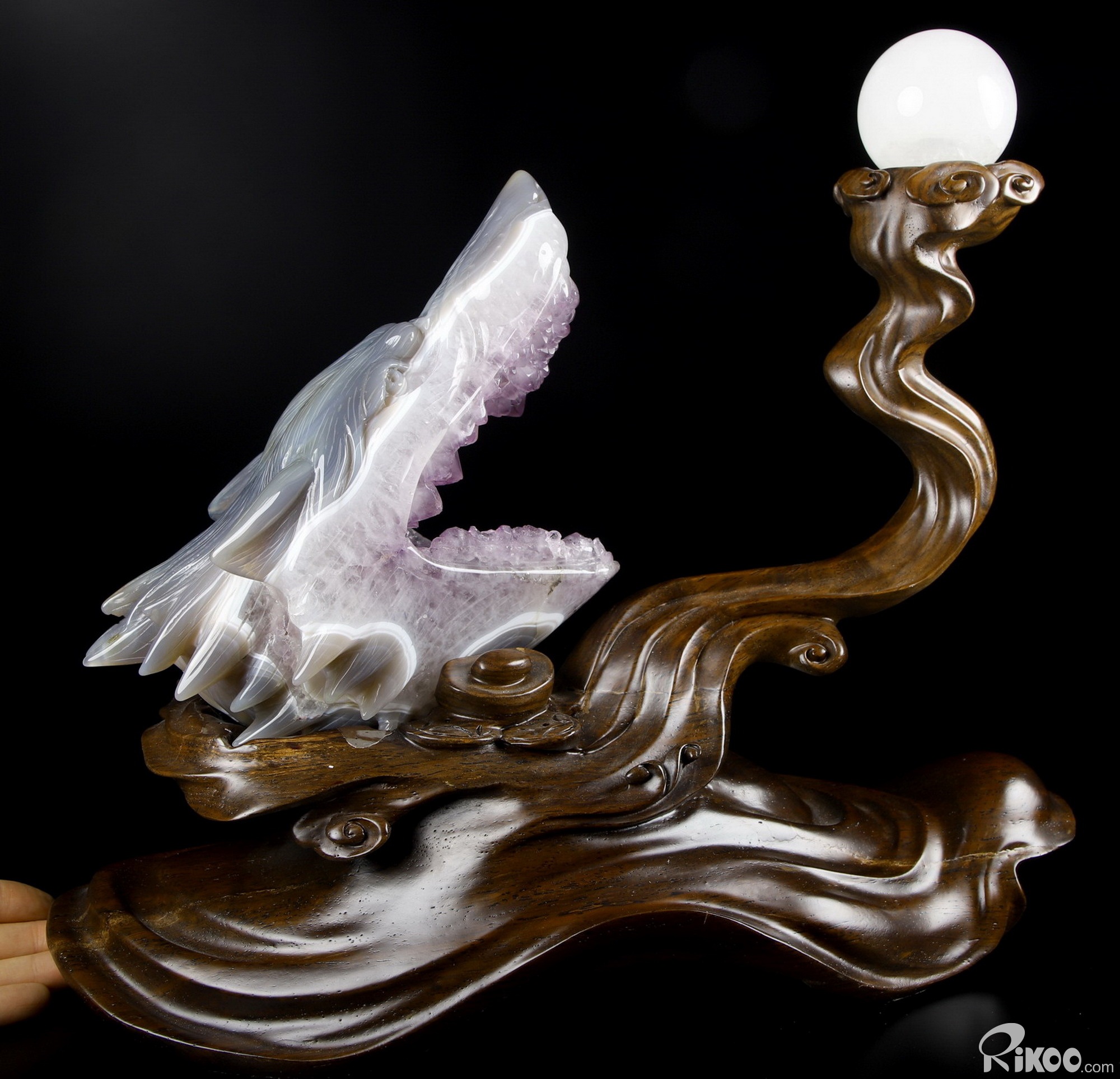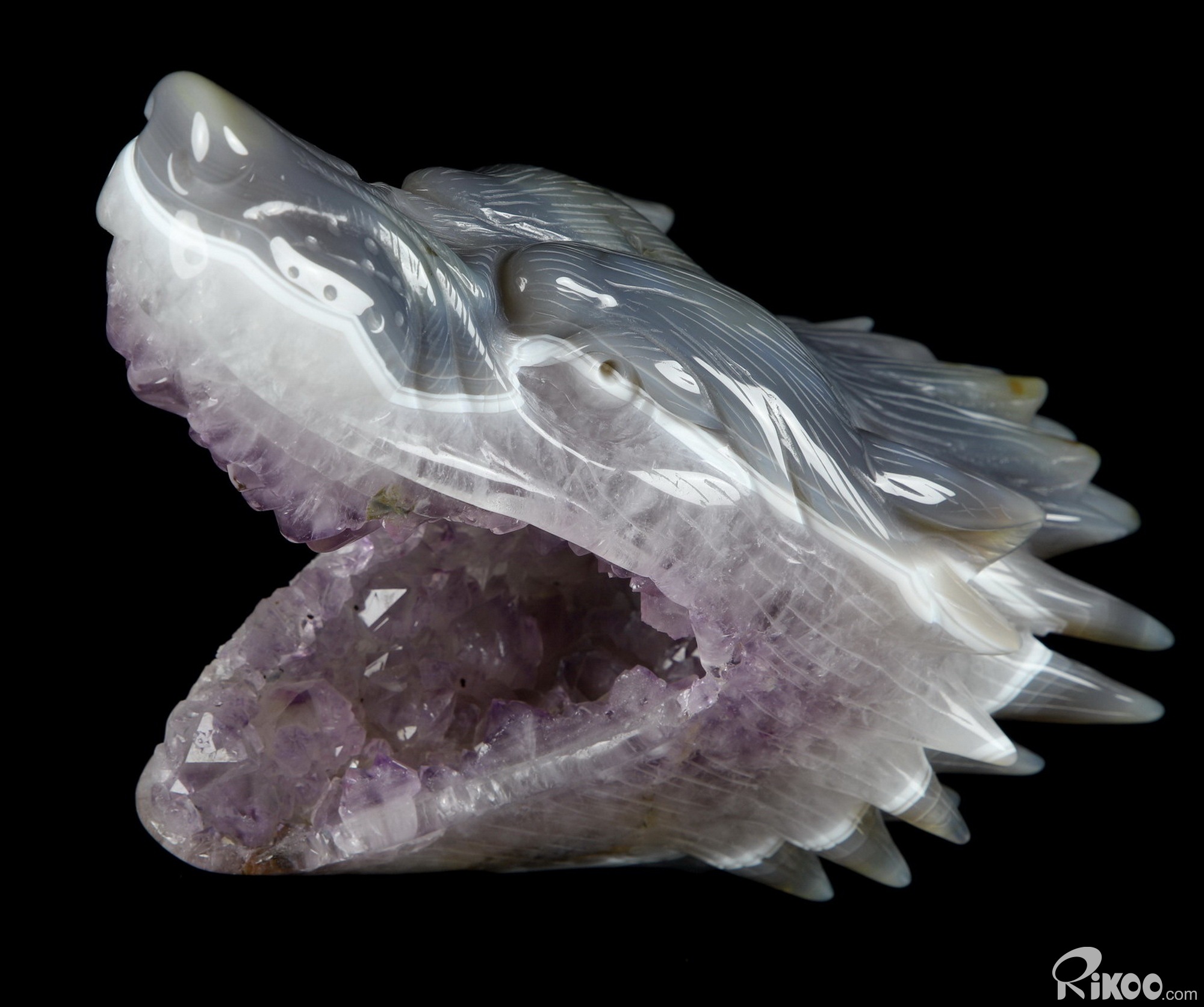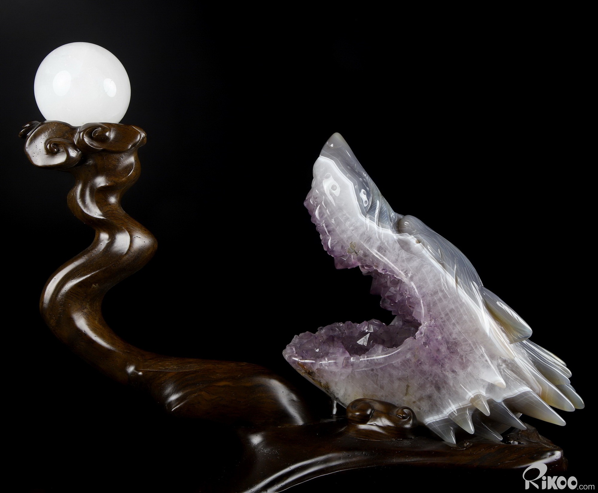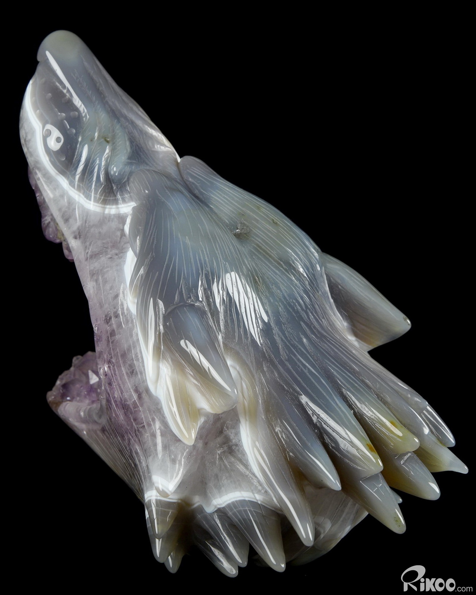 7.0" Amethyst & Agate Hand Carved Crystal Wolf and Moon Sculpture with Stand, Crystal Healing