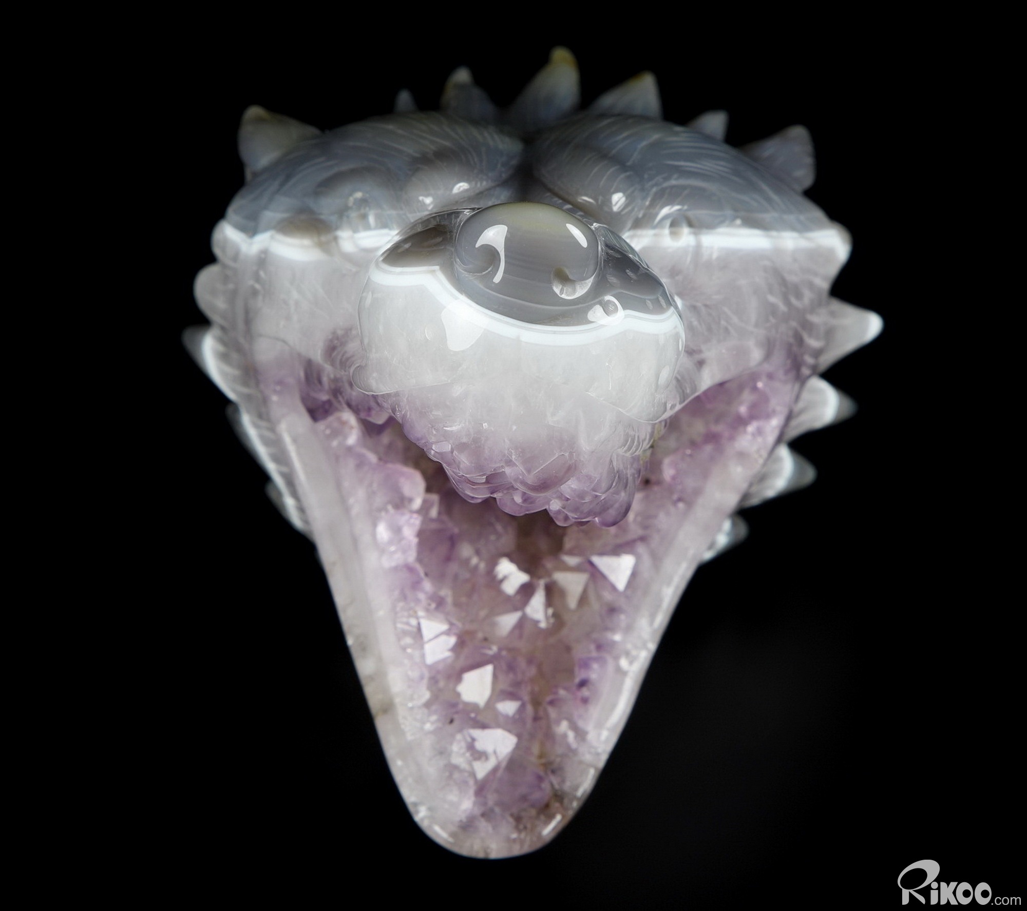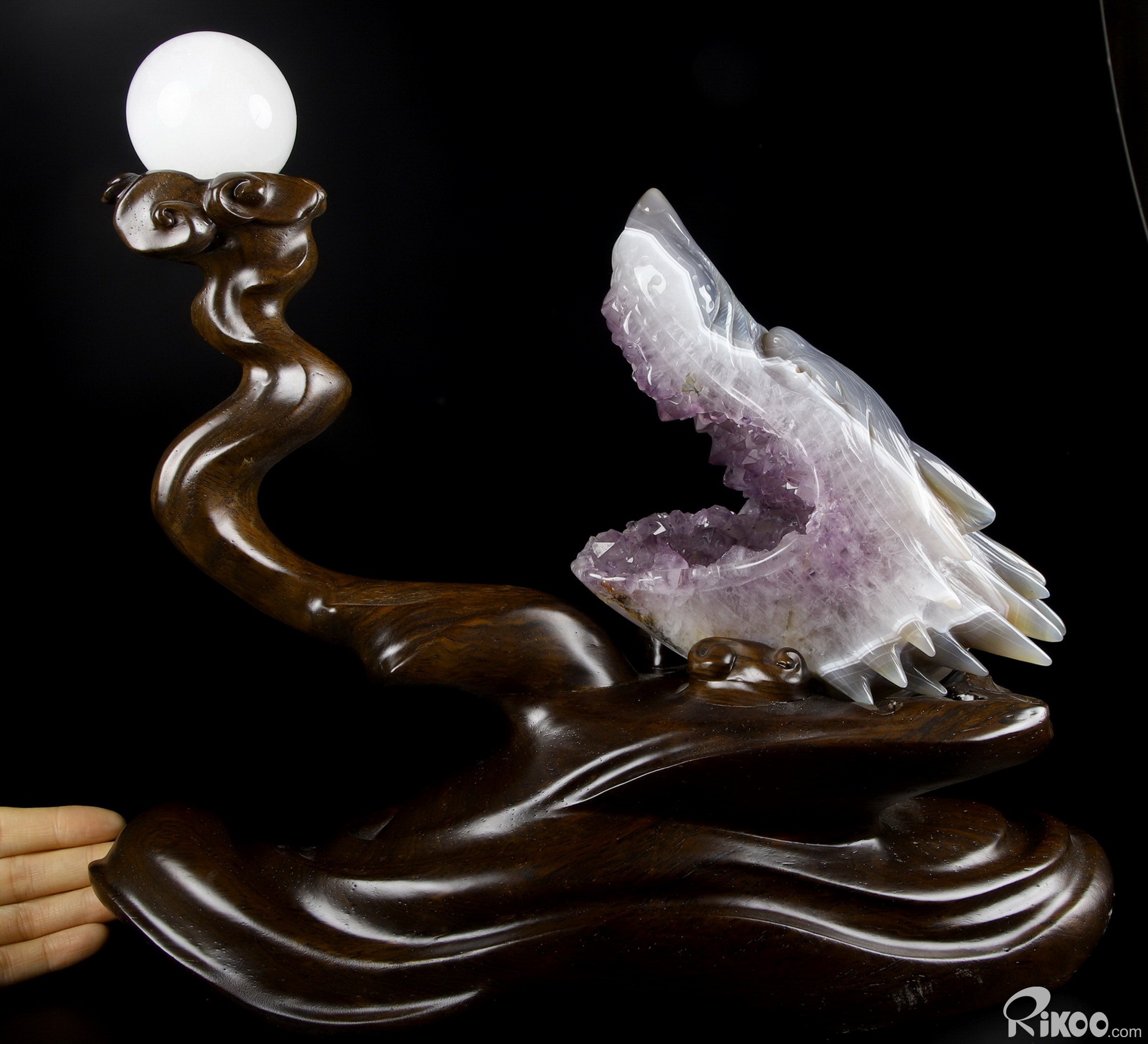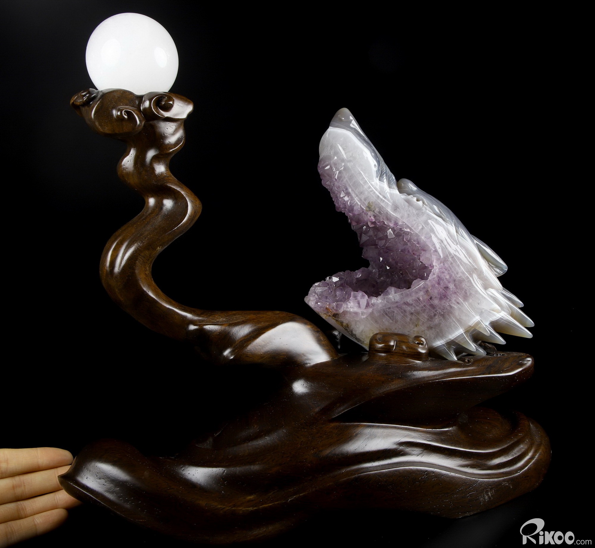 7.0" Amethyst & Agate Hand Carved Crystal Wolf and Moon Sculpture with Stand, Crystal Healing