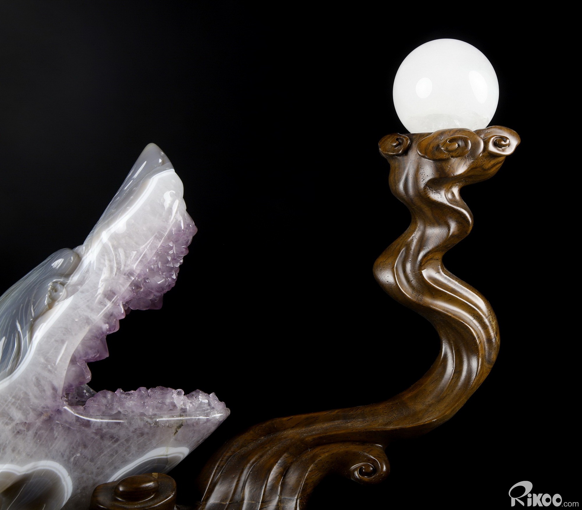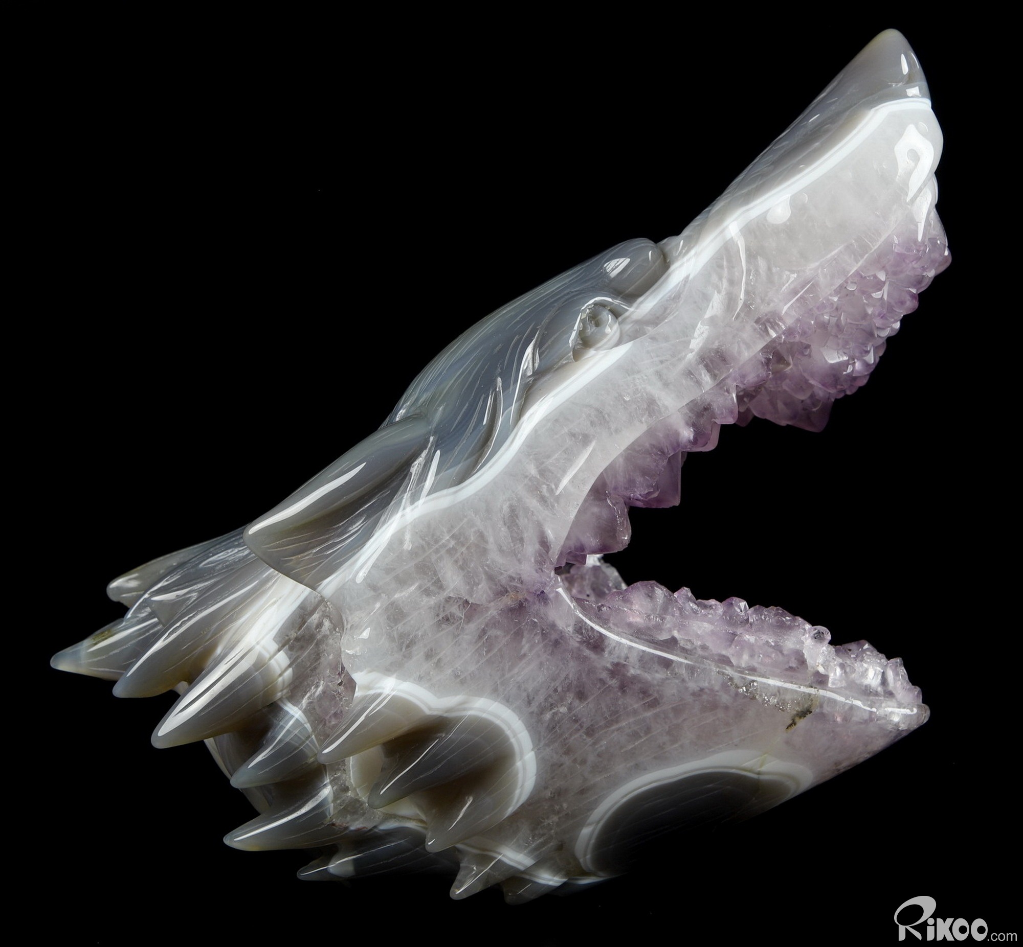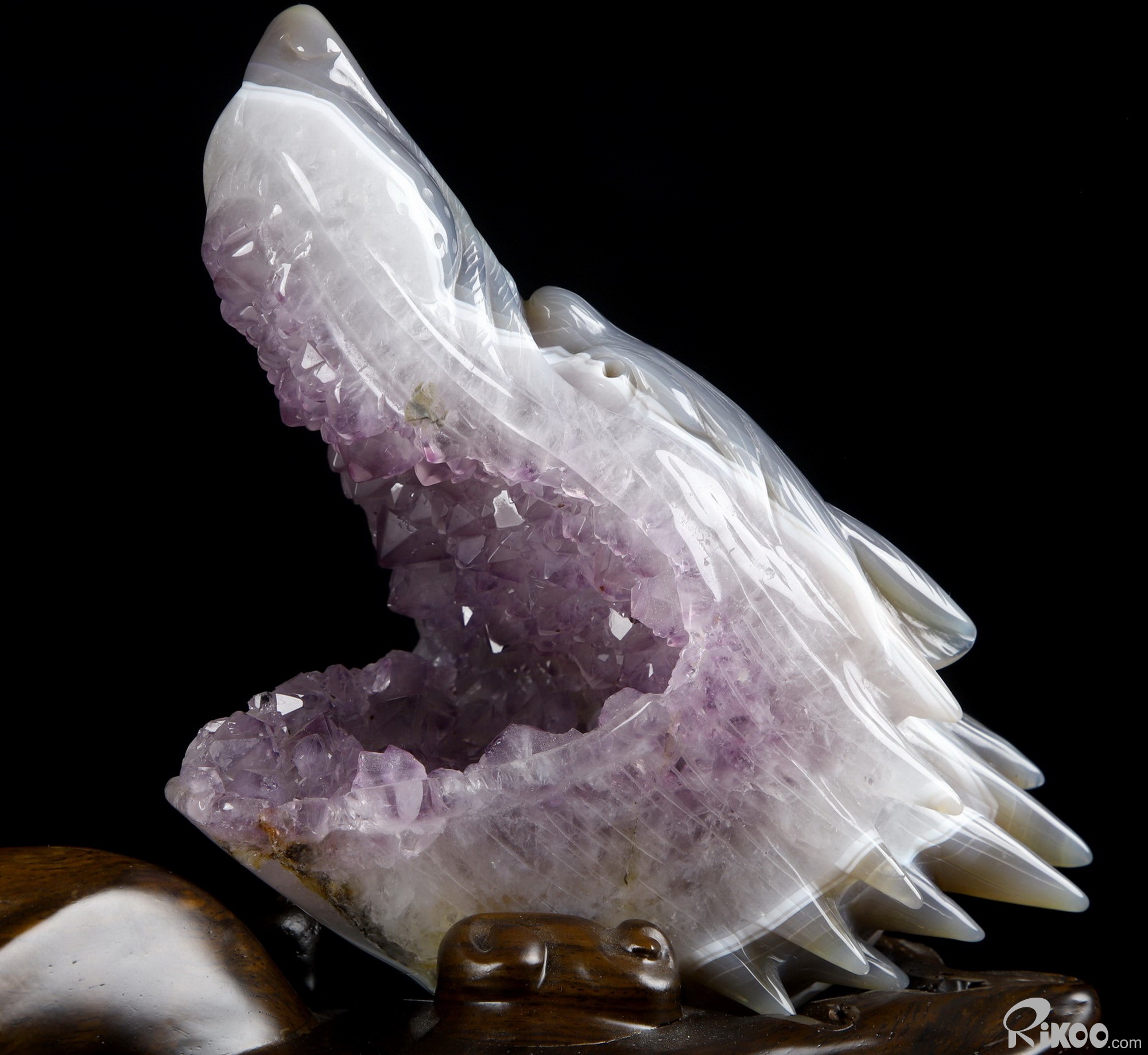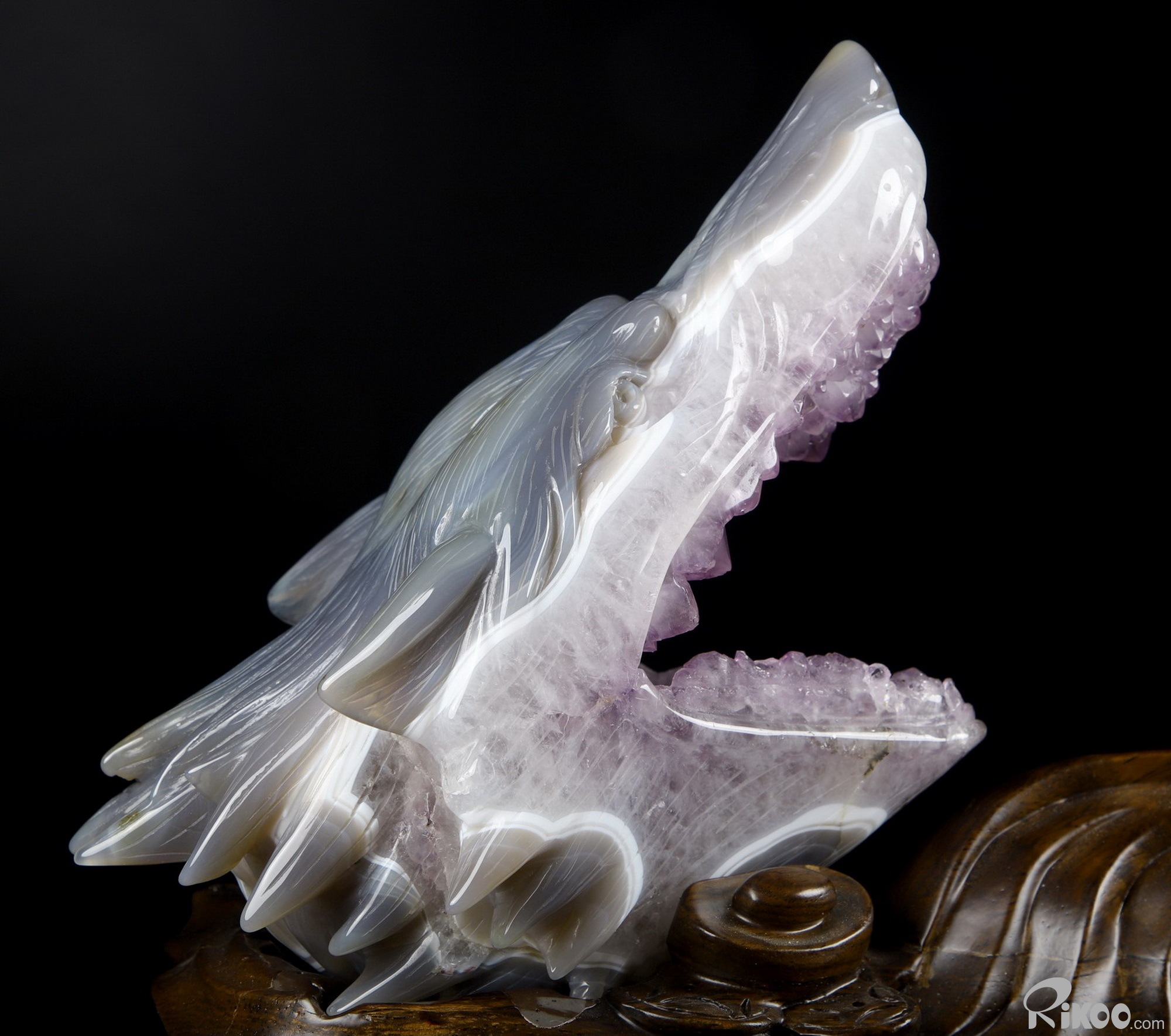 7.0" Amethyst & Agate Hand Carved Crystal Wolf and Moon Sculpture with Stand, Crystal Healing