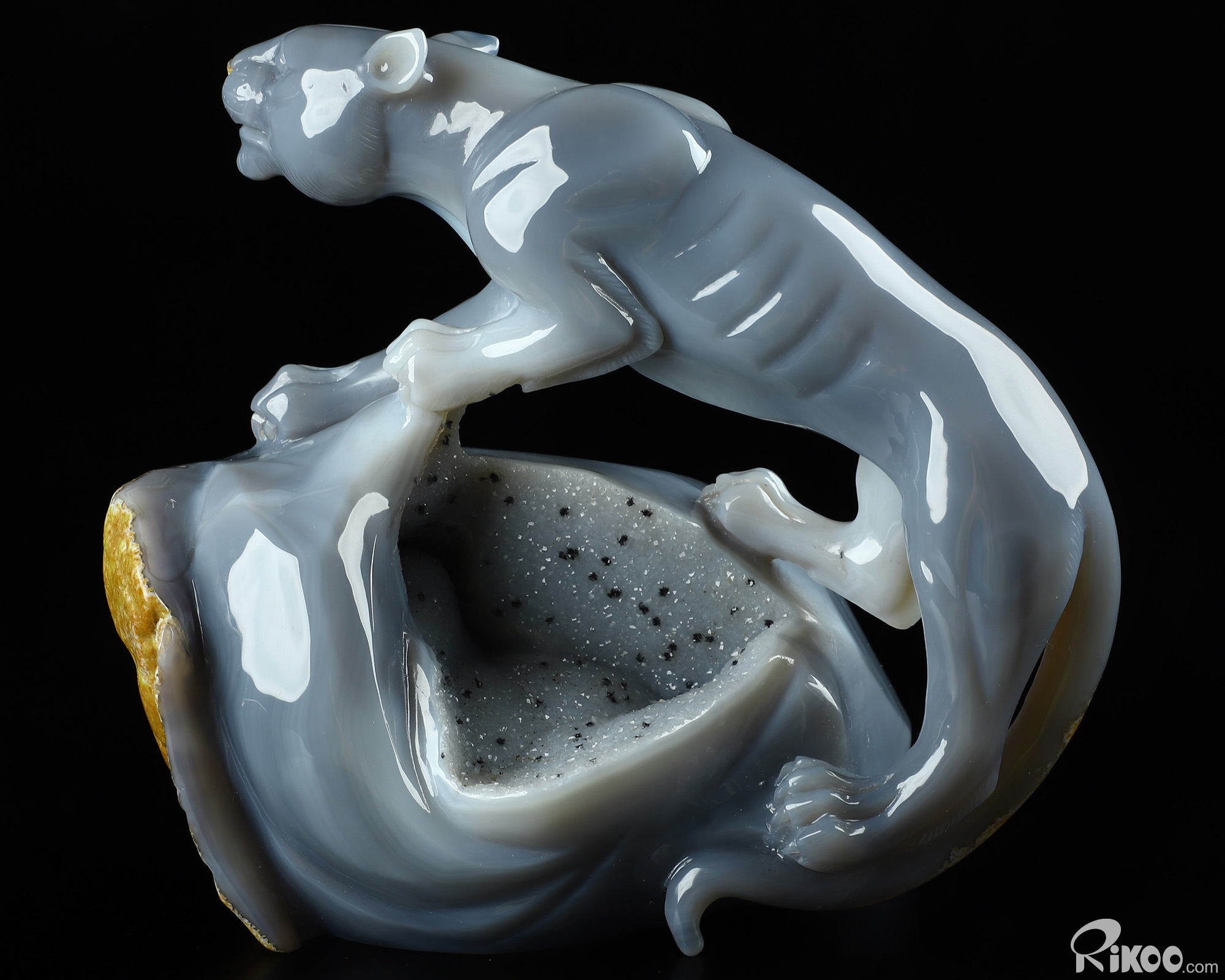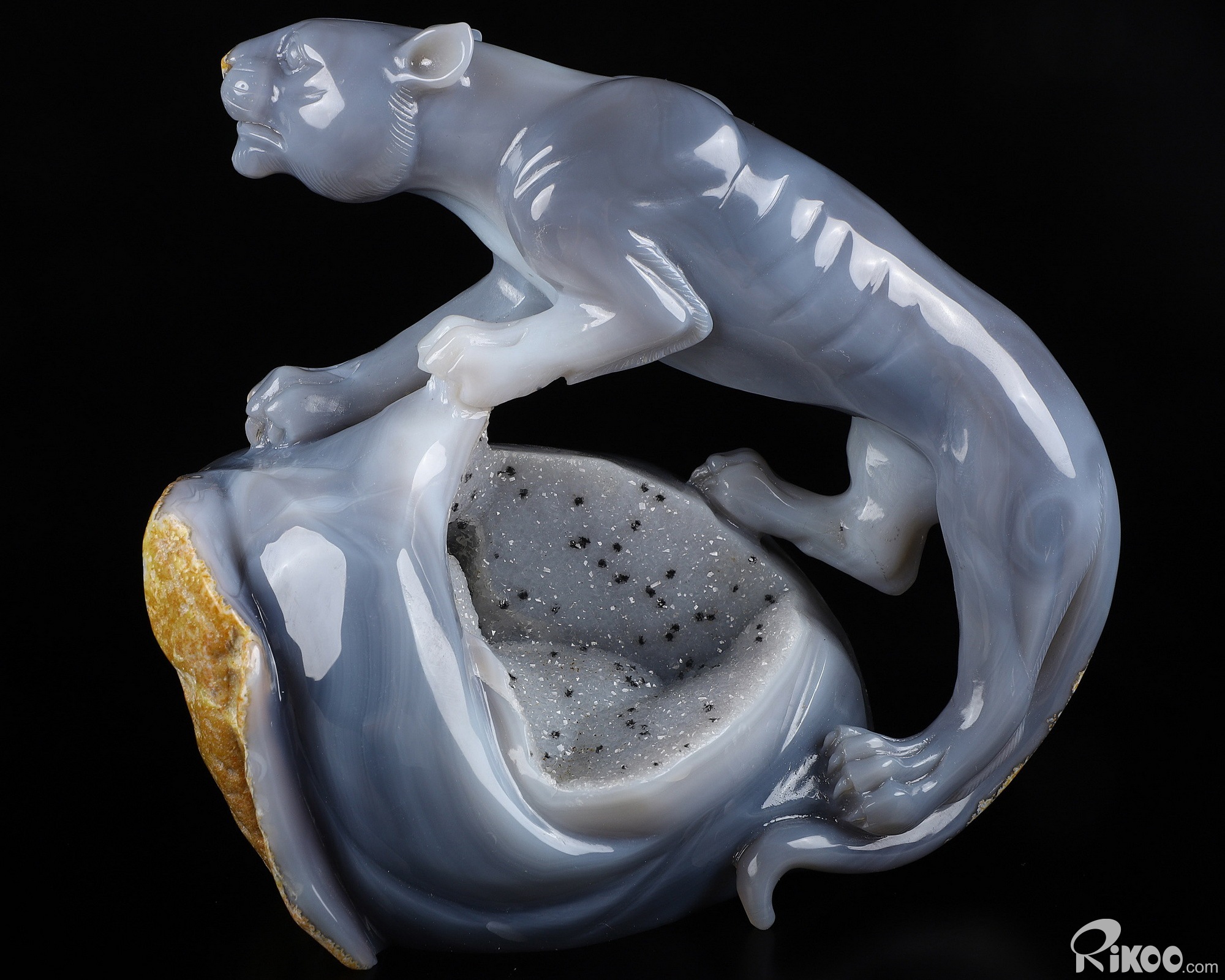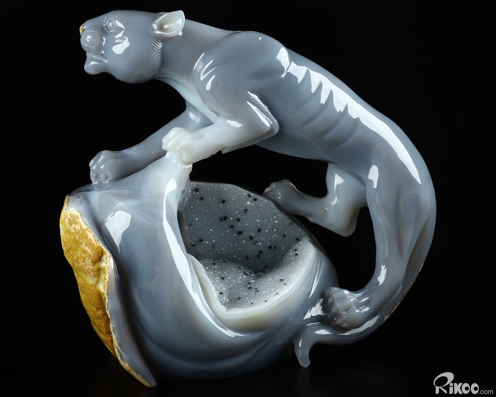 7.1" Agate Geode Hand Carved Crystal Leopard Sculpture, Crystal Healing