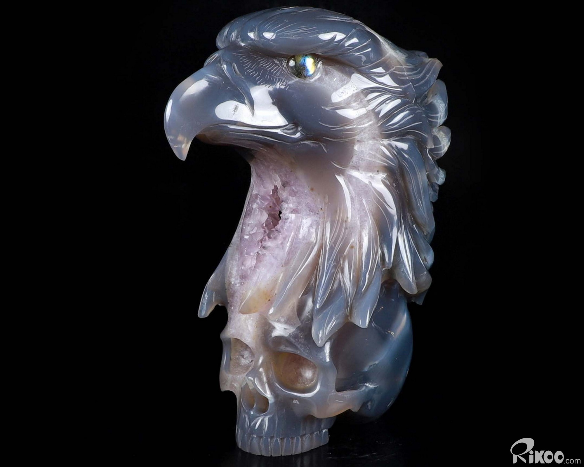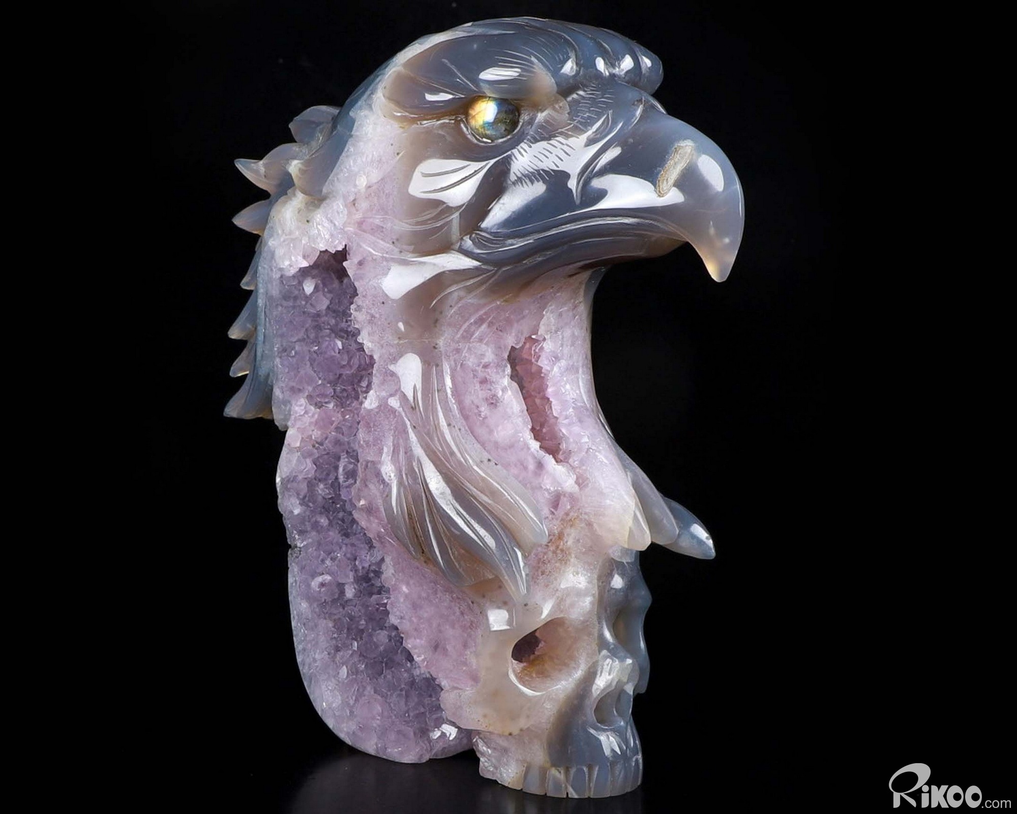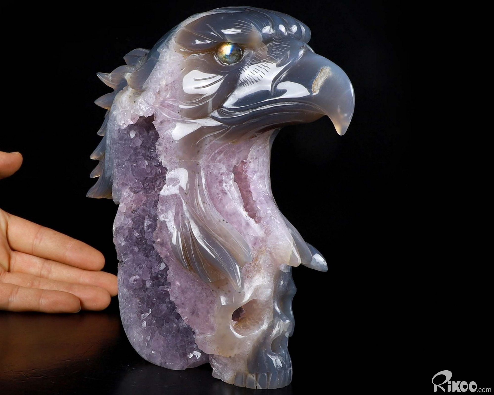 REGAL 7.2" Agate Amethyst Geode Carved Crystal Eagle and Skull Sculpture, Labradorite Eyes