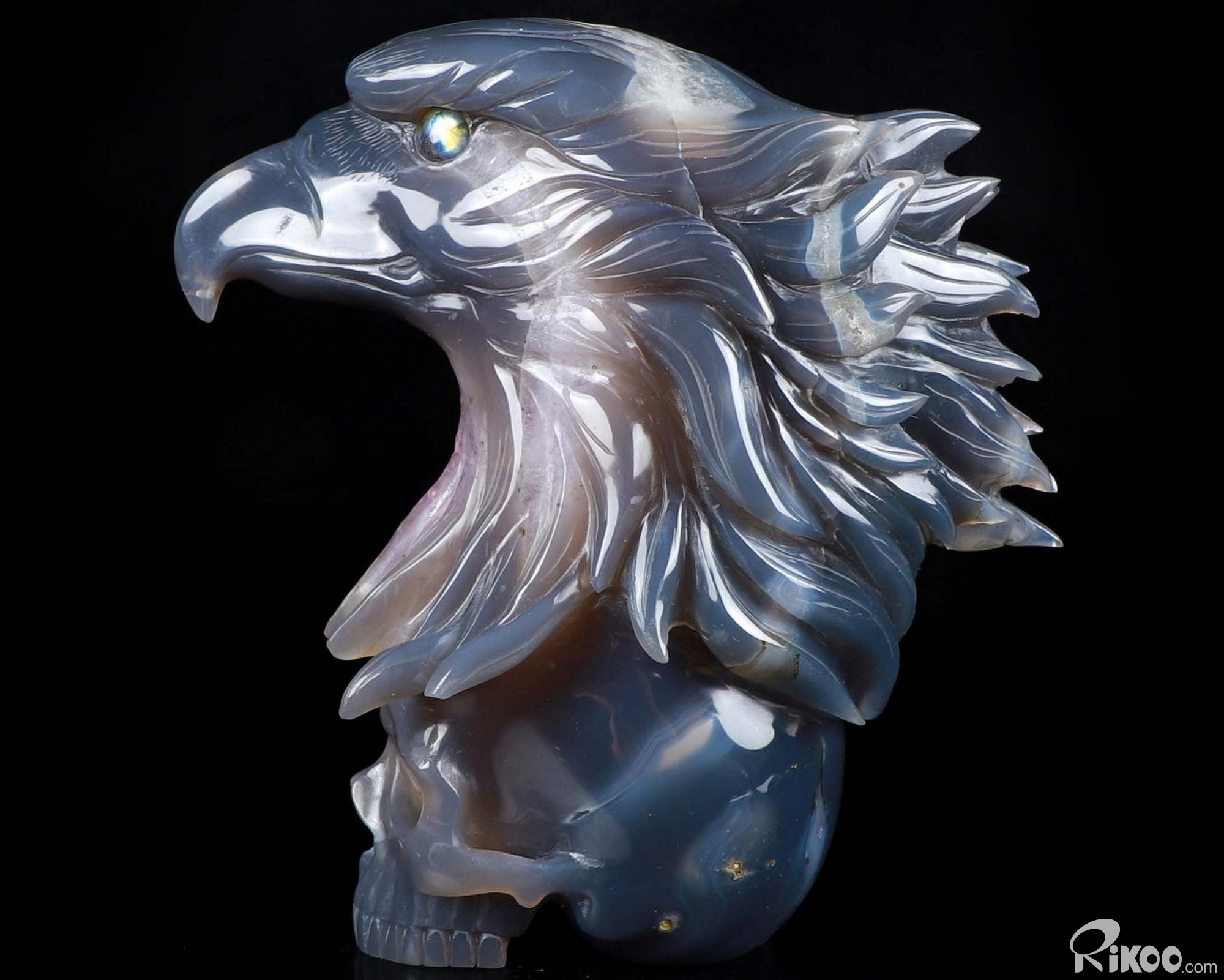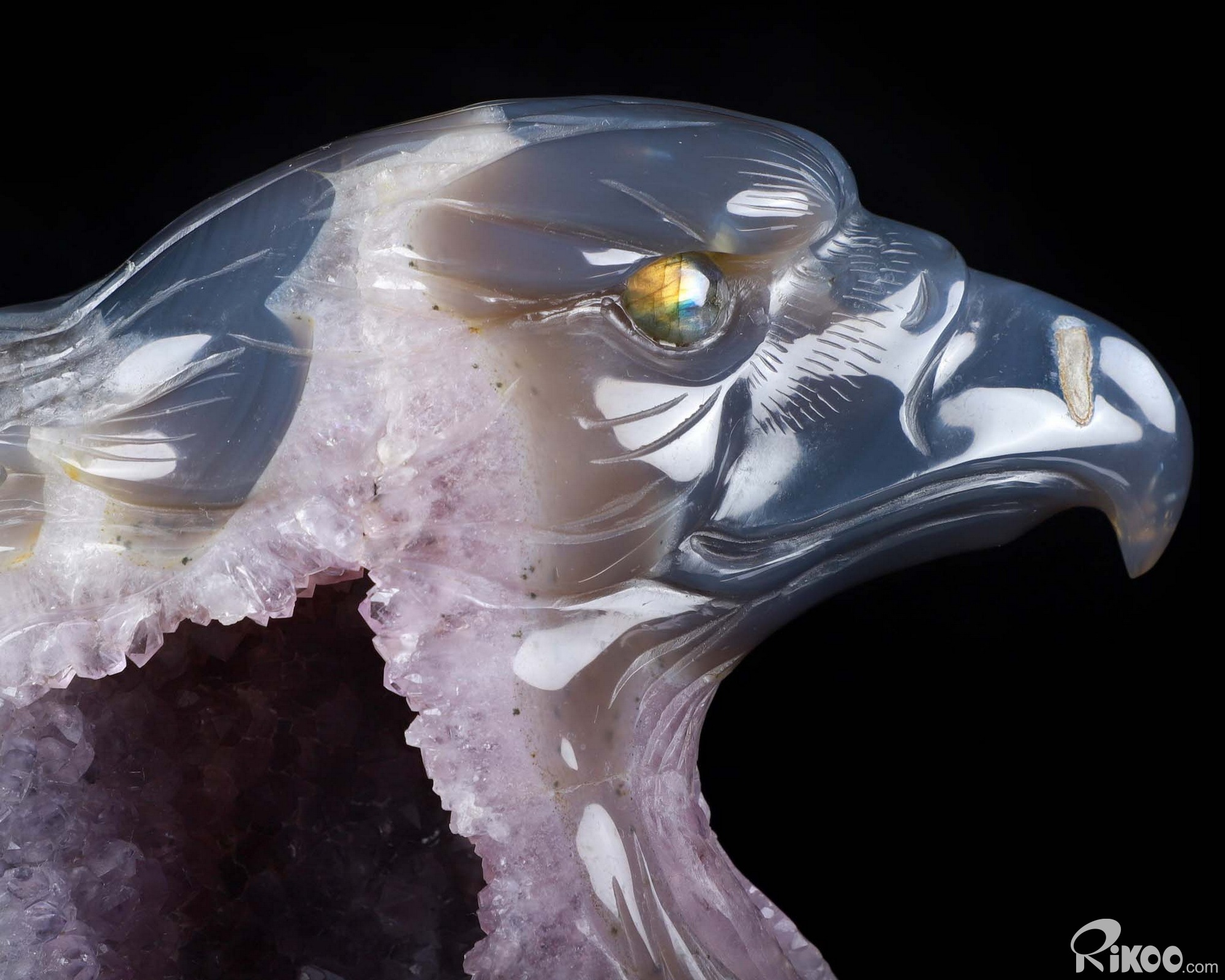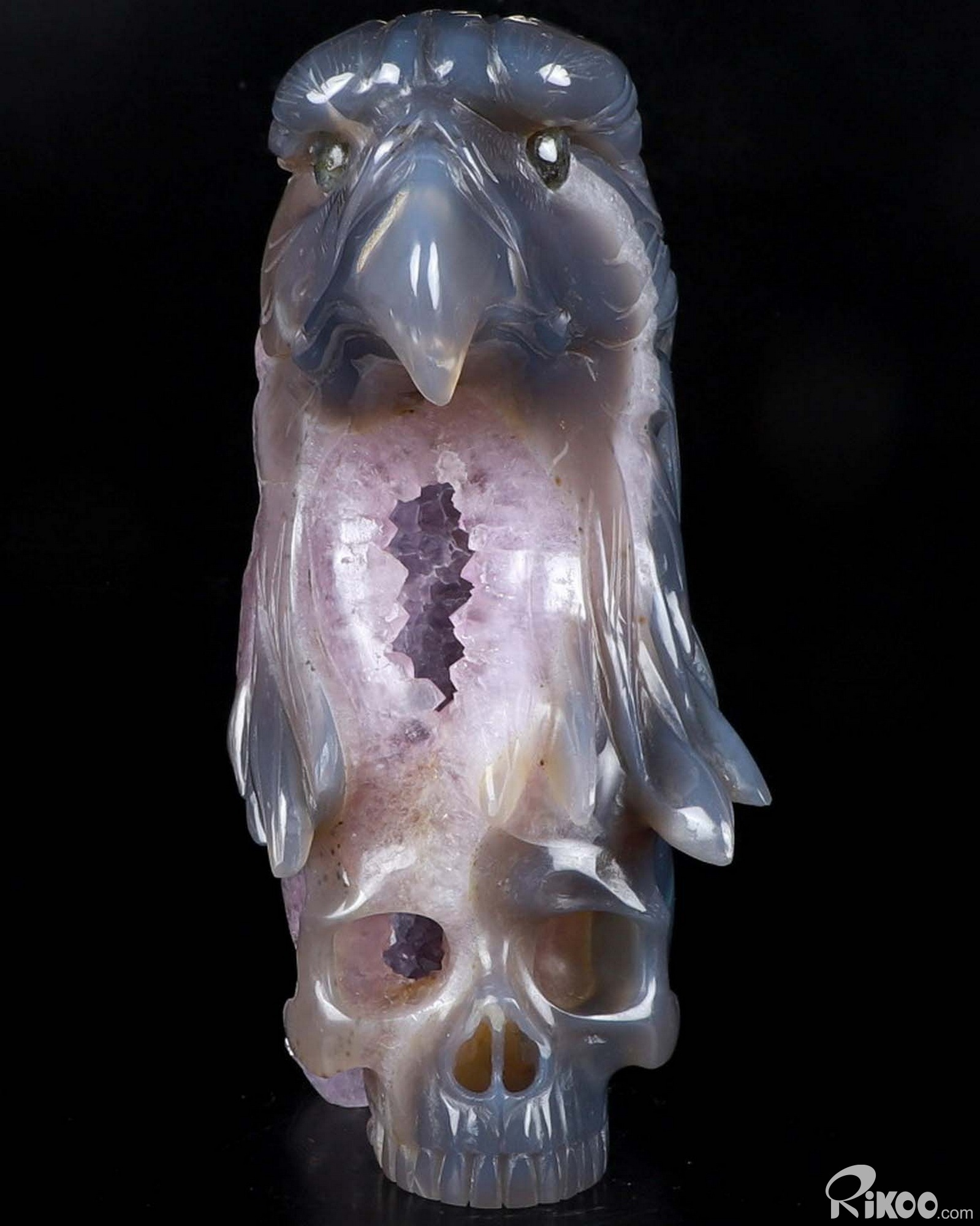 REGAL 7.2" Agate Amethyst Geode Carved Crystal Eagle and Skull Sculpture, Labradorite Eyes