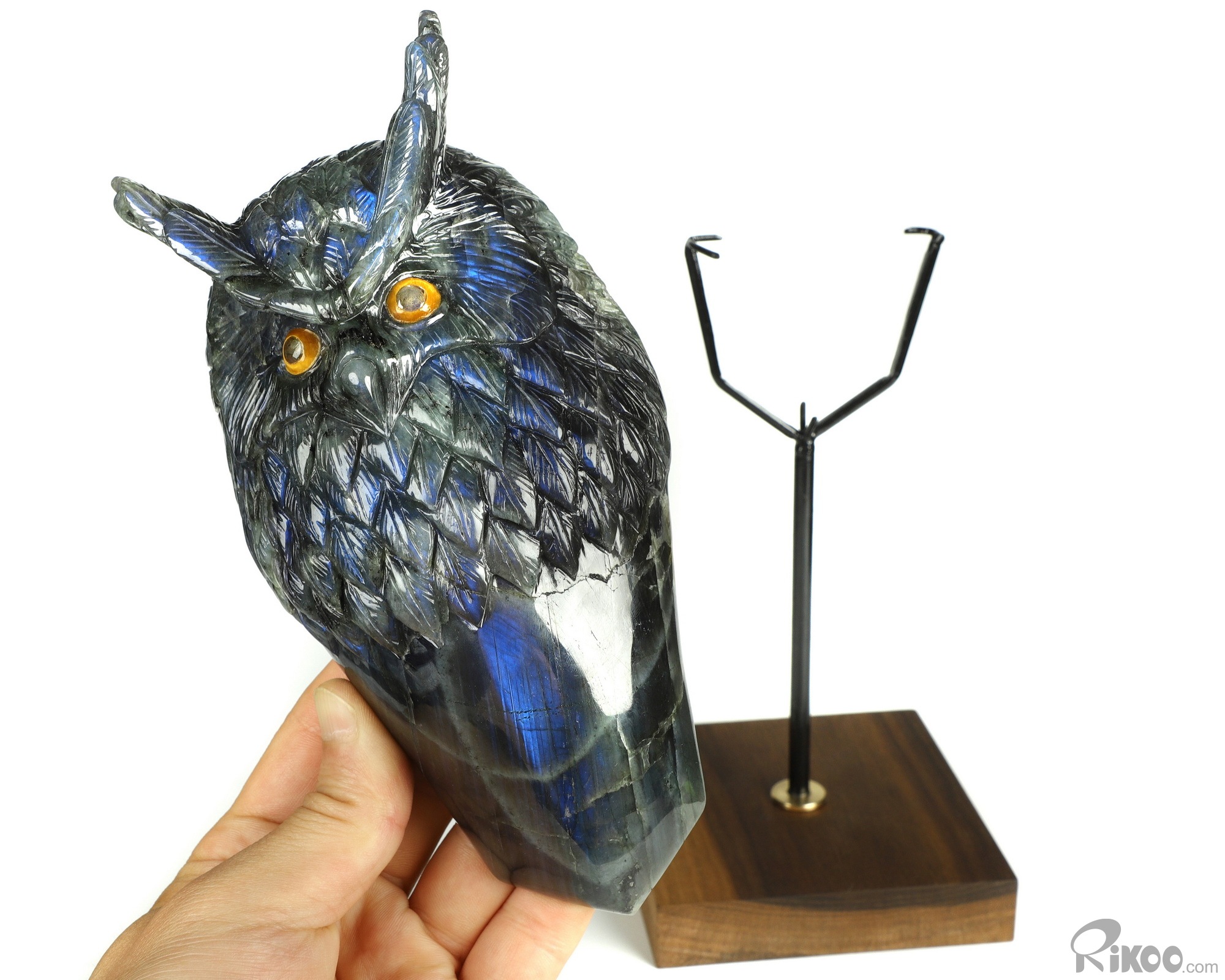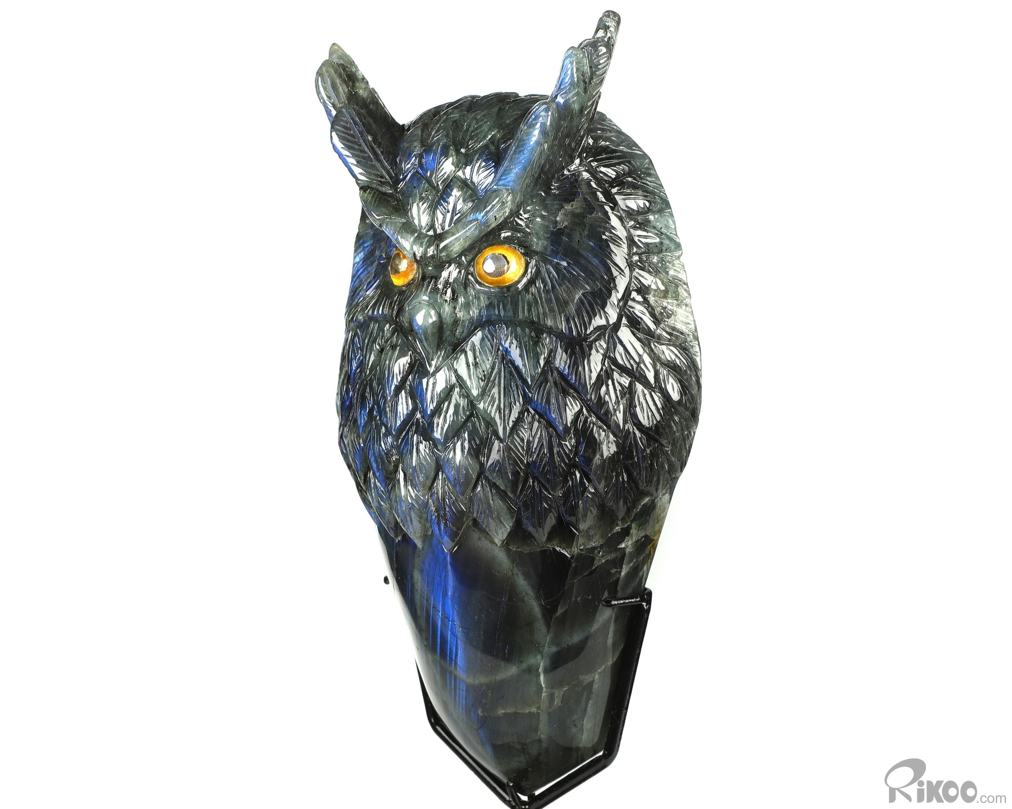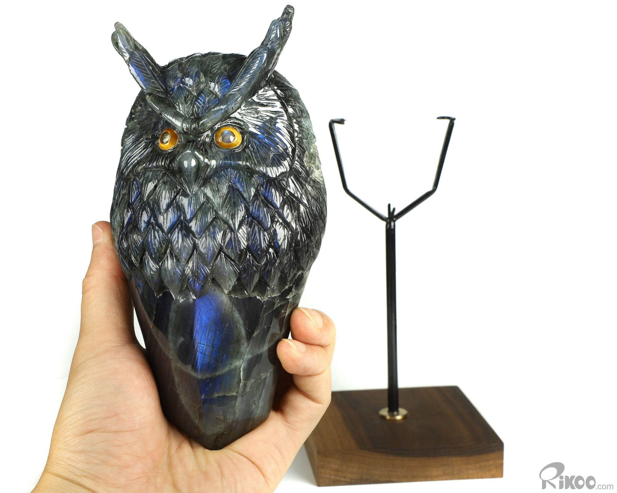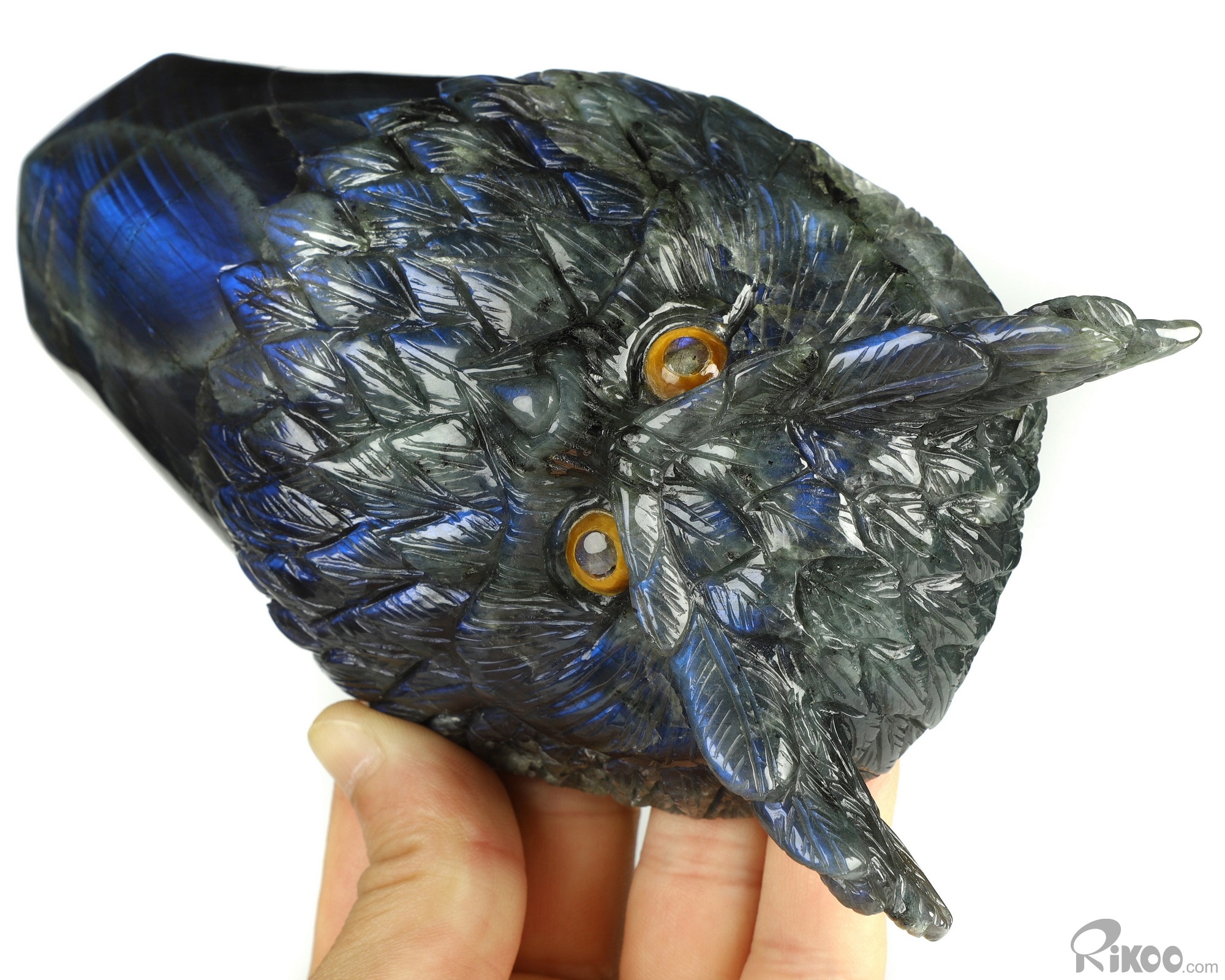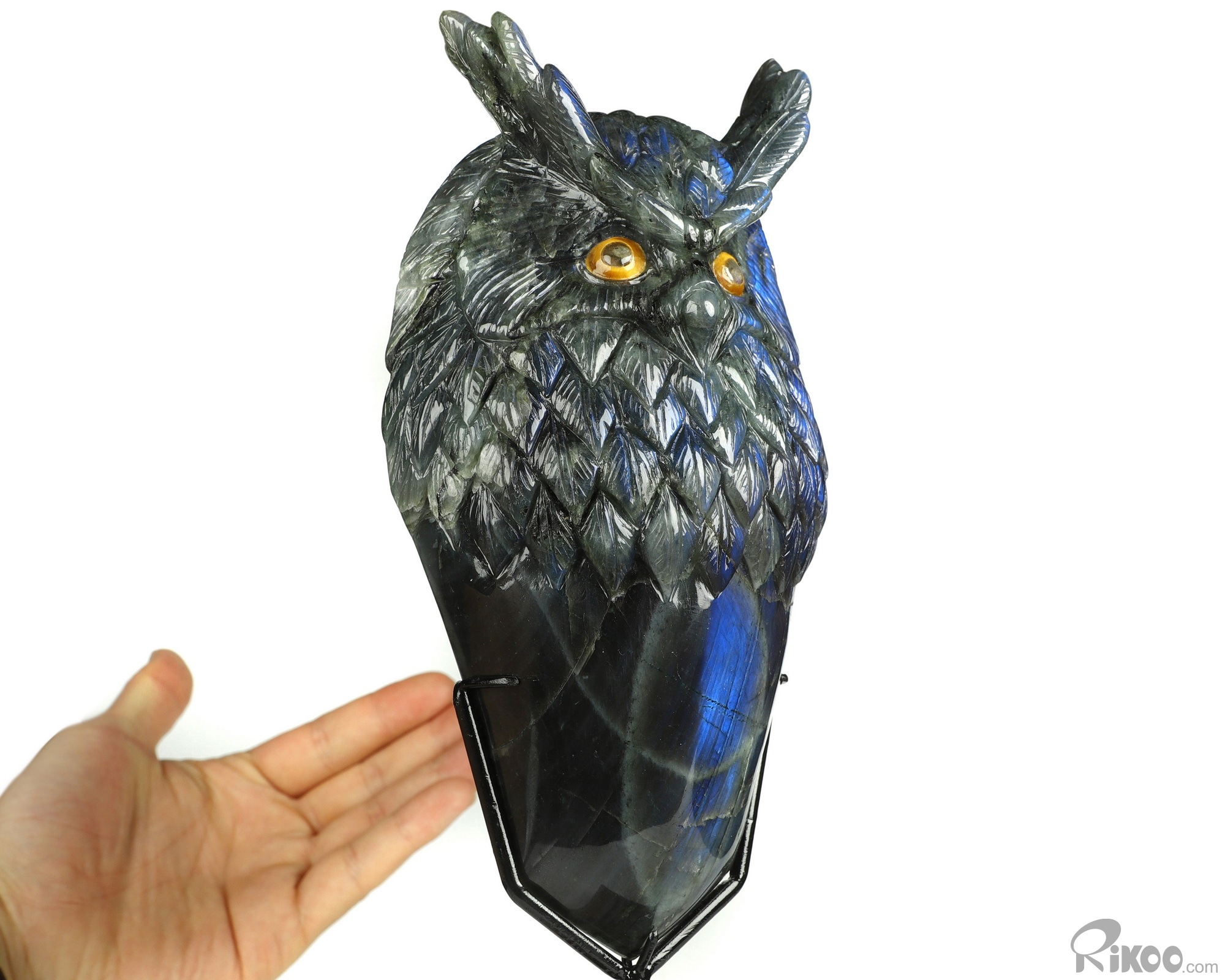 You are looking at a Labradorite owl. The owl is 7.2 inches long from top to bottom.