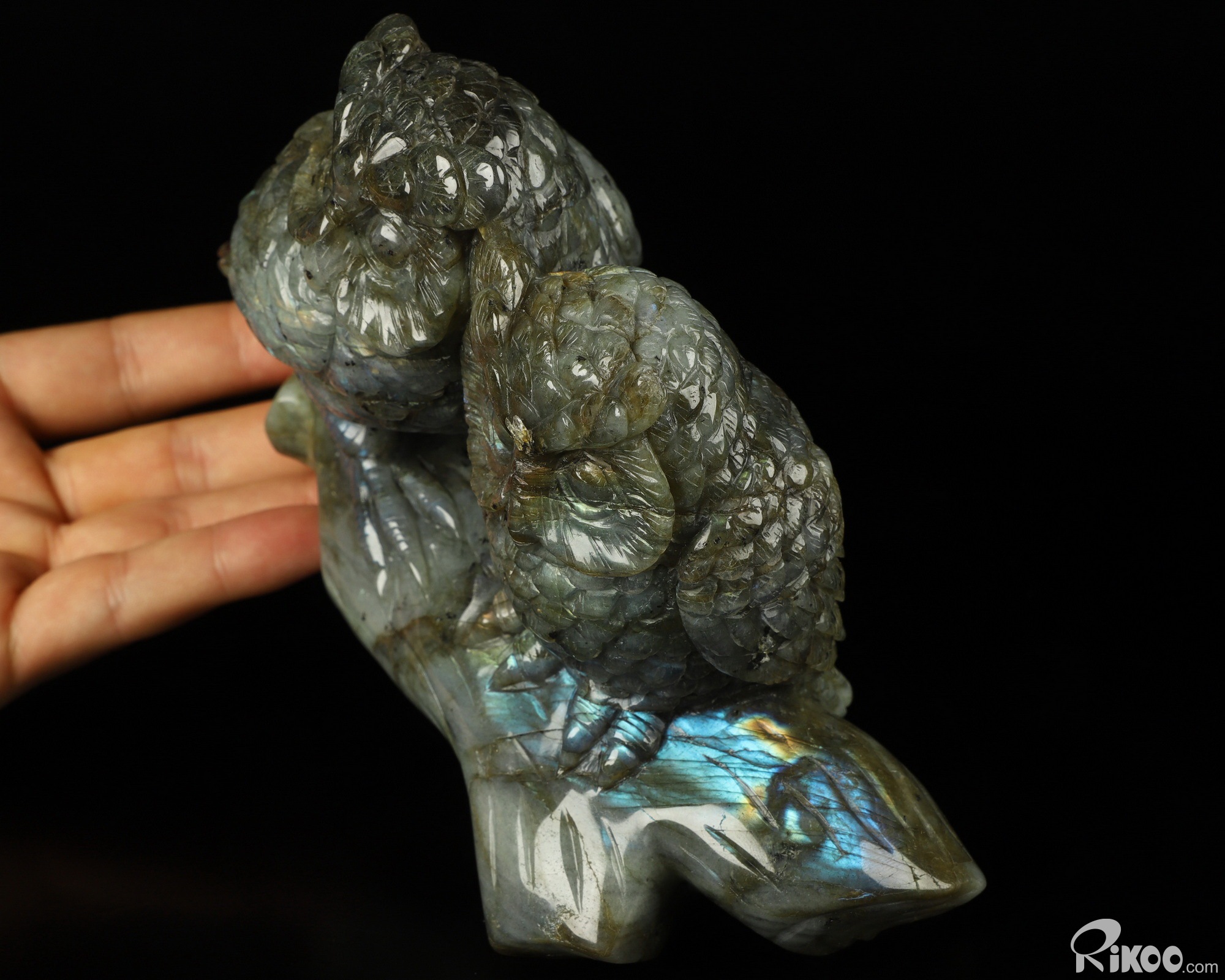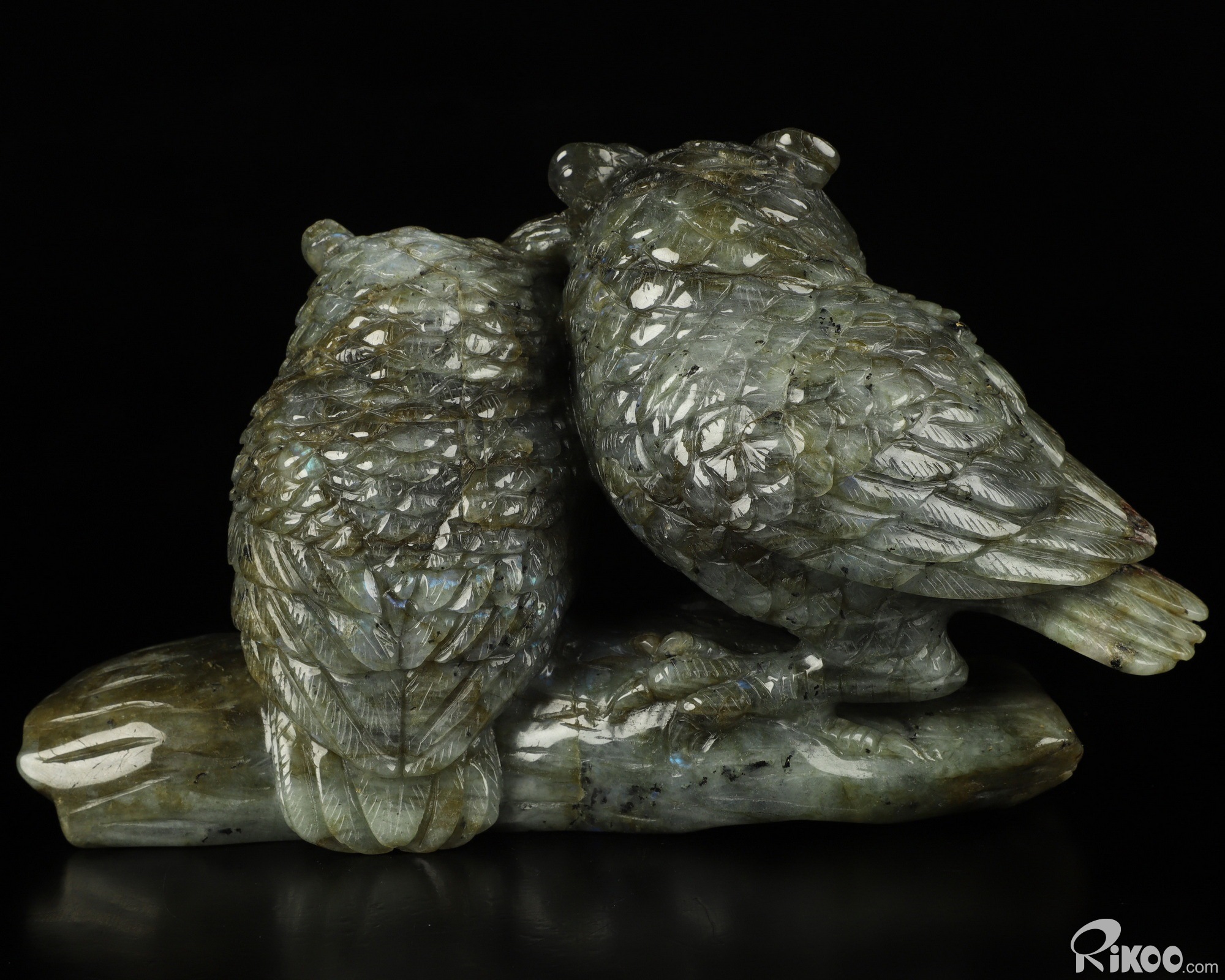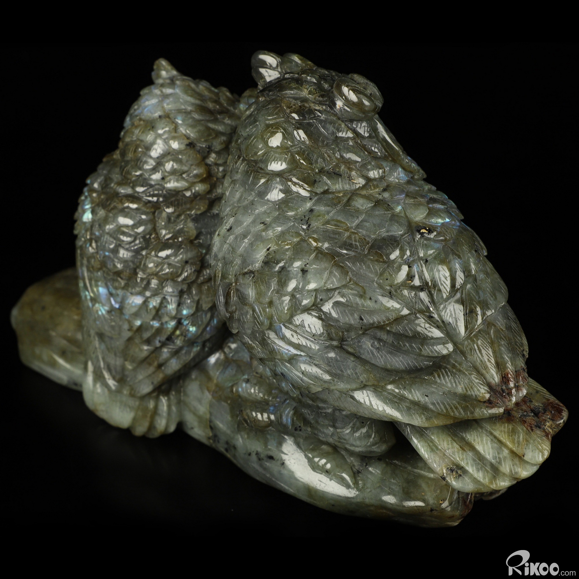 7.3" Labradorite Hand Carved Crystal Double Owls Sculpture, Crystal Healing