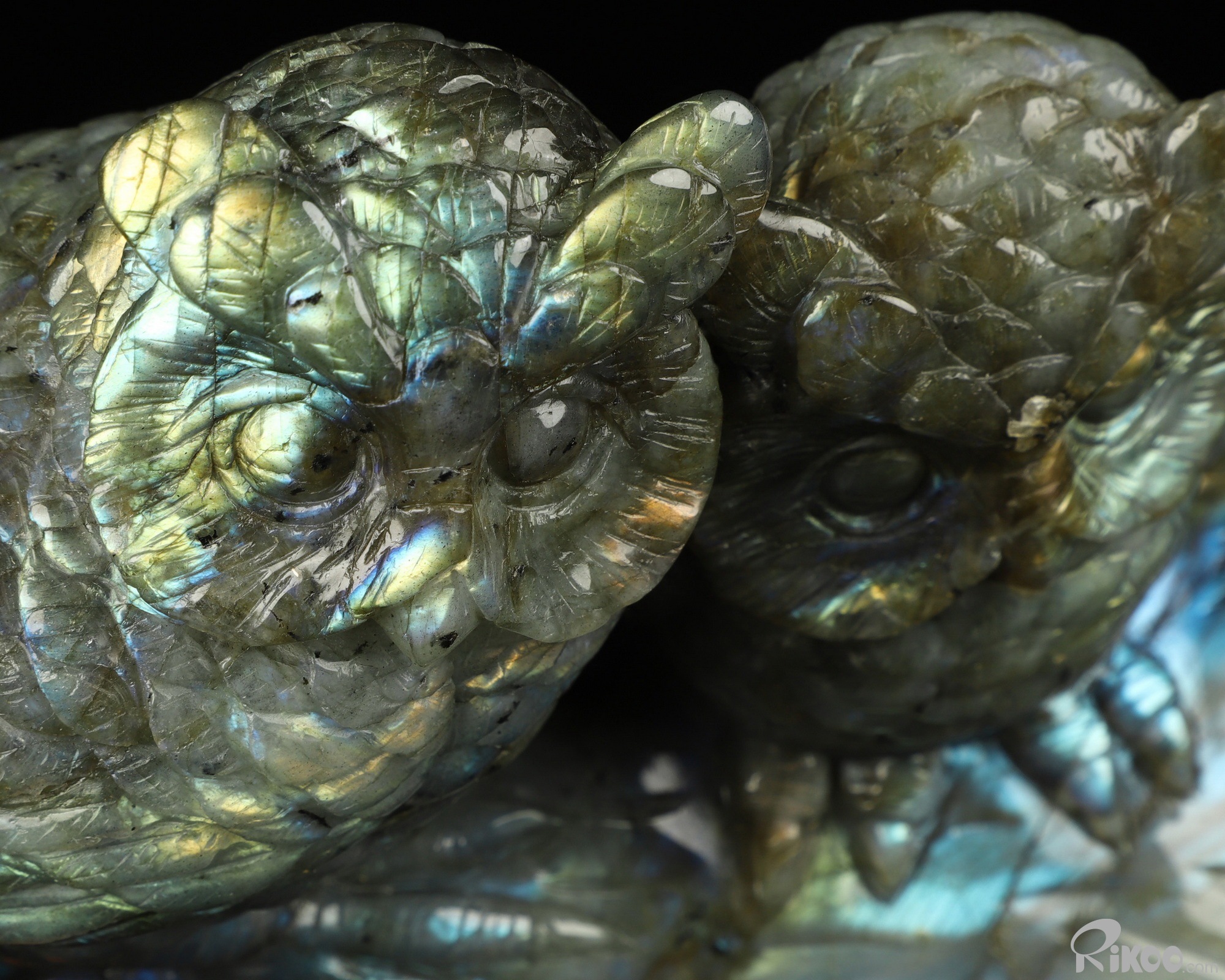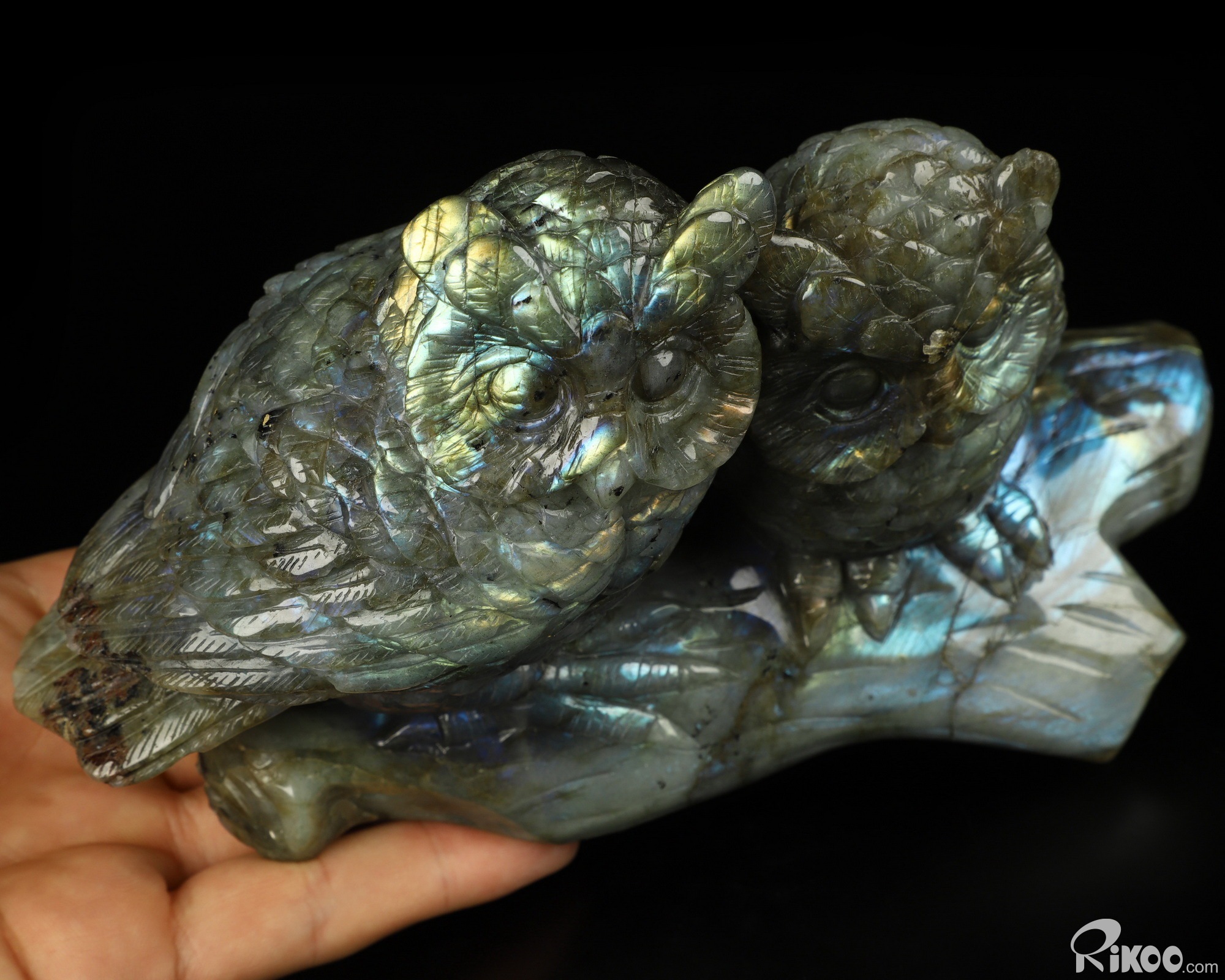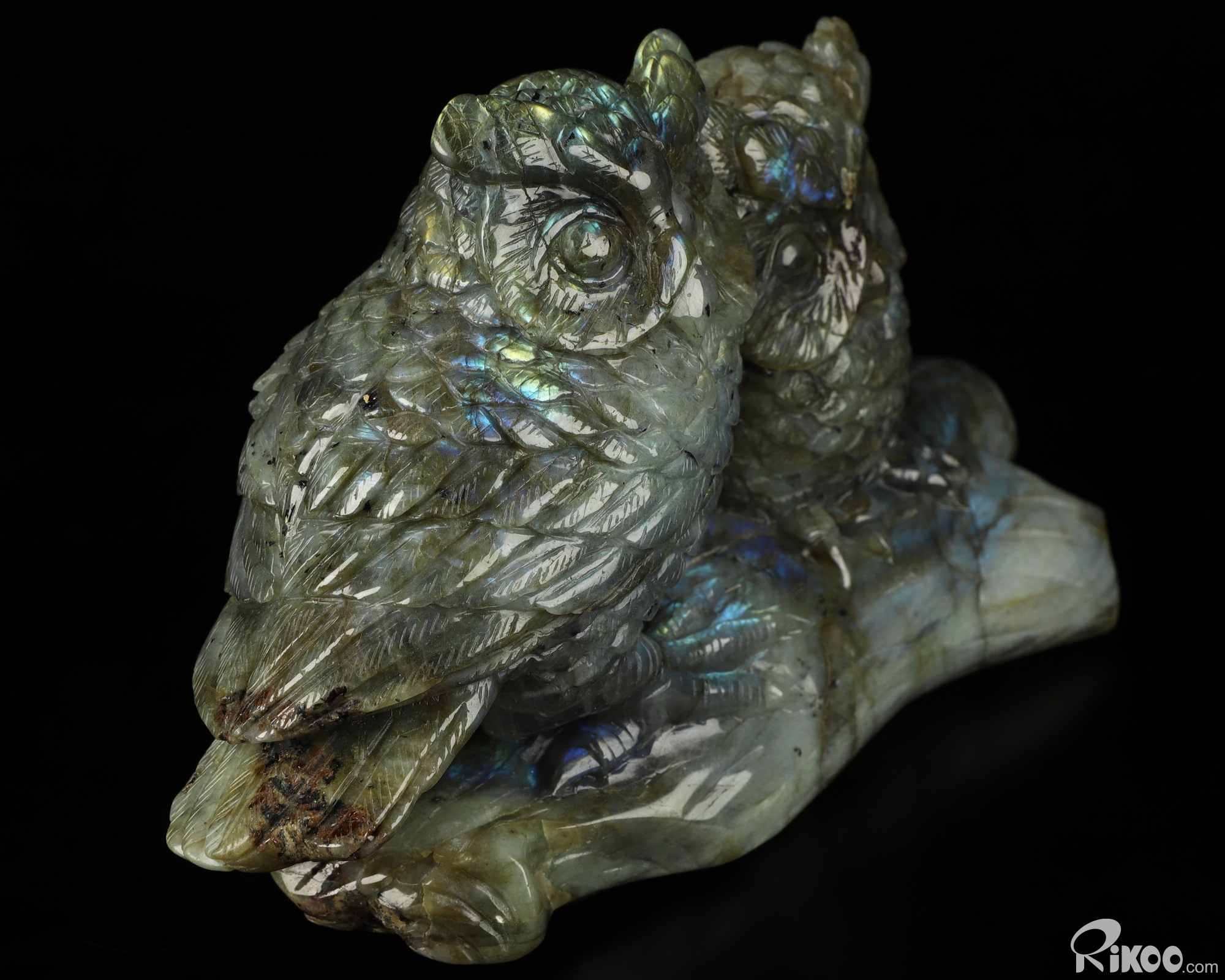 7.3" Labradorite Hand Carved Crystal Double Owls Sculpture, Crystal Healing
