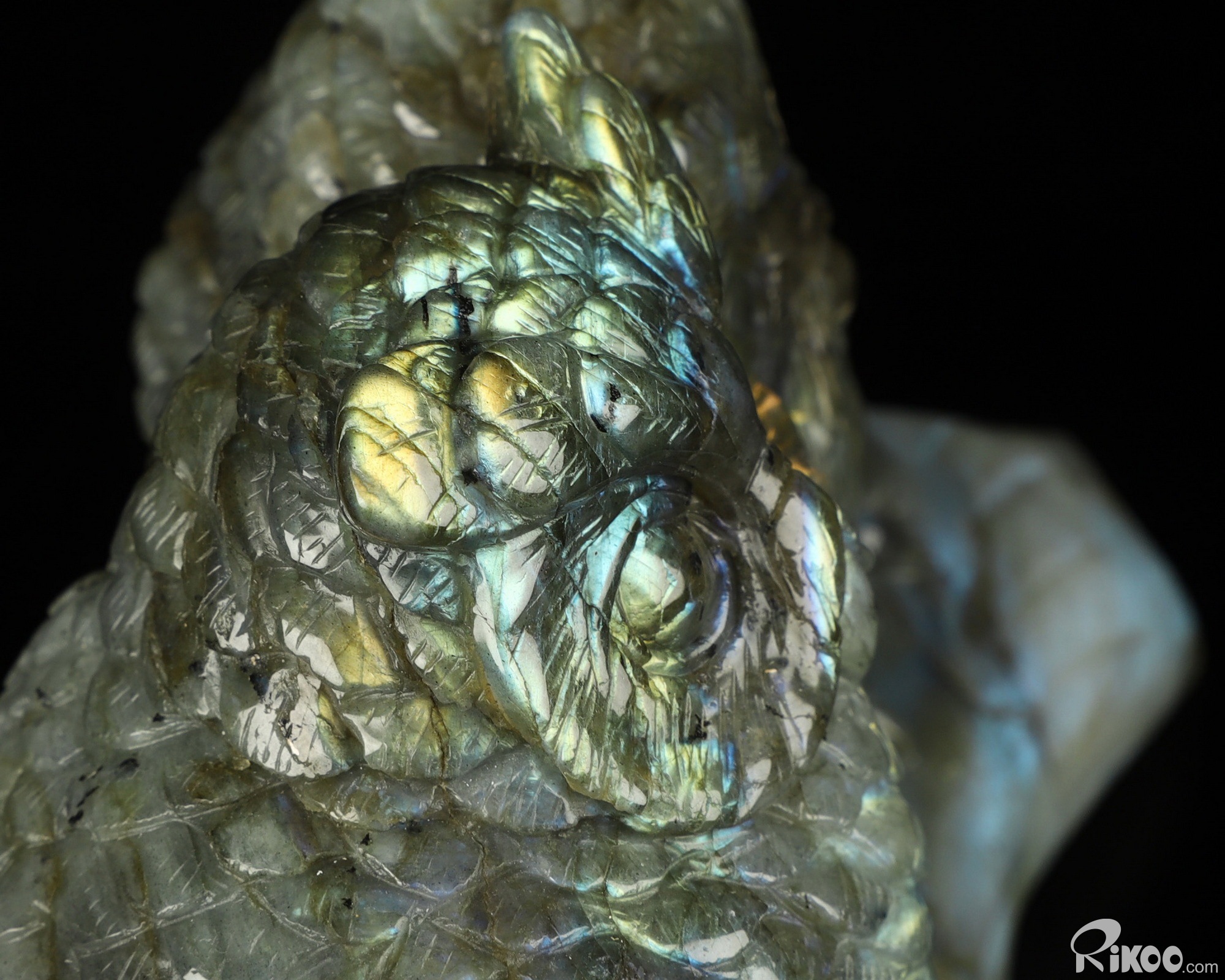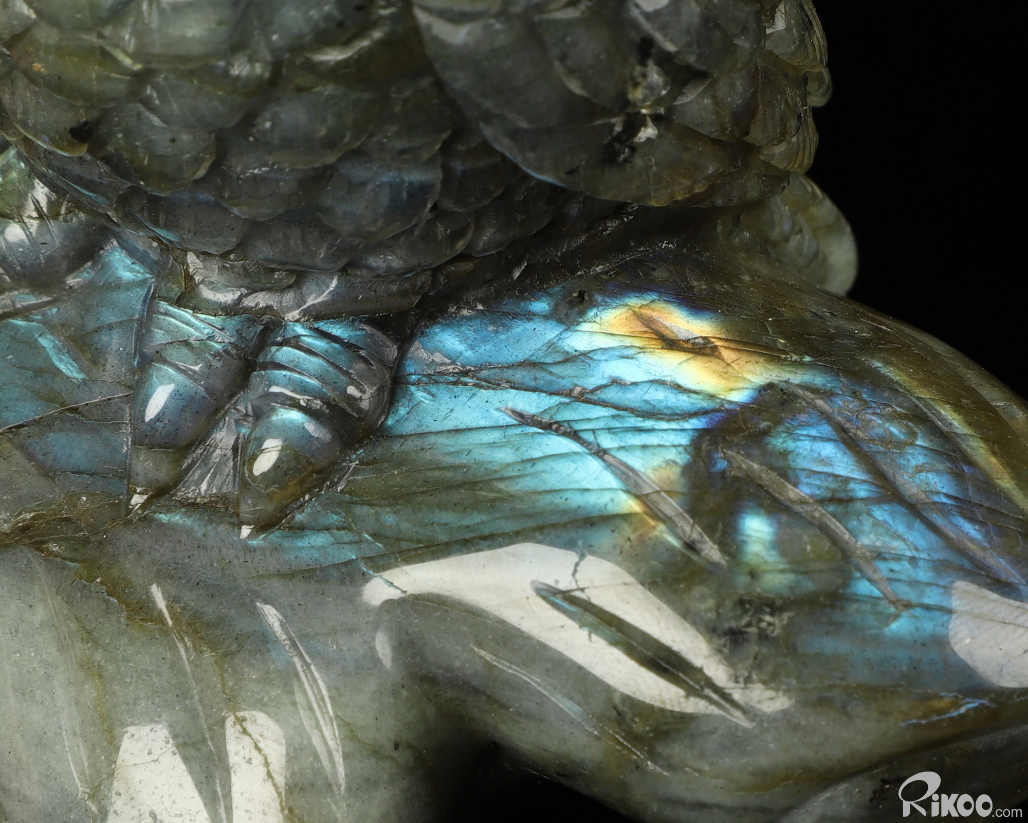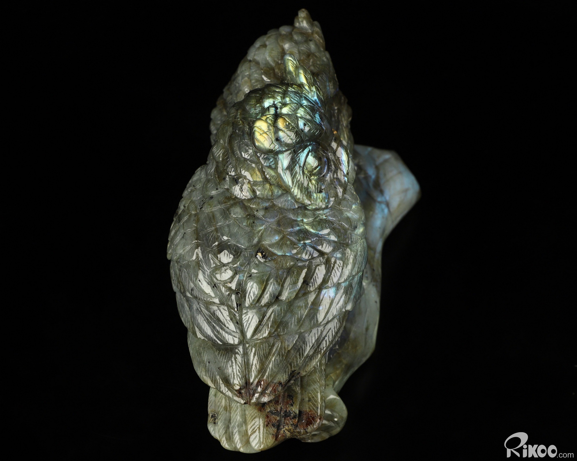 You are looking at a Labradorite Owl. The Owl is 7.3 inches long from front to back.