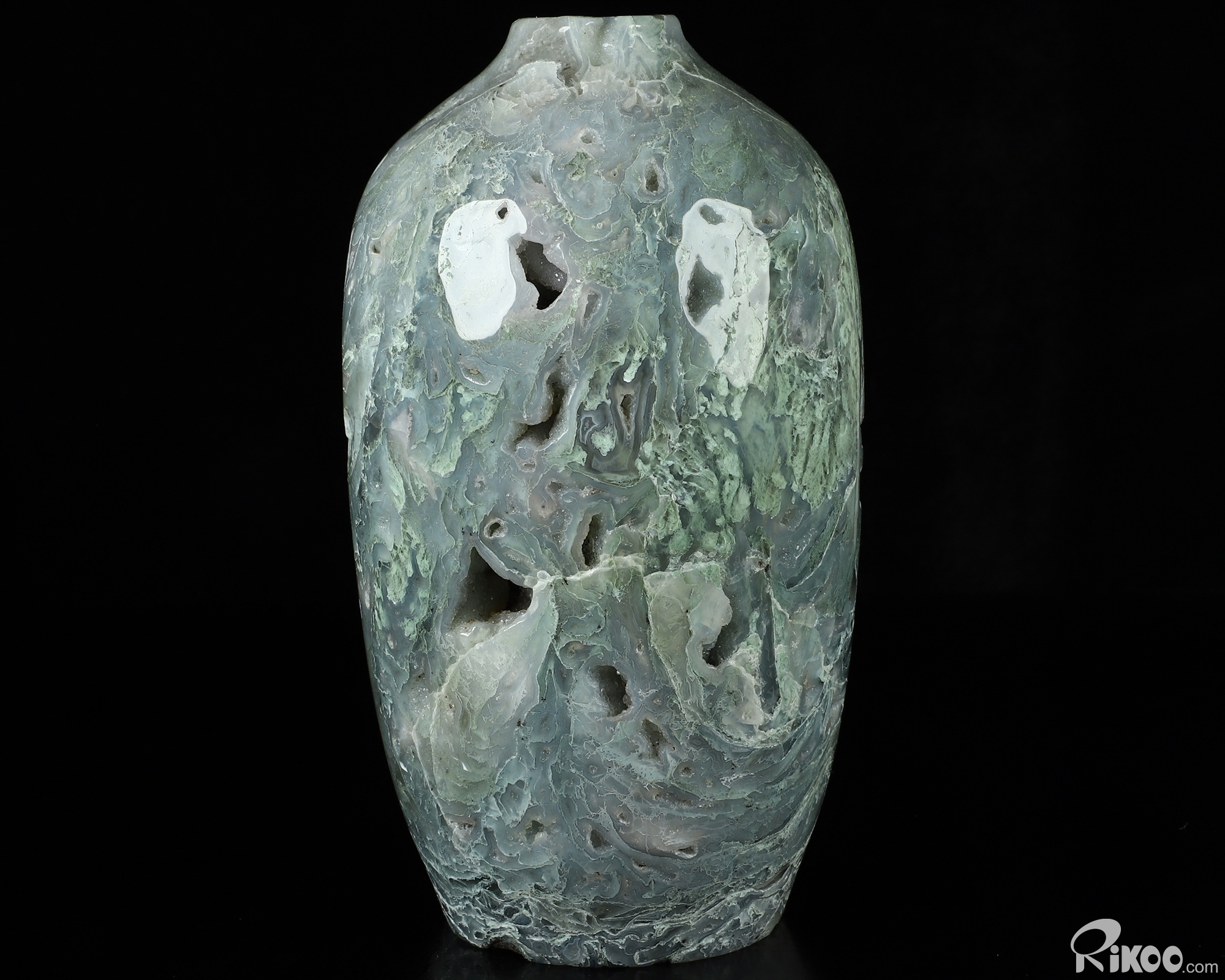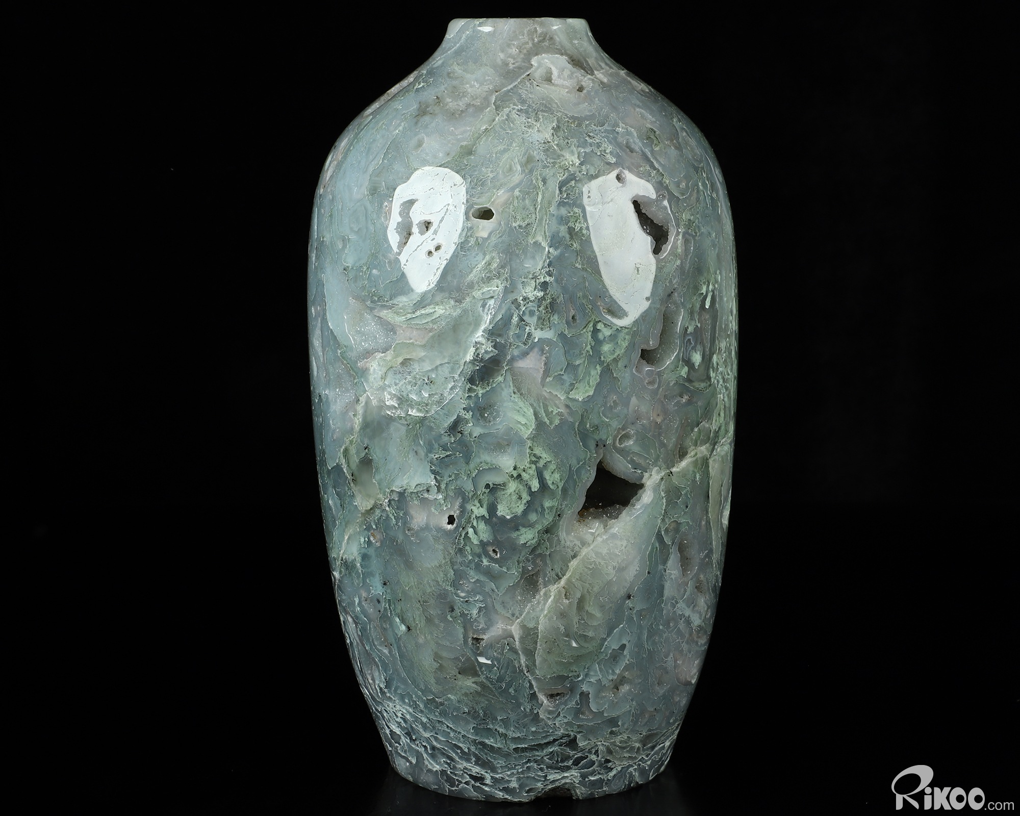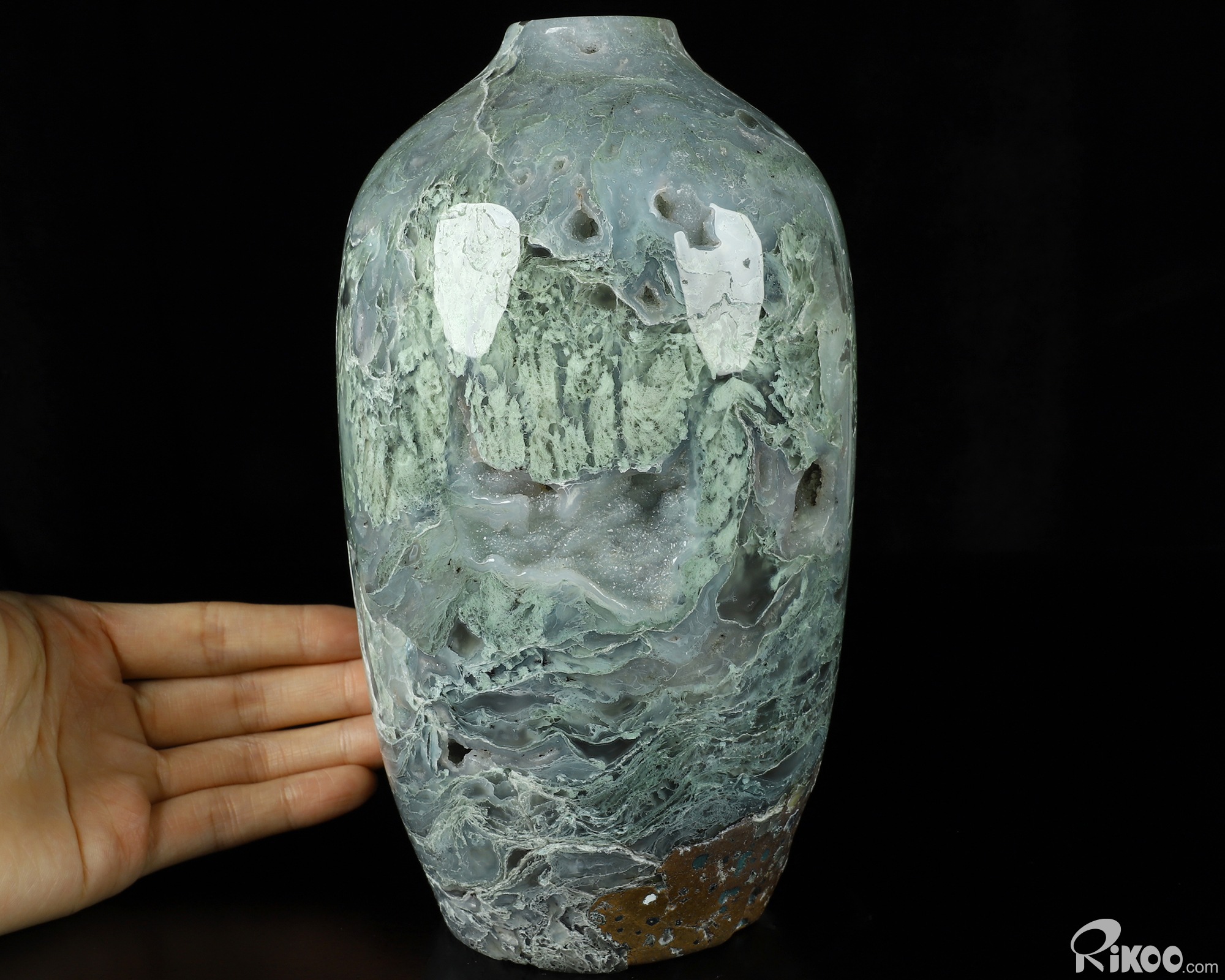This vase with limited functionality is mainly for display.Connects one to Nature. Translucent, transparent agate containing inclusions of minerals that look like moss or foliage. Improves ego and self-esteem, emotional balance and strengthens positive personality traits. Allows one to see all the beauty one's eyes touch.