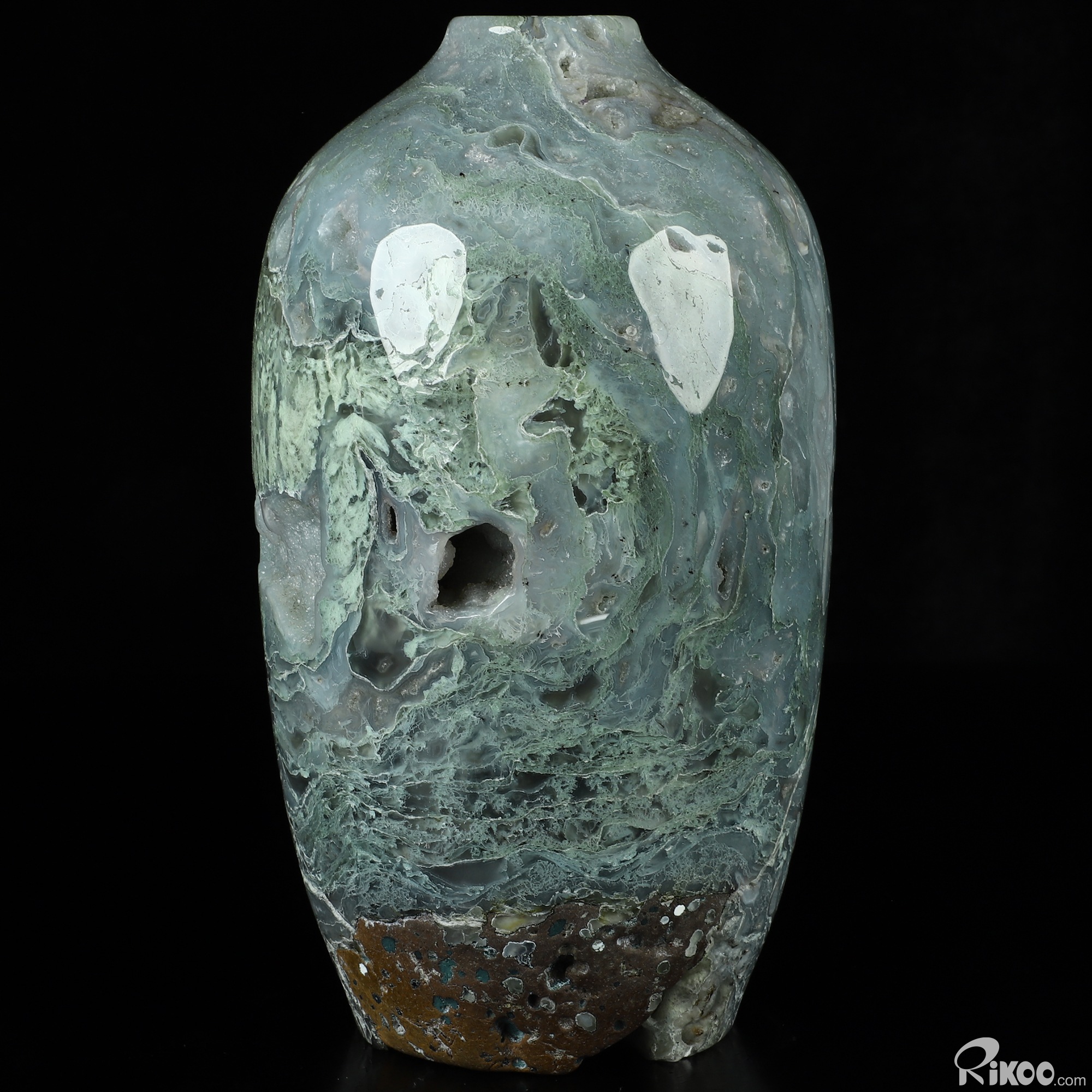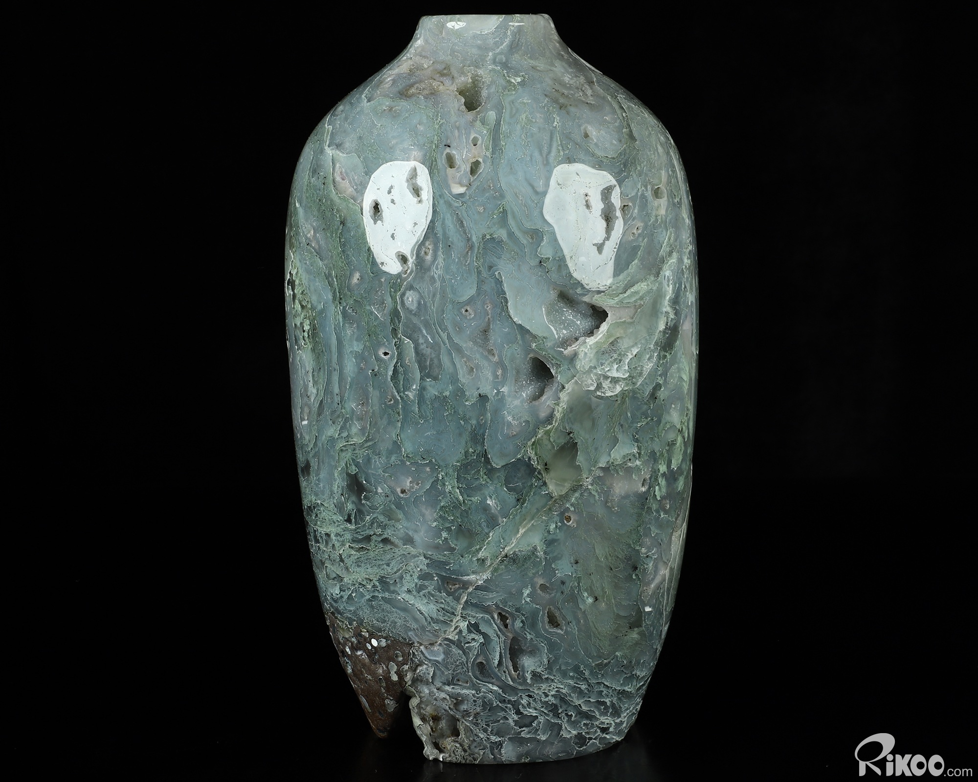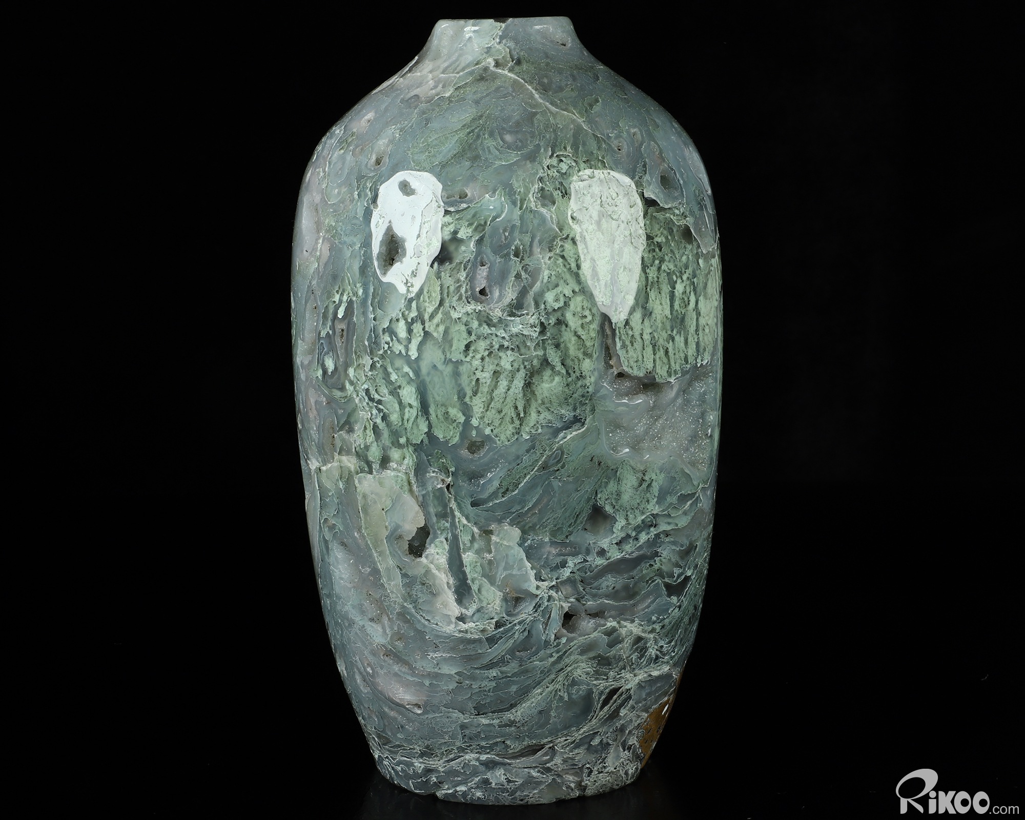 This vase with limited functionality is mainly for display.Connects one to Nature. Translucent, transparent agate containing inclusions of minerals that look like moss or foliage. Improves ego and self-esteem, emotional balance and strengthens positive personality traits. Allows one to see all the beauty one's eyes touch.