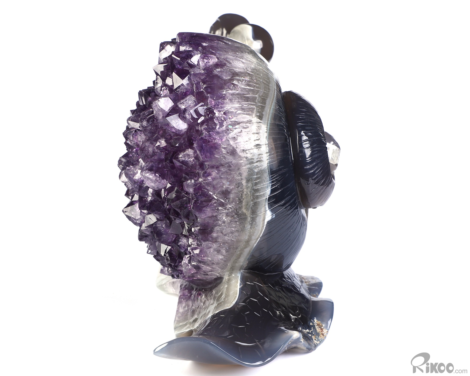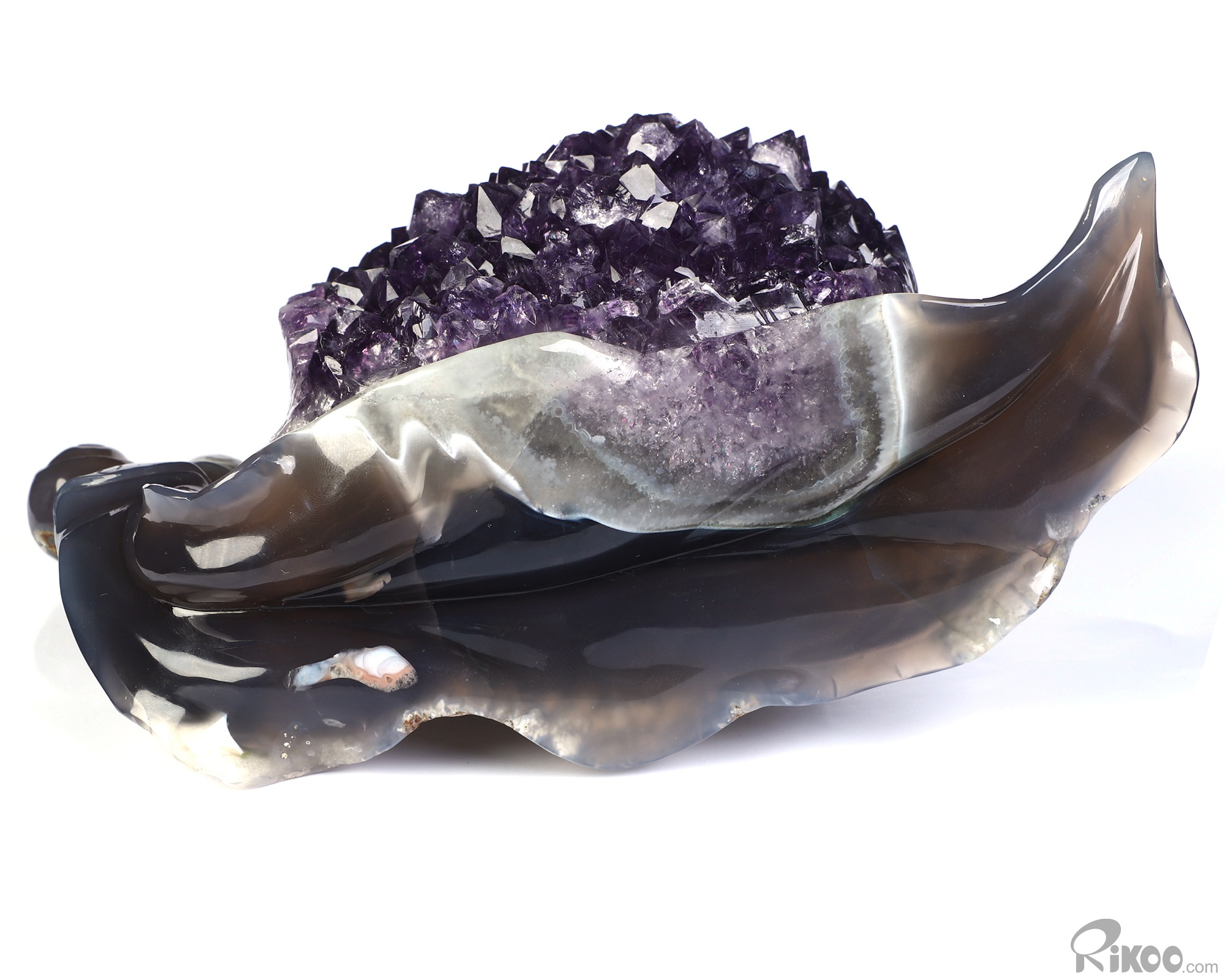 You are looking at an Agate Amethyst Druse sculpture. The sculpture is 7.7 inches long.