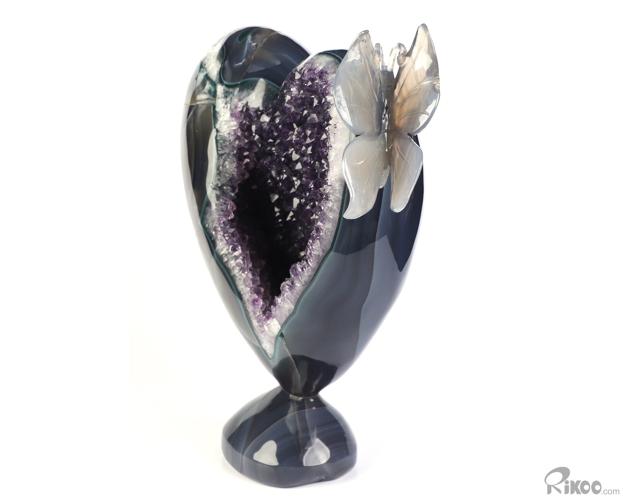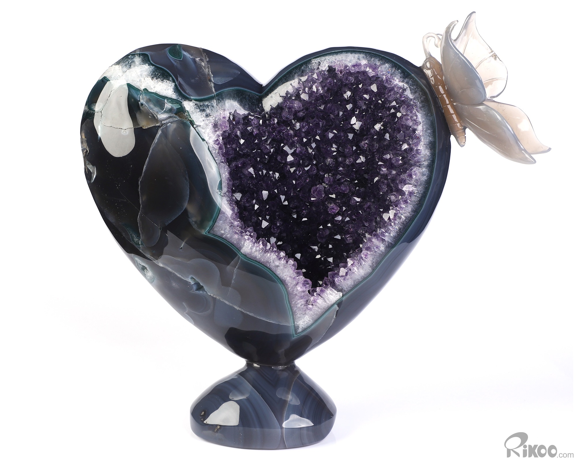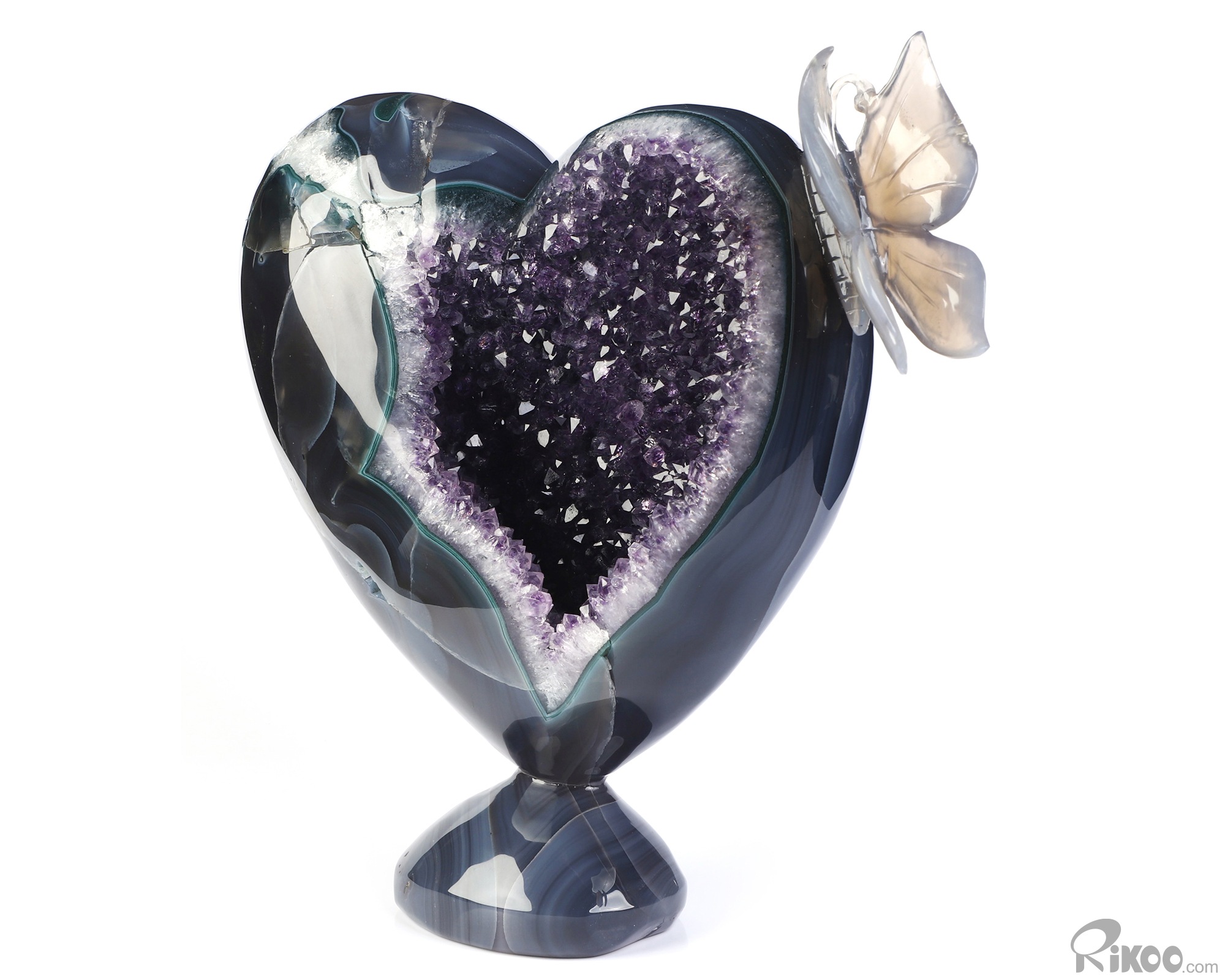 7.7" Agate Amethyst Geode Hand Carved Crystal Heart Butterfly Sculpture, Crystal Healing