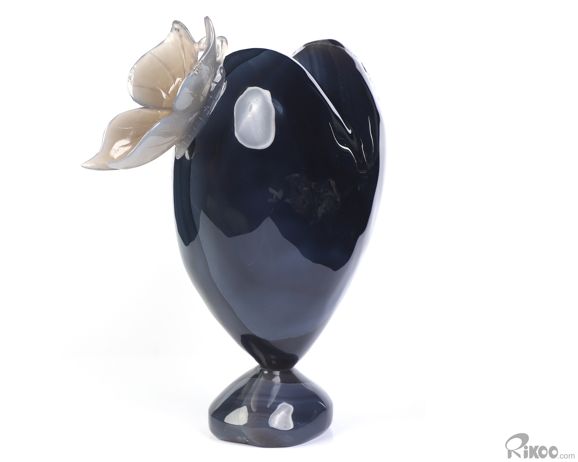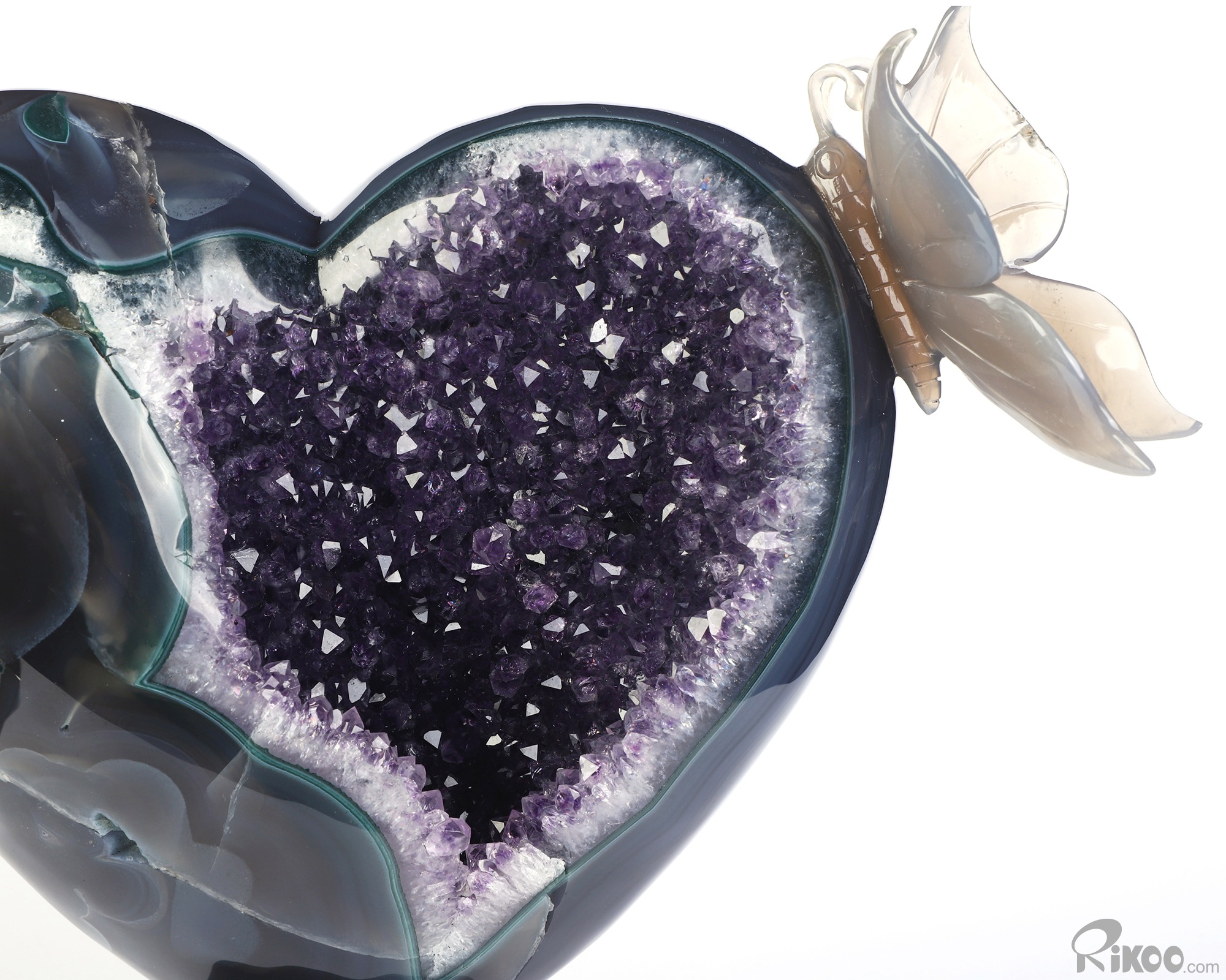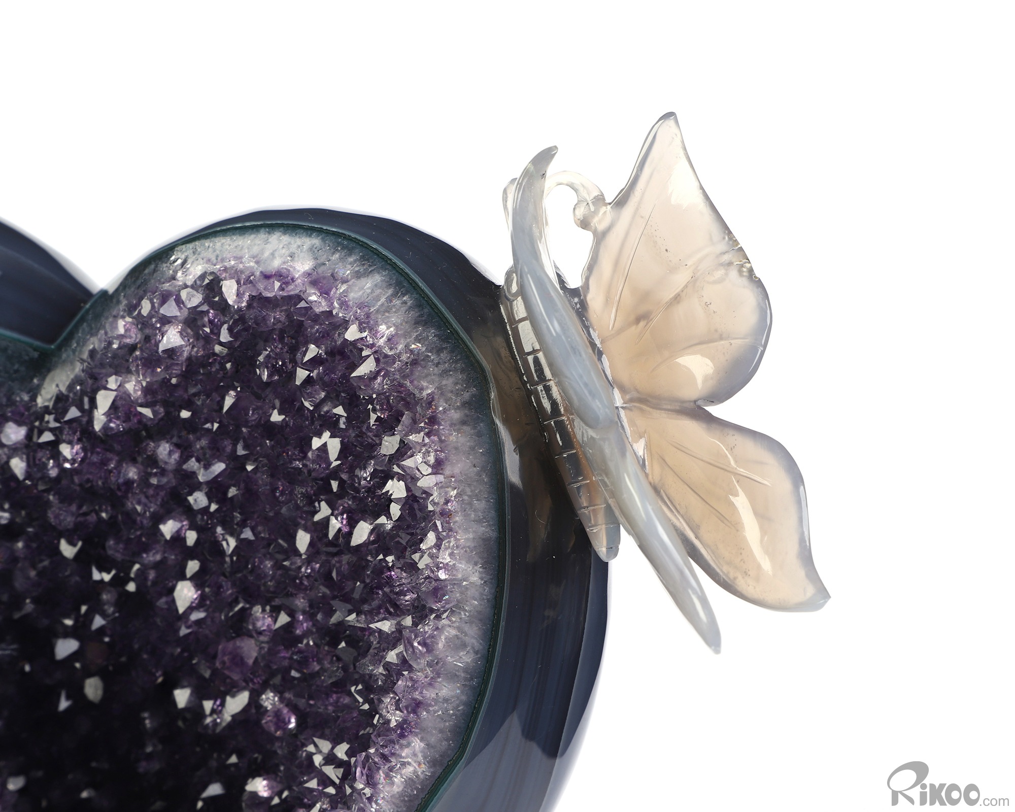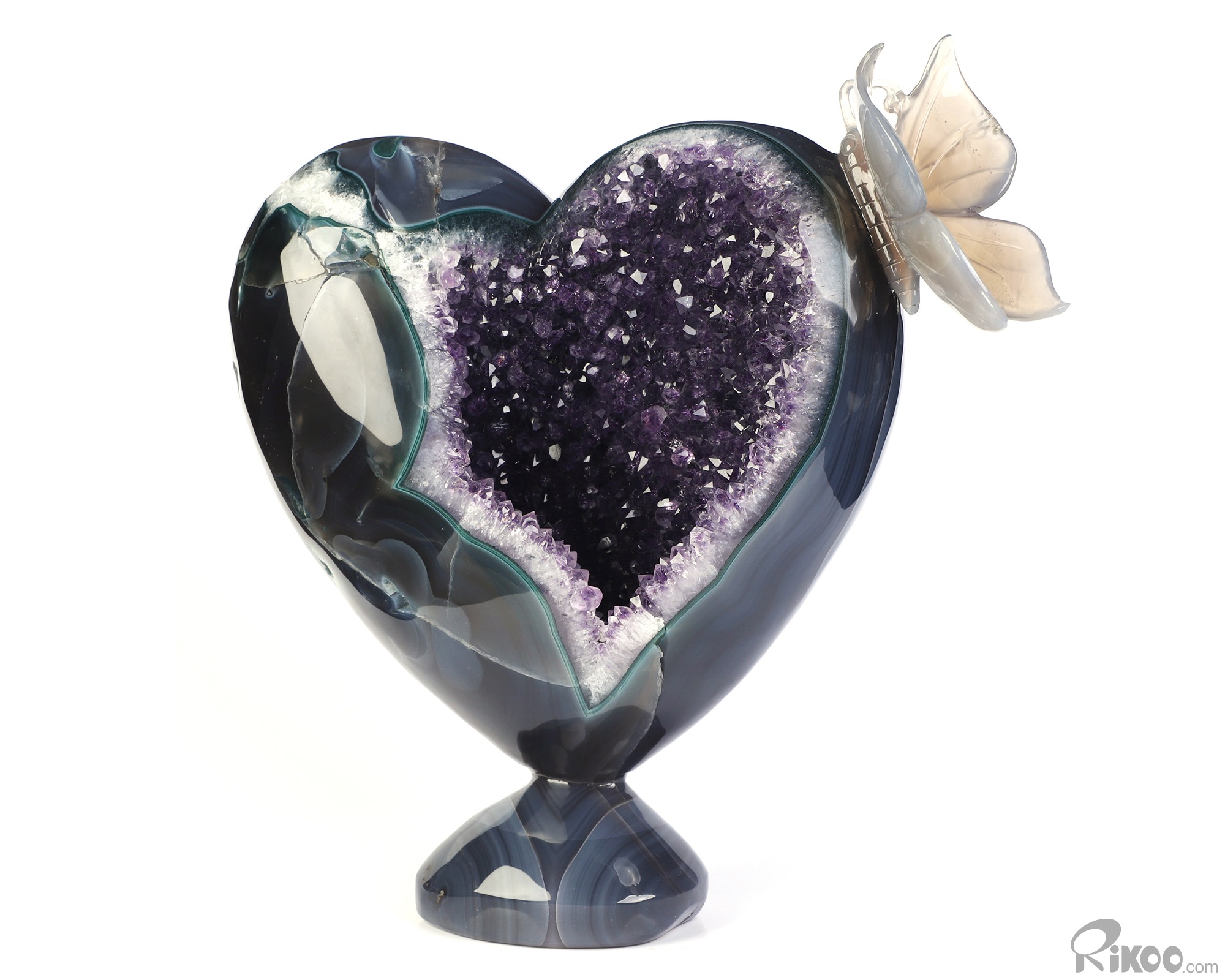 7.7" Agate Amethyst Geode Hand Carved Crystal Heart Butterfly Sculpture, Crystal Healing