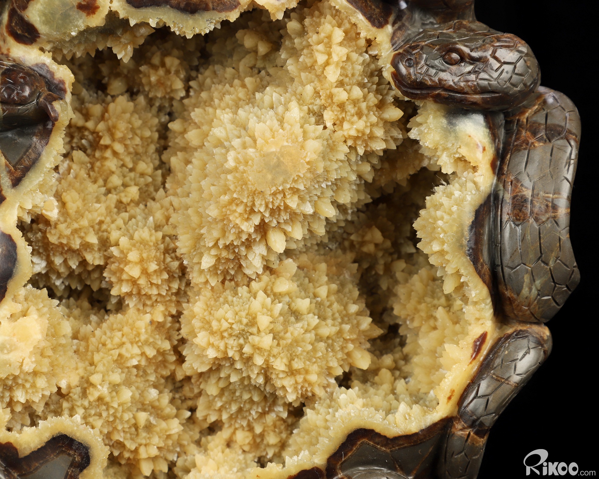 Septarian is a geode that is a combination of yellow calcite, brown aragonite, grey limestone and white/clear barite, thus it has properties of each of its component minerals. Septarian is brings calming energies which have a nurturing feel to them, and can bring feelings of joy and spiritual uplifting. Septarian is used to enhance and nurture communication with groups, making it much easier to speak clearly and kindly in group settings.Septarian is also used to assist with communication with Mother Earth. It is said to bring unconscious foreknowledge needed by the user to help him or her always be prepared for what is coming up. In crystal healing folklore, Septarian is used for healing of the blood and kidneys. Septarian is related to the lower chakras, root, sacral and solar plexus.