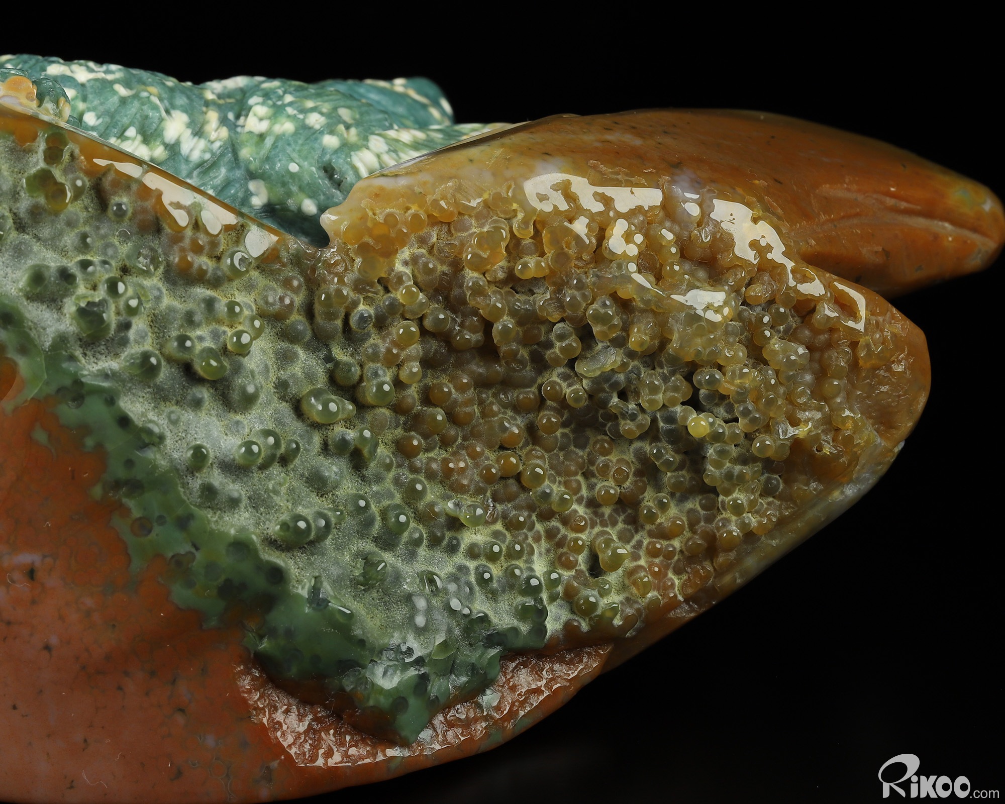 Another exceptional quality of Ocean Jasper is translucency. Many specimens are opaque and still very beautiful while others, when held in front of a strong light source, display what can only be described as another world! When viewed in front of a bright light the translucent, clear, or just foggy background illuminates and displays the contrasting solid perfect circles –the orbs- which then reveal exactly why Ocean Jasper is sometimes called "Fish Eye Jasper". These solid, soft looking spheres appear suspended in the illuminated quartz, and they can make one tempted to reach in and try to touch them!