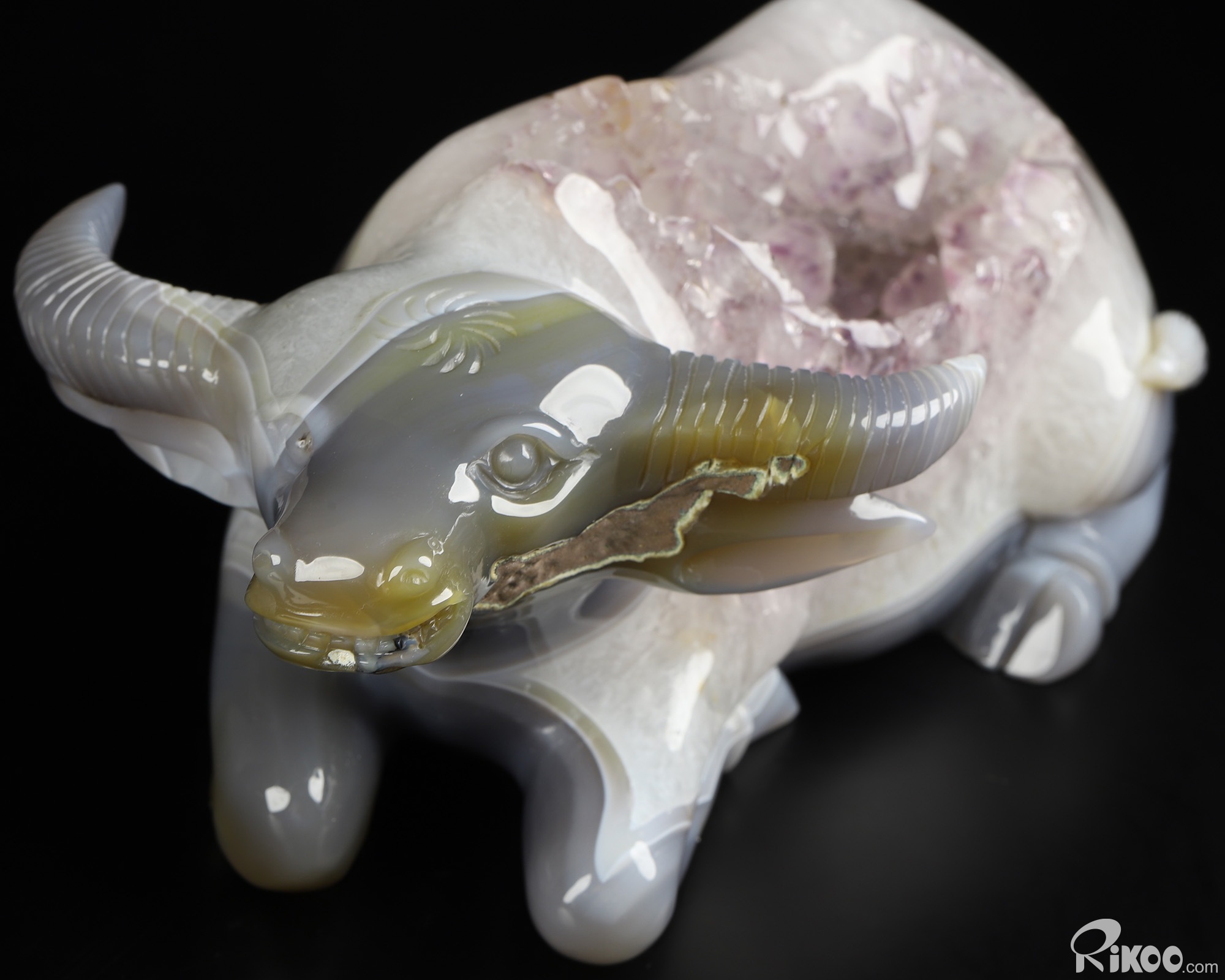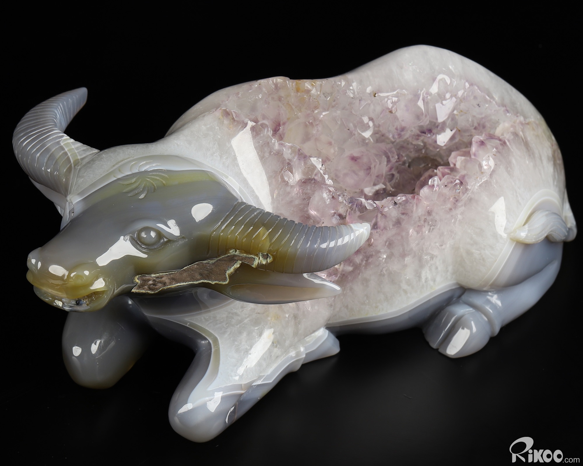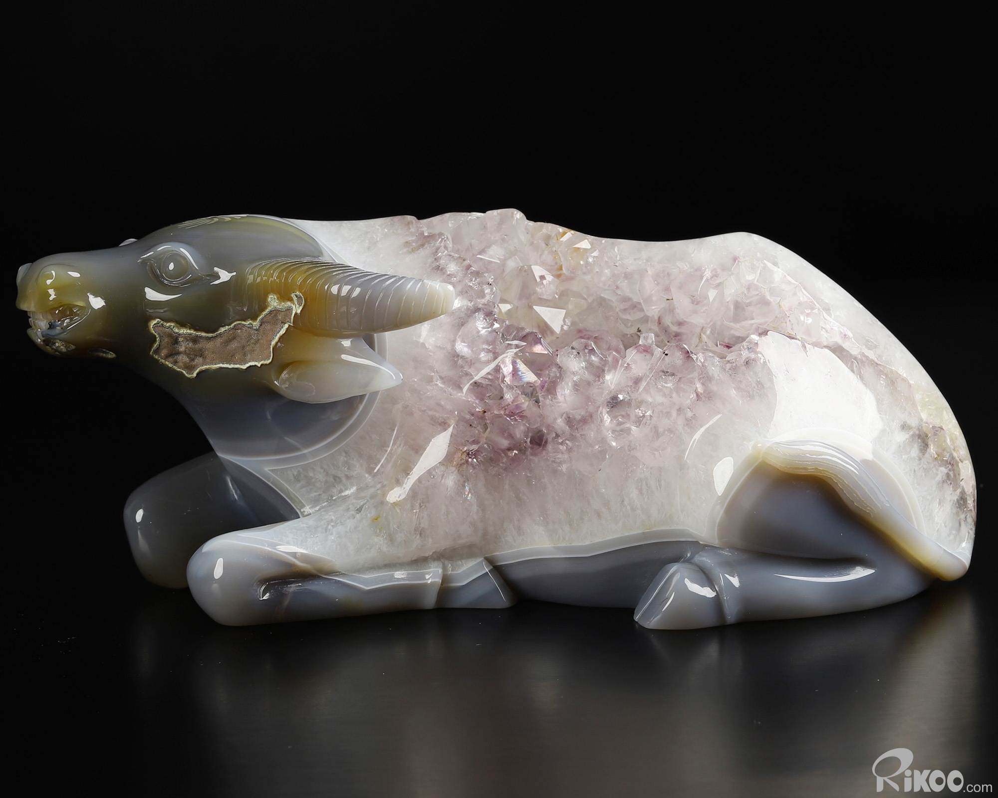 8.0" Agate Amethyst Druse Hand Carved Crystal Cattle Sculpture, Crystal Healing