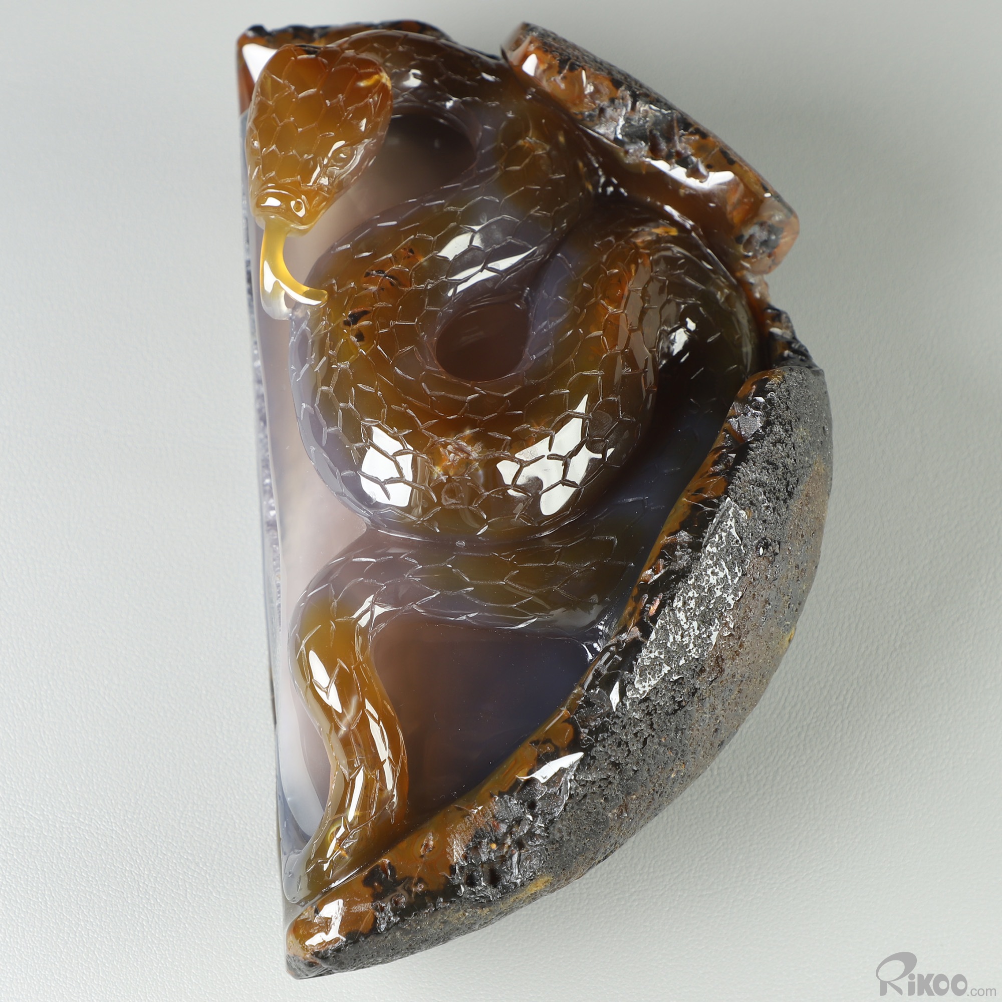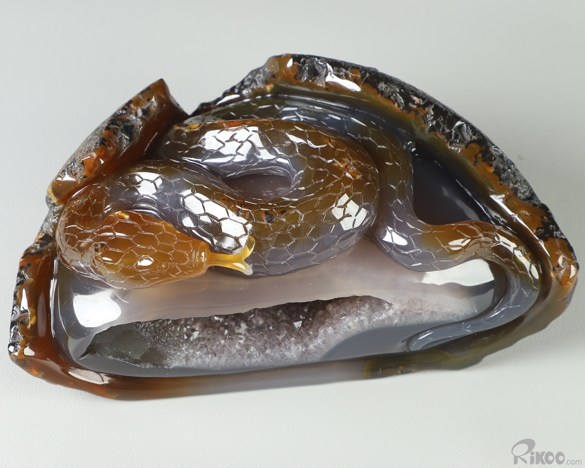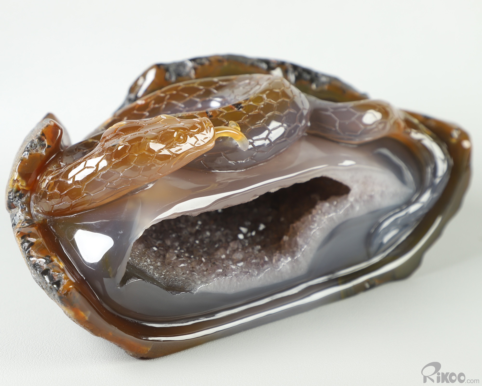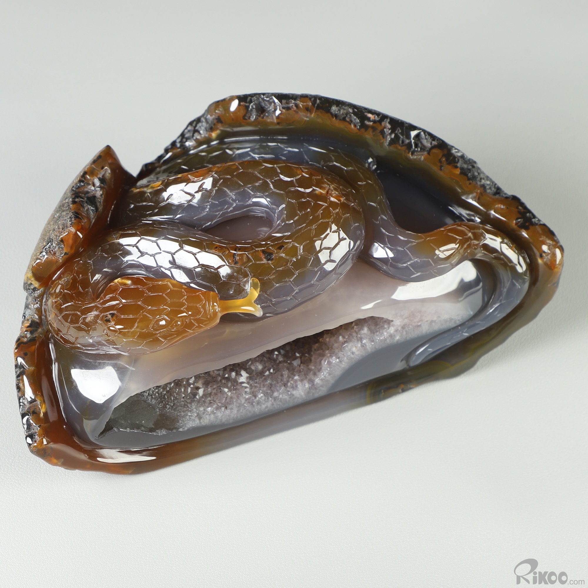 8.0" Agate Amethyst Geode Hand Carved Crystal Snake Sculpture, Crystal Healing
