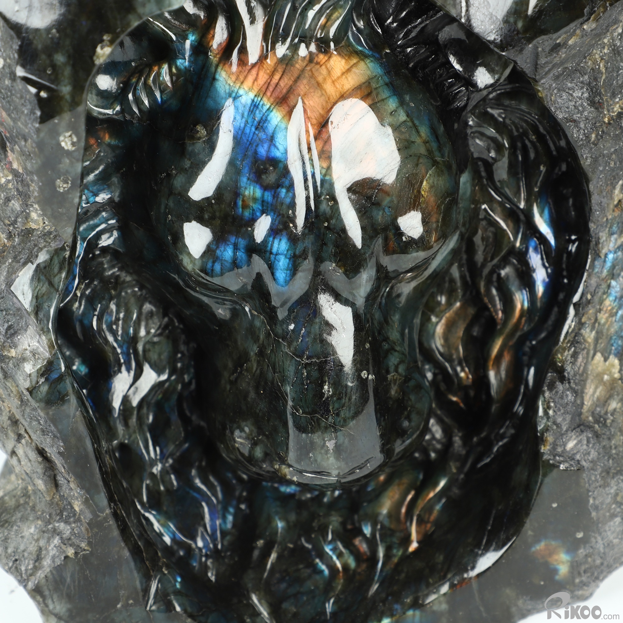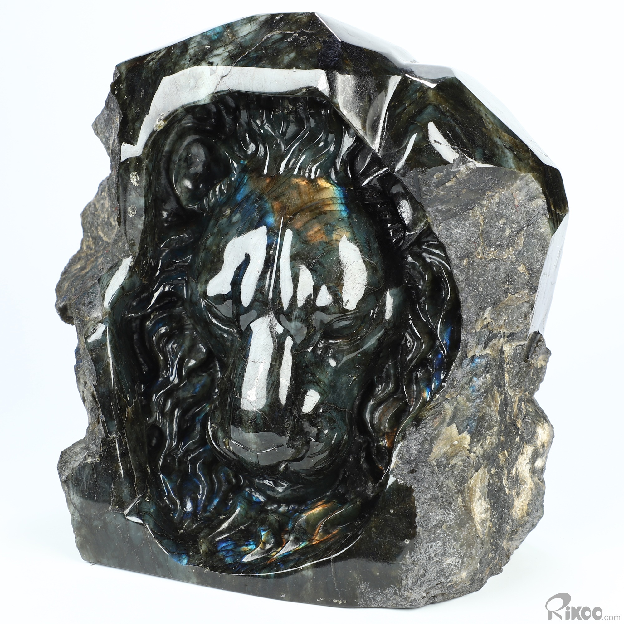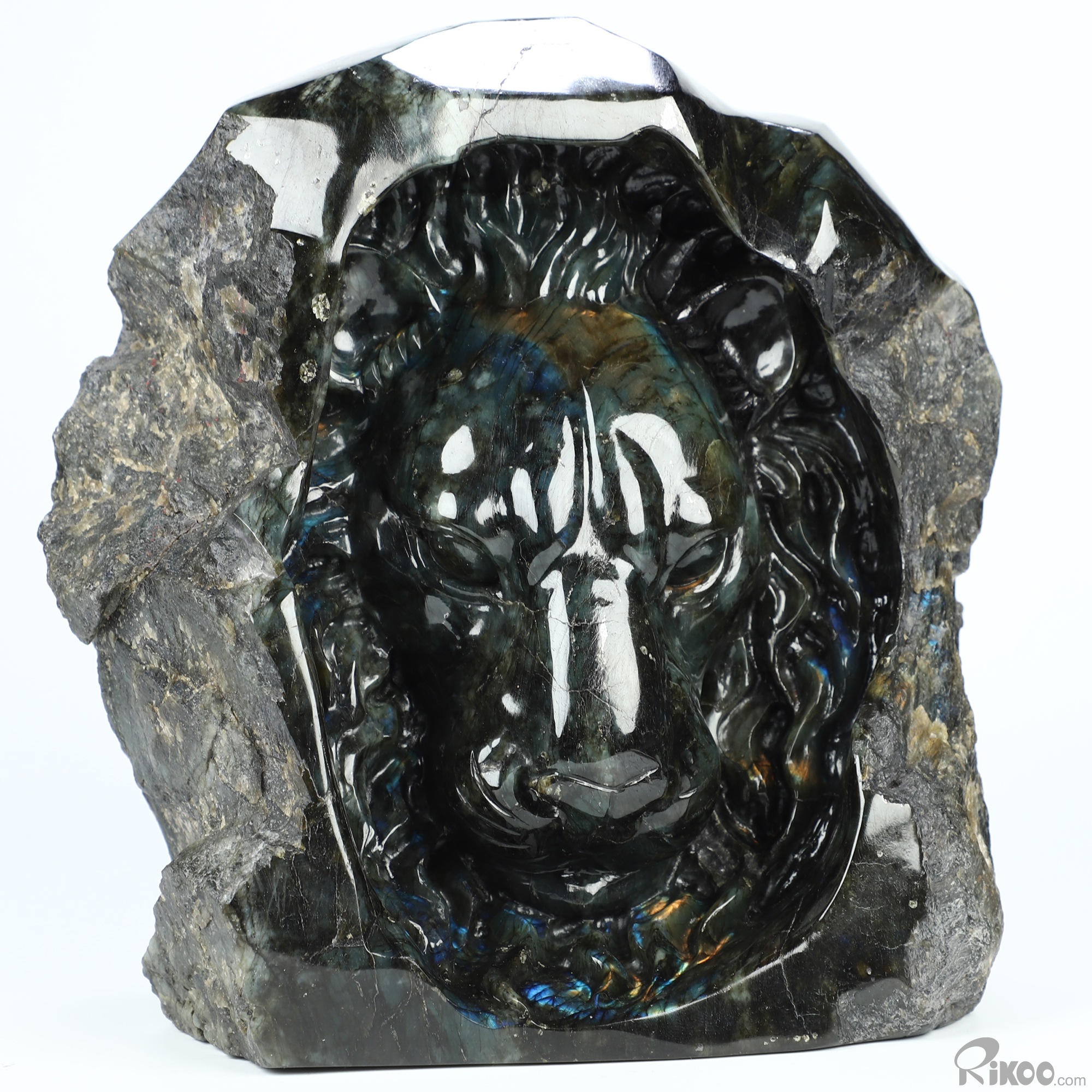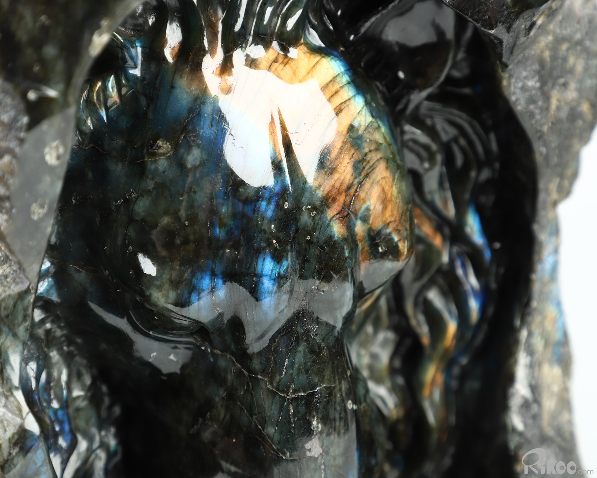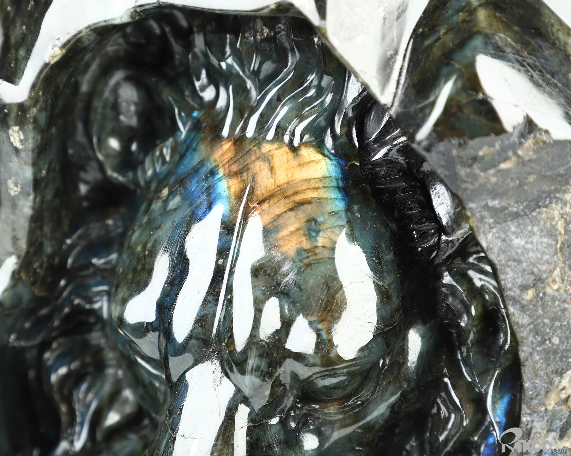 You are looking at a Labradorite sculpture. The sculpture is 8 inches long.