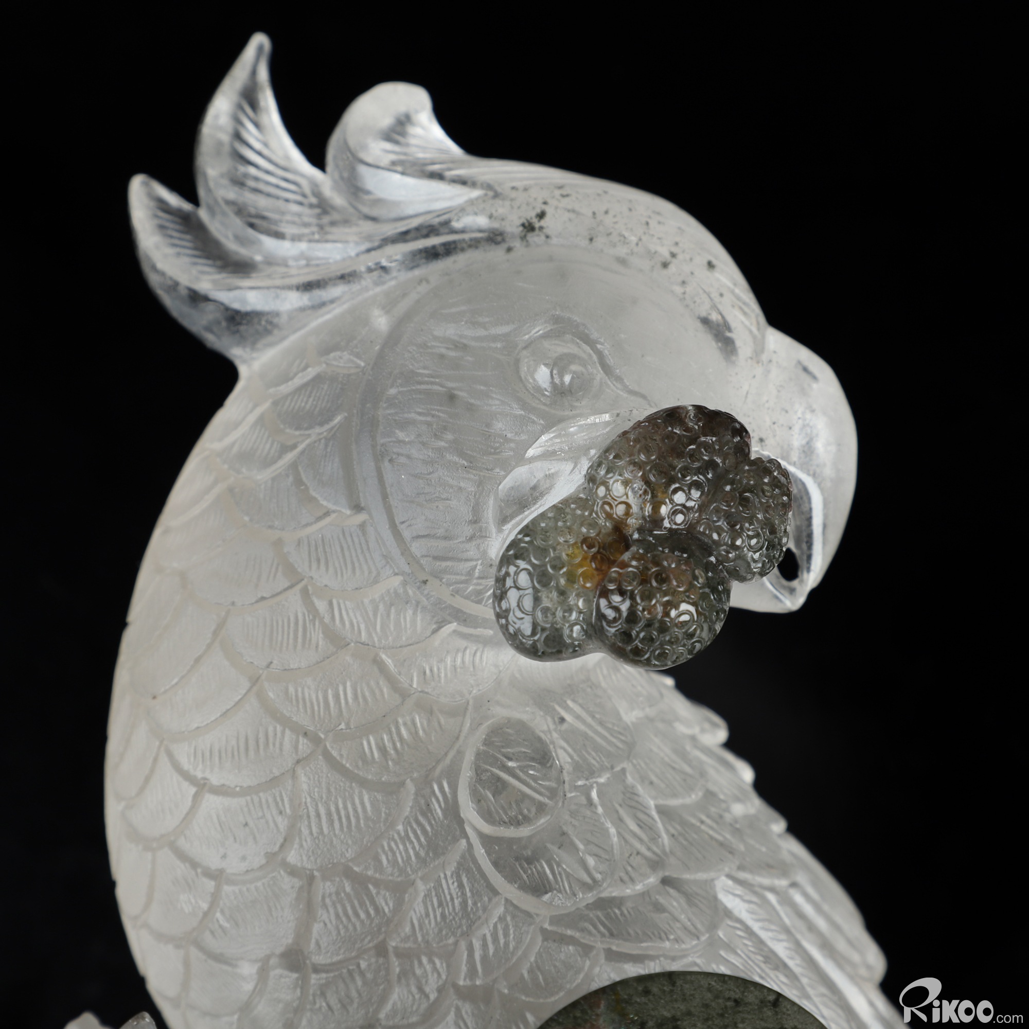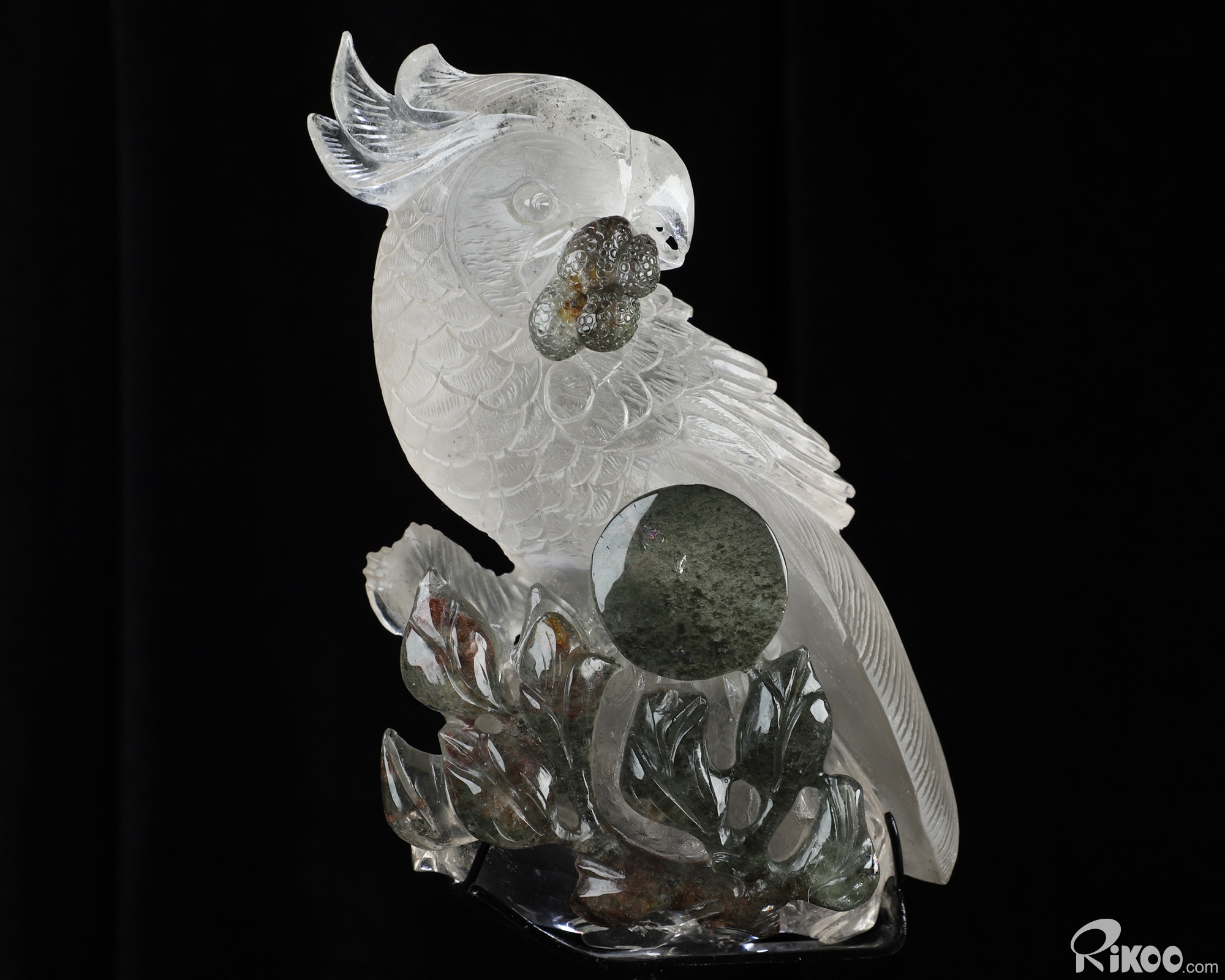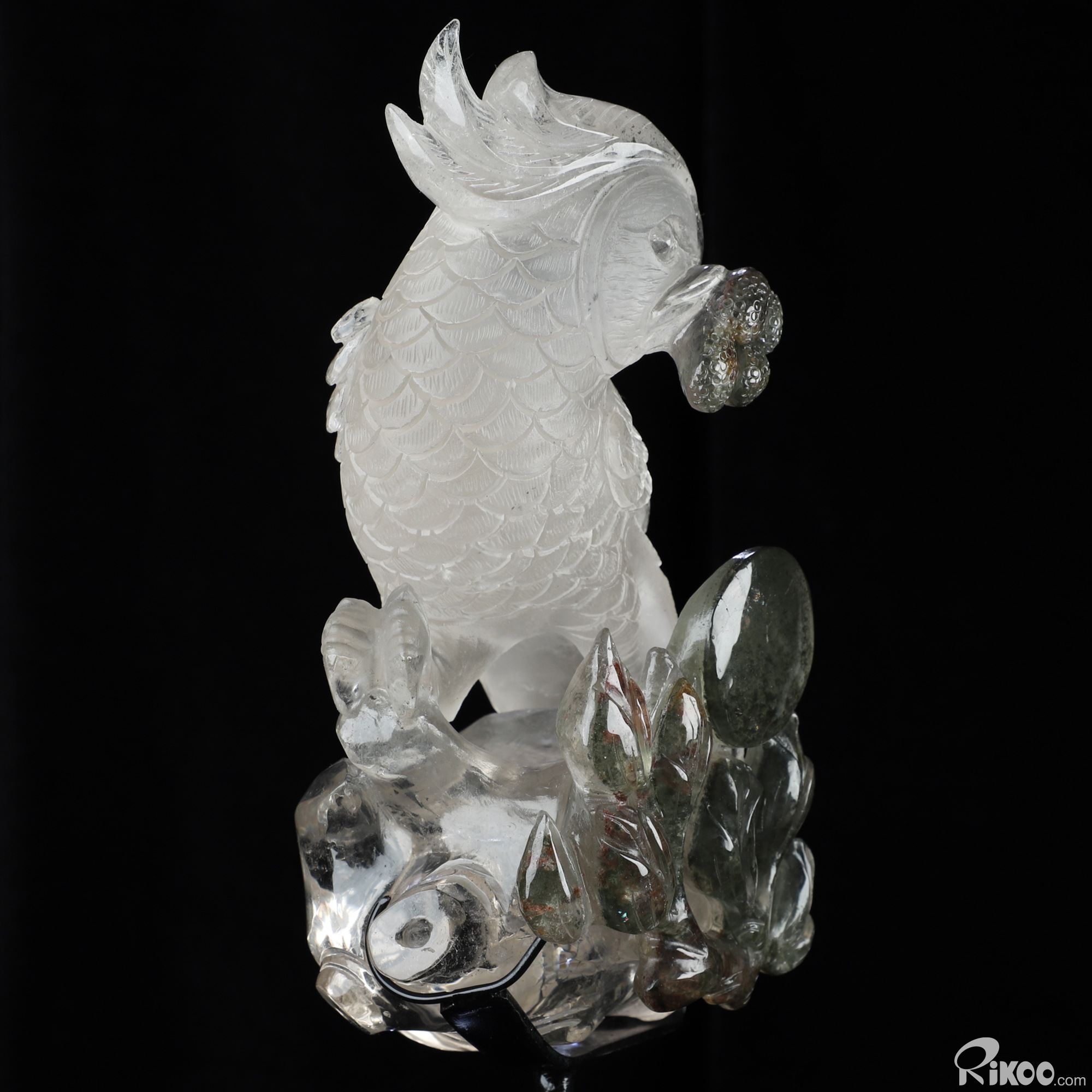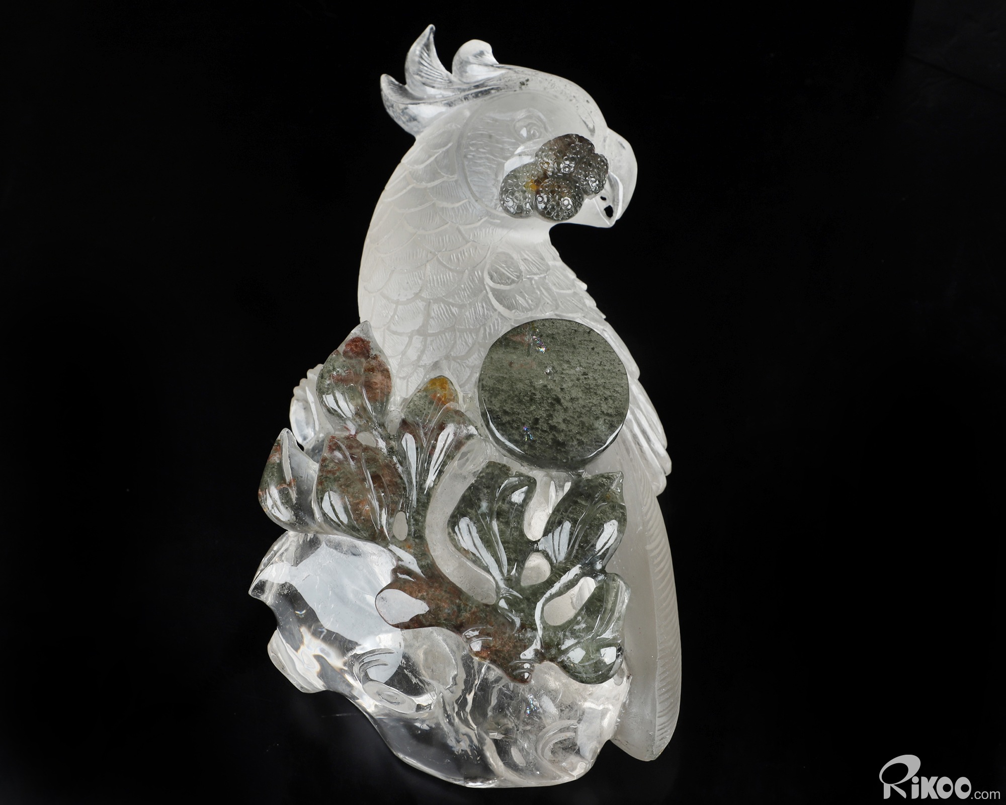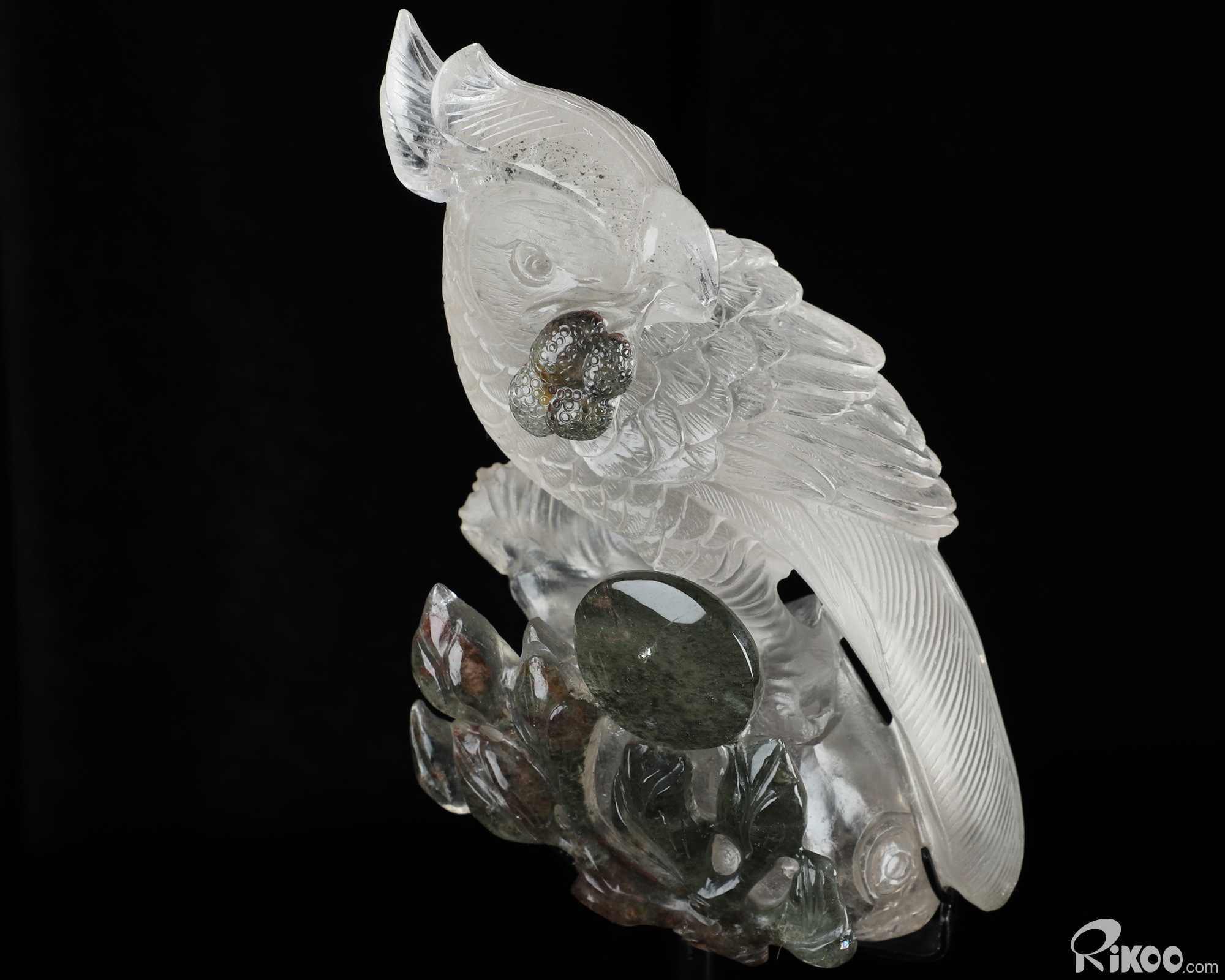 8.0" Phantom Quartz Rock Crystal Hand Carved Crystal Parrot & Black Obsidian Stand Sculpture, Crystal Healing