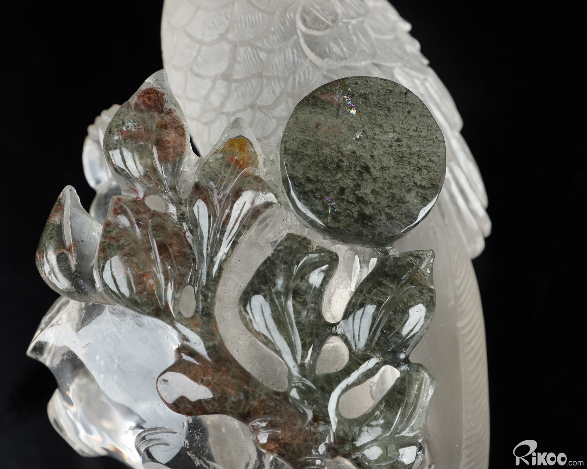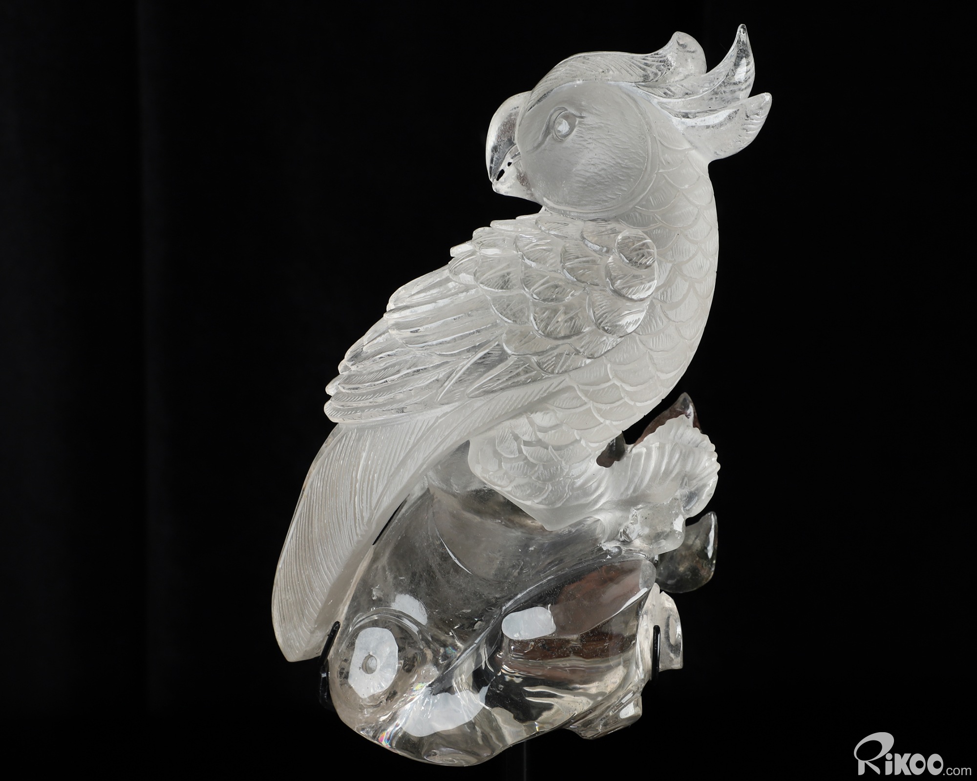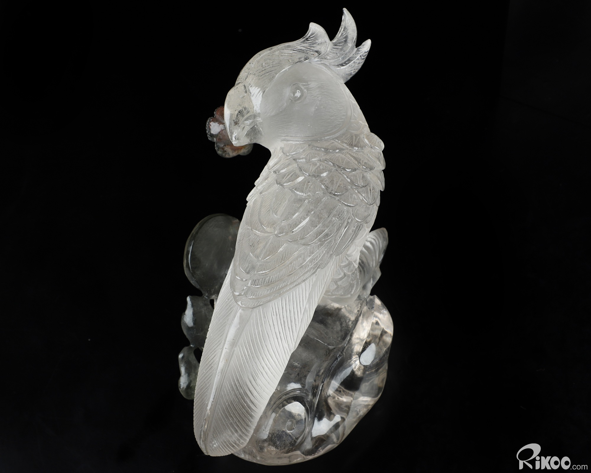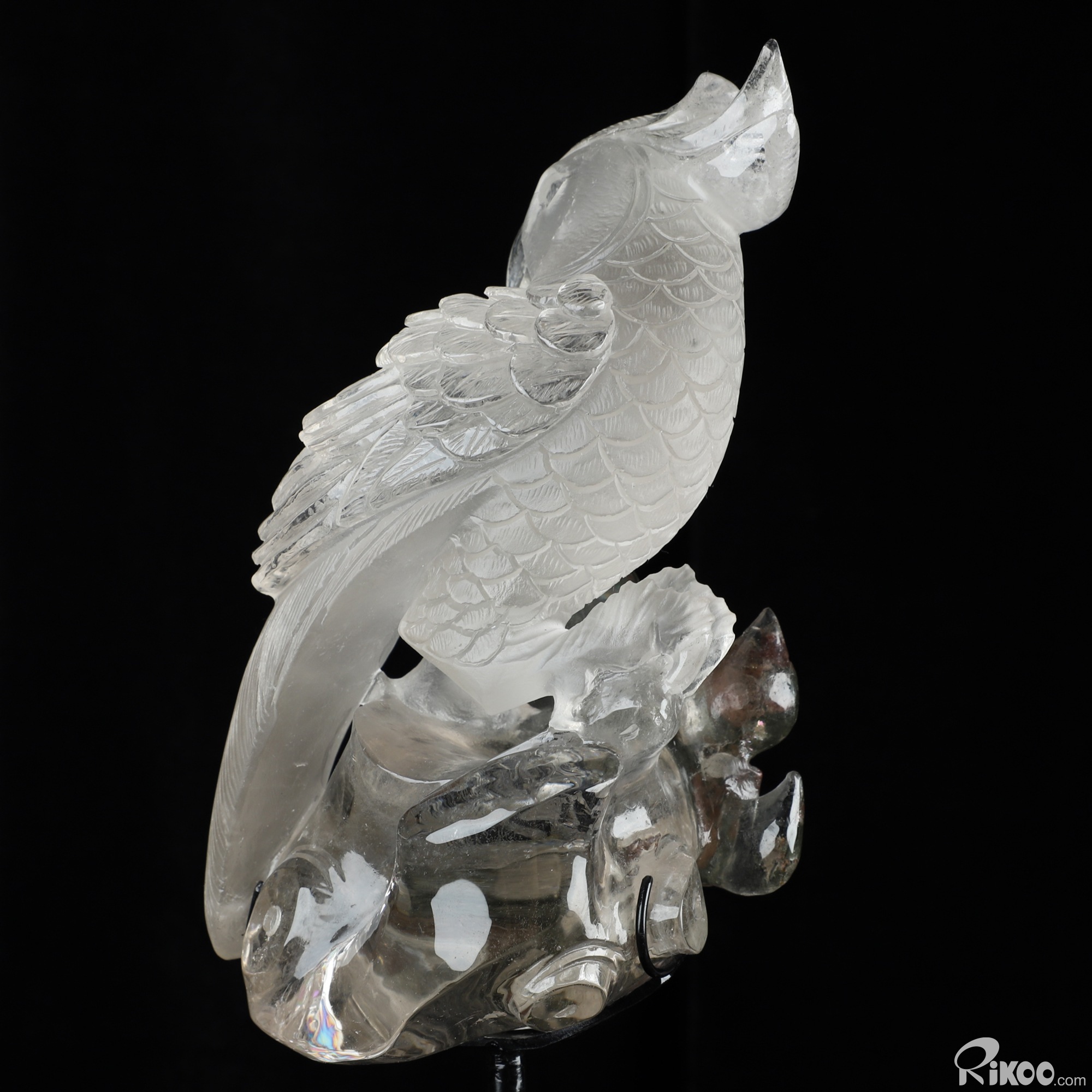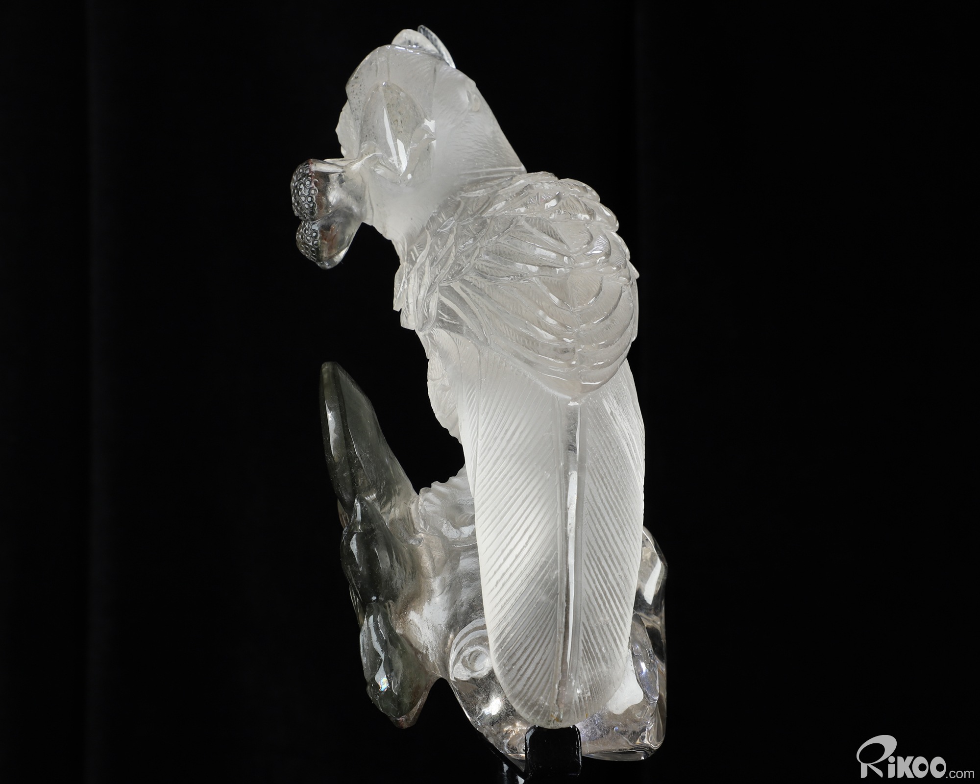 8.0" Phantom Quartz Rock Crystal Hand Carved Crystal Parrot & Black Obsidian Stand Sculpture, Crystal Healing