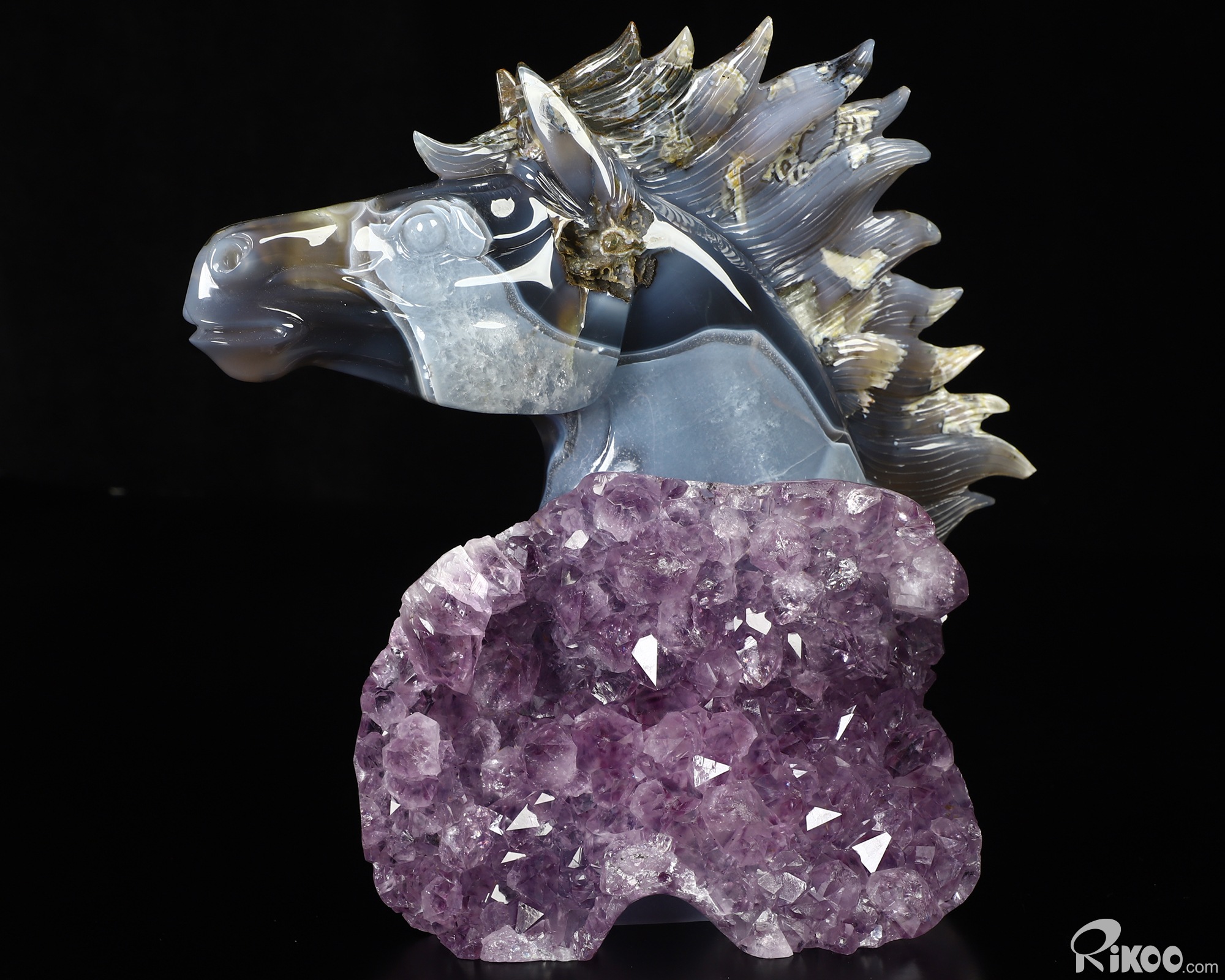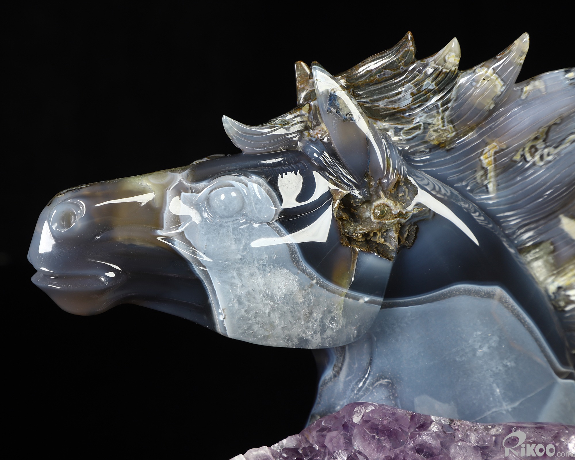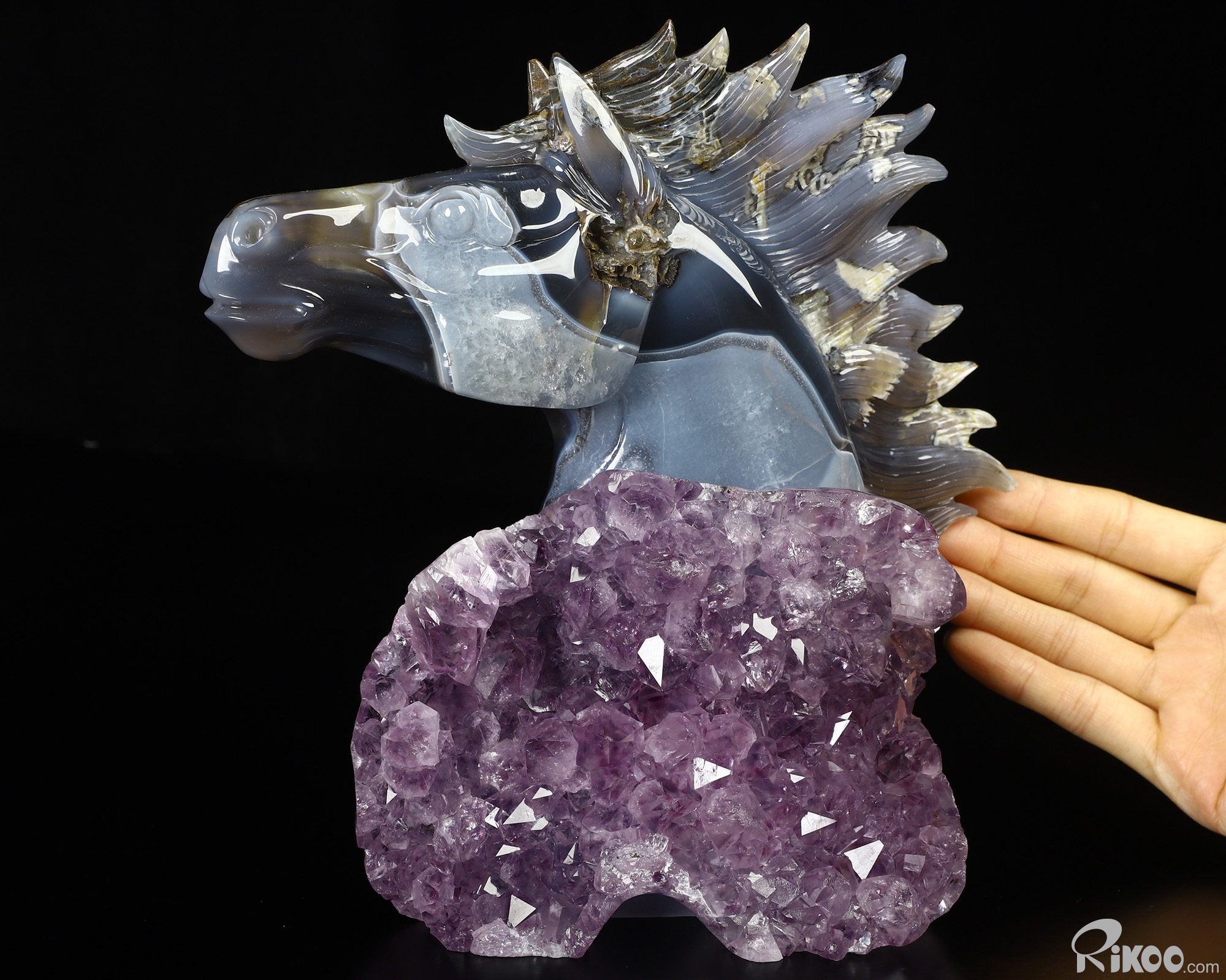 8.1" Agate Amethyst Geode Hand Carved Crystal Horse Sculpture, Crystal Healing