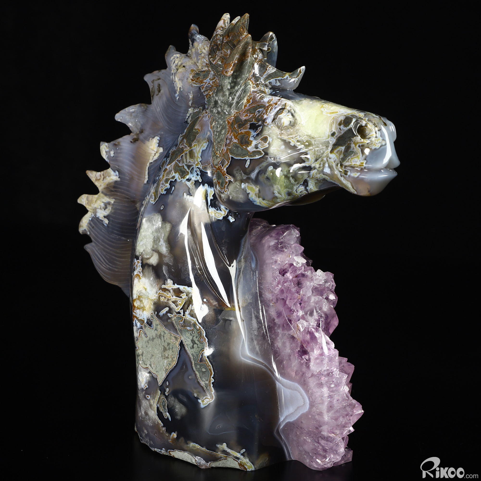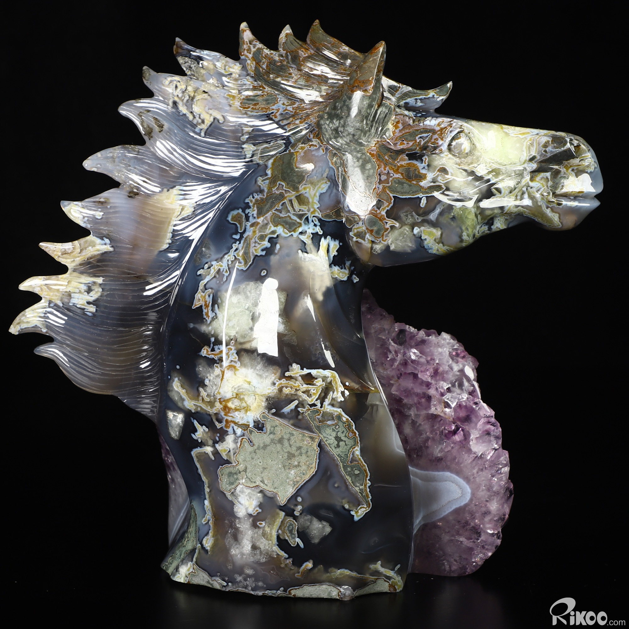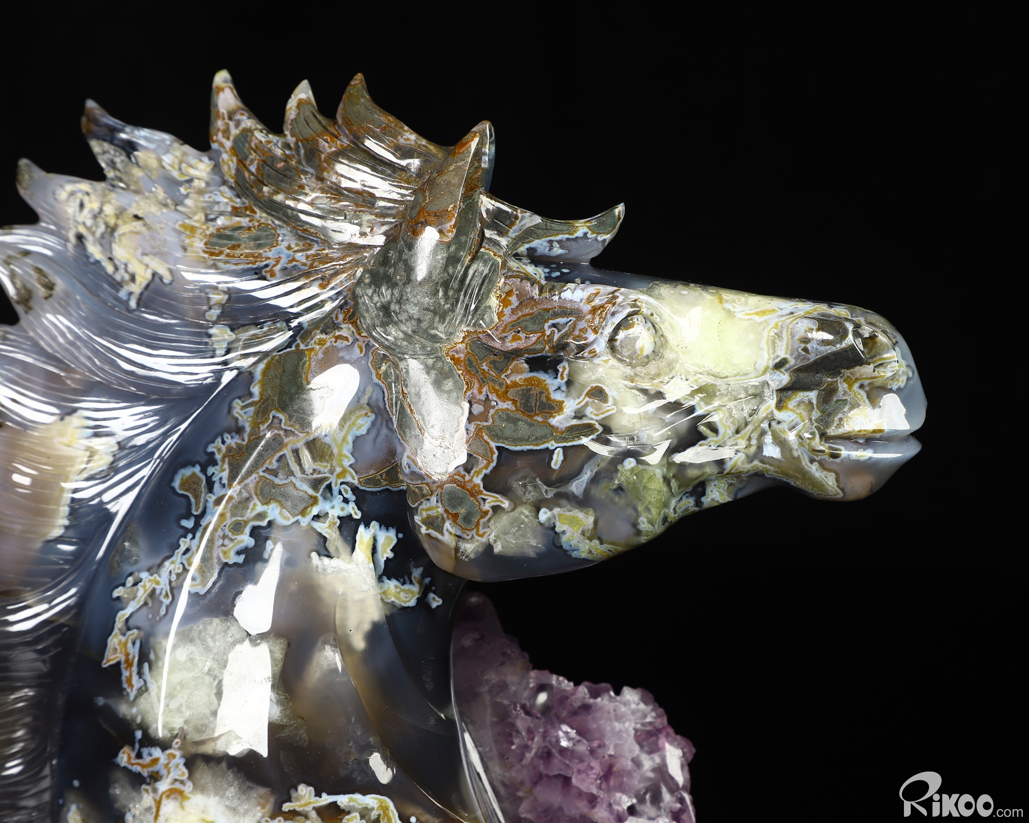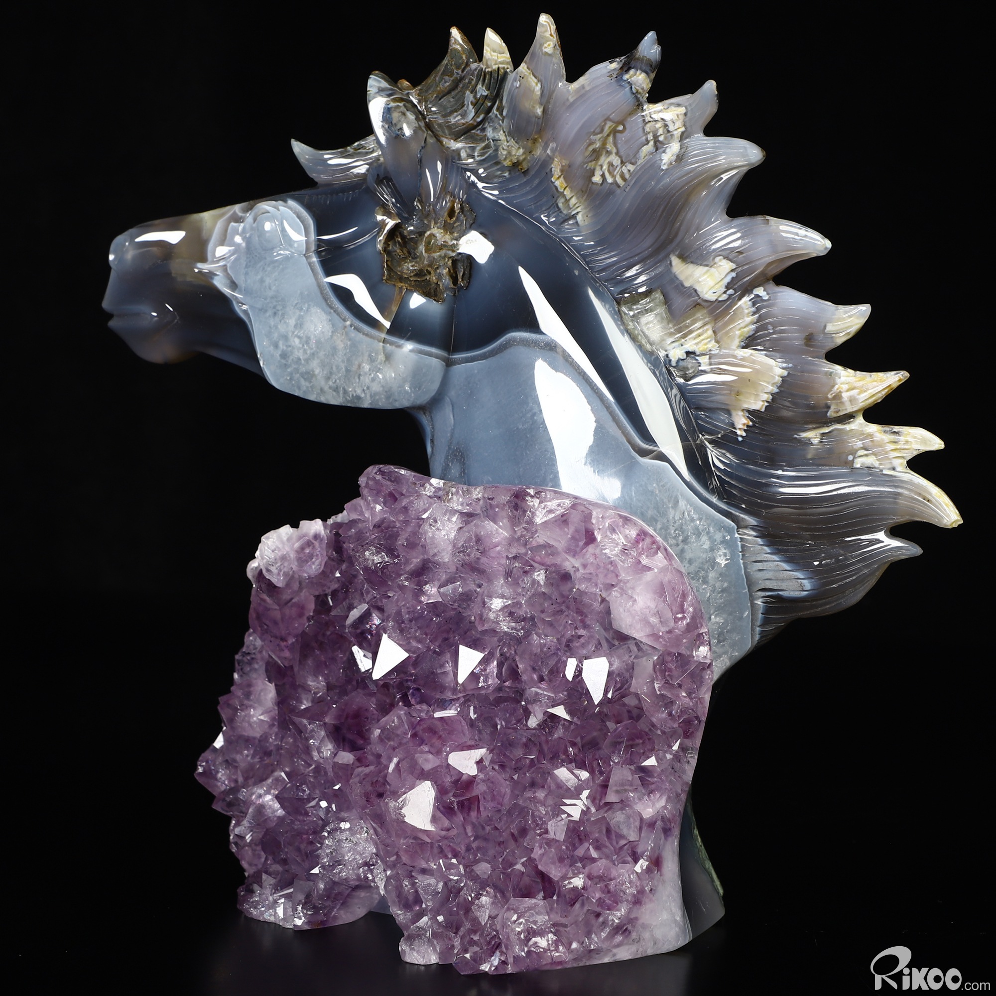 8.1" Agate Amethyst Geode Hand Carved Crystal Horse Sculpture, Crystal Healing