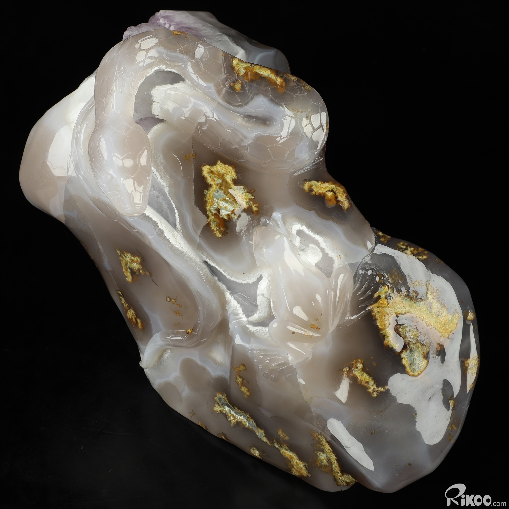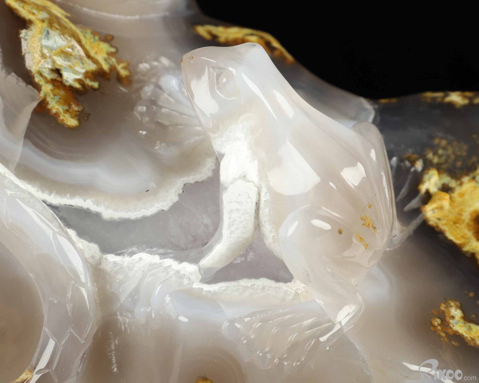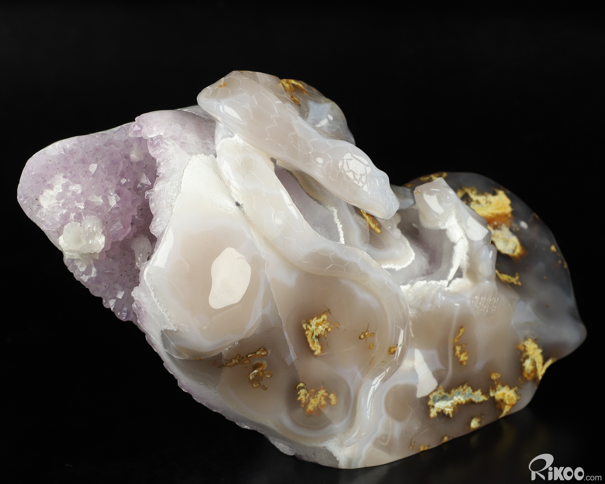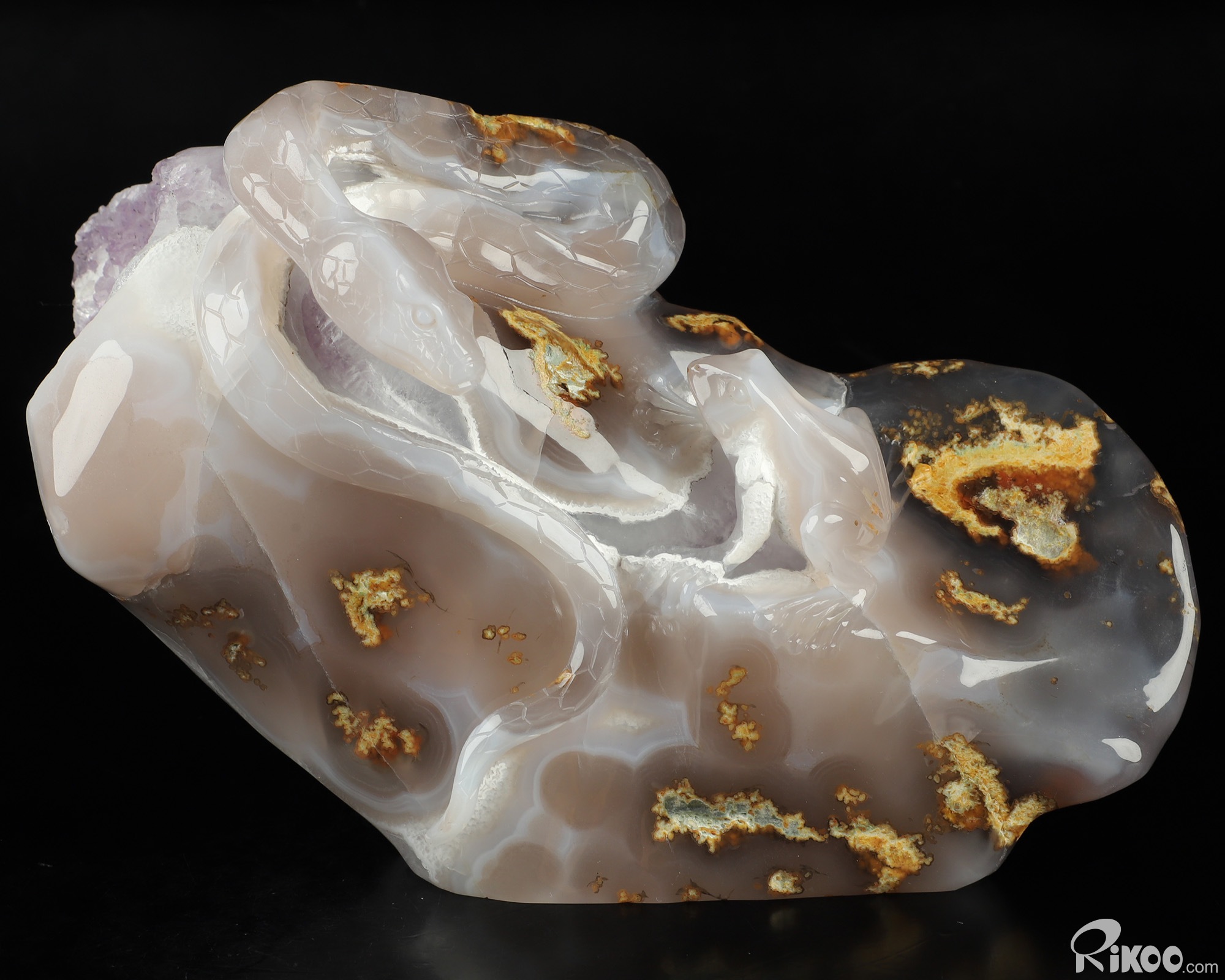 8.1" Agate Amethyst Geode Hand Carved Crystal Snake and Frog Sculpture, Crystal Healing