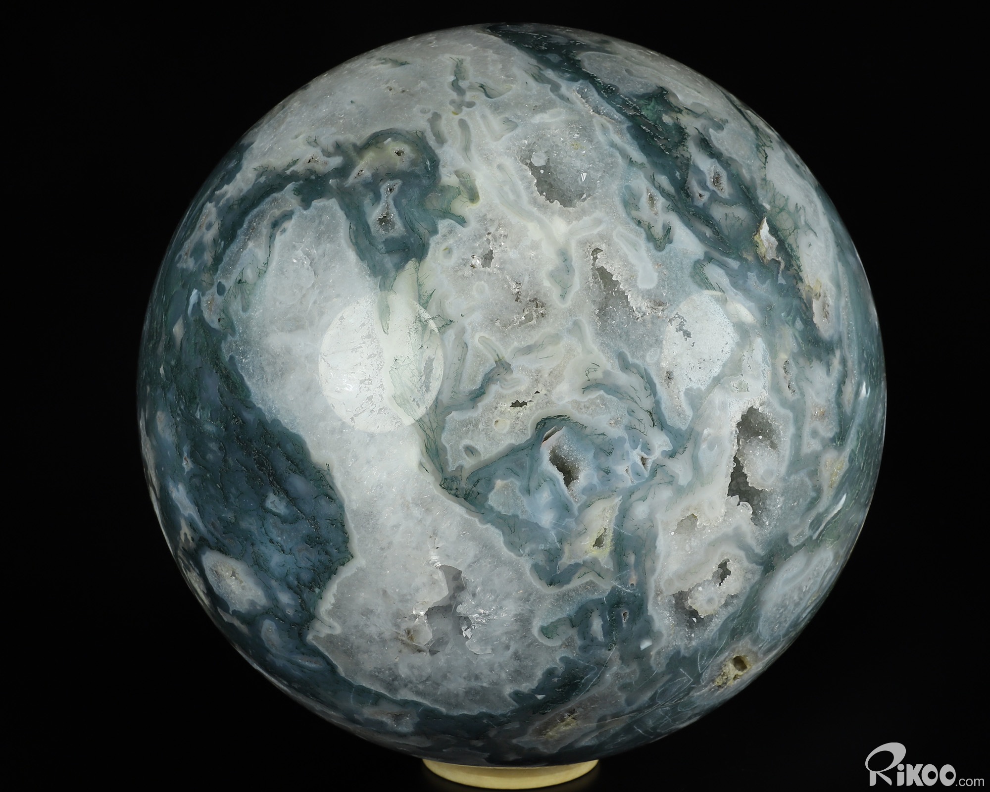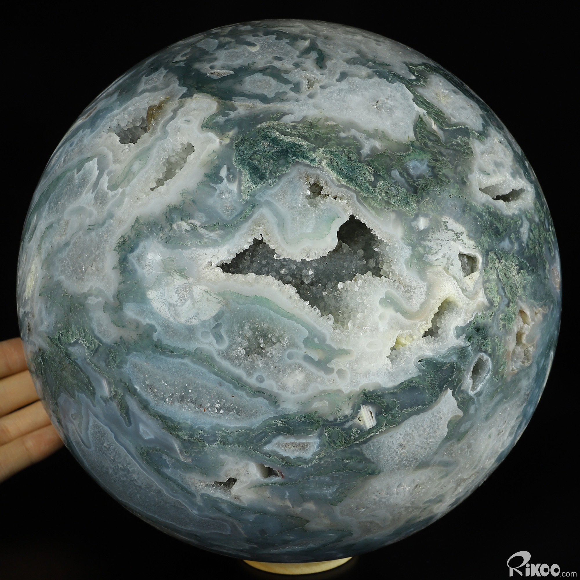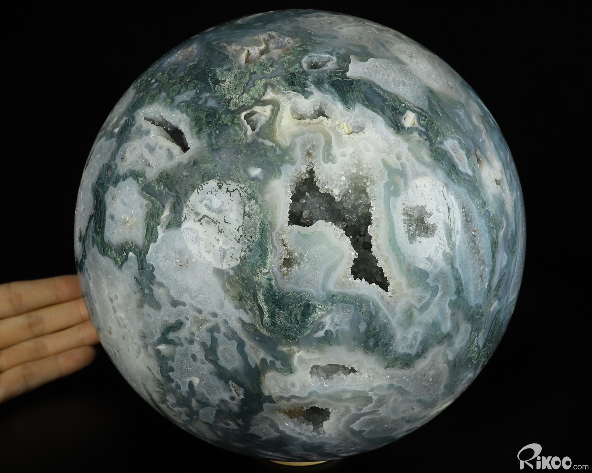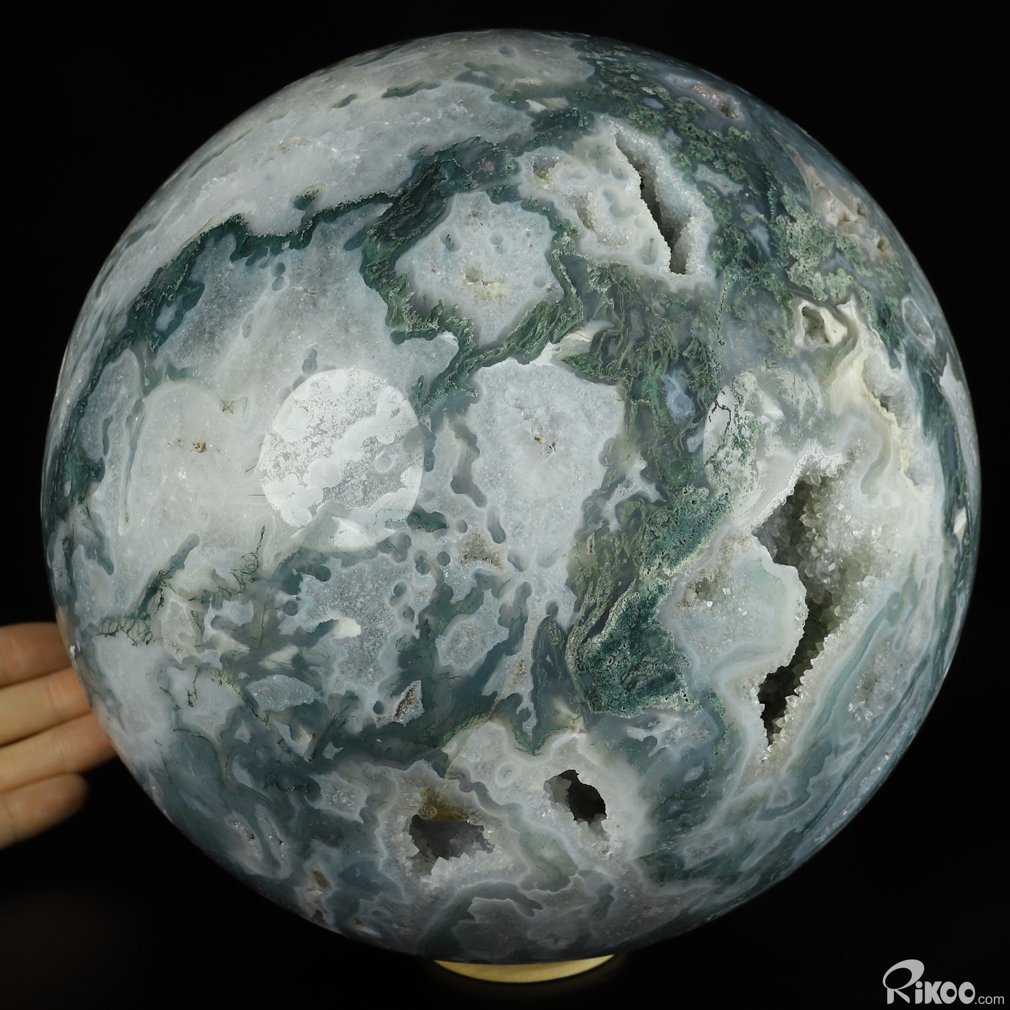 You are looking at a Green Moss Agate Ball. The Ball is 8.1 inches long from front to back.