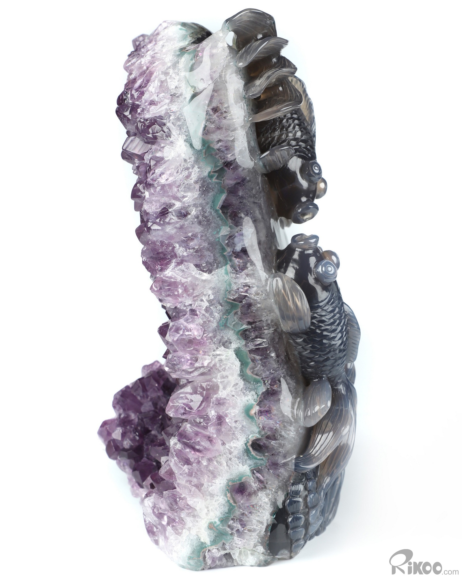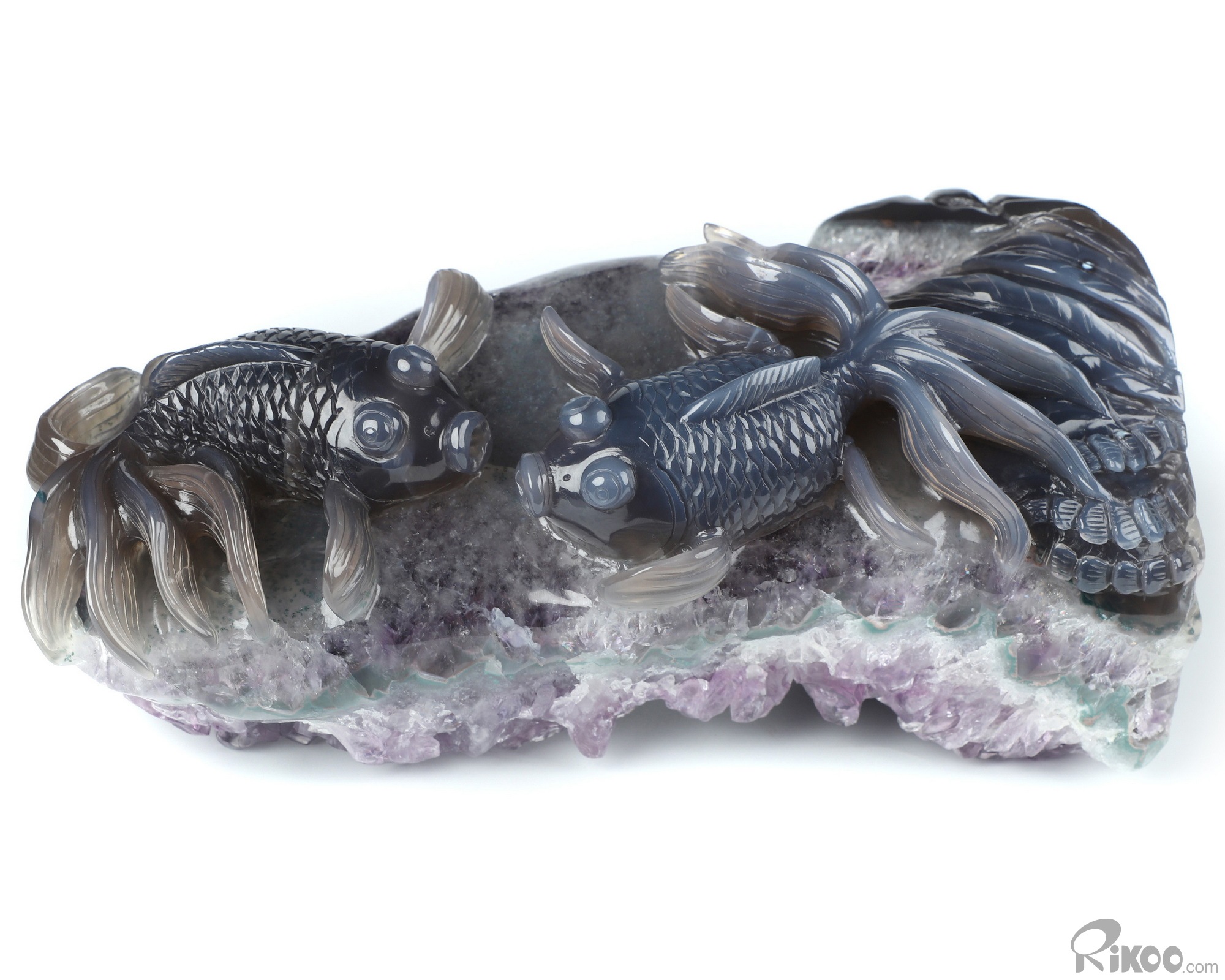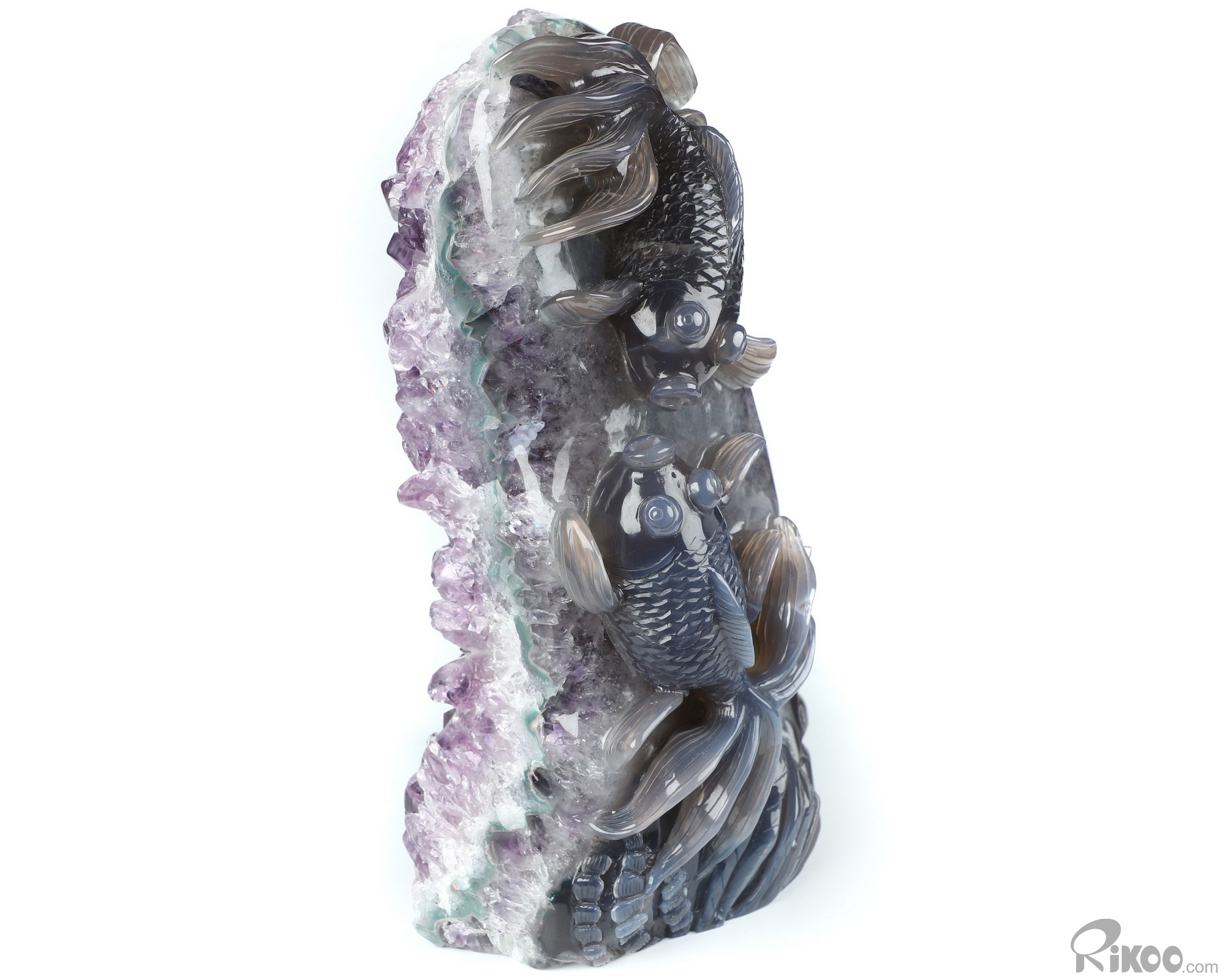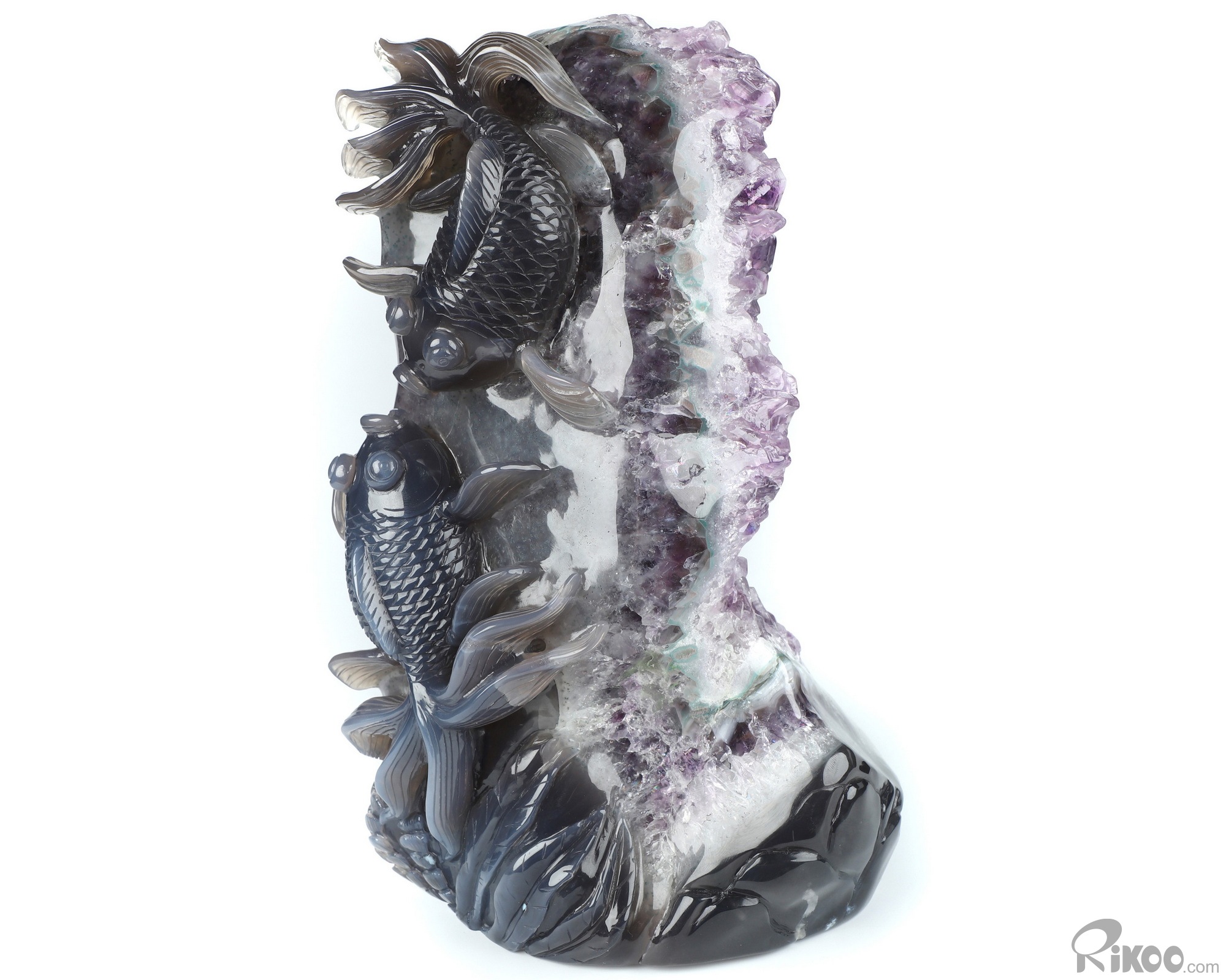 8.3" Agate Amethyst Geode Hand Carved Crystal Carp Sculpture, Crystal Healing
