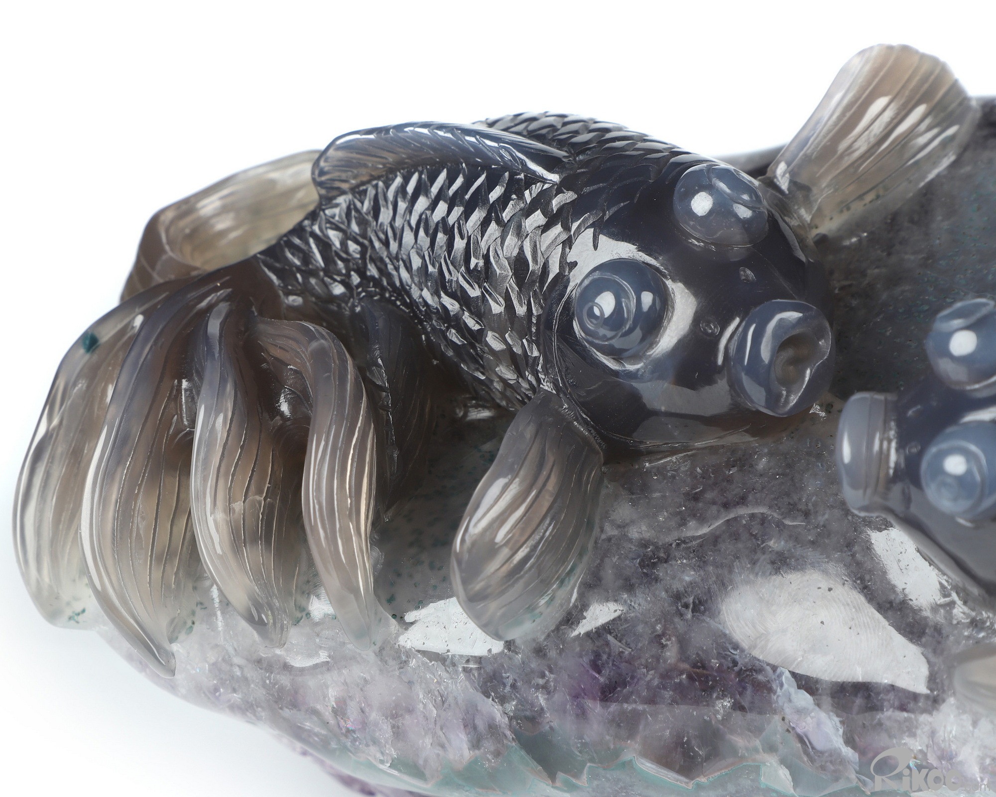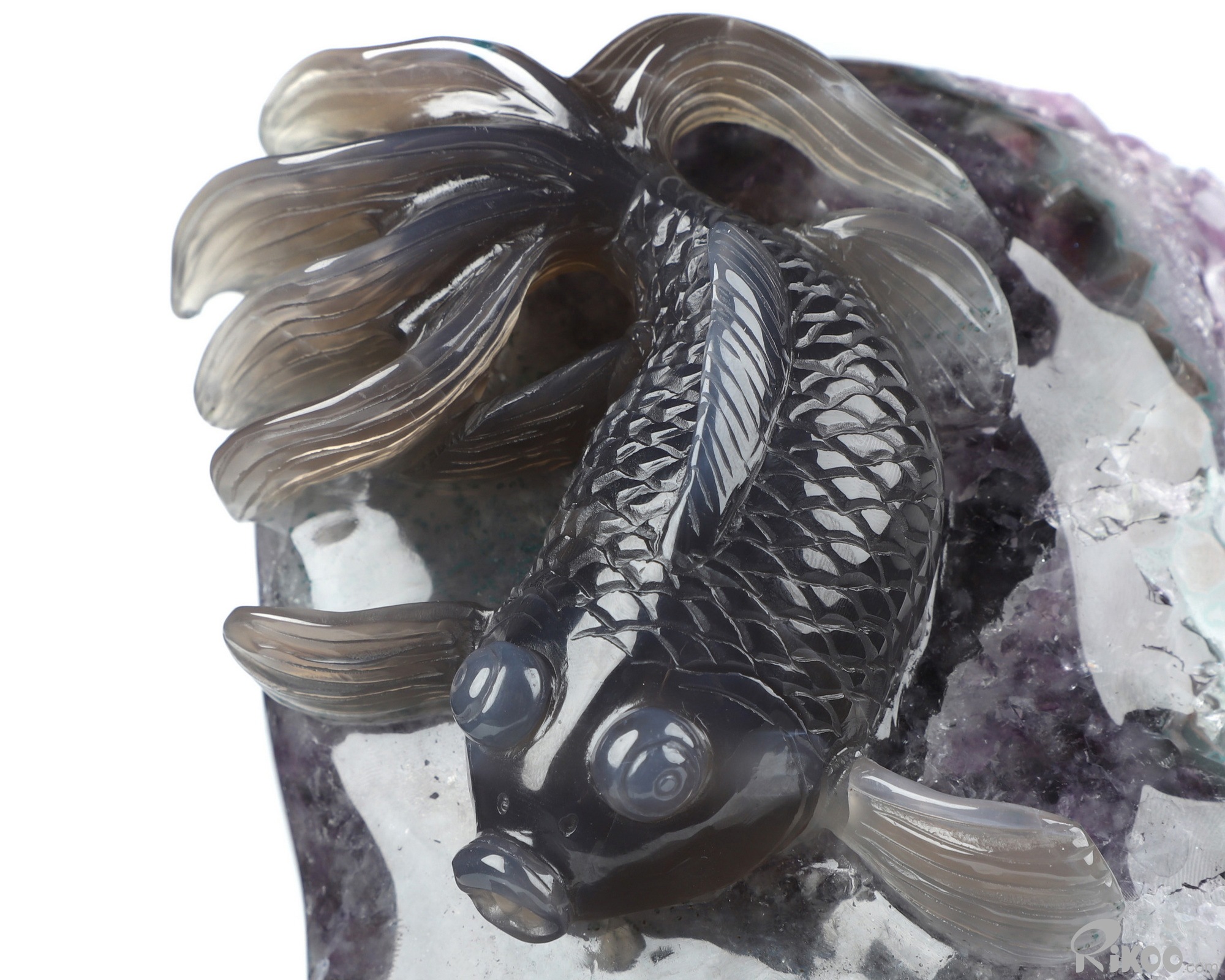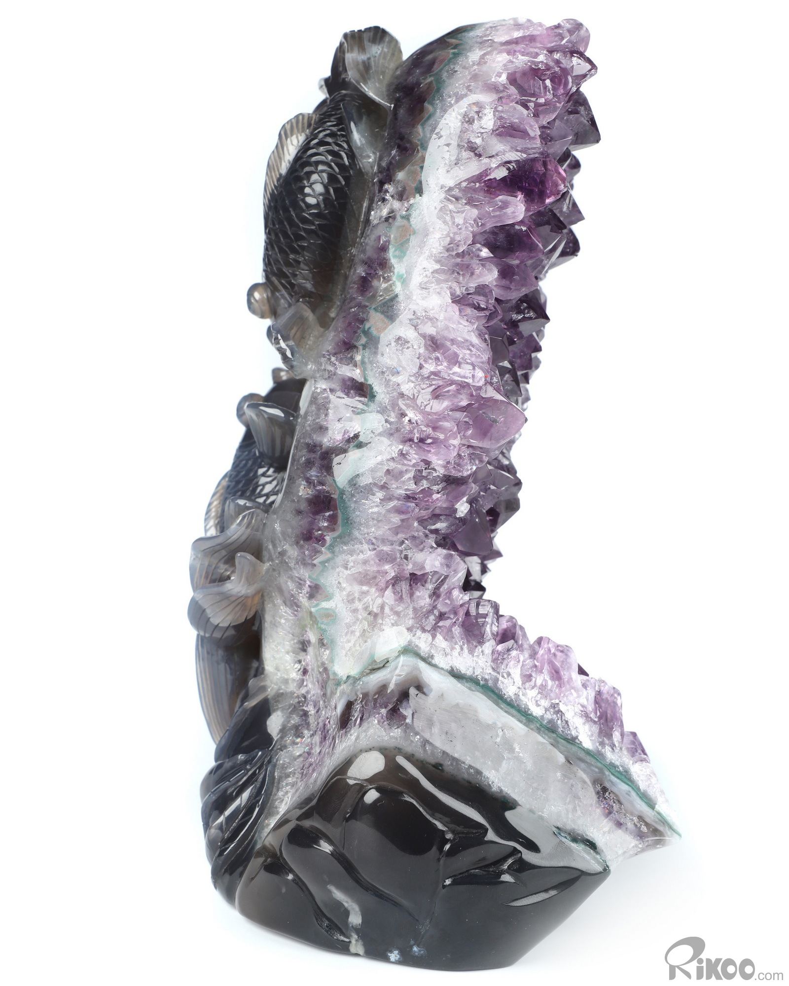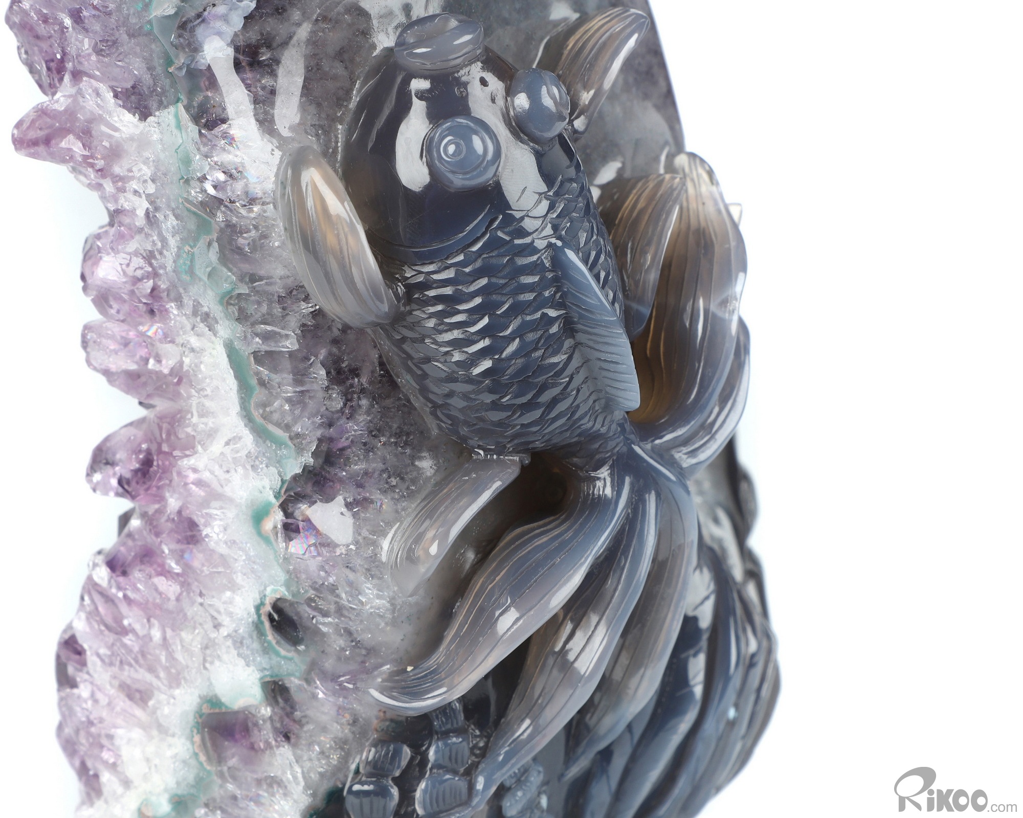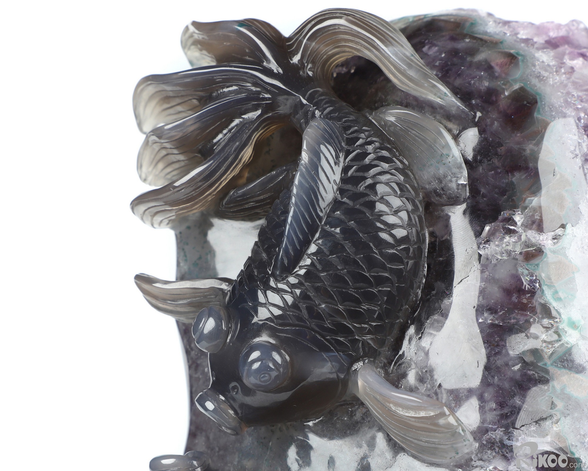 8.3" Agate Amethyst Geode Hand Carved Crystal Carp Sculpture, Crystal Healing