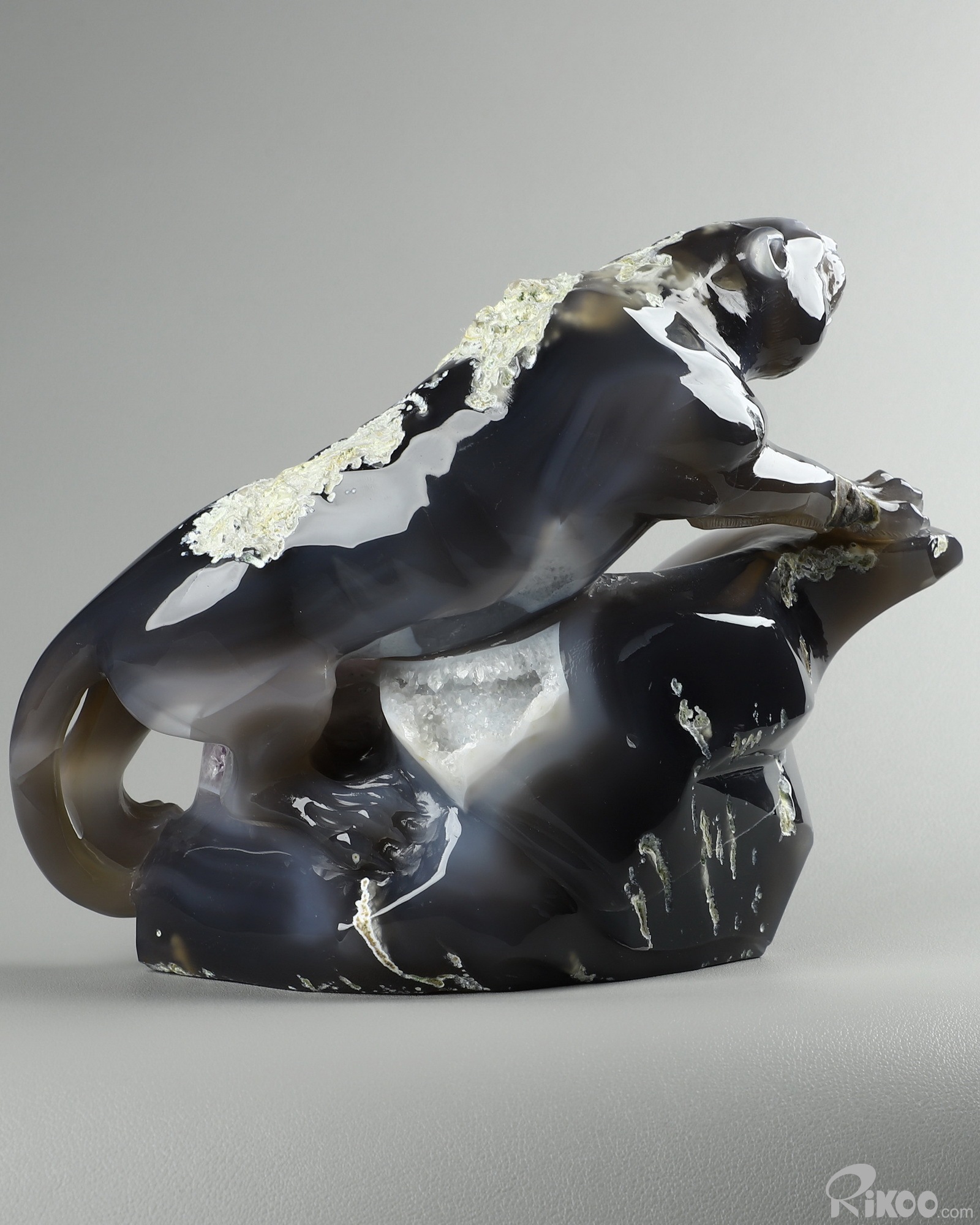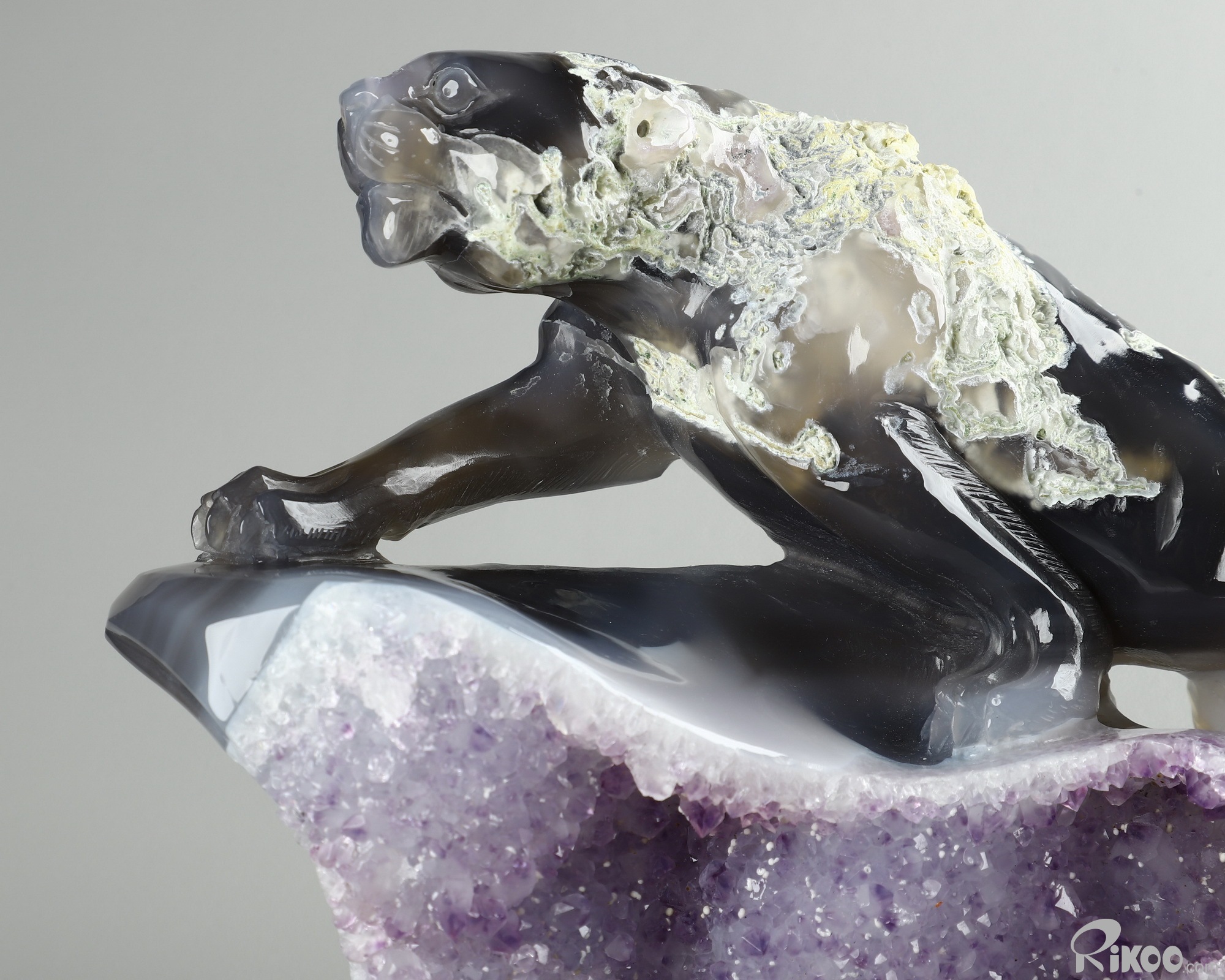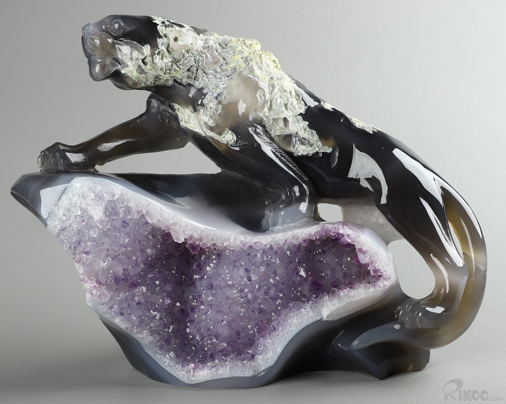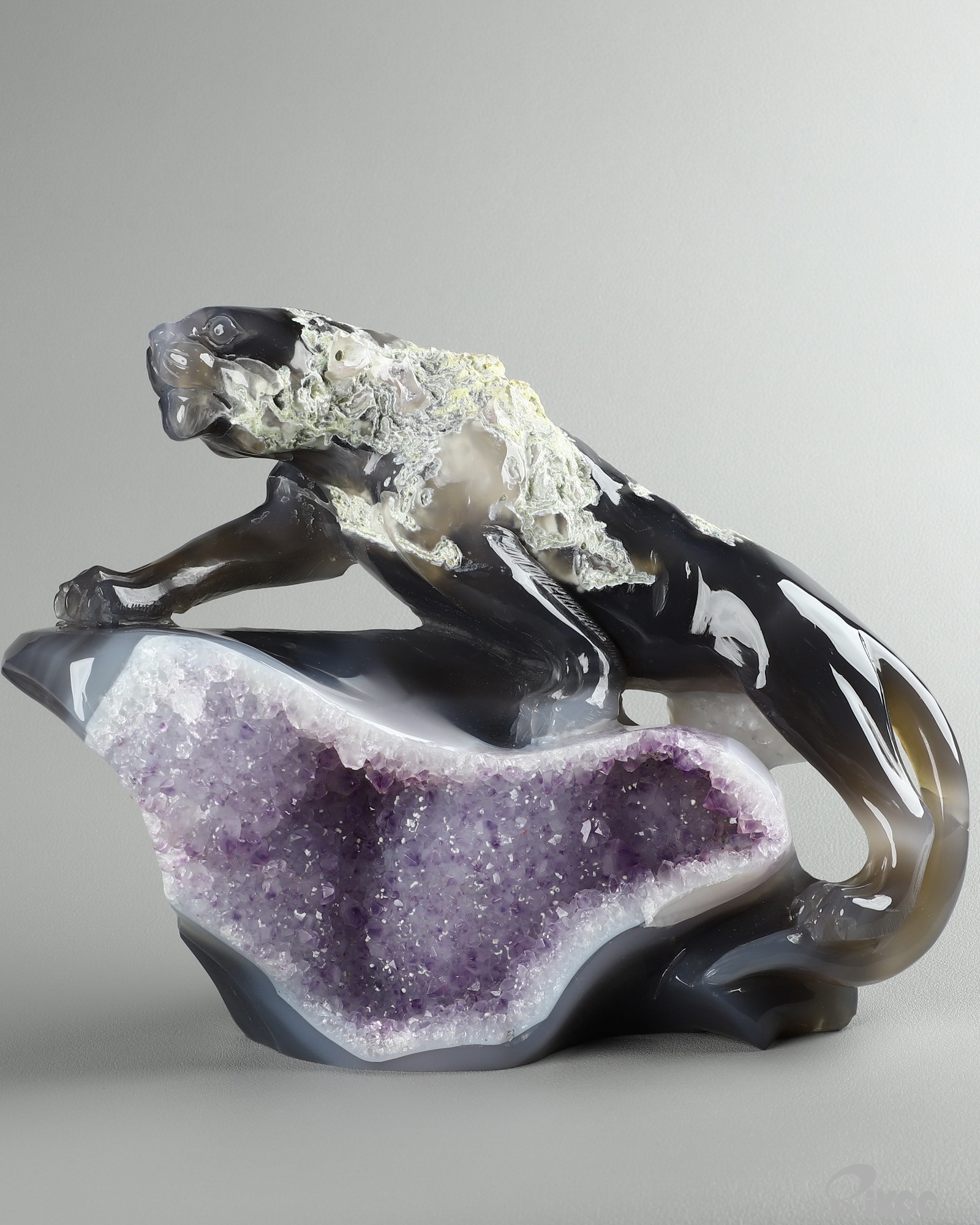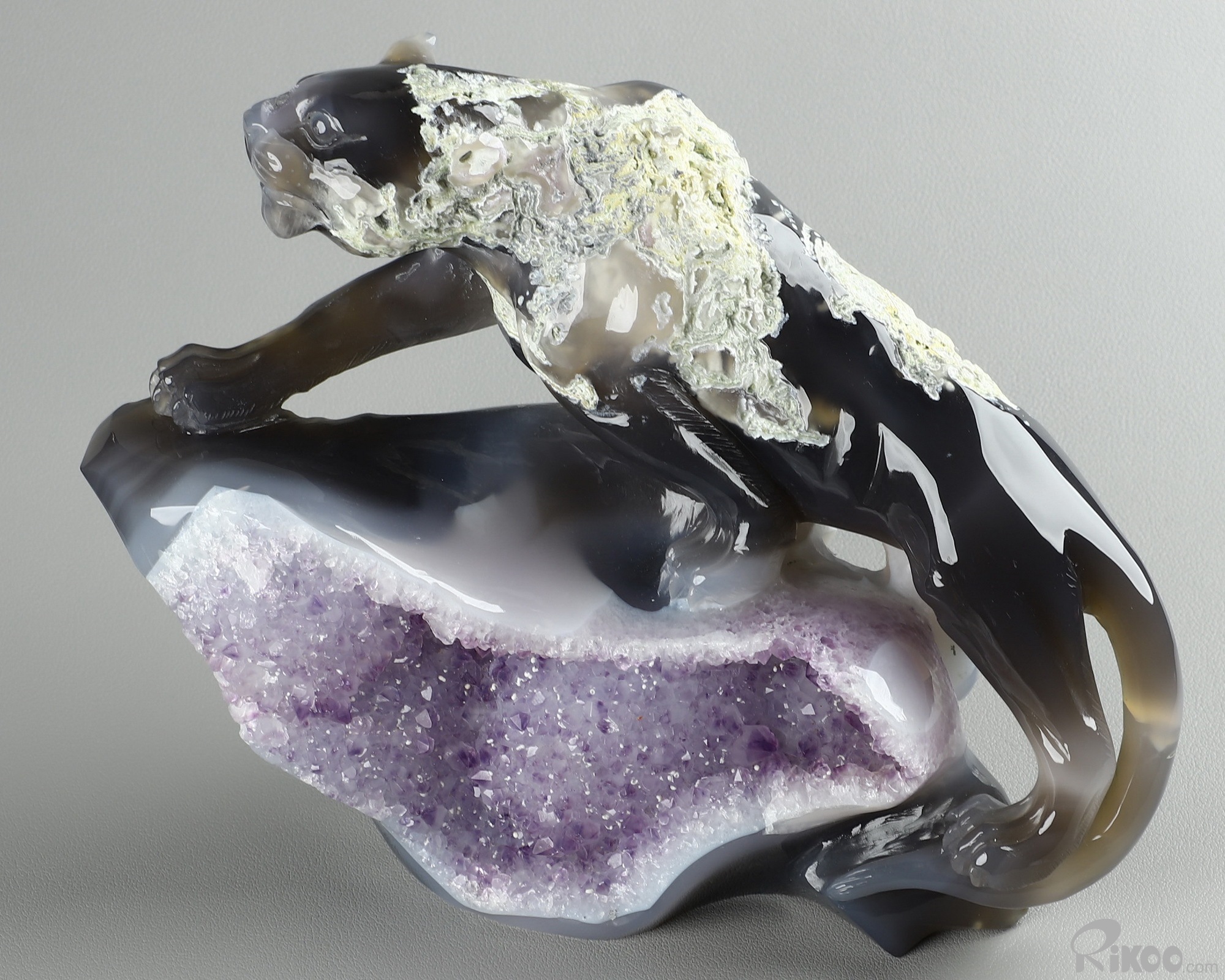 8.3" Agate Amethyst Geode Hand Carved Crystal Leopard Sculpture, Crystal Healing