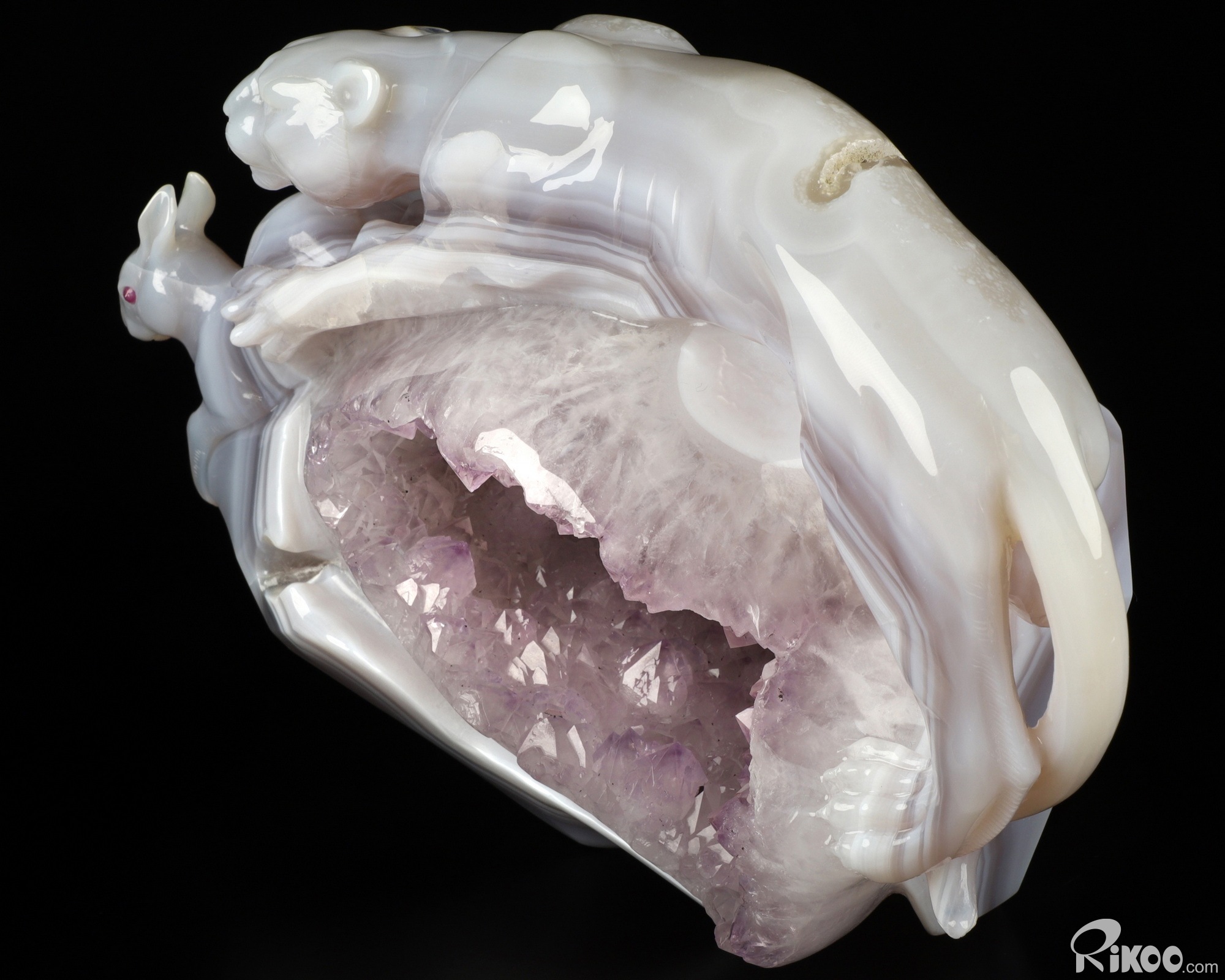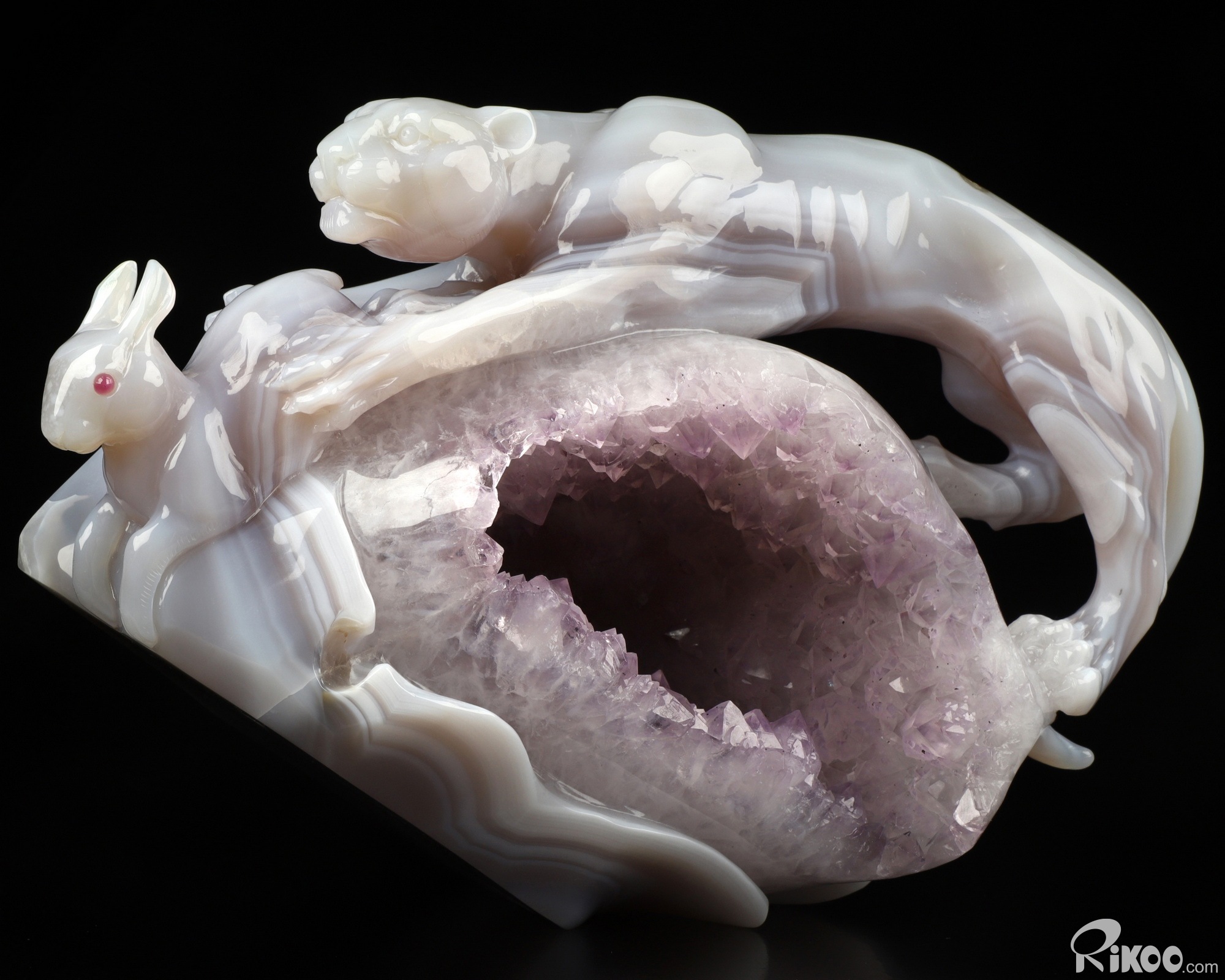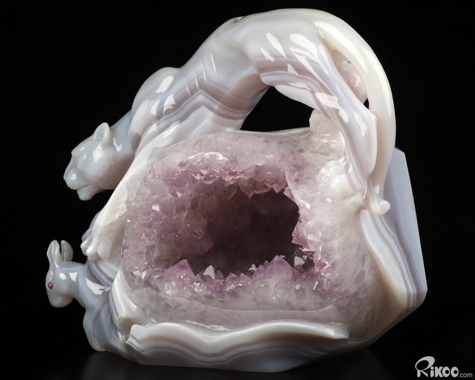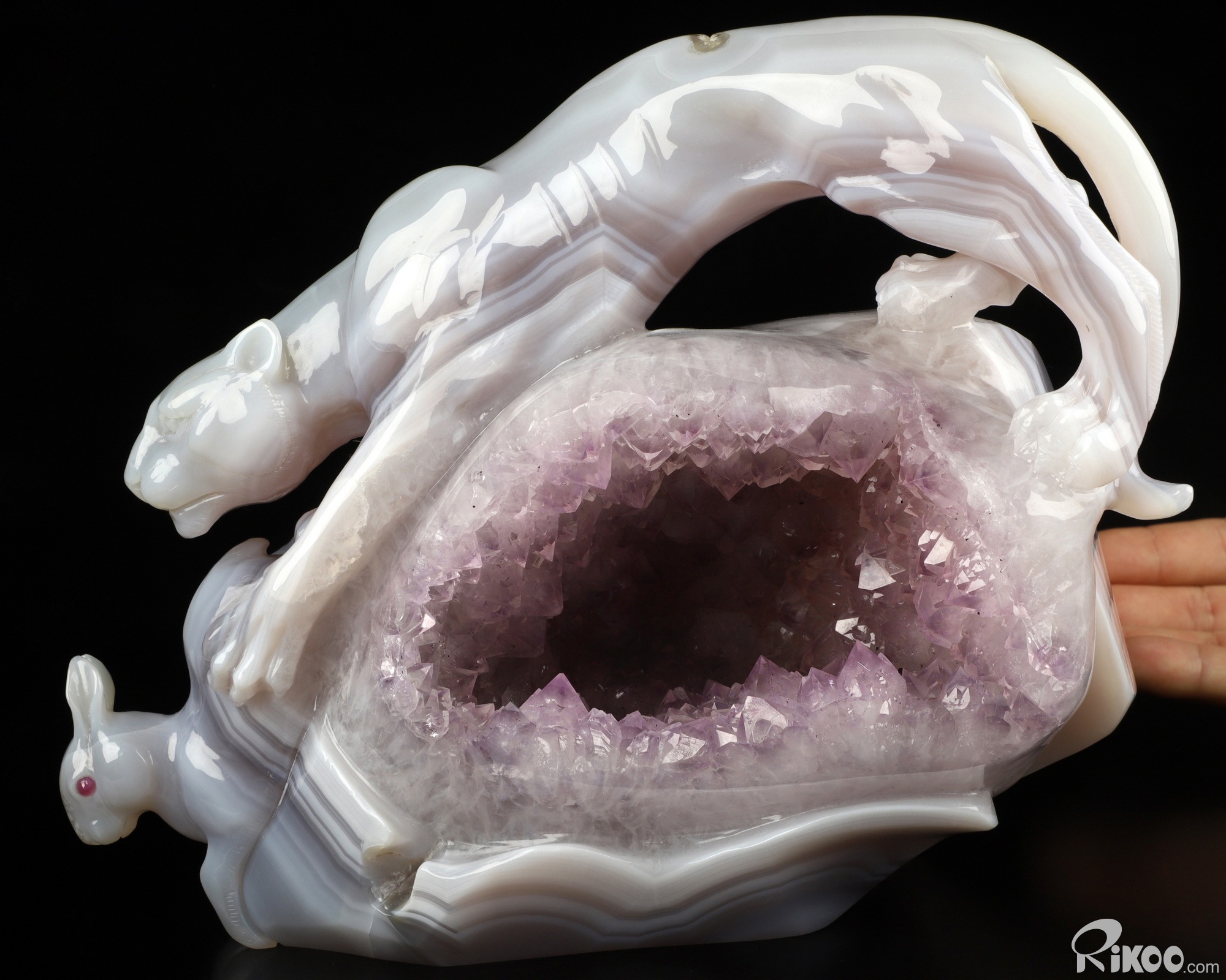 8.6" Agate Amethyst Geode Hand Carved Crystal Leopard and Rabbit Sculpture, Crystal Healing