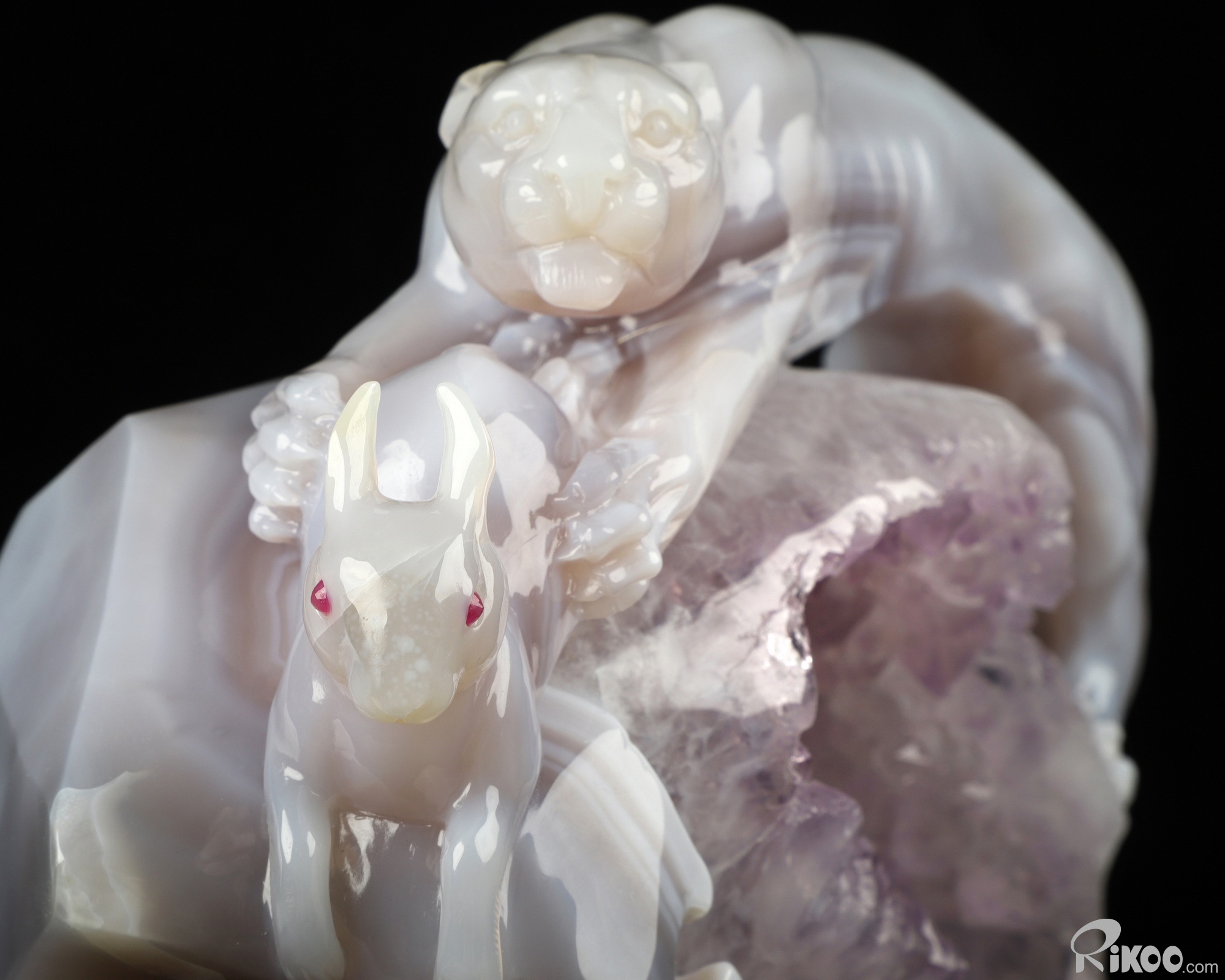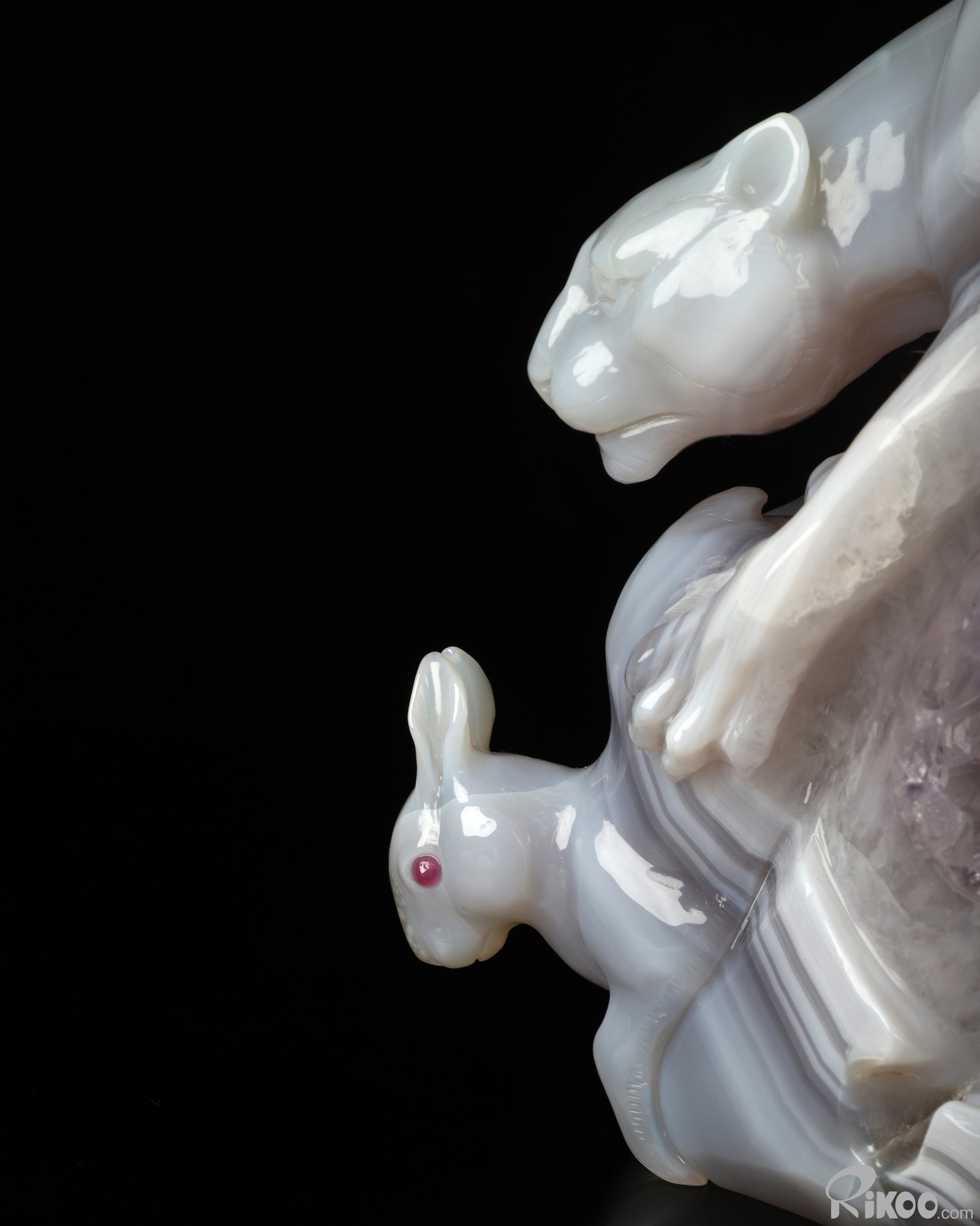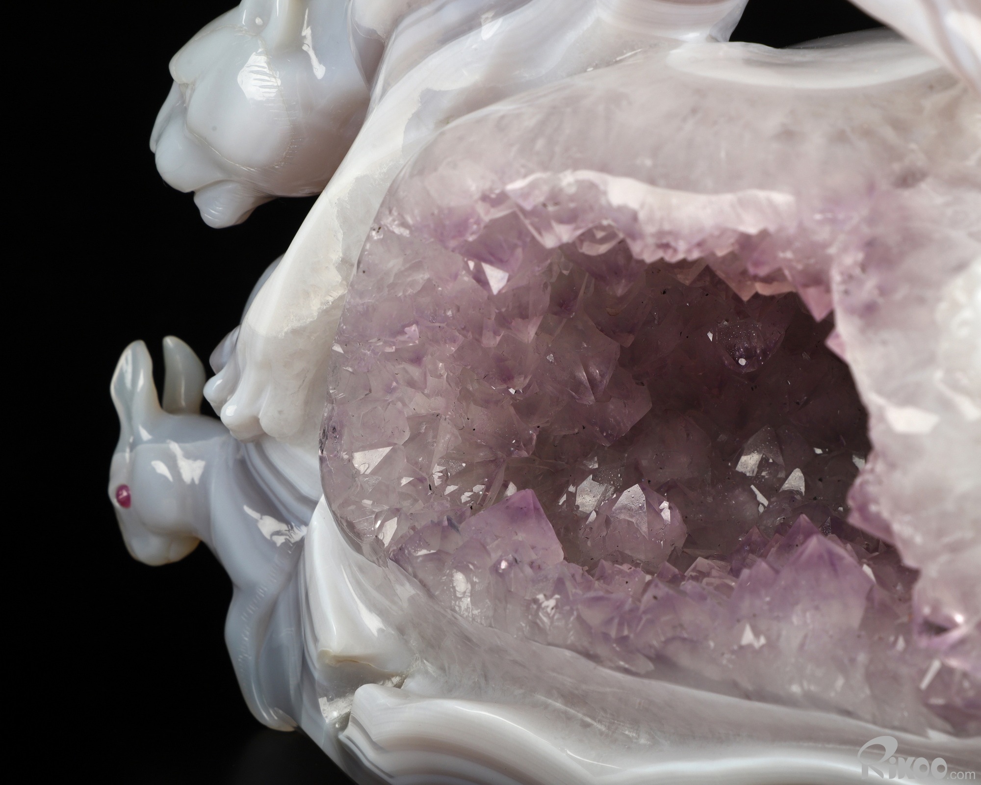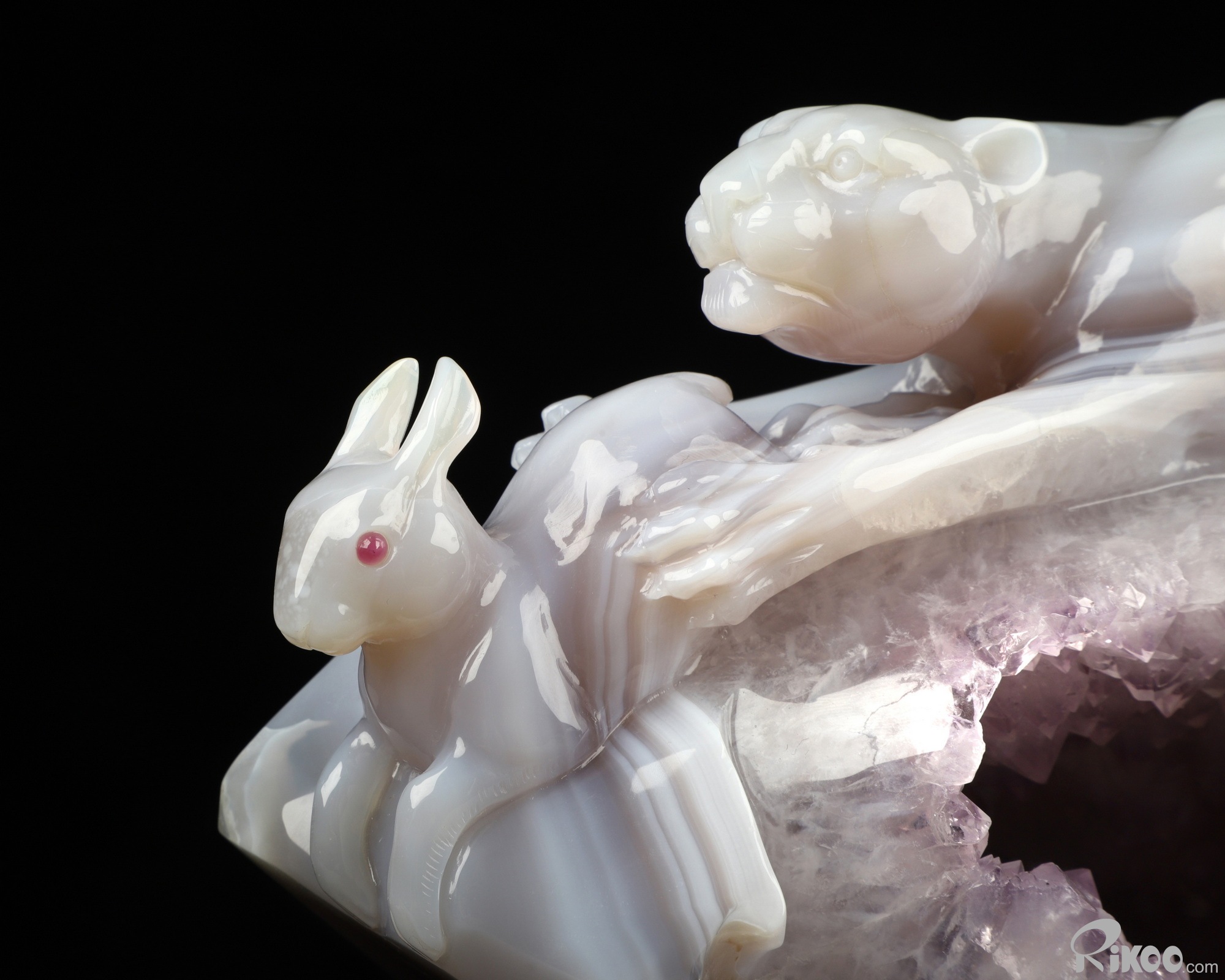 8.6" Agate Amethyst Geode Hand Carved Crystal Leopard and Rabbit Sculpture, Crystal Healing