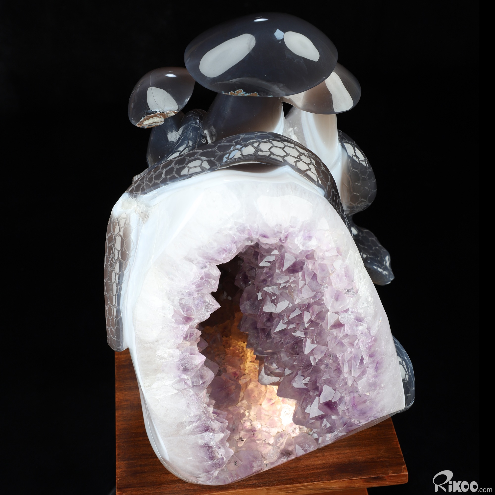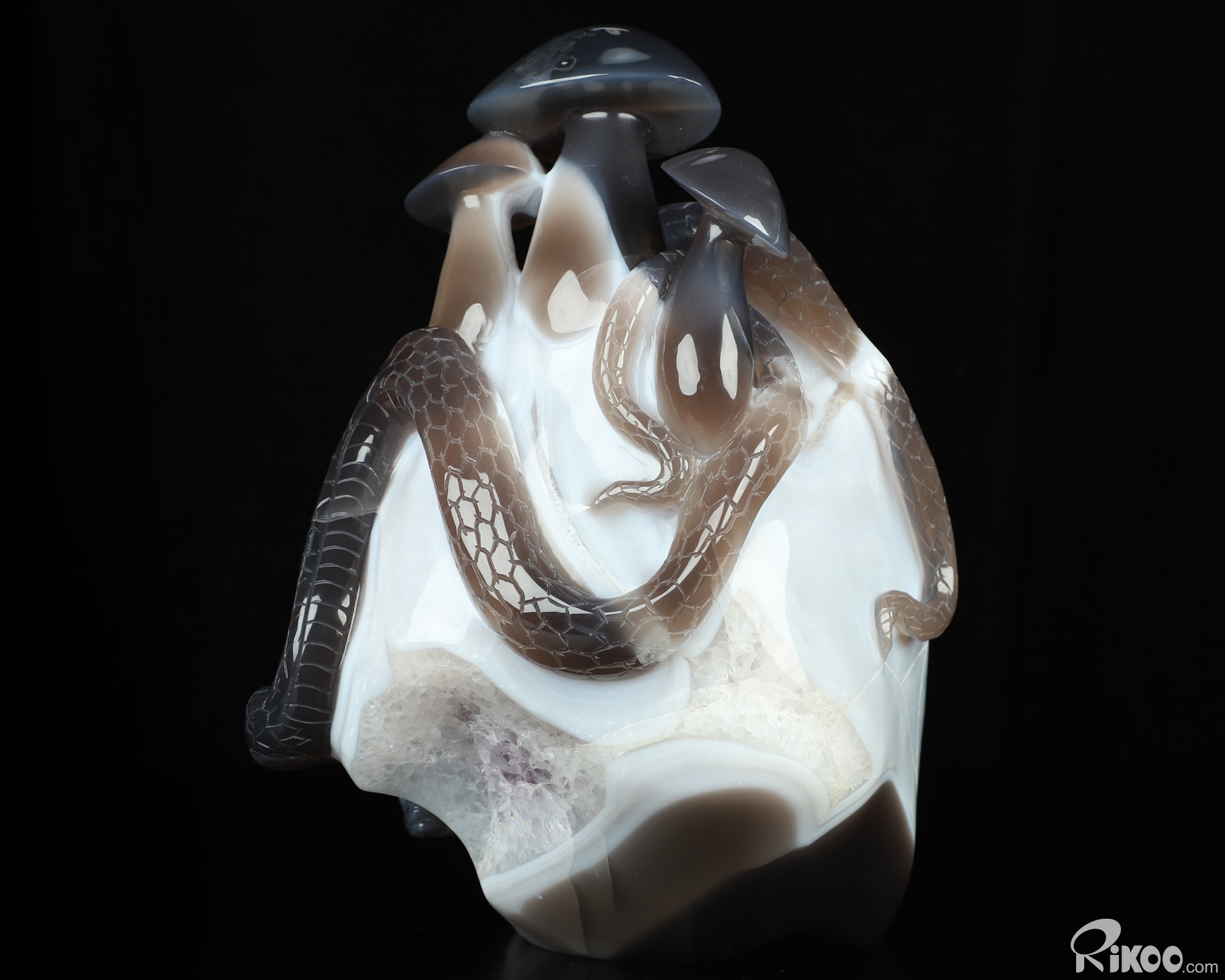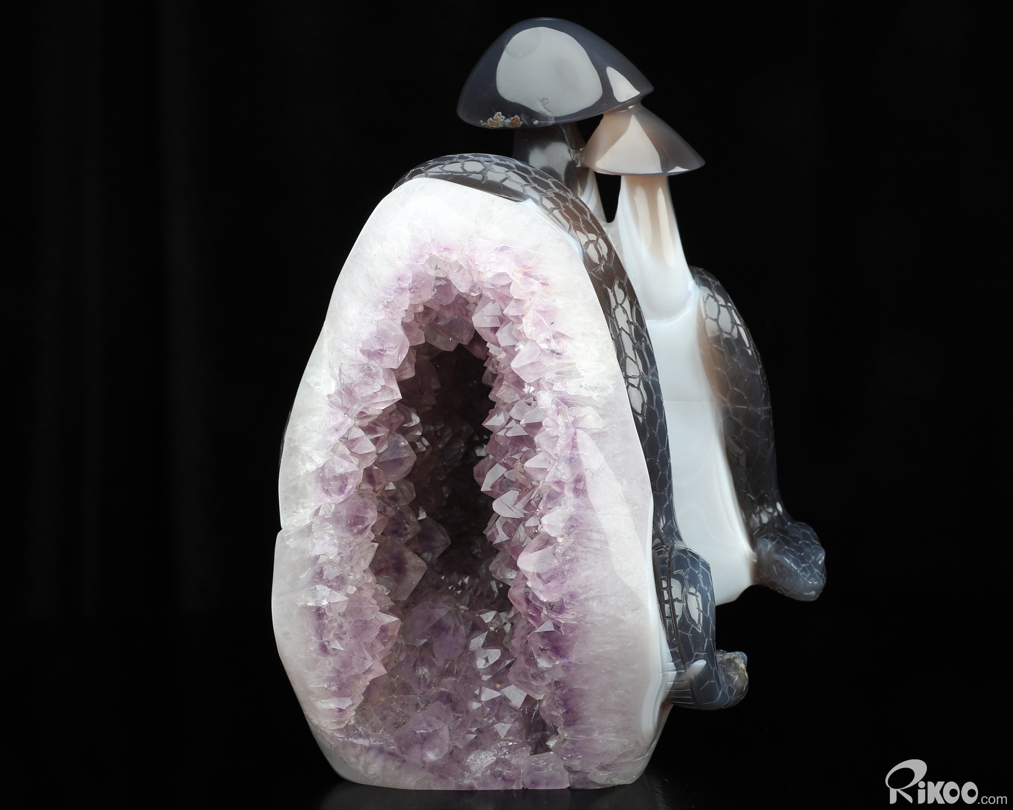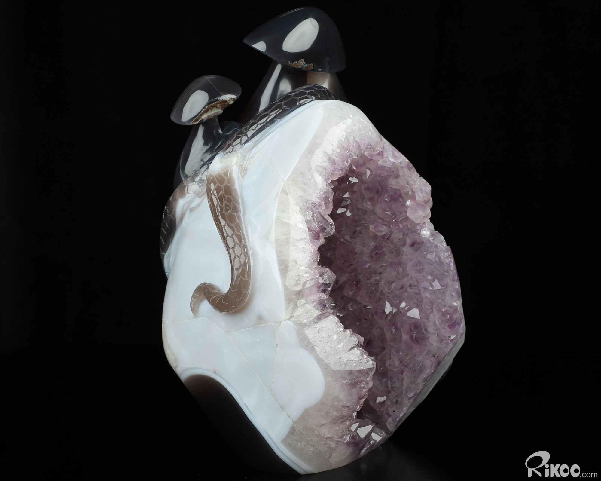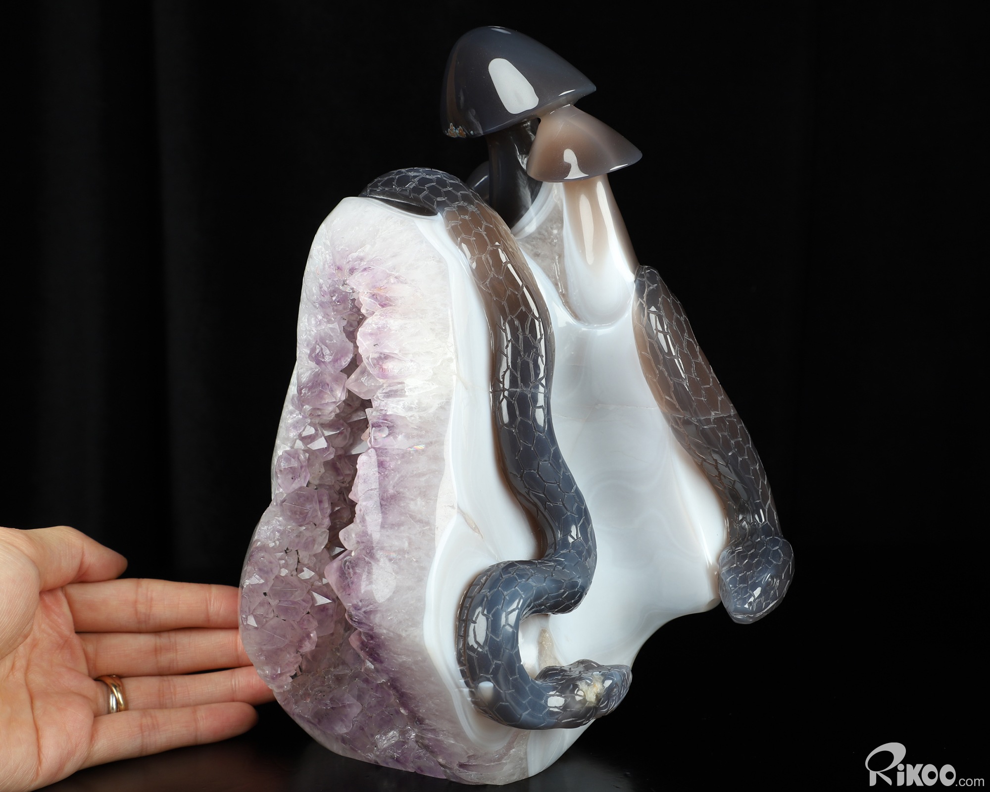 8.9" Agate Amethyst Geode Hand Carved Crystal Snake & Mushroom Sculpture, Crystal Healing