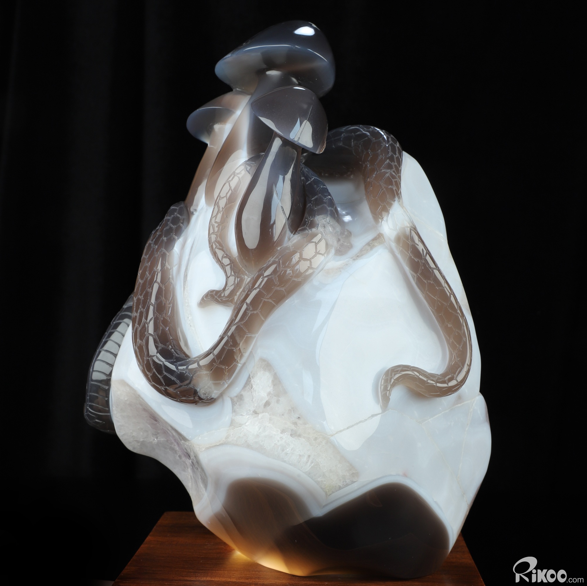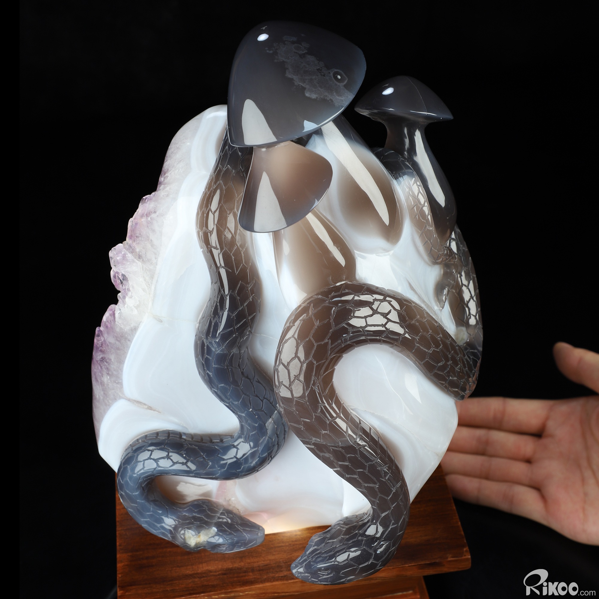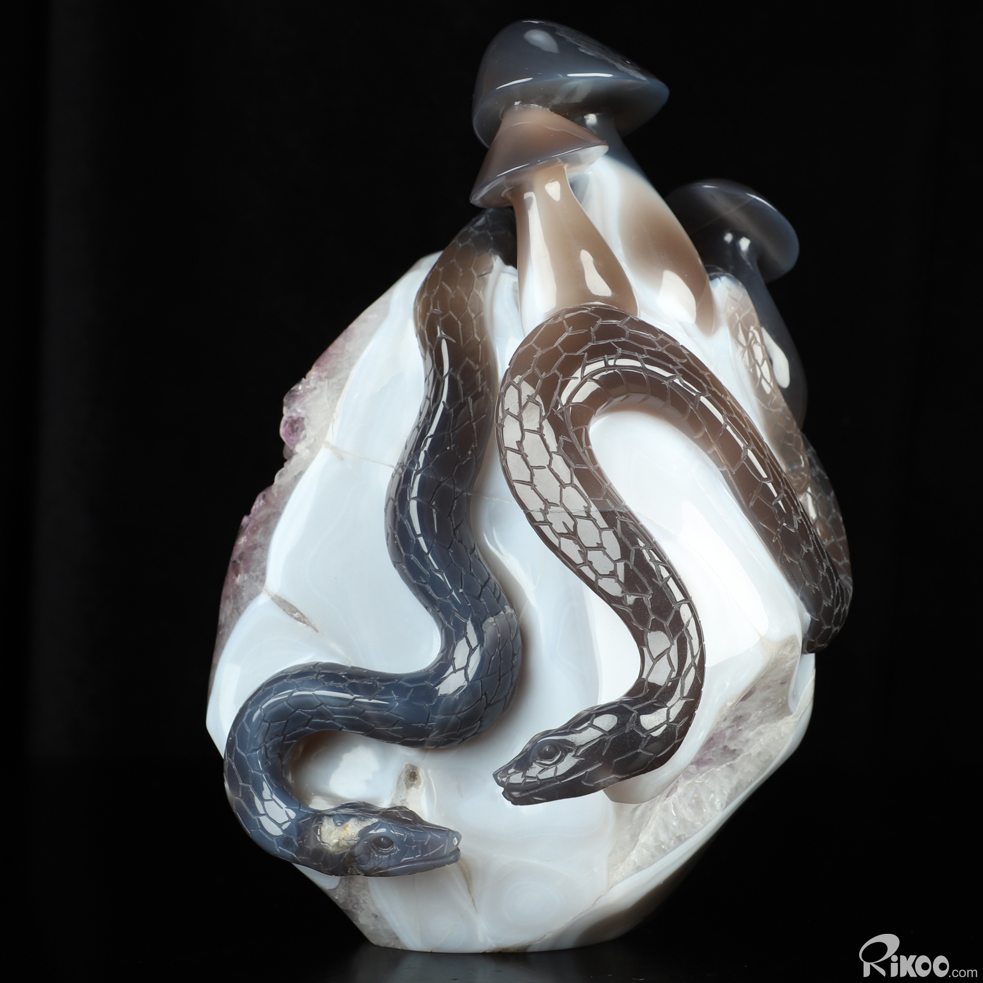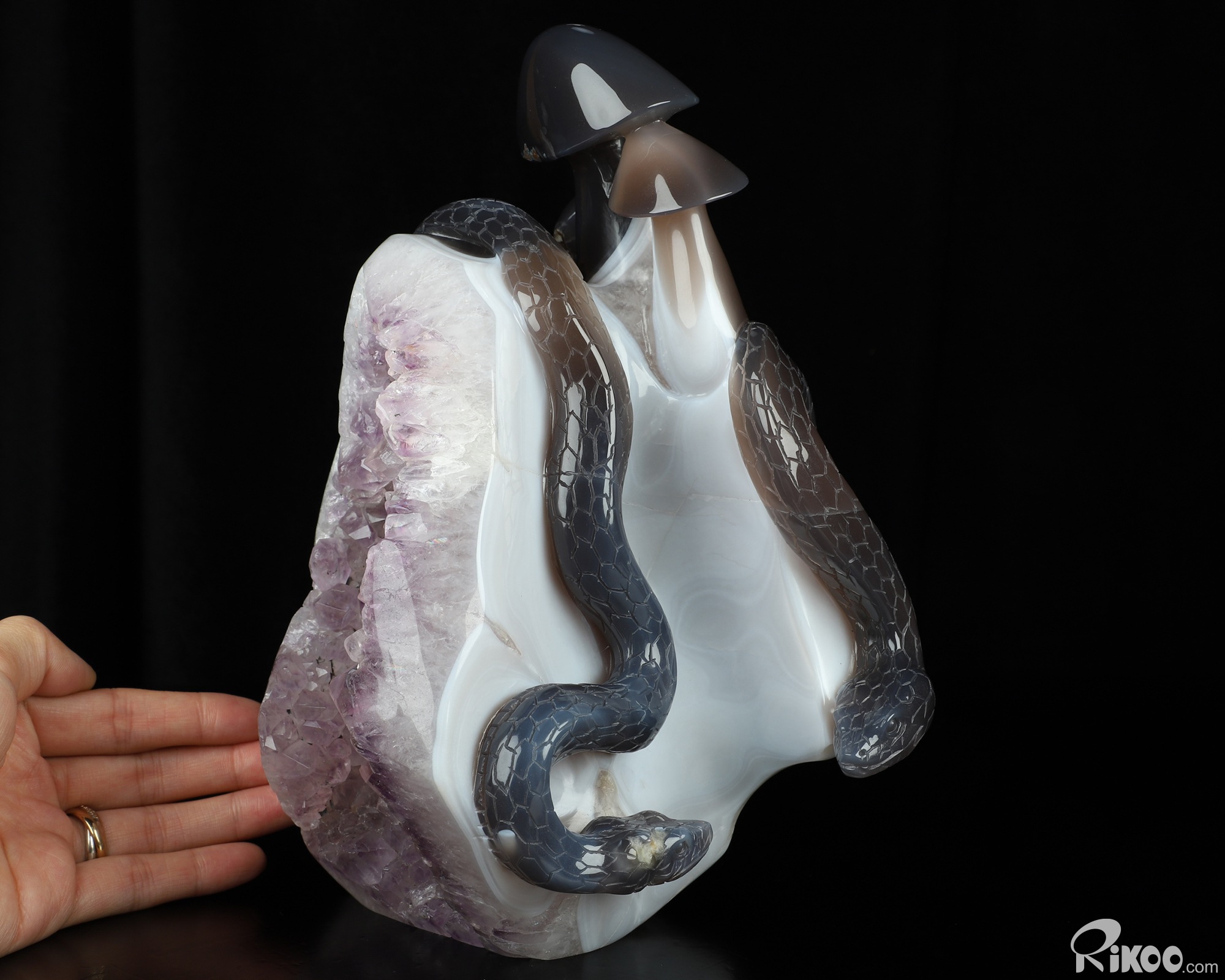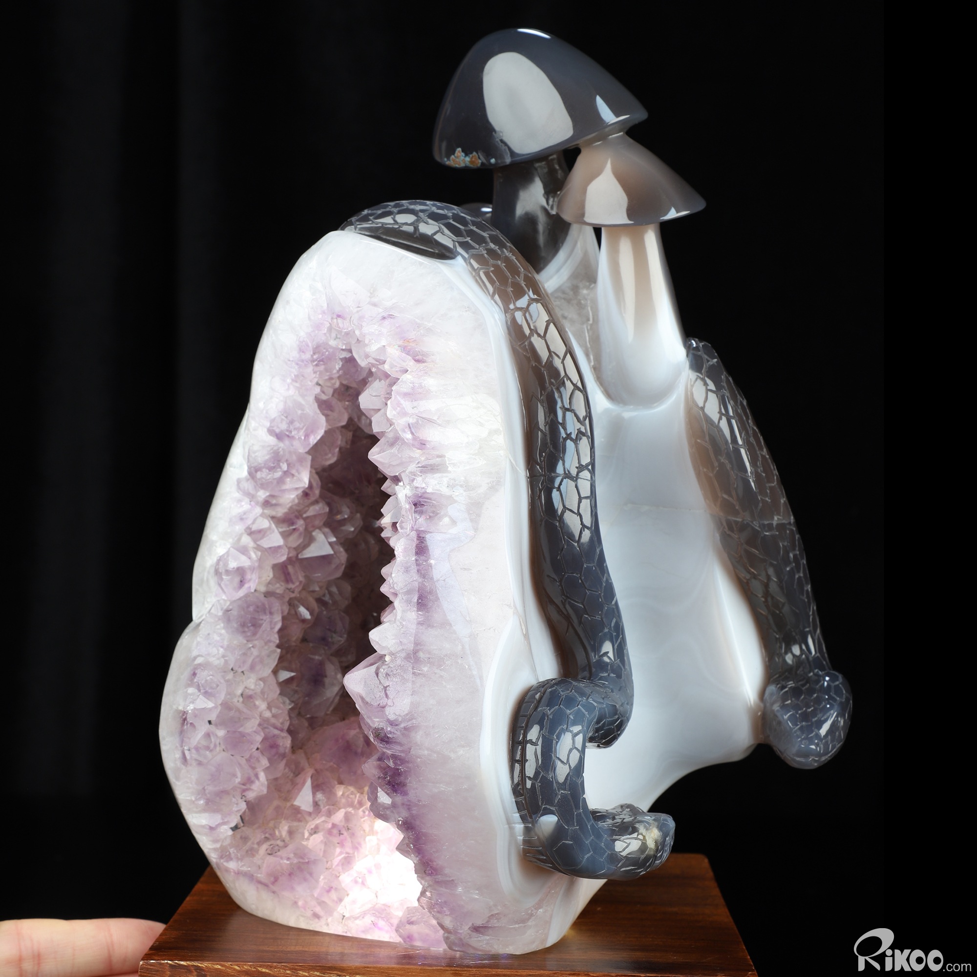 8.9" Agate Amethyst Geode Hand Carved Crystal Snake & Mushroom Sculpture, Crystal Healing