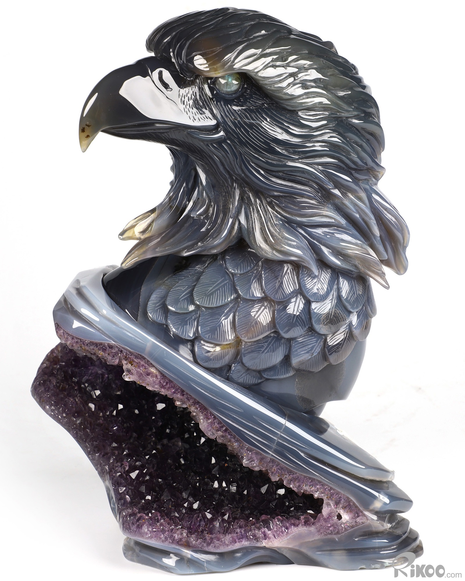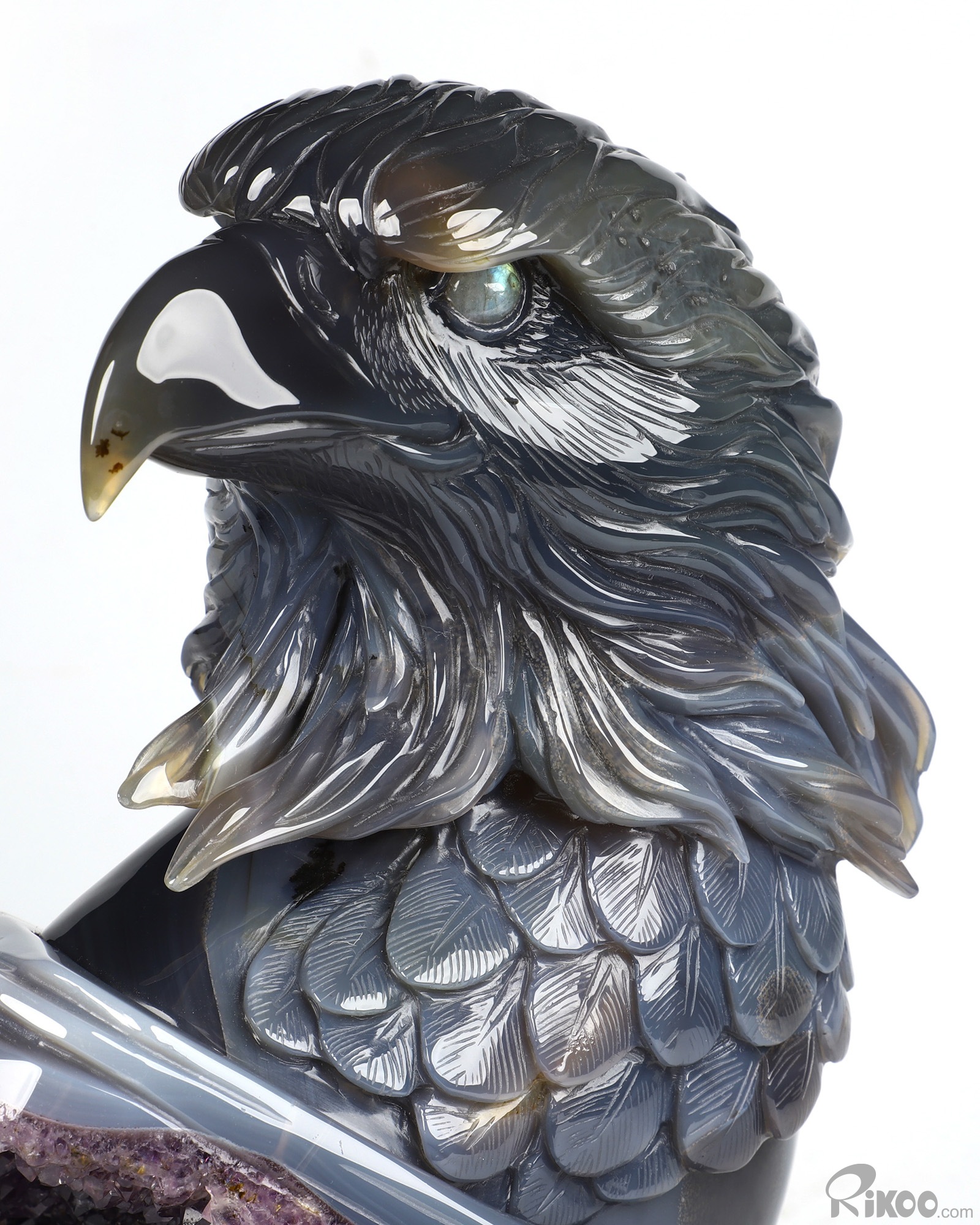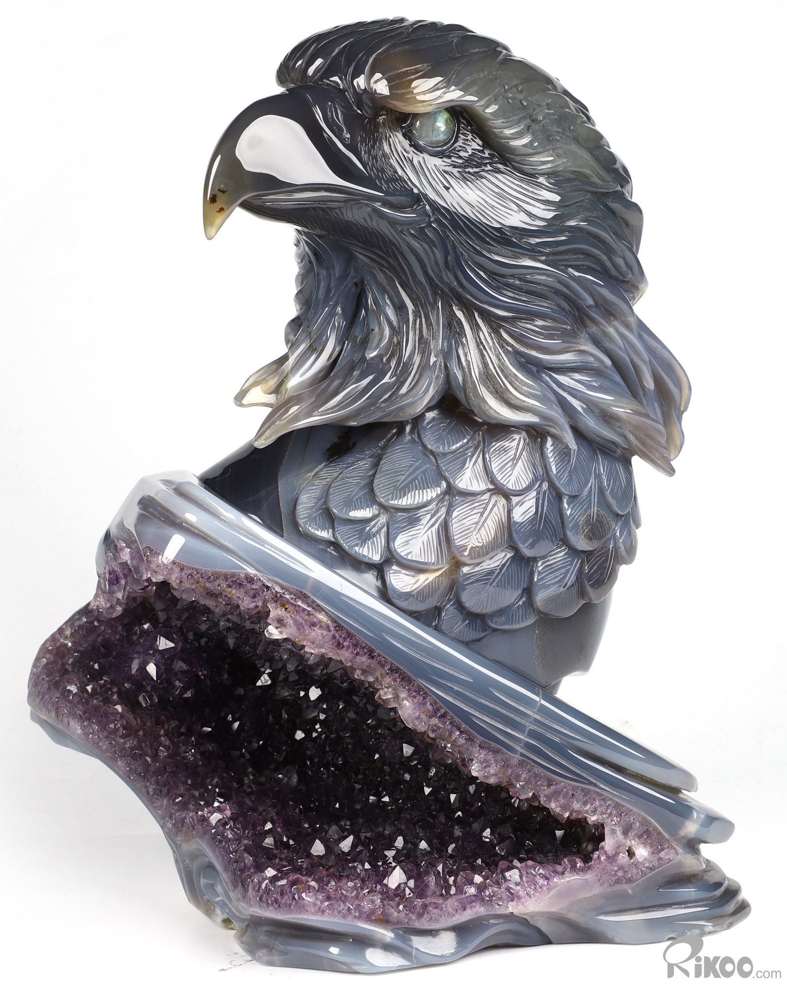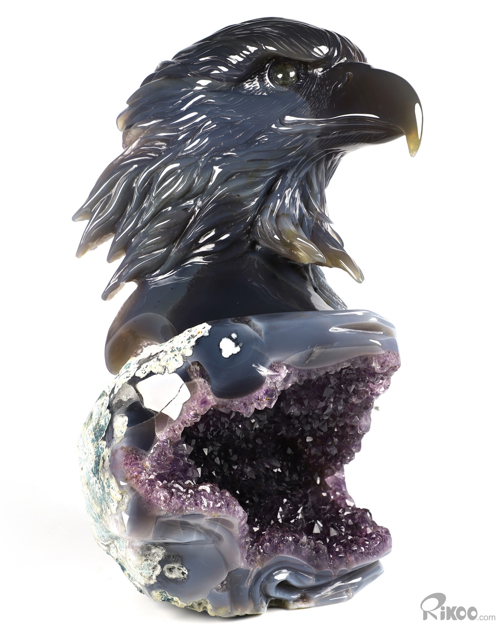 9.4" Agate Amethyst Geode Carved Crystal Eagle Sculpture, Realistic, Crystal Healing
