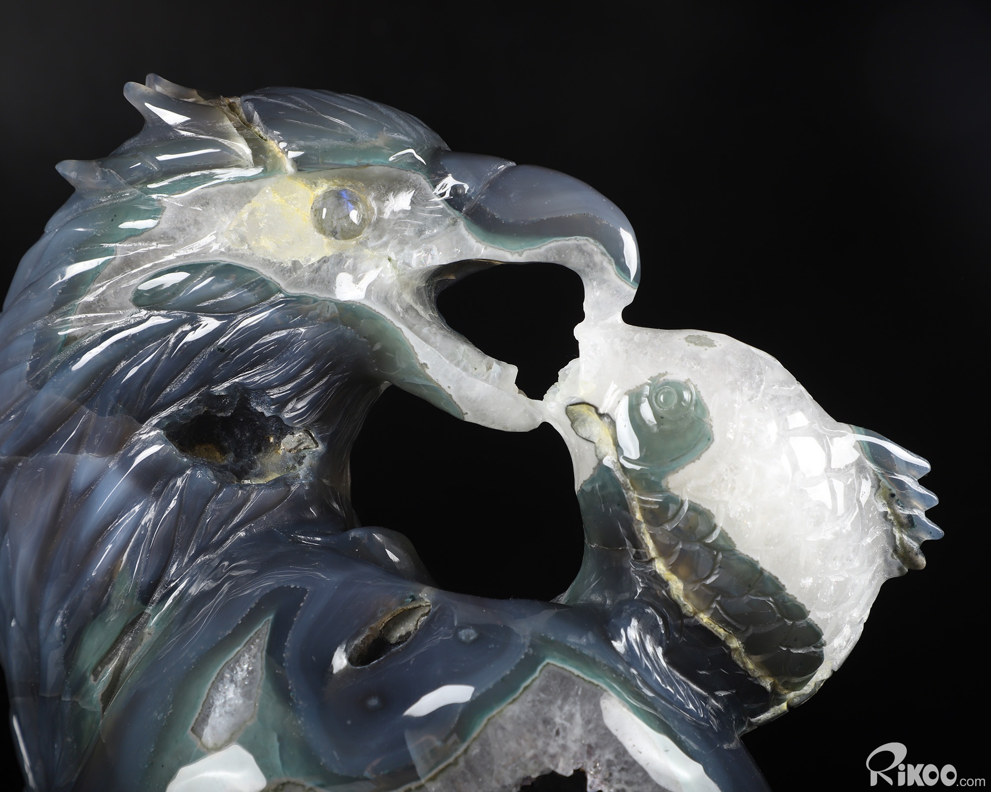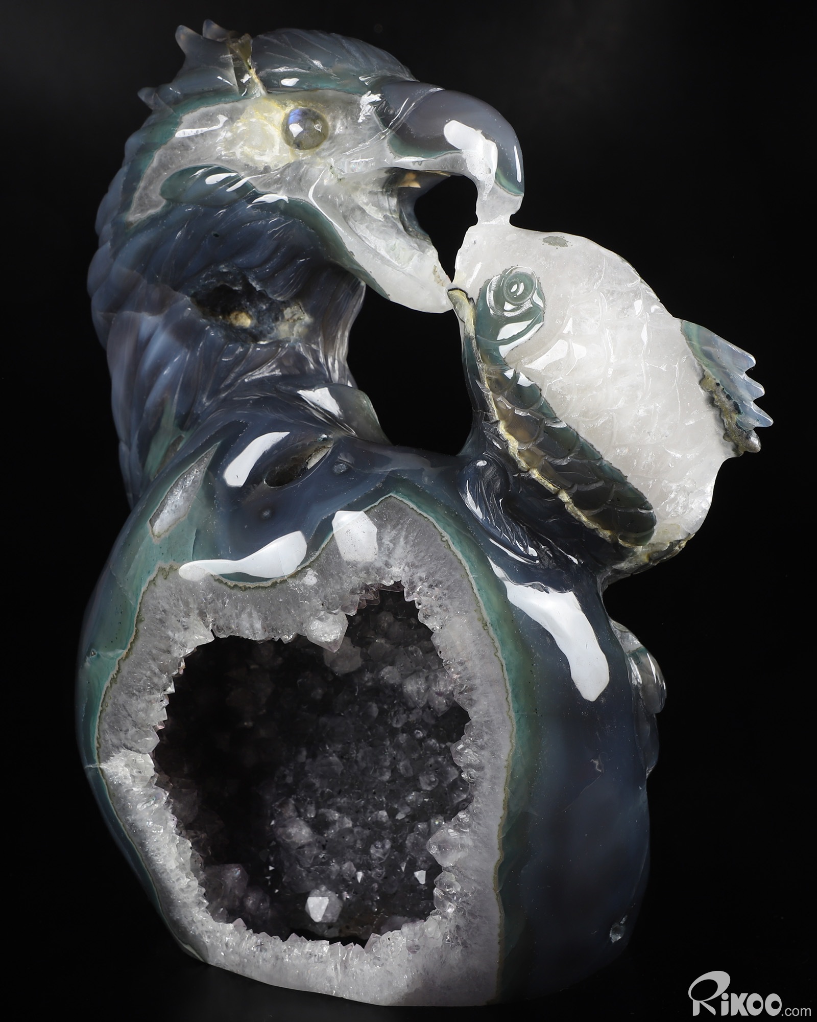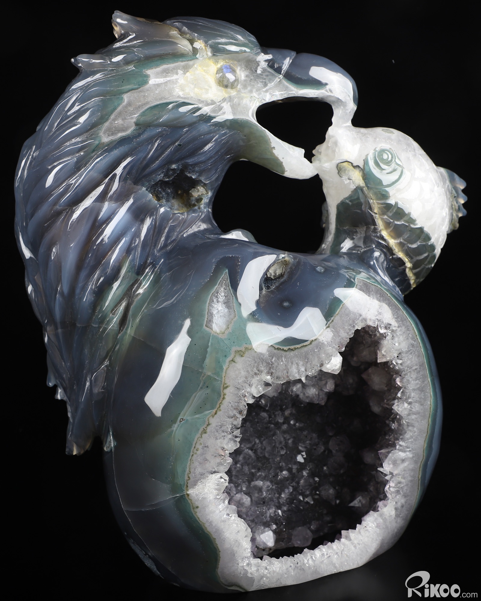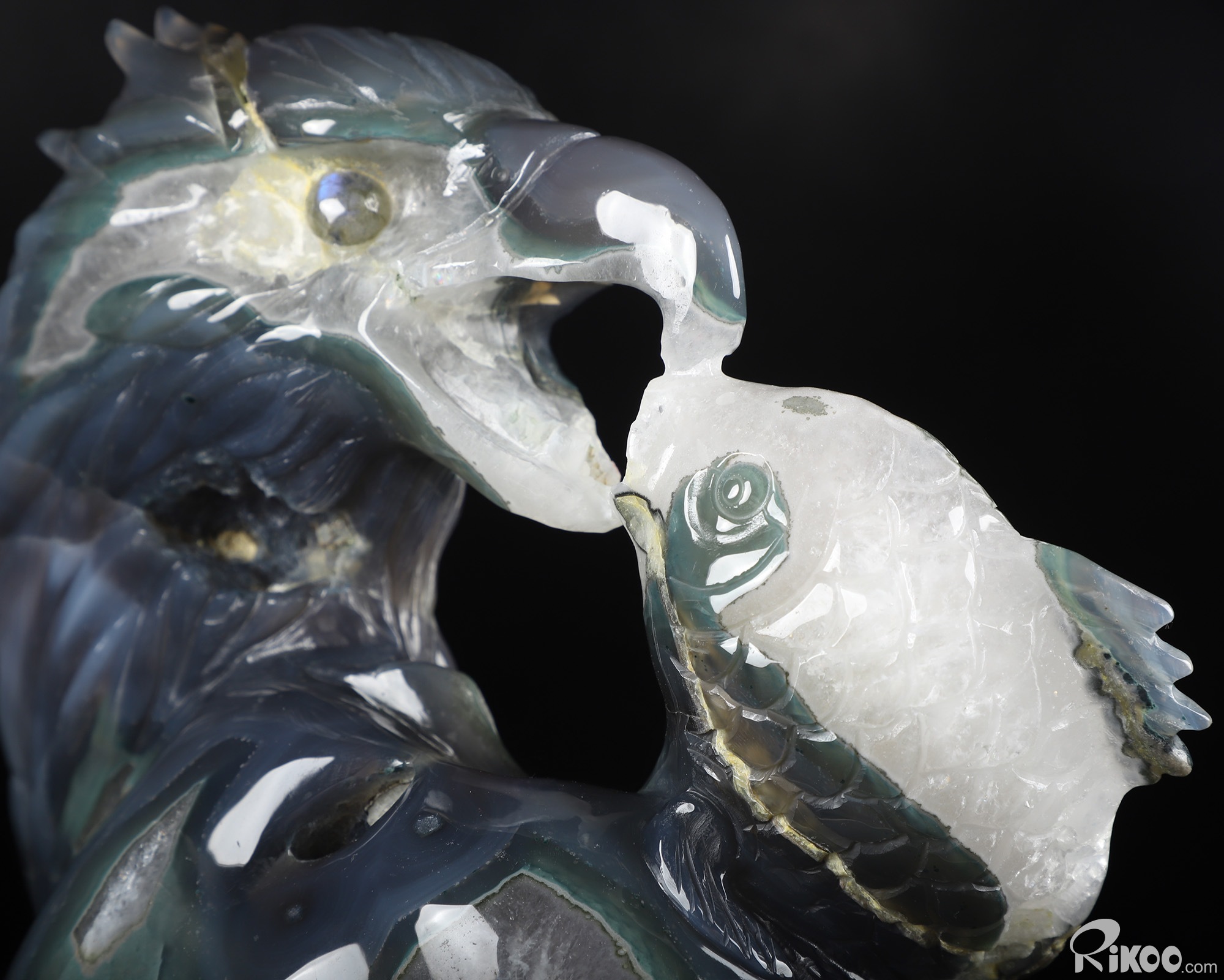 9.6" Agate Geode Carved Art Crystal Eagle & Fish Sculpture, Crystal Healing