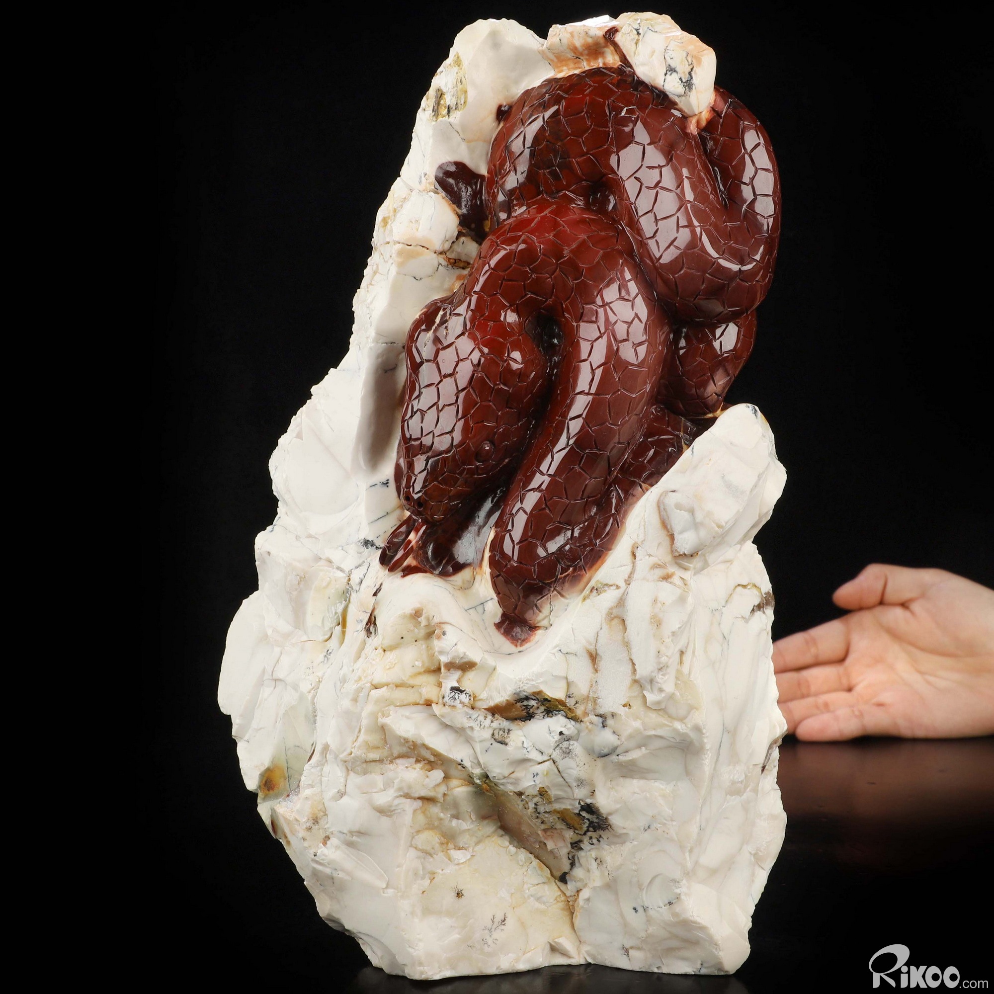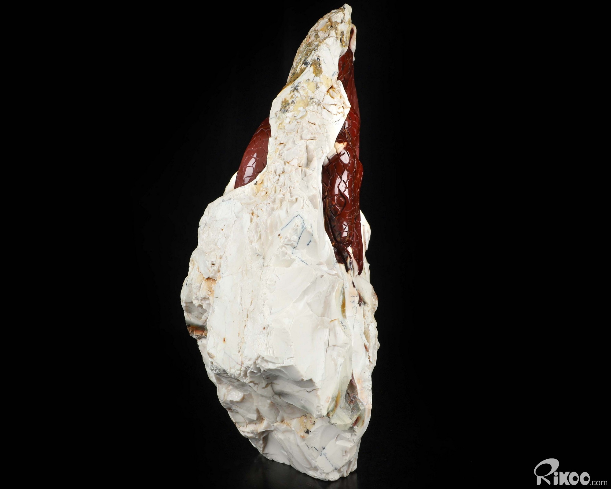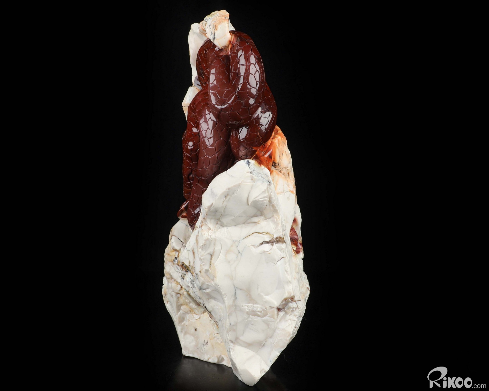 You are looking at a Mookaite Jasper sculpture. The sculpture is 9.6 inches long.