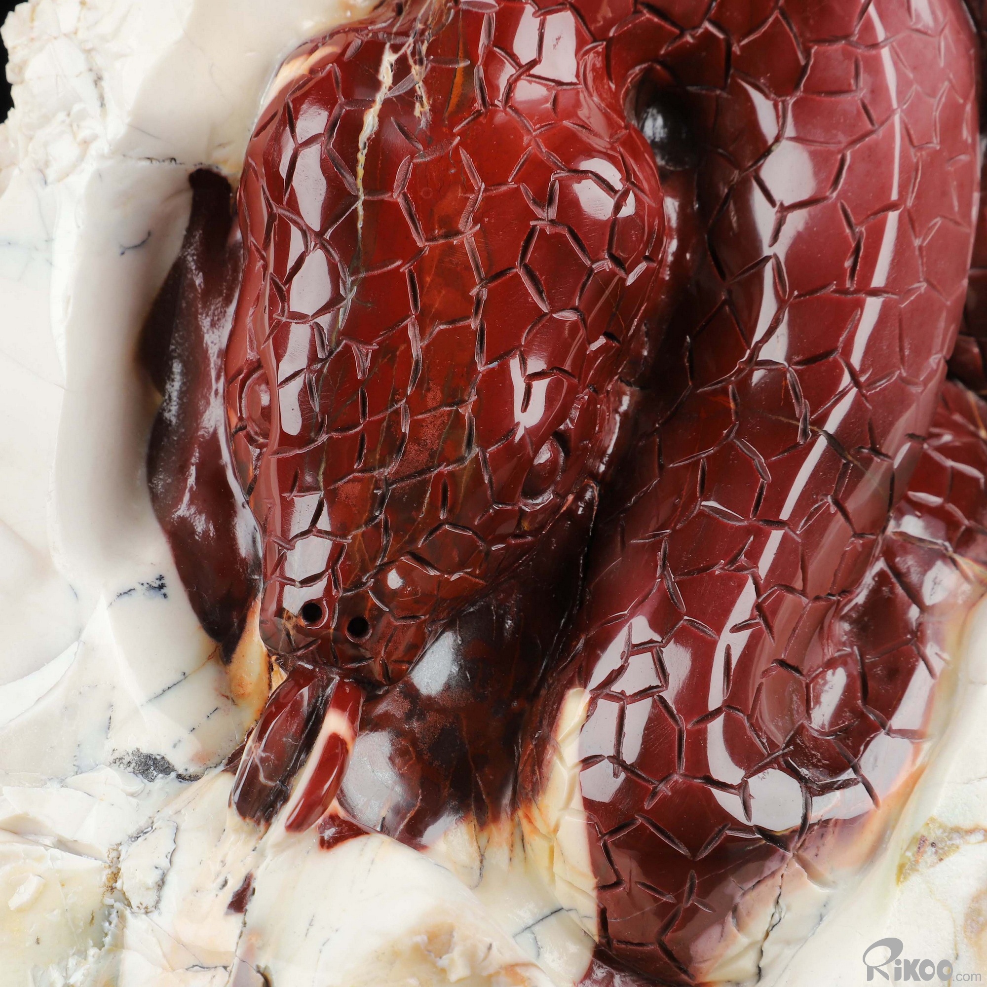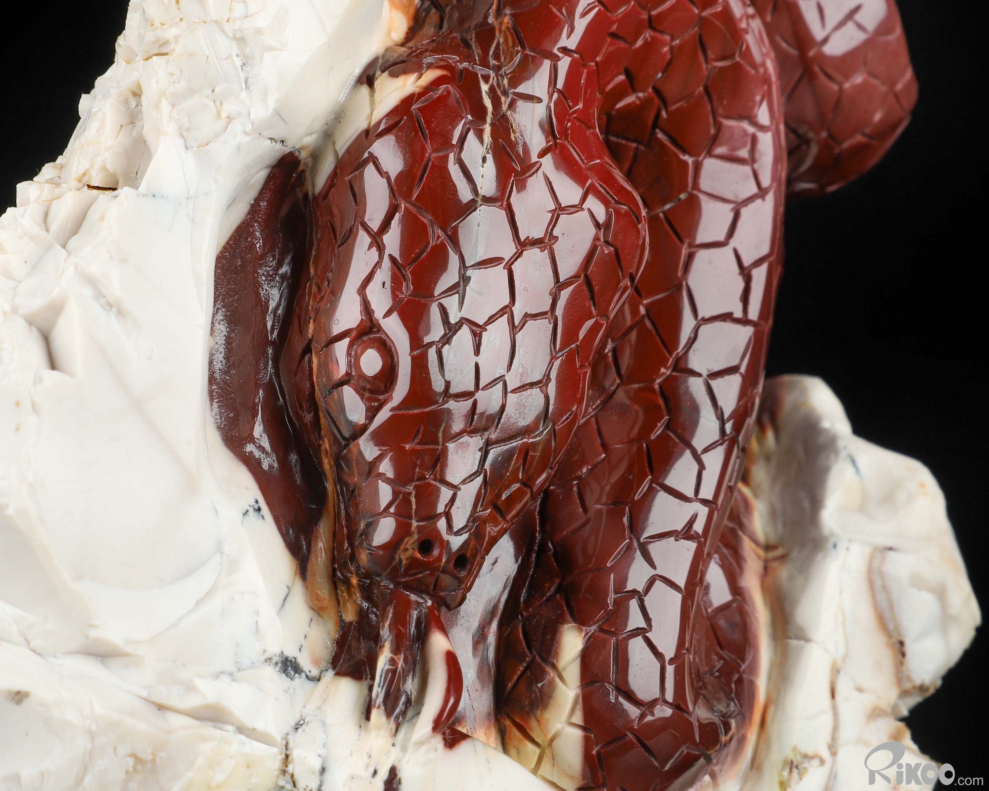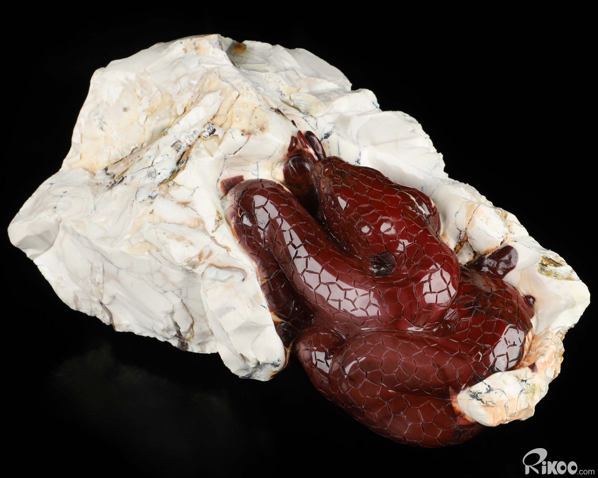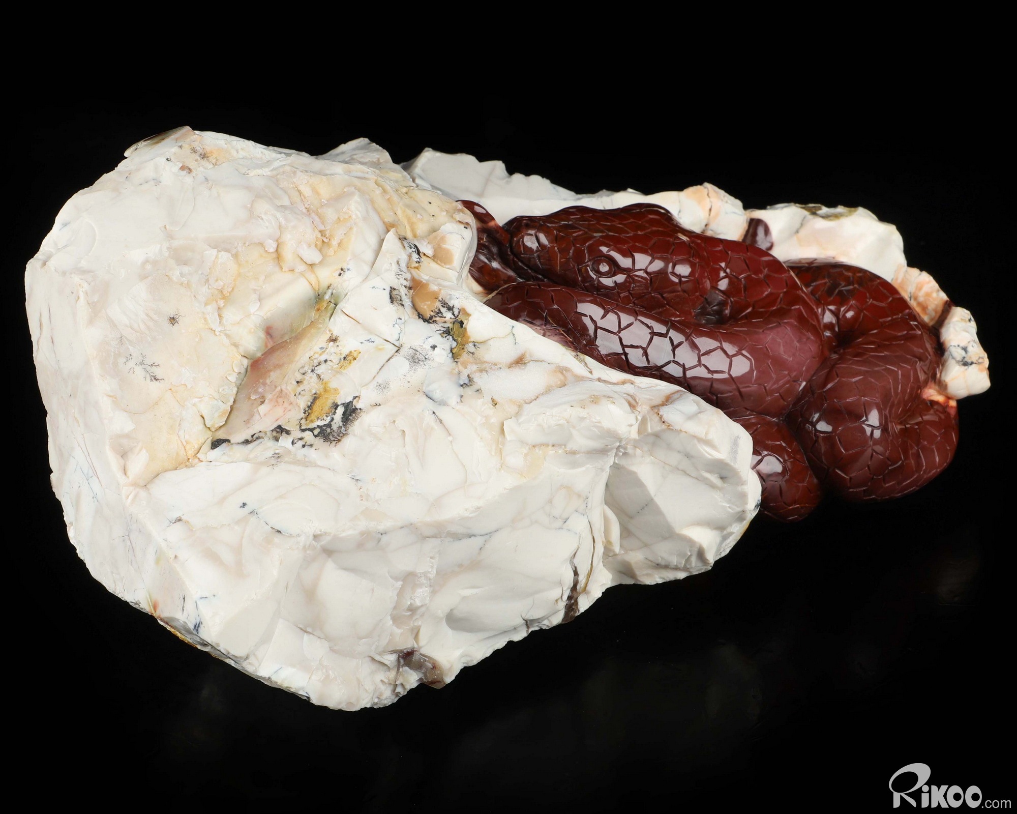 You are looking at a Mookaite Jasper sculpture. The sculpture is 9.6 inches long.