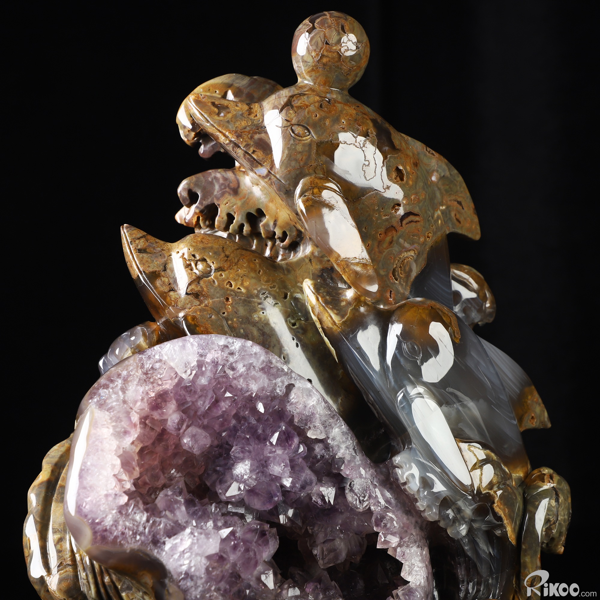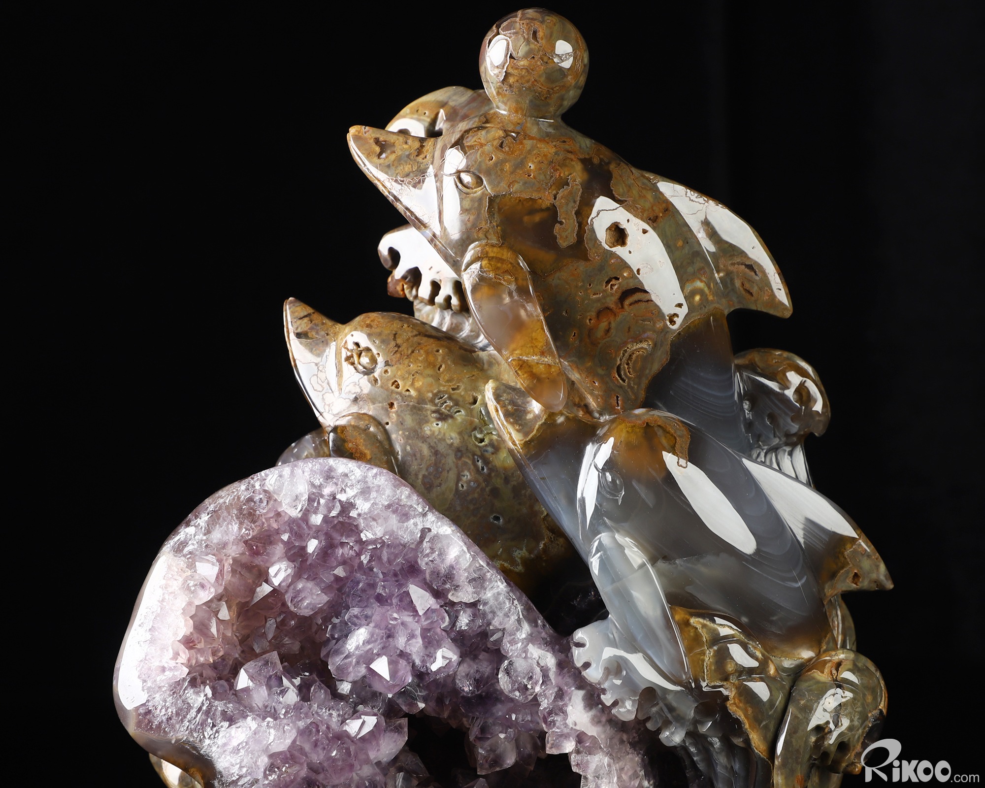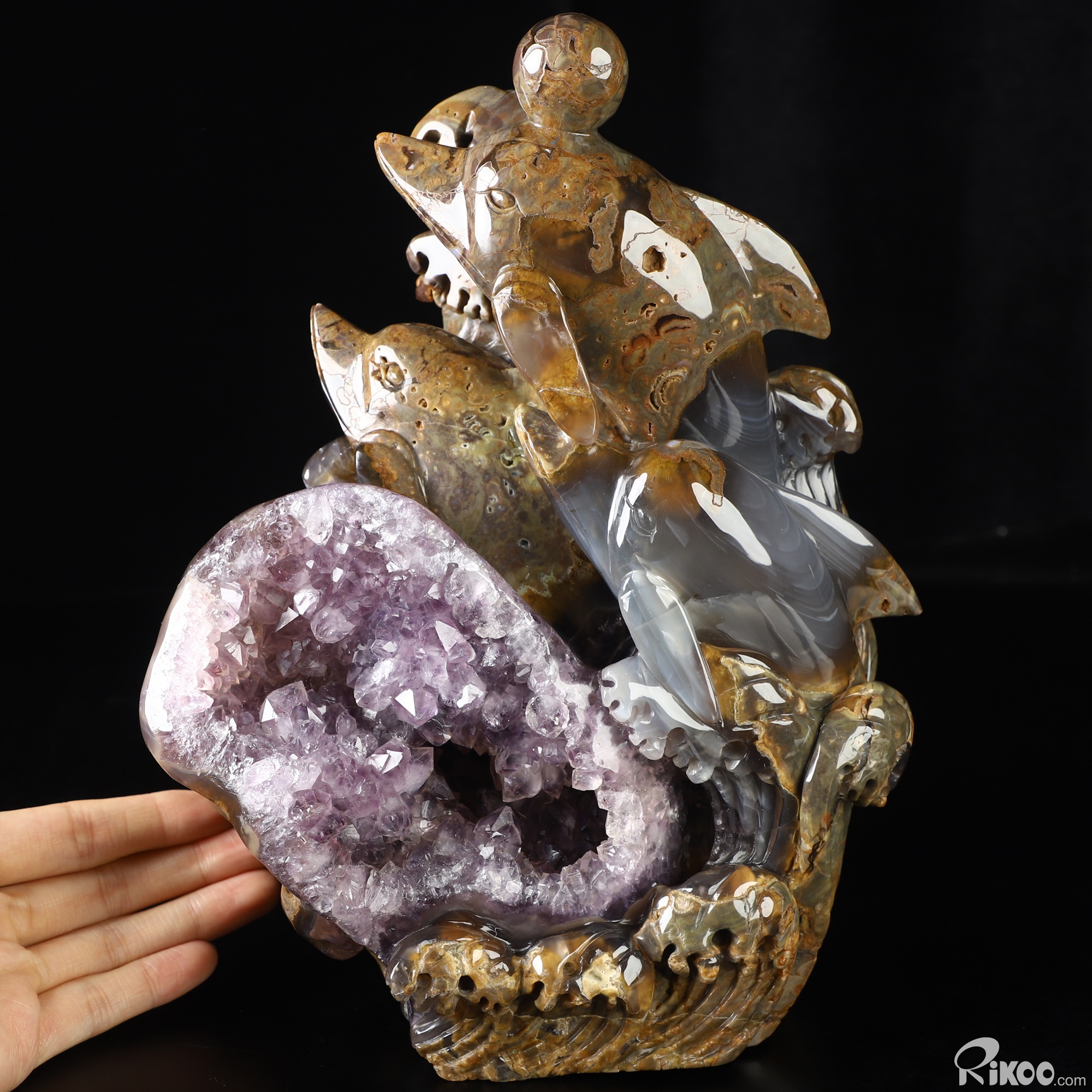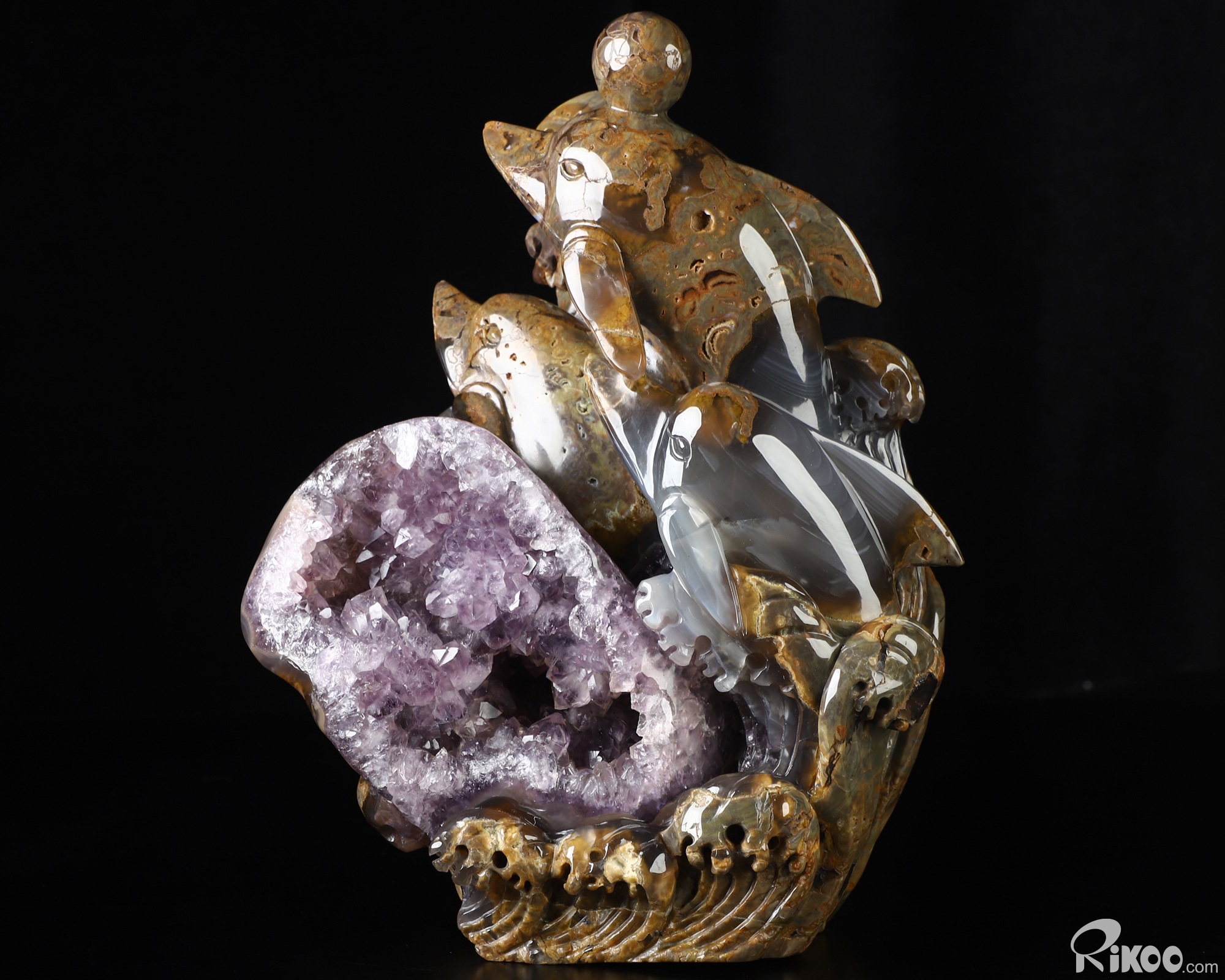 9.8" Dinosaur Egg Agate Amethyst Geode Hand Carved Crystal Dolphin Sculpture, Crystal Healing