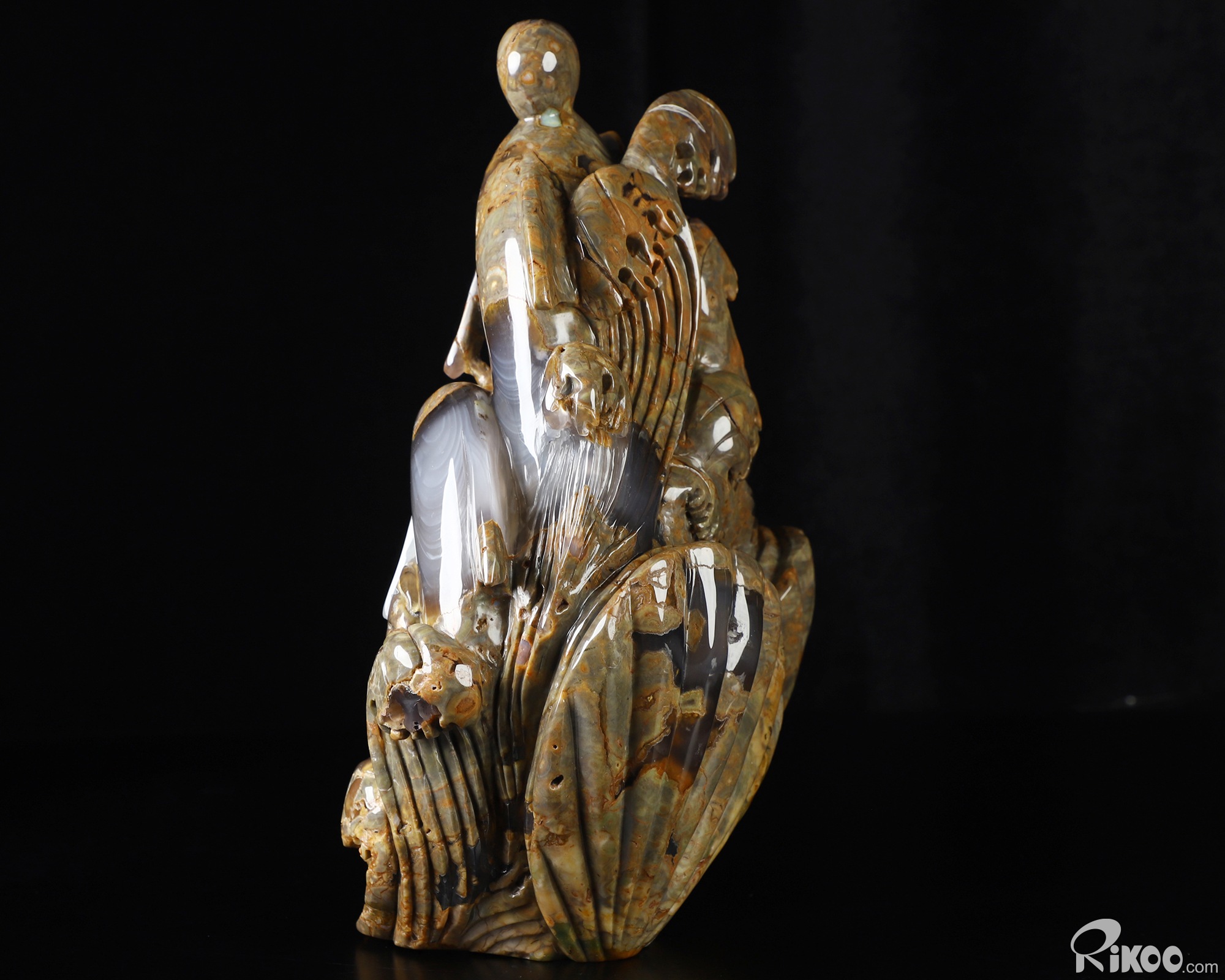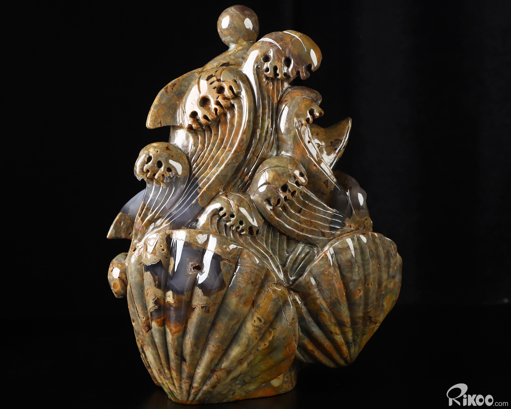 You are looking at a Dinosaur Egg Agate sculpture. The sculpture is 9.8 inches long.