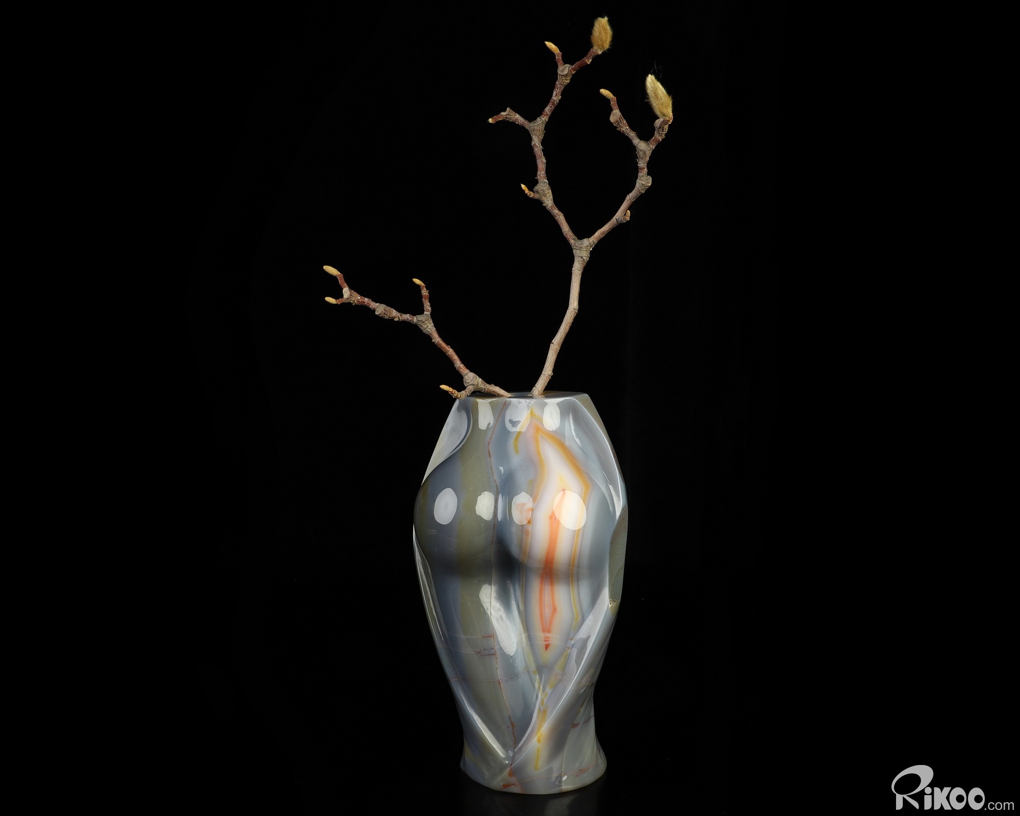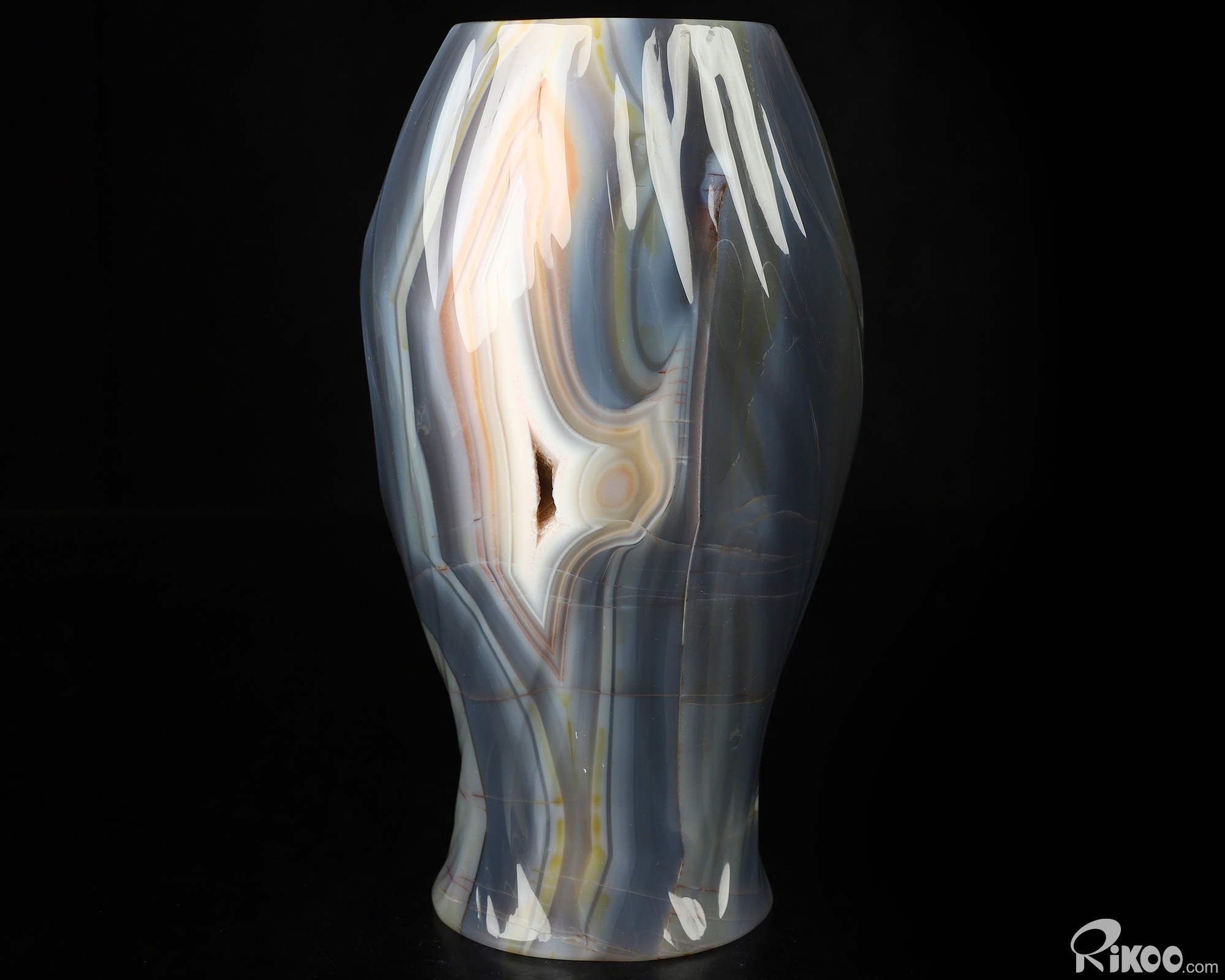 This vase with limited functionality is mainly for display.Composed of microscopic crystals of Quartz laid down in colorful bands or ribbons. The appearance of the stone is waxy and soft. Almost always translucent and occasionally transparent. Agates are grounding stones. Agates are one of the oldest good luck stones. They help obtain a better physical/emotional balance. They work to raise consciousness. Builds self-confidence. Agate enables the person wearing it to choose their friends carefully. Used to avert from lighting and stormy weather (physically and metaphysically), agate brings prosperity. It is a protector of children. This stone helps us to have patience, and allows for inner peace. Use agate as a gazing tool for divination and meditation. Agate balances emotions and brings insight to any situation.