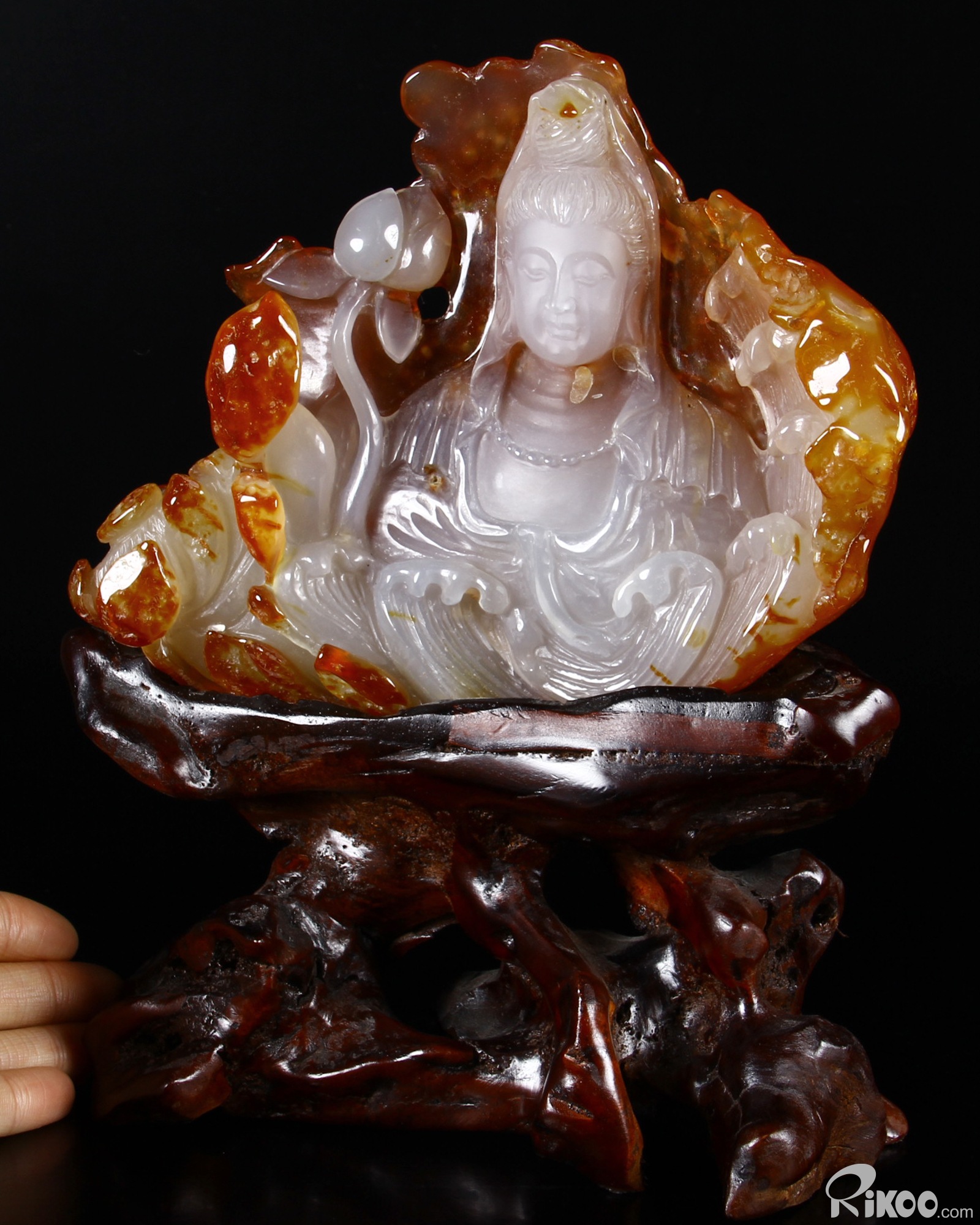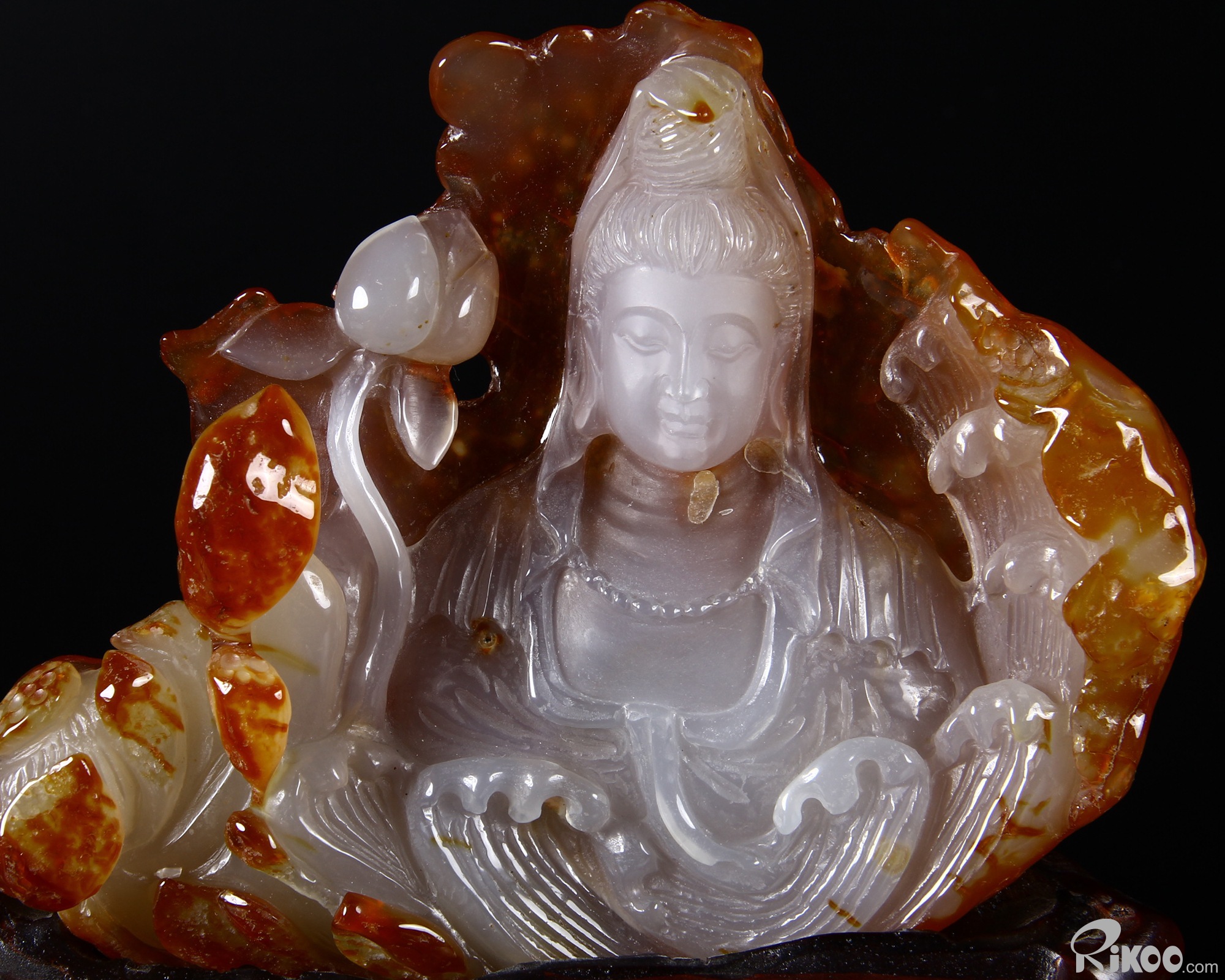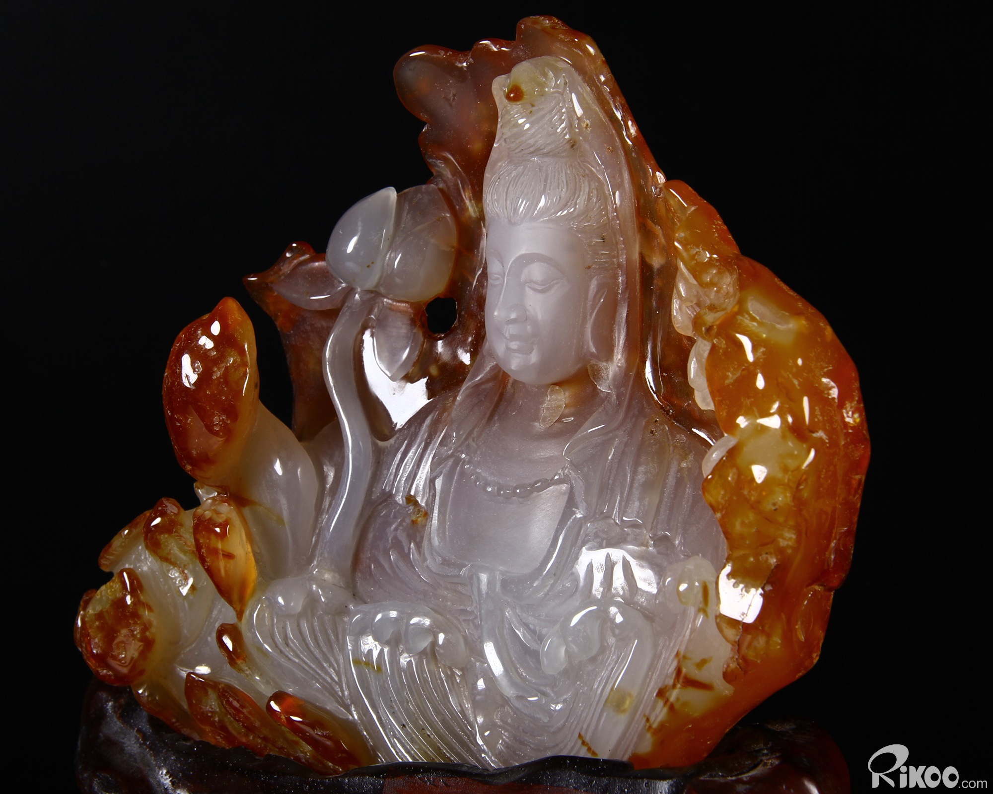 Amazing Giant Carnelian Carved Crystal Kwan-yin & Lotus Flowers with Wooden Stand