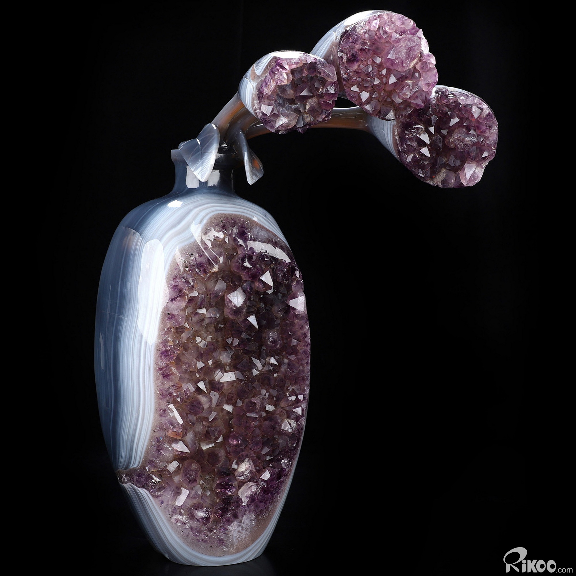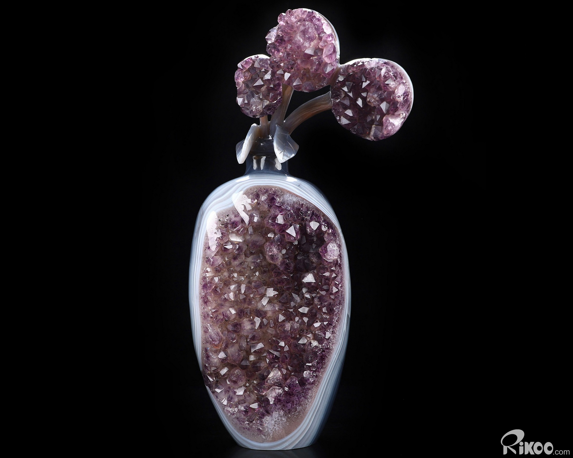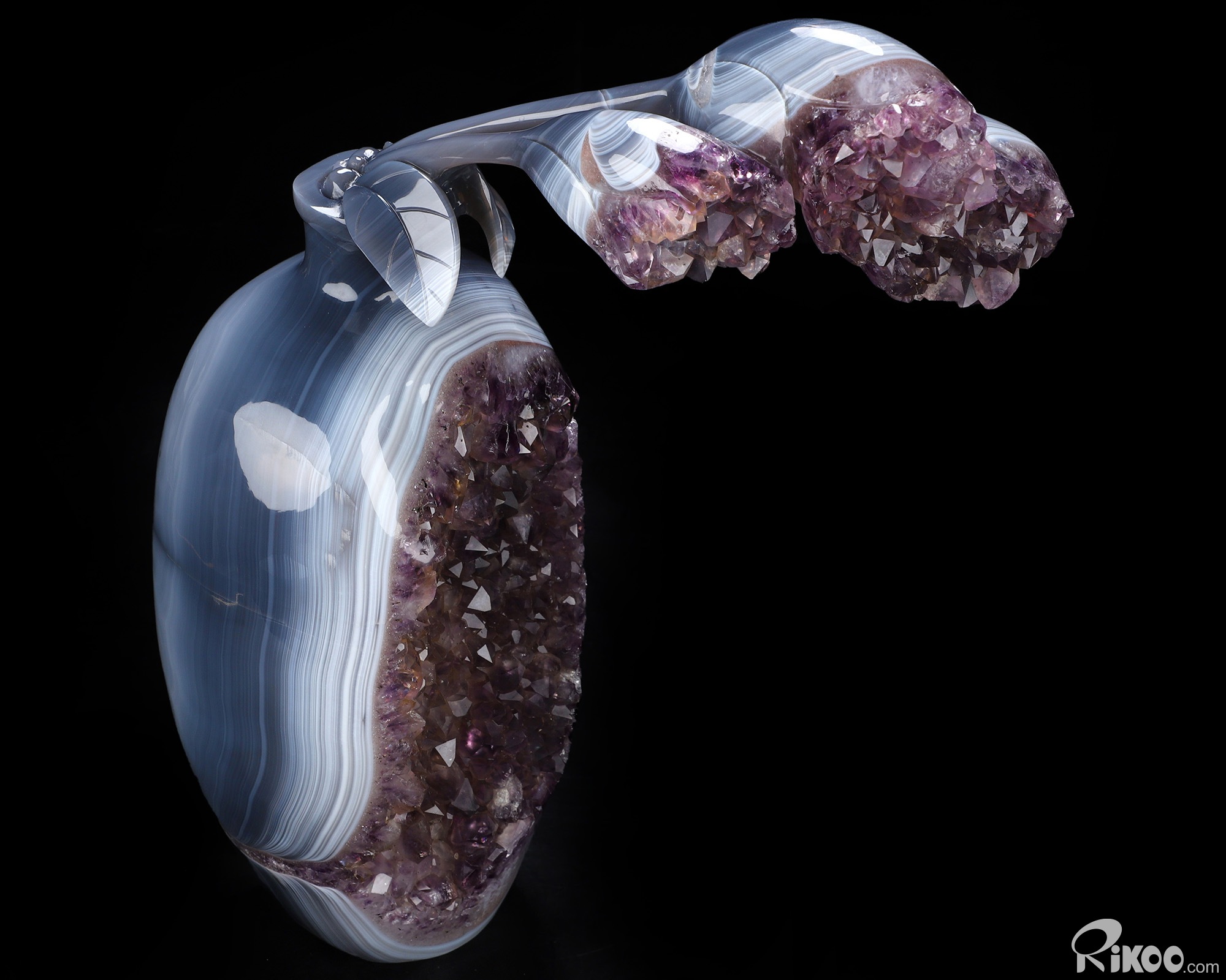 This vase with limited functionality is mainly for display. The amethyst flower was broken when our artist carved it, and we glued them together