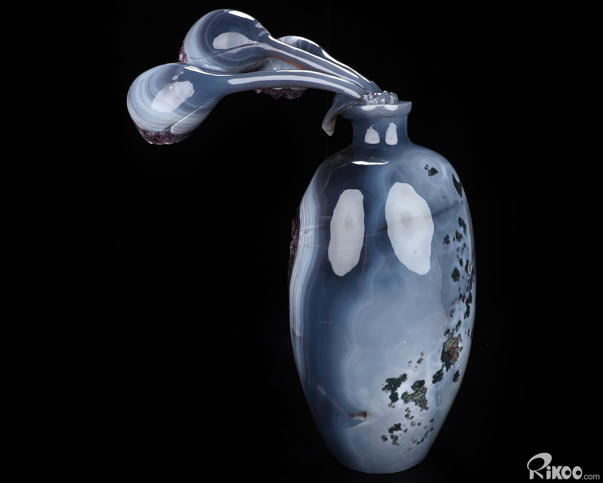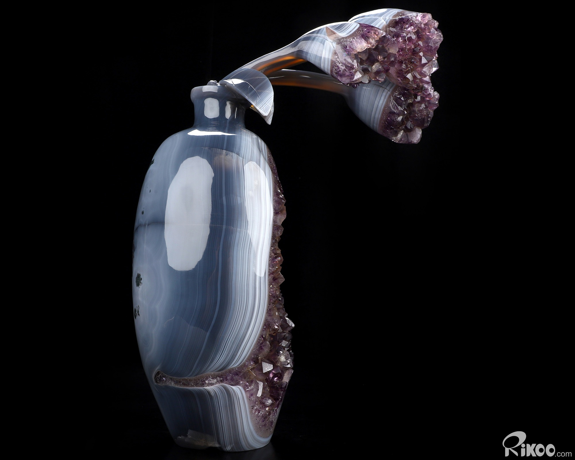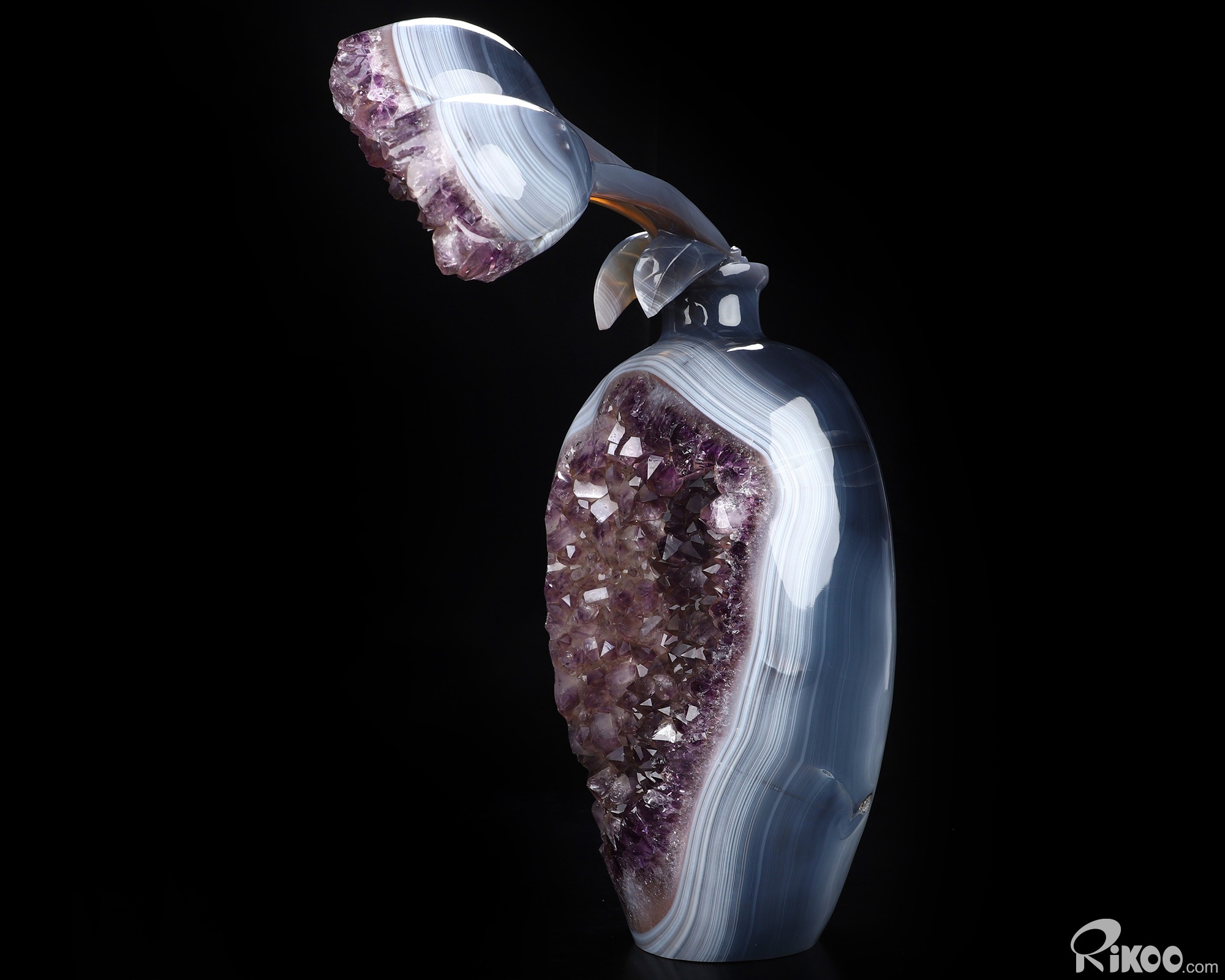 This vase with limited functionality is mainly for display. The amethyst flower was broken when our artist carved it, and we glued them together