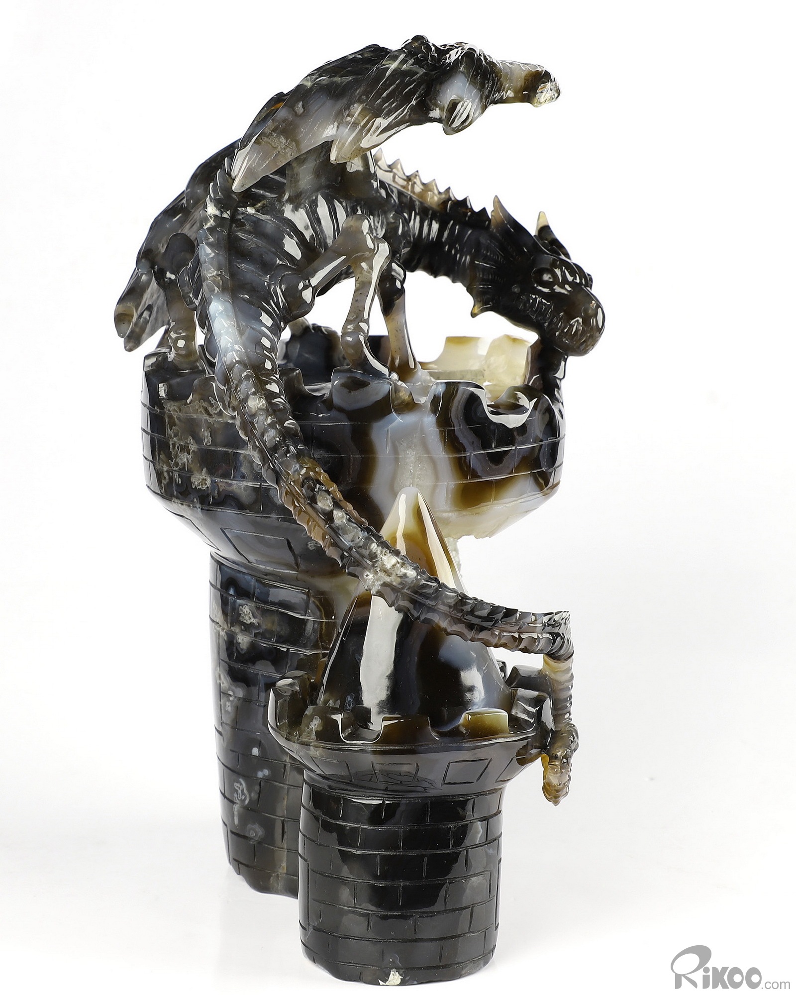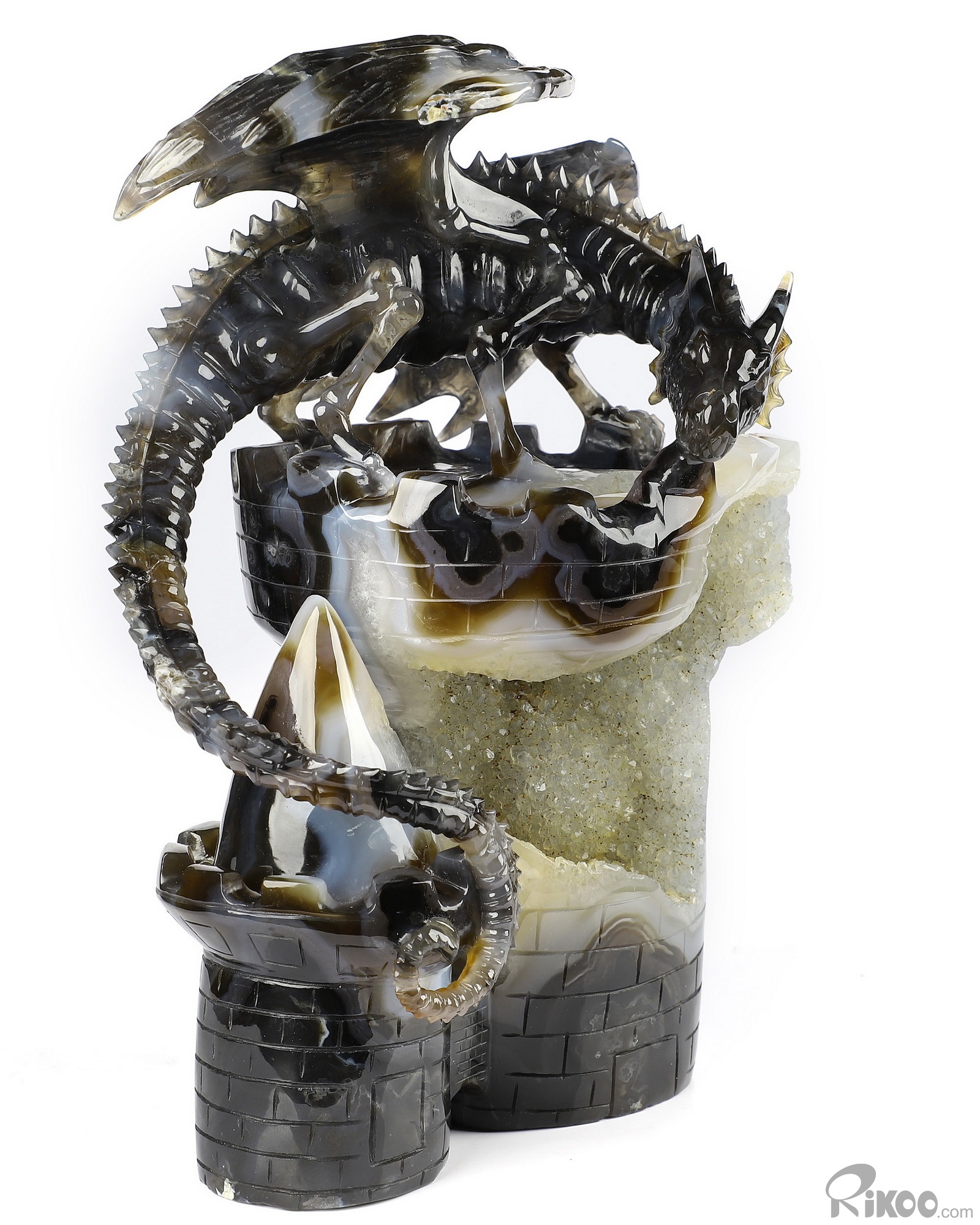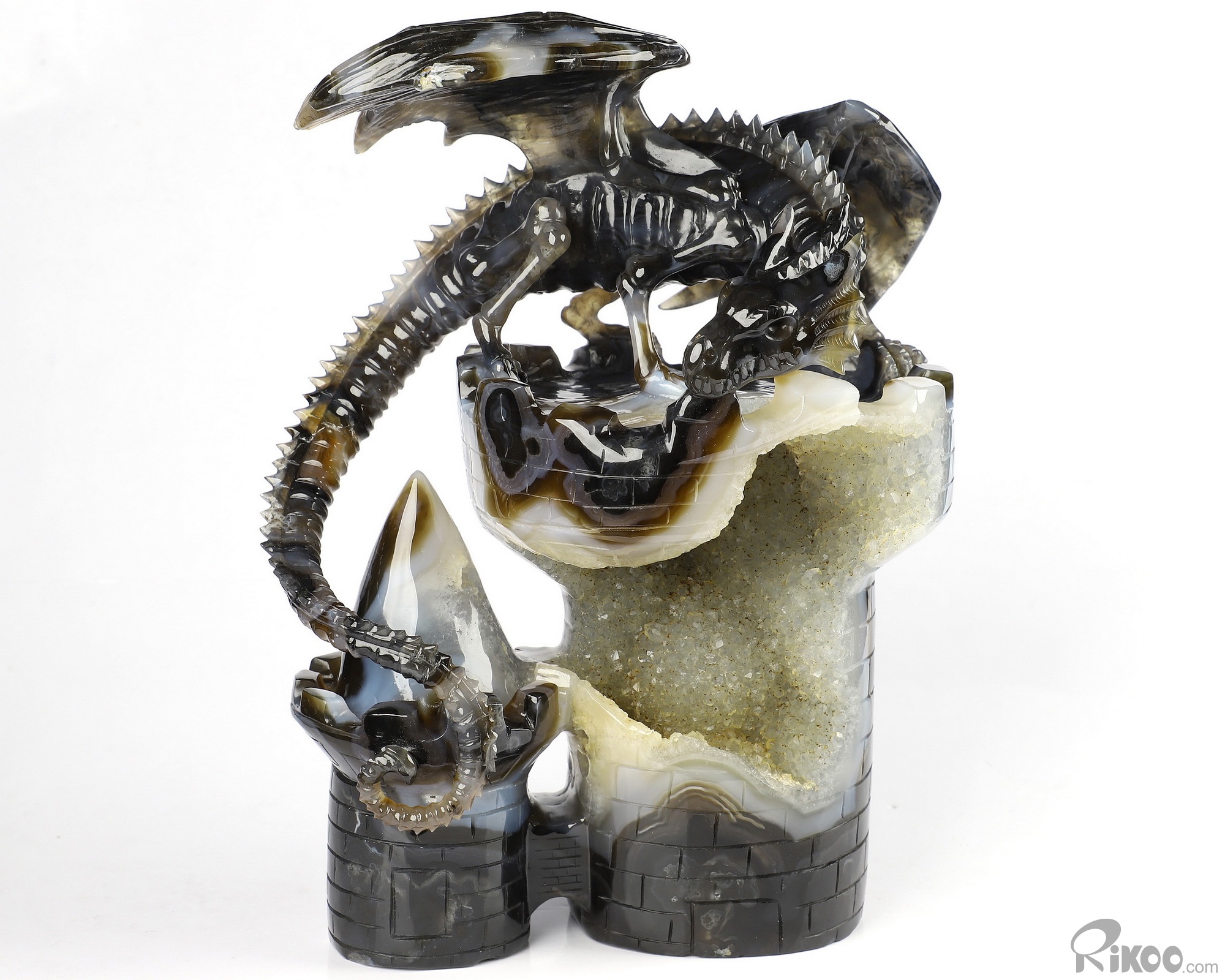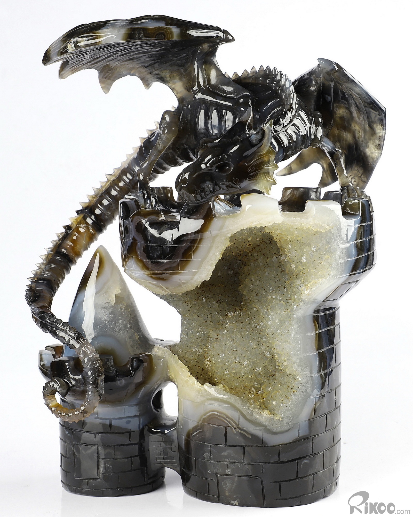 Awesome 7.7" Agate Geode Carved Crystal Western Dragon & Castle Sculpture, Realistic, Crystal Healing