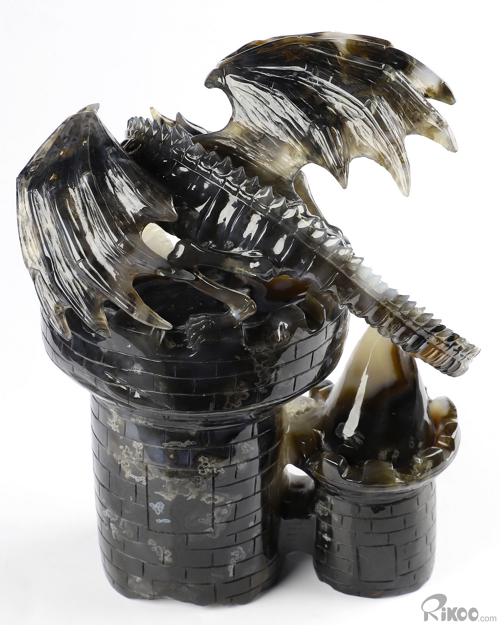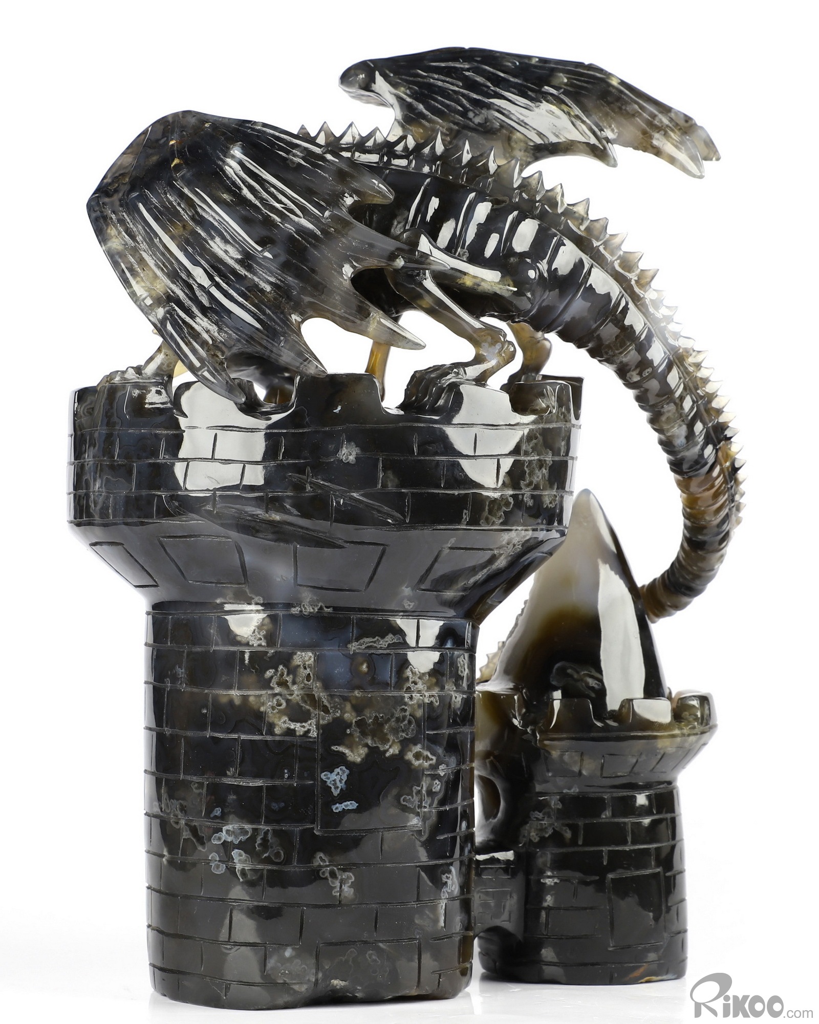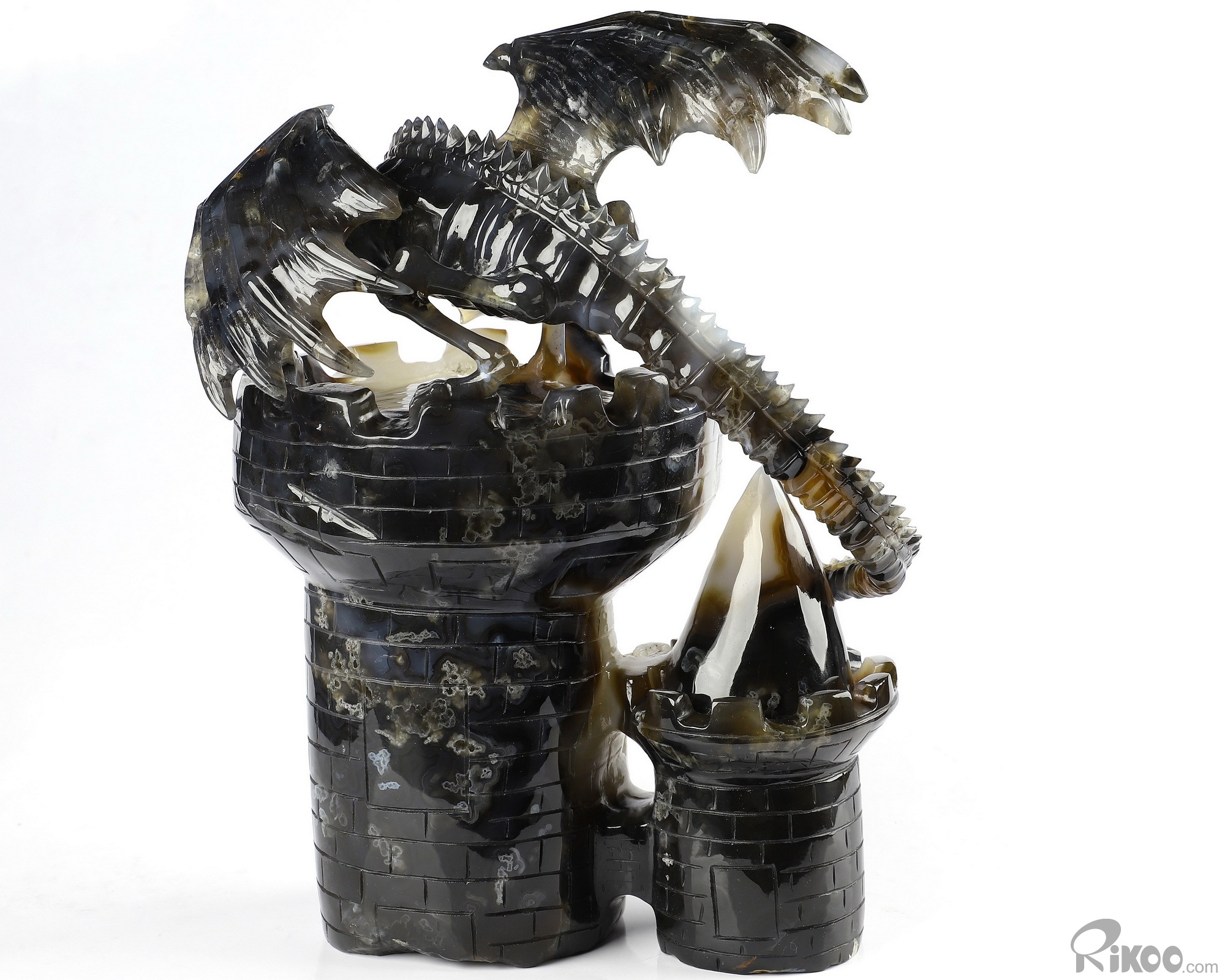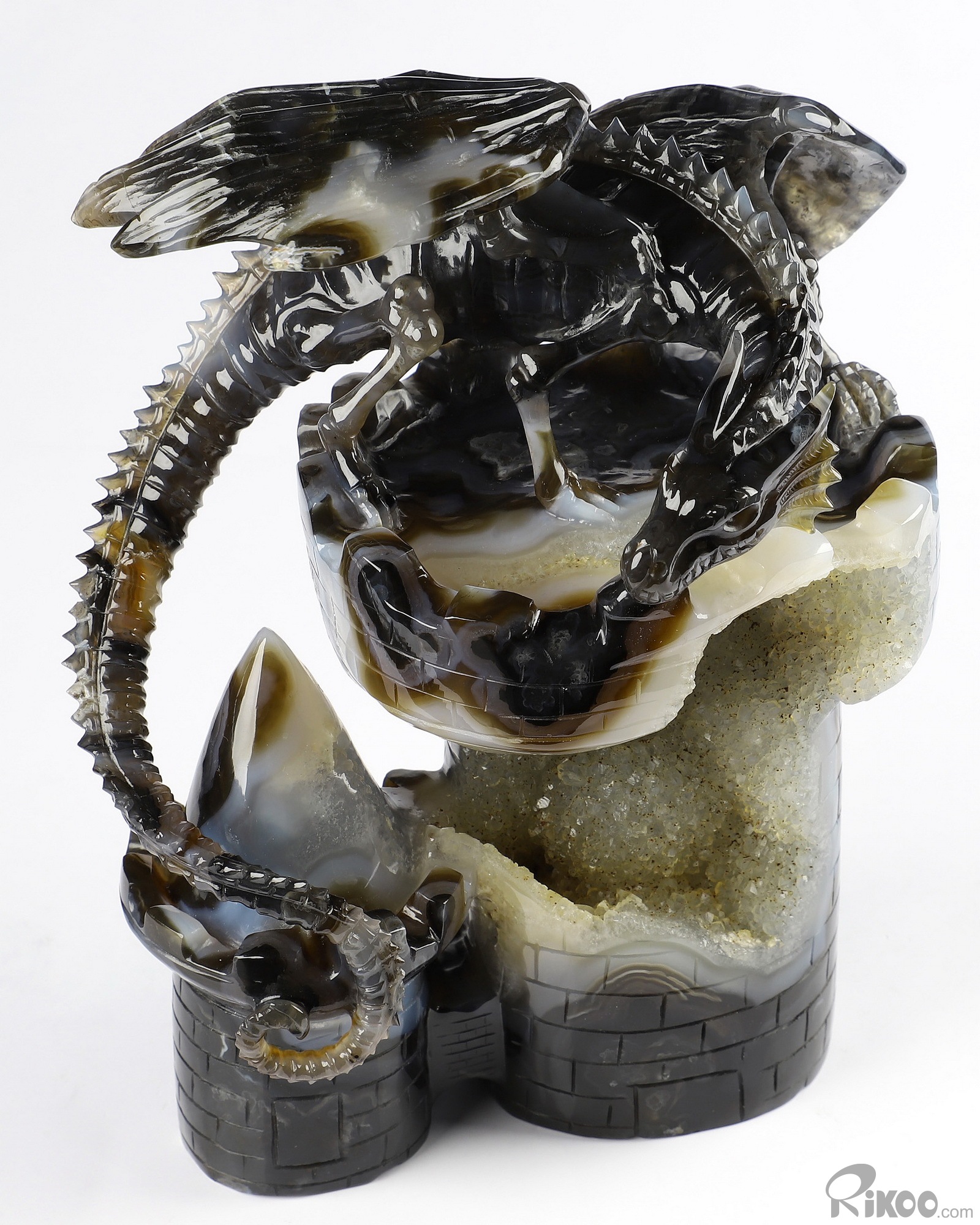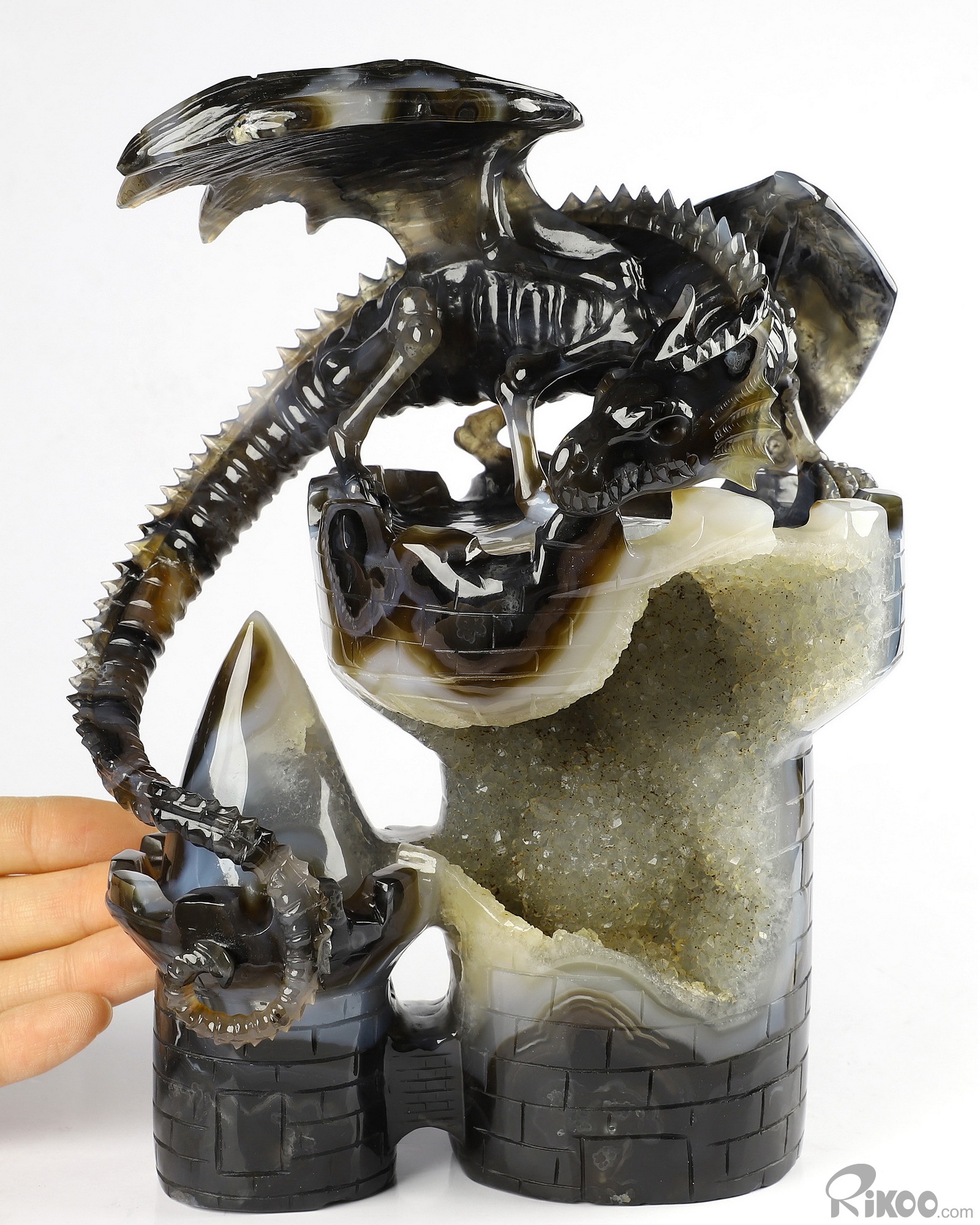 Awesome 7.7" Agate Geode Carved Crystal Western Dragon & Castle Sculpture, Realistic, Crystal Healing