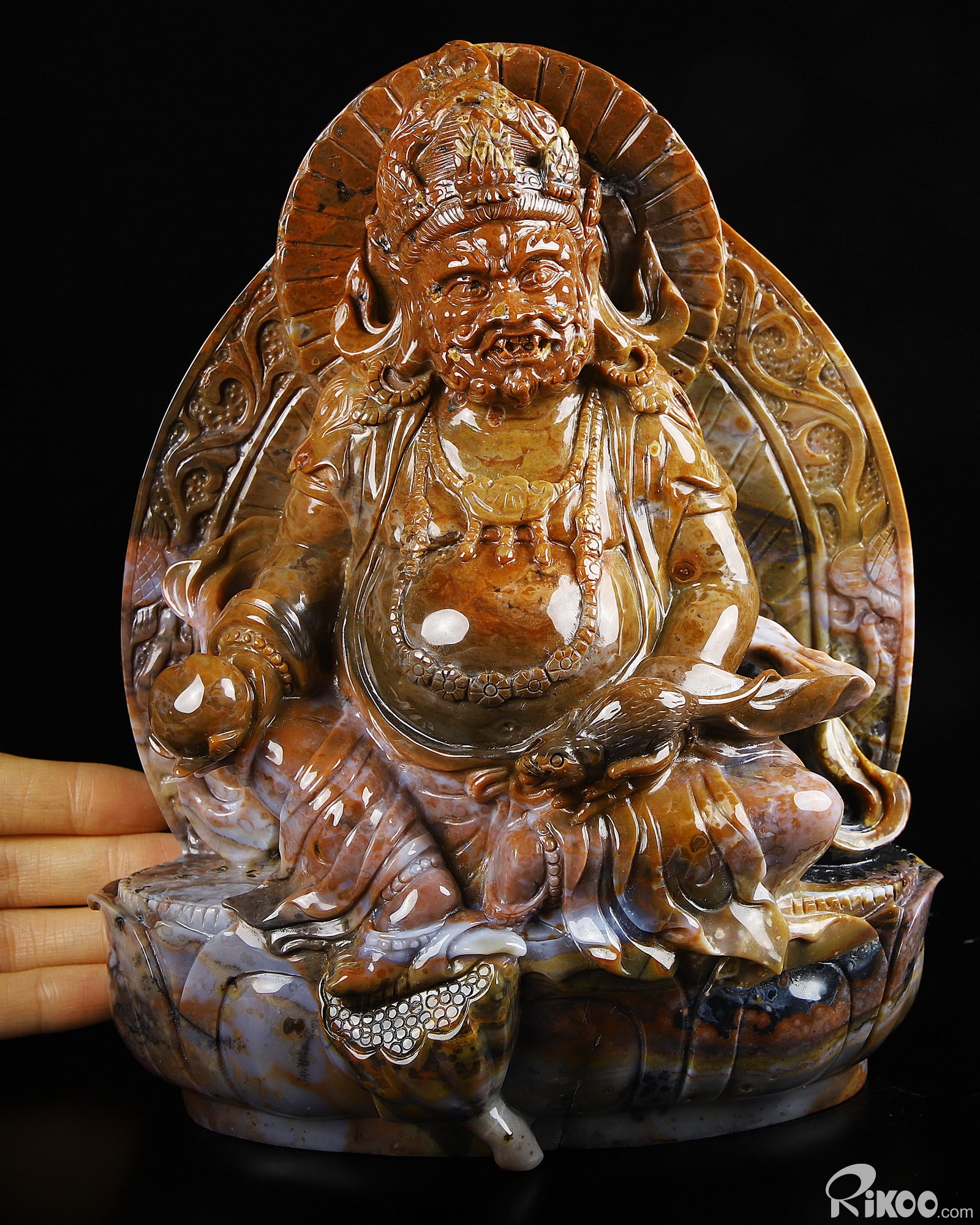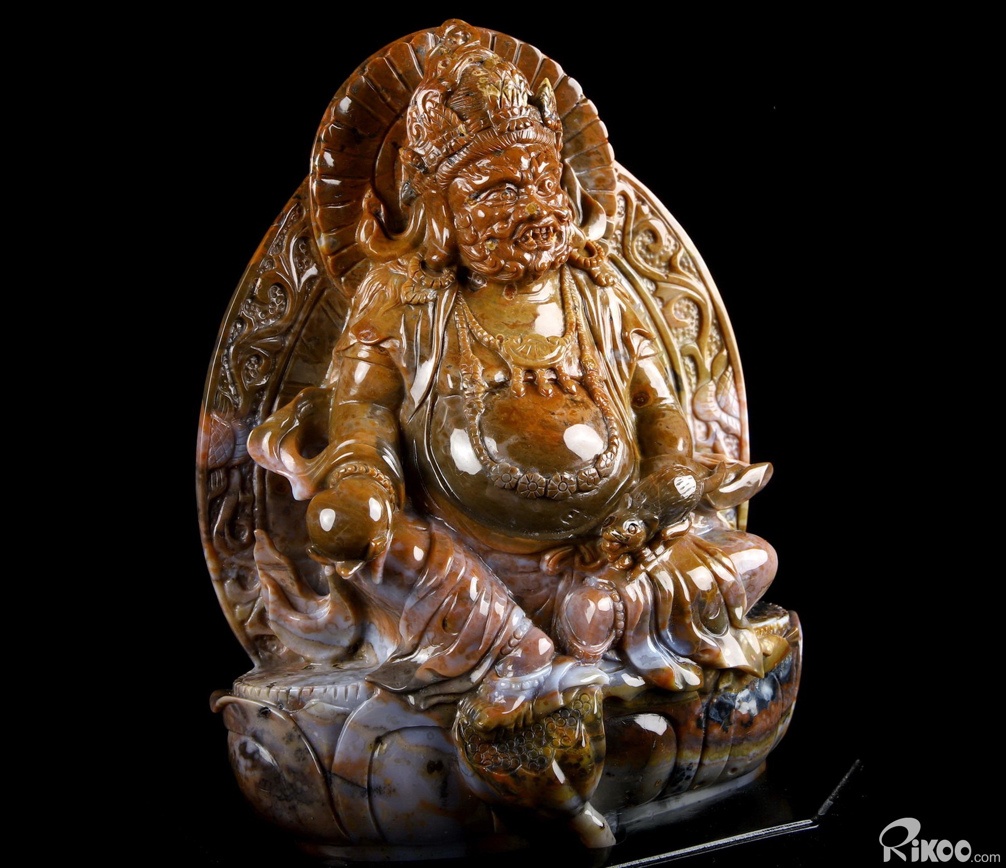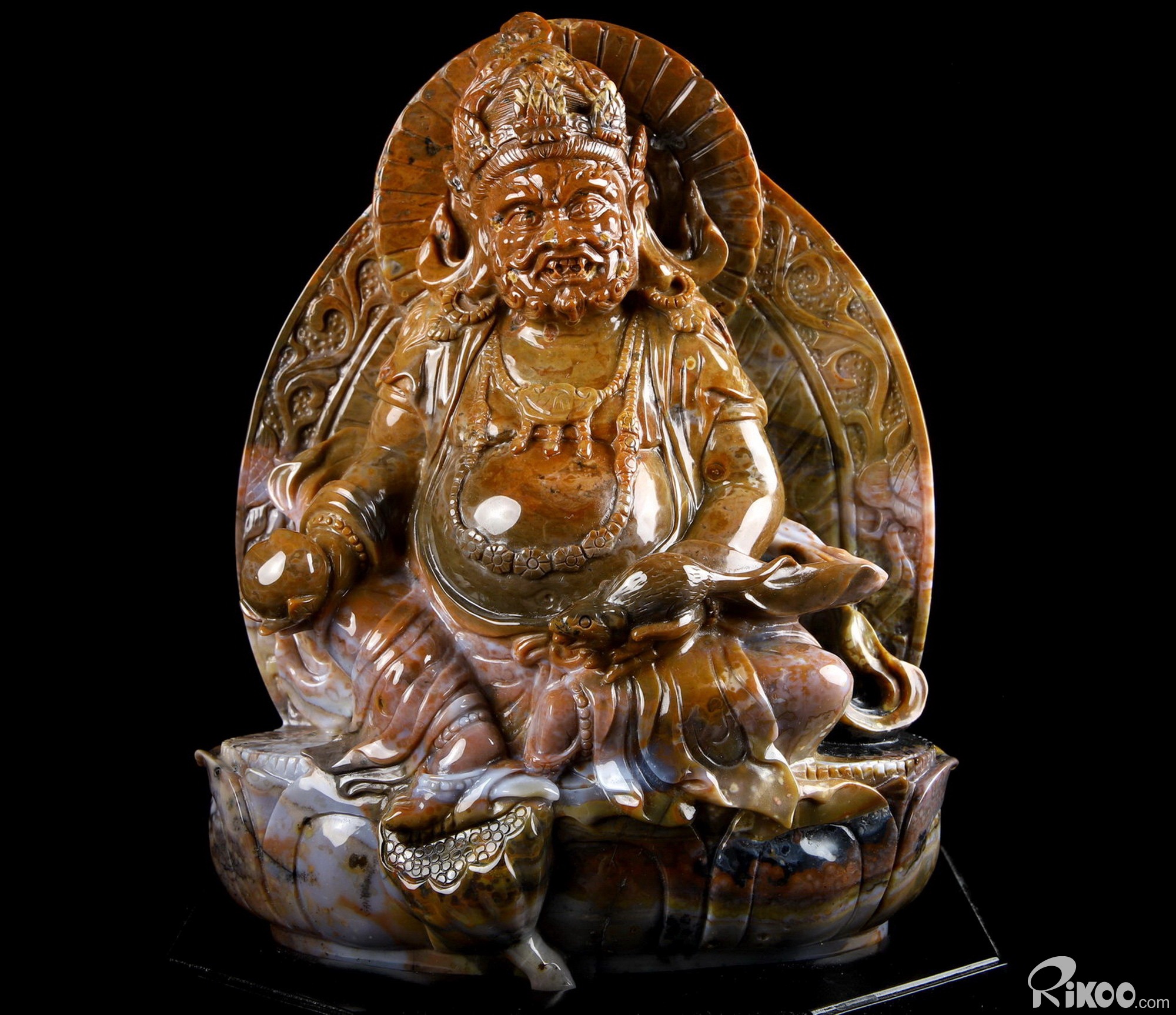 Awesome 8.0" Black Zebra Agate Carved King of Wealth Crystal Buddha Sculpture & Stand, Crystal Healing