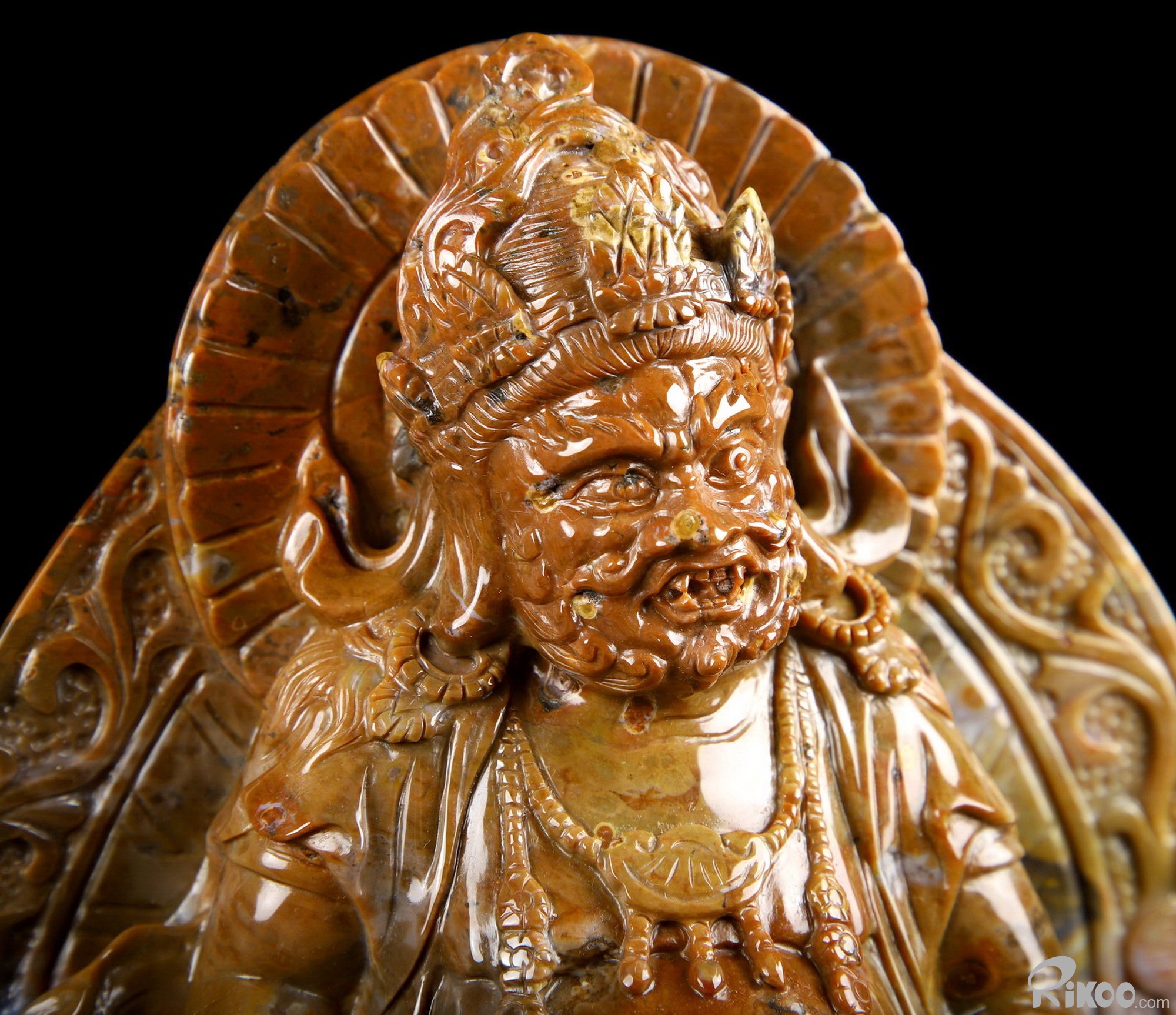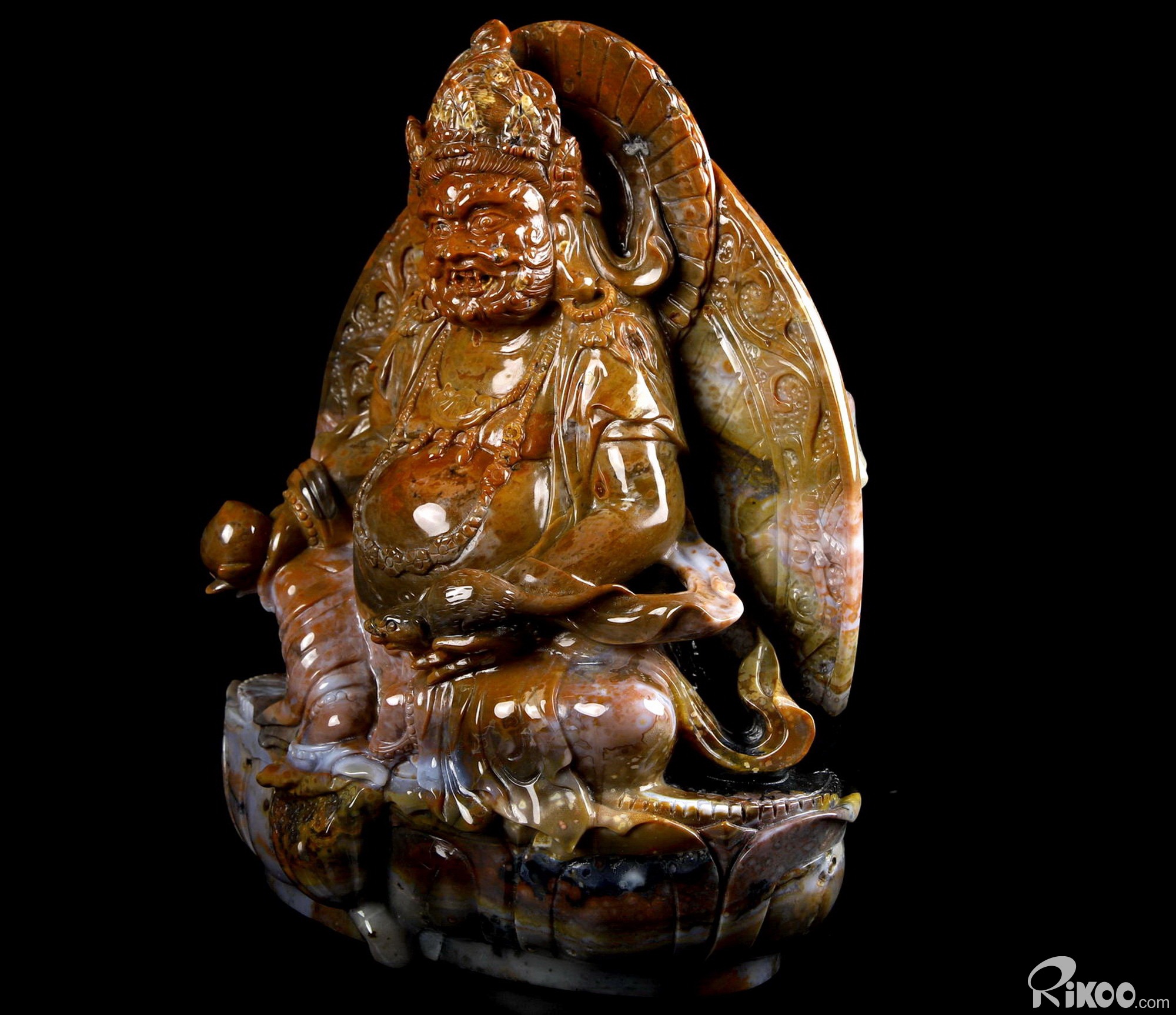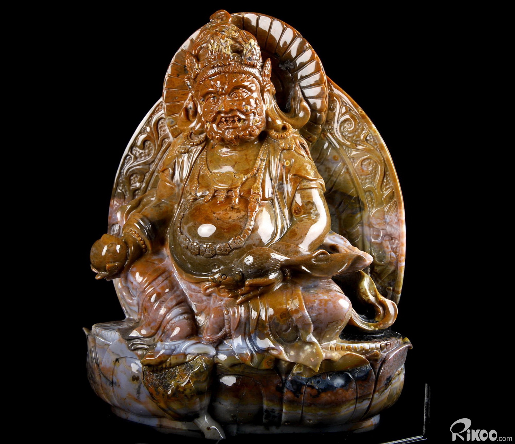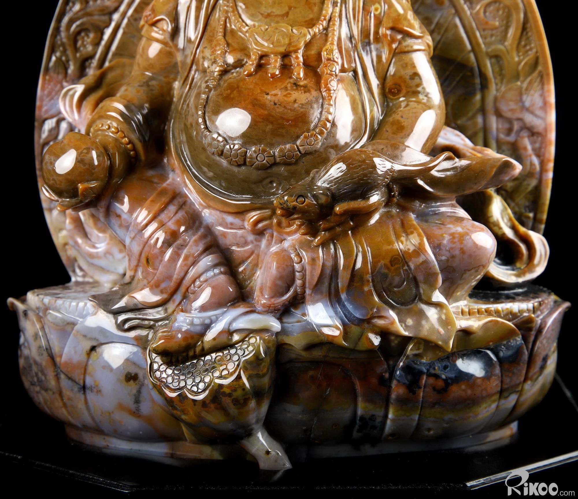 Awesome 8.0" Black Zebra Agate Carved King of Wealth Crystal Buddha Sculpture & Stand, Crystal Healing